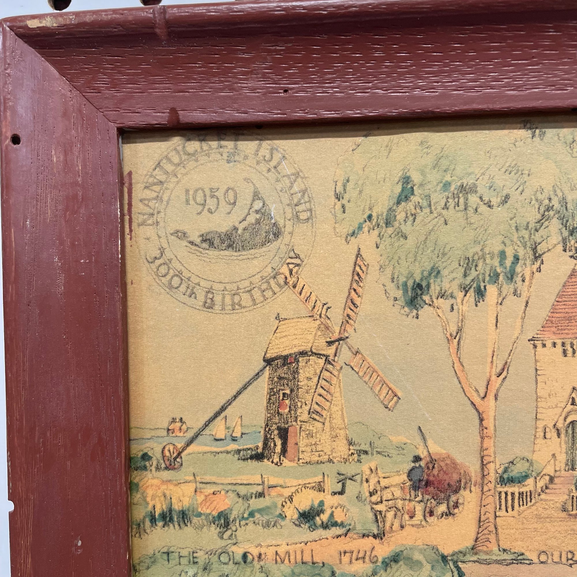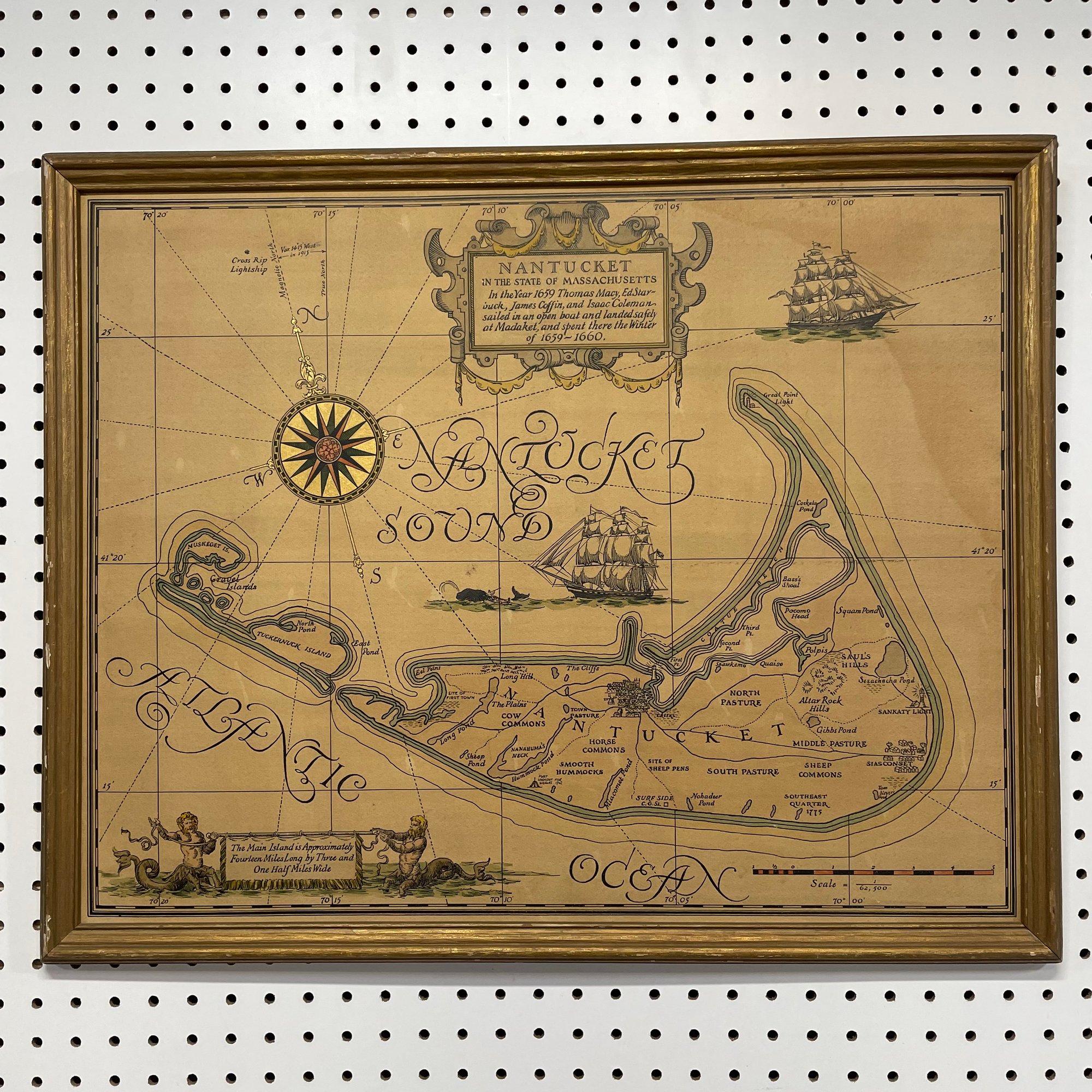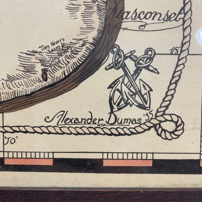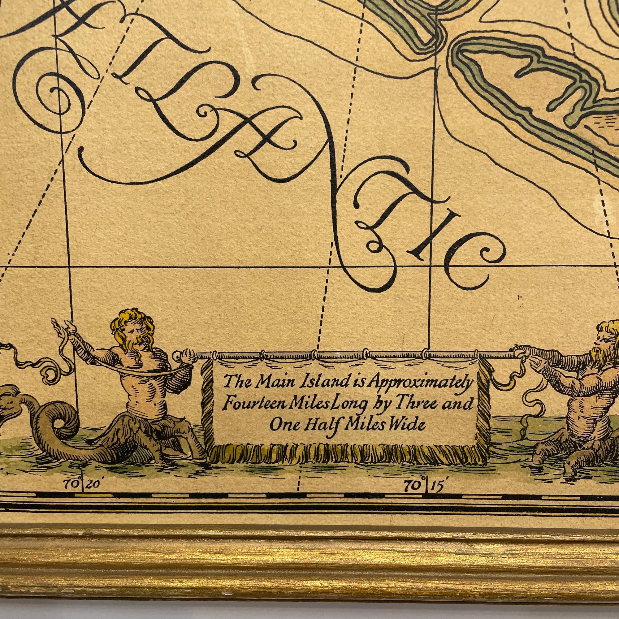Two Prints of Maps Depicting Nantucket Island, and a Ruth Haviland Sutton Lithograph. The lithograph printed "A GROUP OF HISTORIC ITEMS FROM 1686 TO 1957, SELECTED, ARRANGED AND DRAWN BY RUTH HAVILAND SUTTON, 1959."