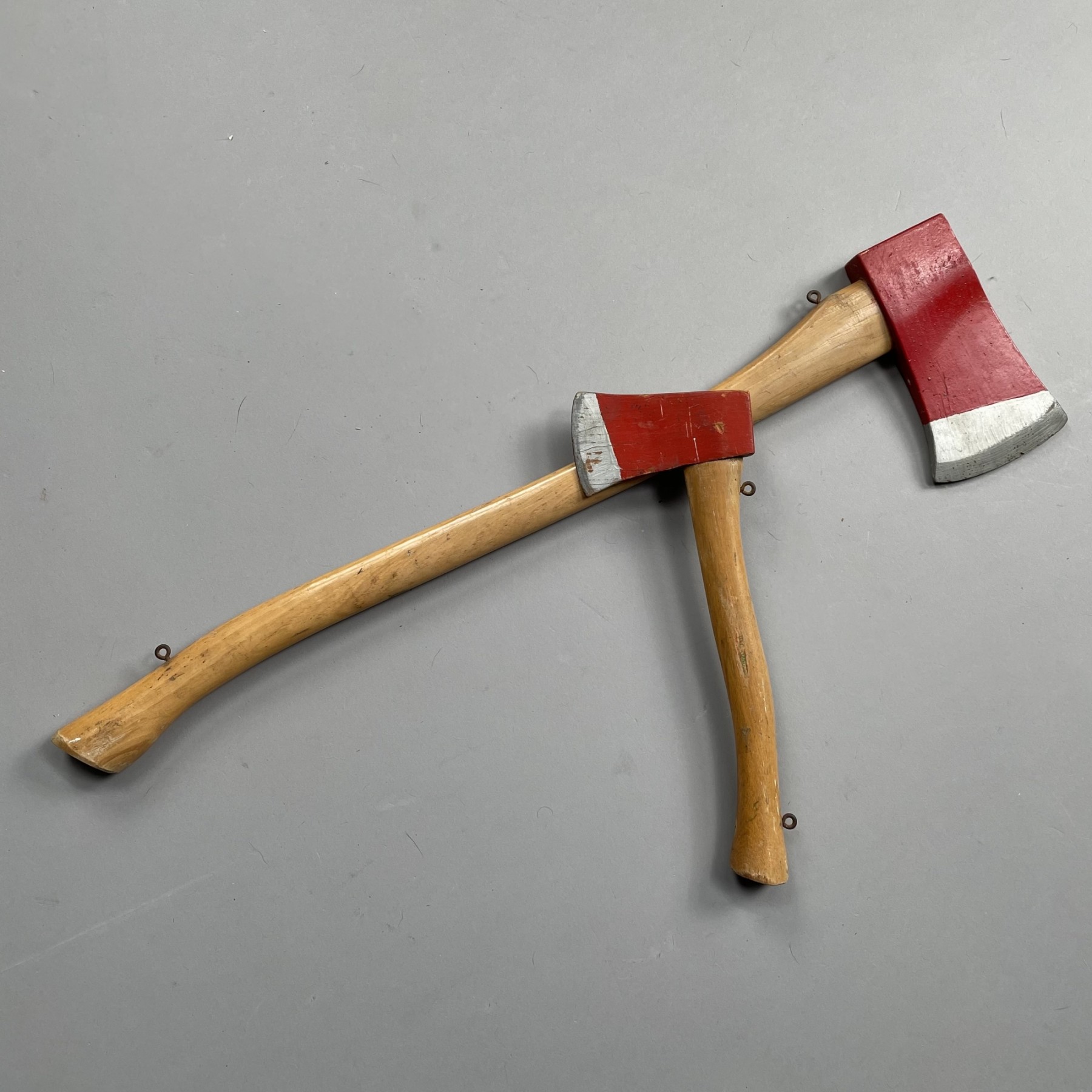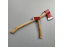 In red and silver paint, the hatchet stamped "N.E. HANDLES" and the axe "NEW ENGLAND HANDLE."