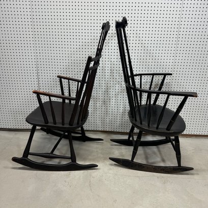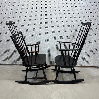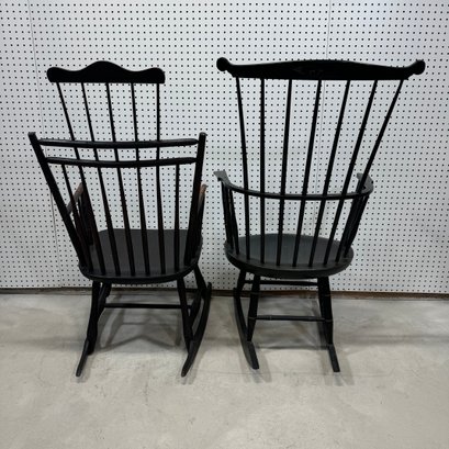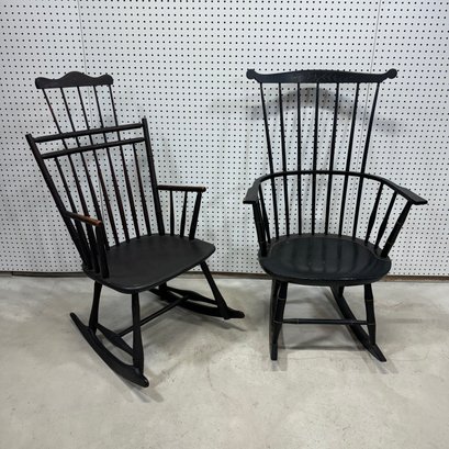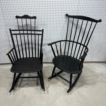 Two Windsor Rocking Chairs in Black Paint. The tallest stencilled with crossed branches on the crestrail.