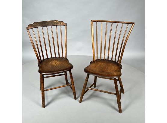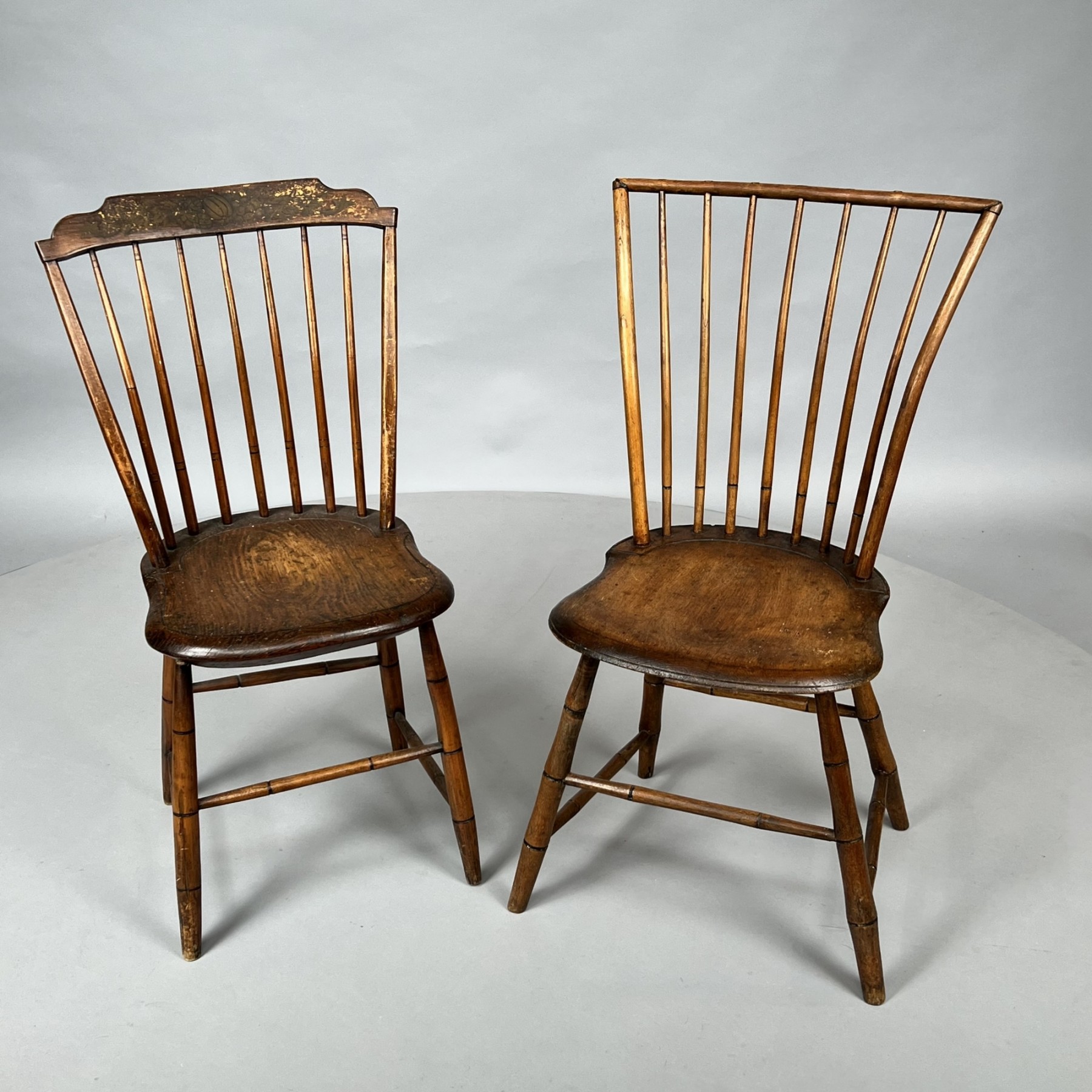 Including a step-down Windsor chair with paint- decorated crest rail, and a rodback Windsor, each with seven-spindle back and plank seat.