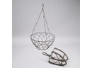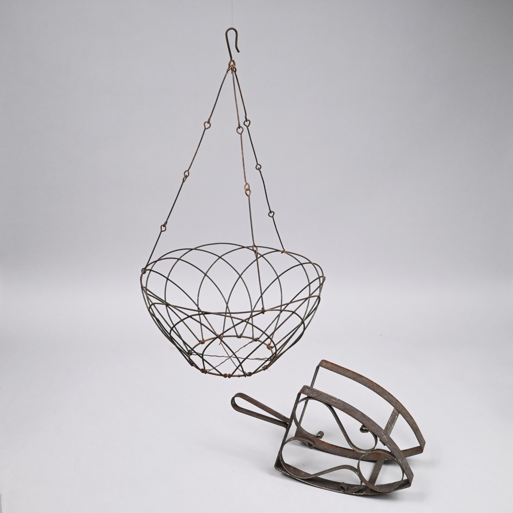 Comprising an iron-shaped trivet, the top composed of a pair of S-scrolls supporting a circle; and a wirework hanging basket.