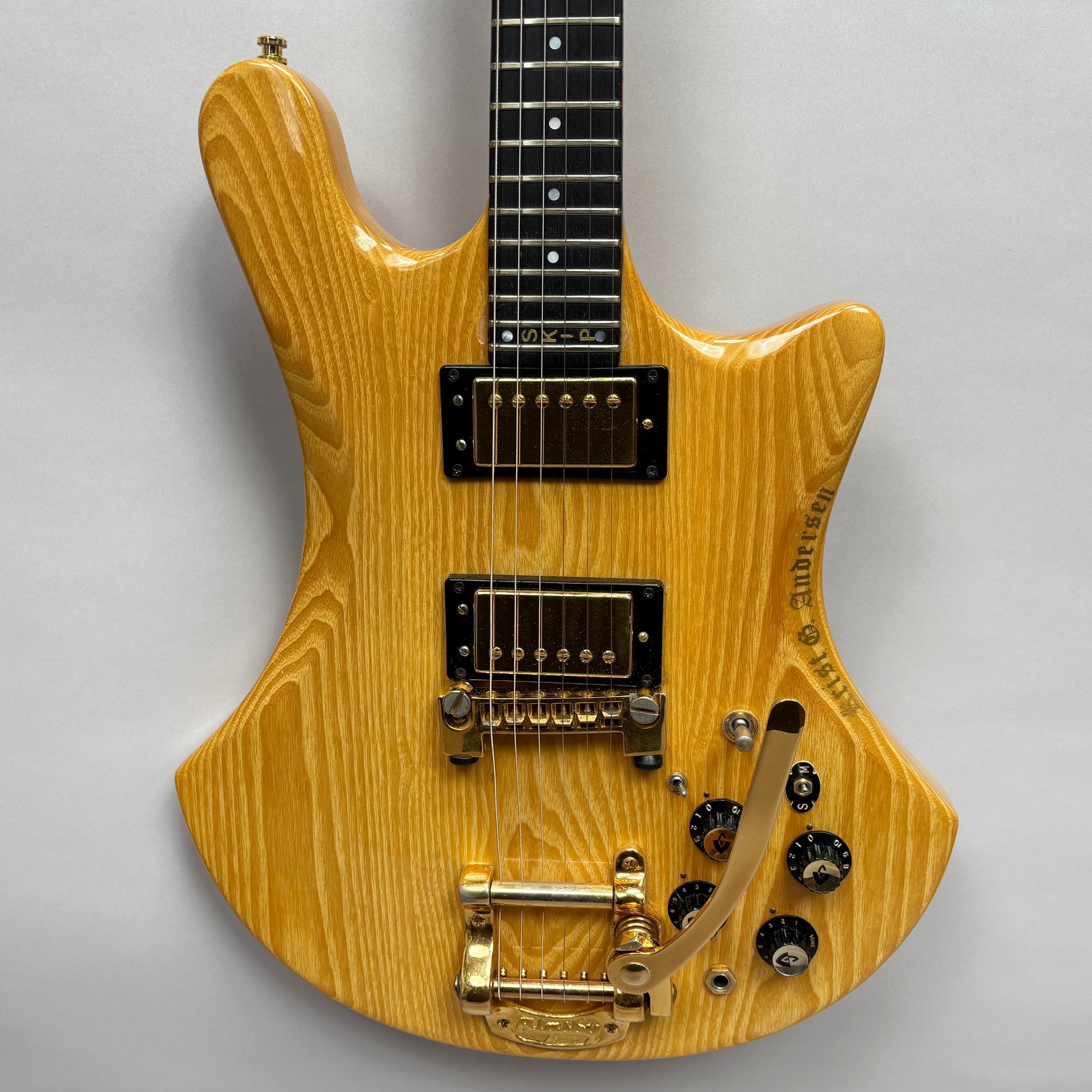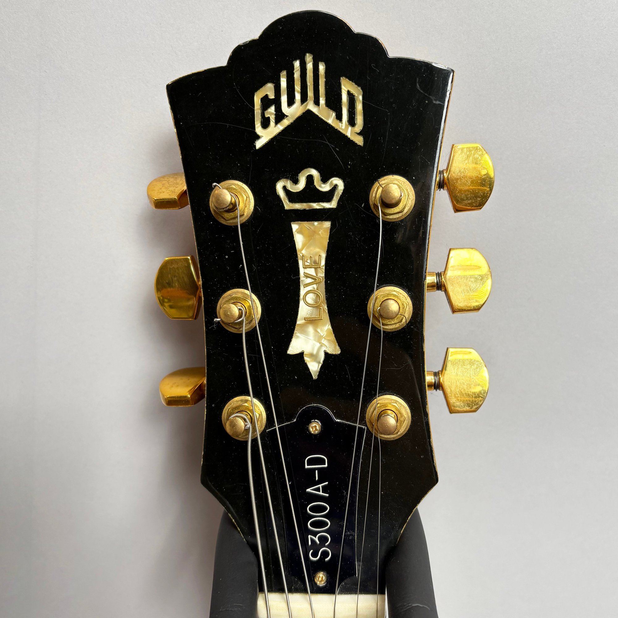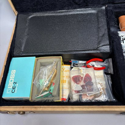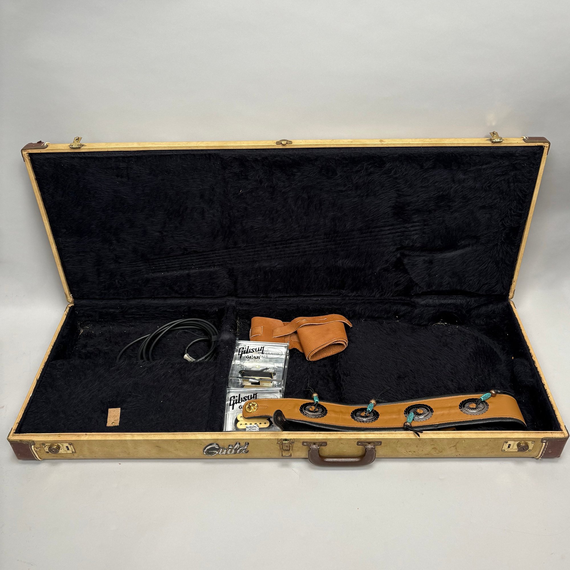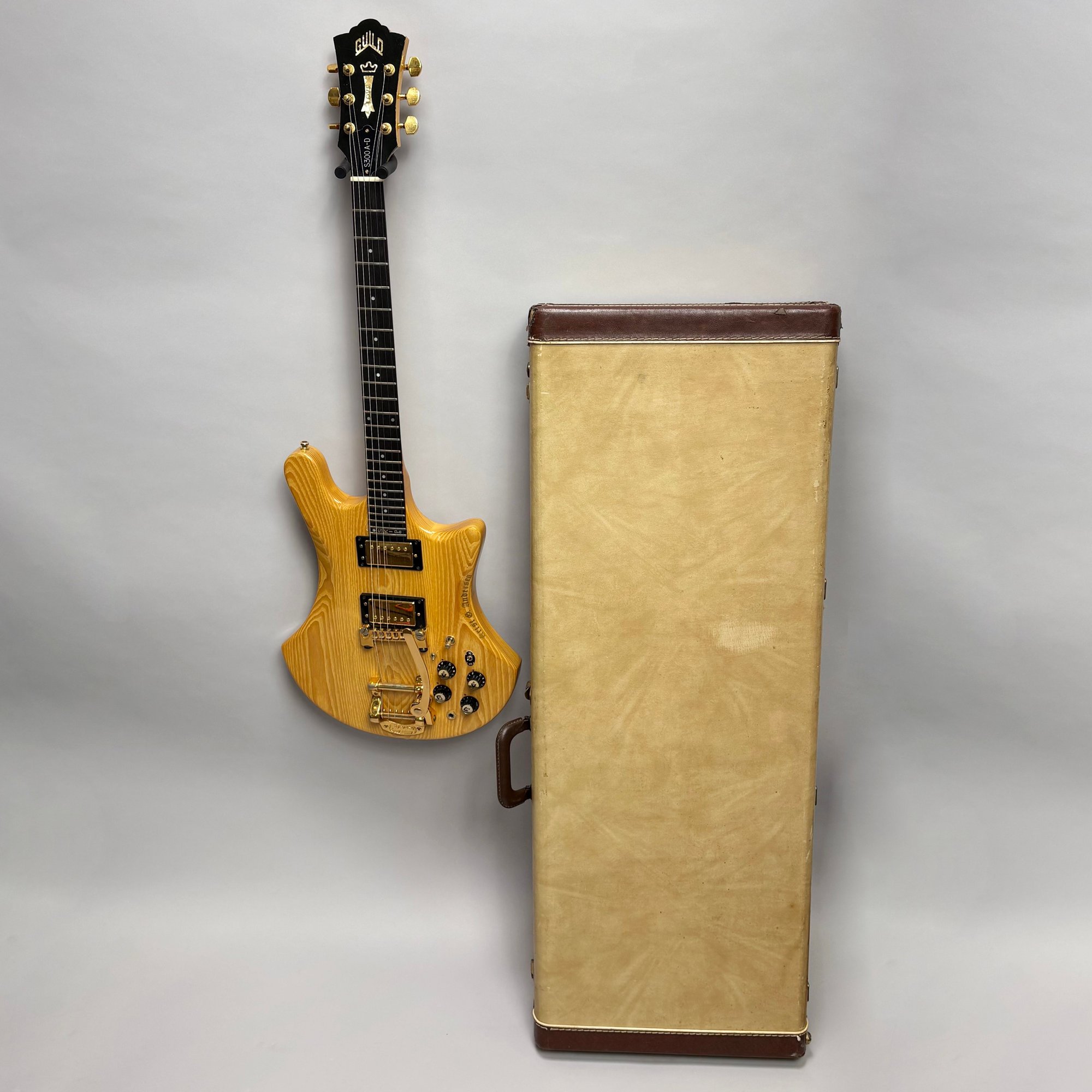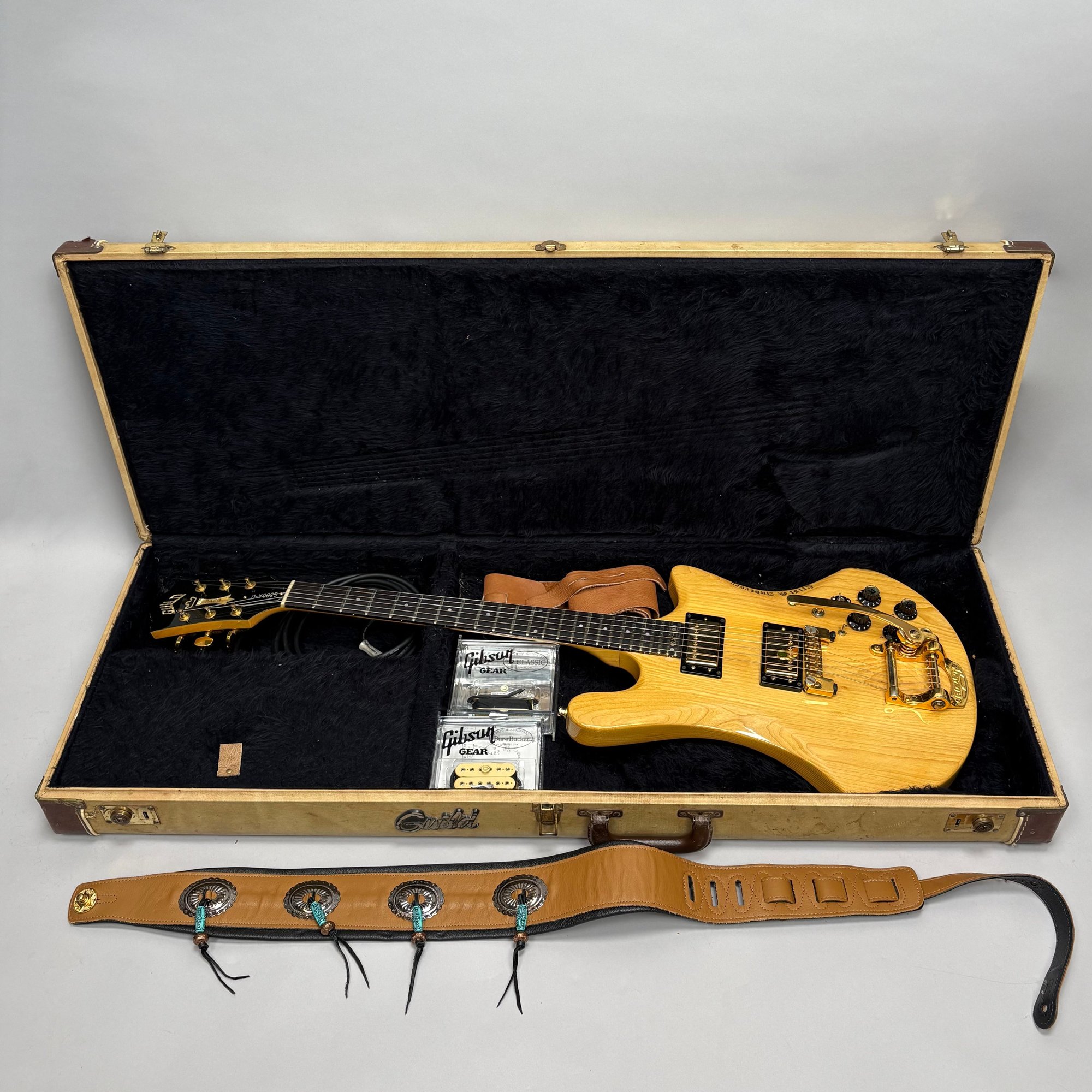 Guild Guitar Co. Model S-300A-D Ash Solid-Body Guitar, Probably Westerly, Rhode Island, Serial Number EB100219, Model Number S300A-D (D for DiMarzio pickups), 1981, and Case. Ash body and neck, headstock with celluloid "GUILD" Peak logo, Chesterfield "LOVE" inlay and black metal plate with serial number "S300A-D," and on the reverse stamped "EB100219/ MADE IN U.S.A.," rosewood fretboard with "SKIP" in gold letters across the bottom, brass Bigsby tailpiece and gold-plated hardware, applied decal "Krist G. Andersen" in gold gothic lettering along one edge; also including a Gibson Gear "57 Classic Plus" Vintage Style Gold Humbucker, a Gibson Gear "BurstBucker Pro" 1959 Gold Neck Replica Humbucker, WD gold string retainer, Boss CE-2 Chorus Pedal (1980s), bag of parts and hardware, instrument cable, tools, Ernie Ball custom gauge stainless steel super slinky guitar strings, ghs Nickel Rockers electric guitar strings and two additional plain steel-ball end 009 strings, plastic "Fender/ PICKS" box and mottled brown and one white "THIN" picks, and the original tan and brown hardshell case lined in black plush and applied with the logo "GUILD" in silvered letters. Together with (probably) a Levy's Canada "Country/ Western Series," PM32SF black veg-tan leather guitar strap mounted with six conchos with turquoise pendants, and a brown leather guitar strap, both unmarked.