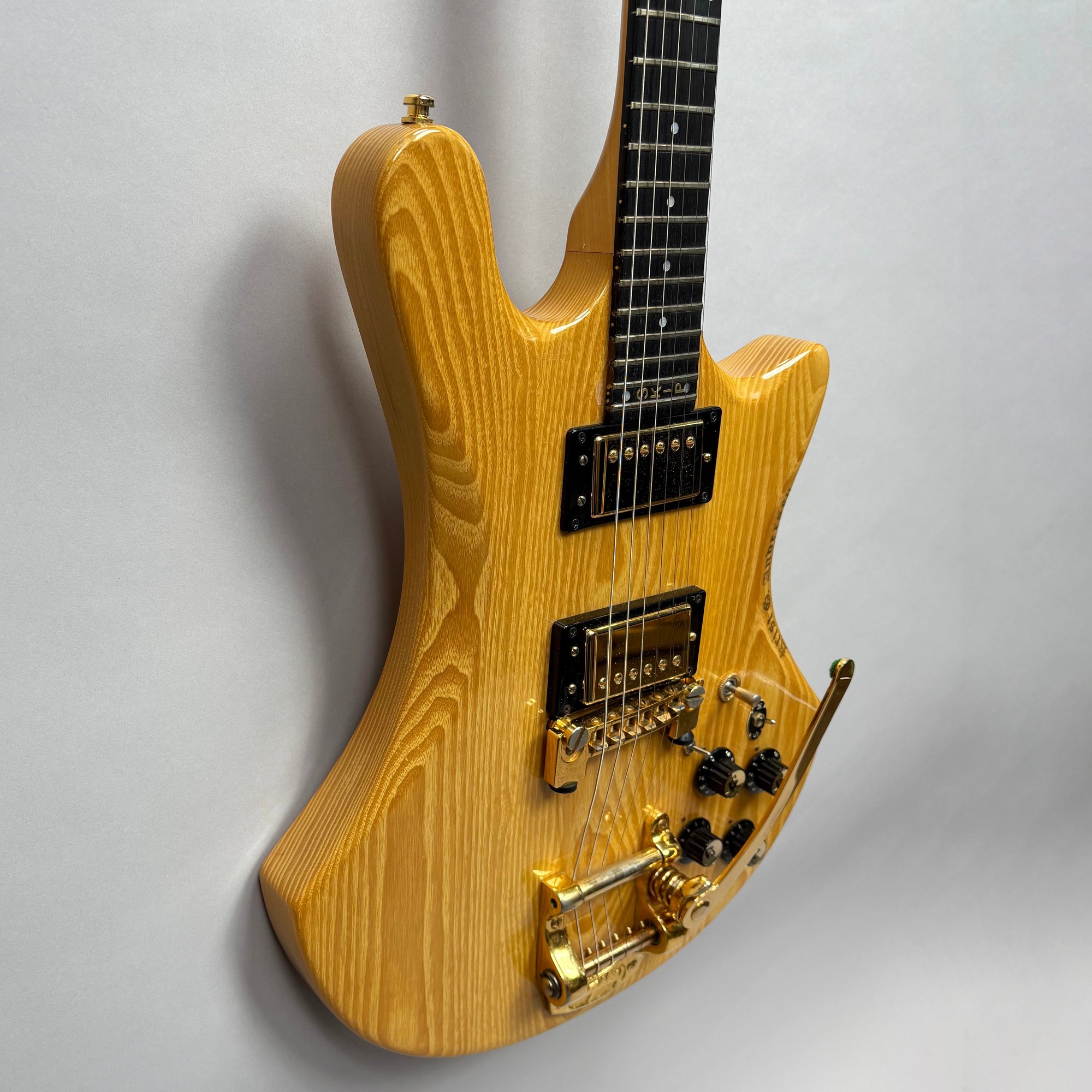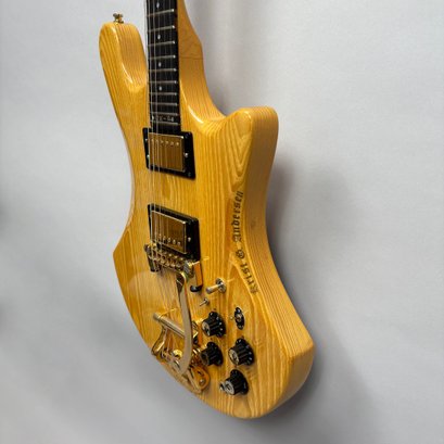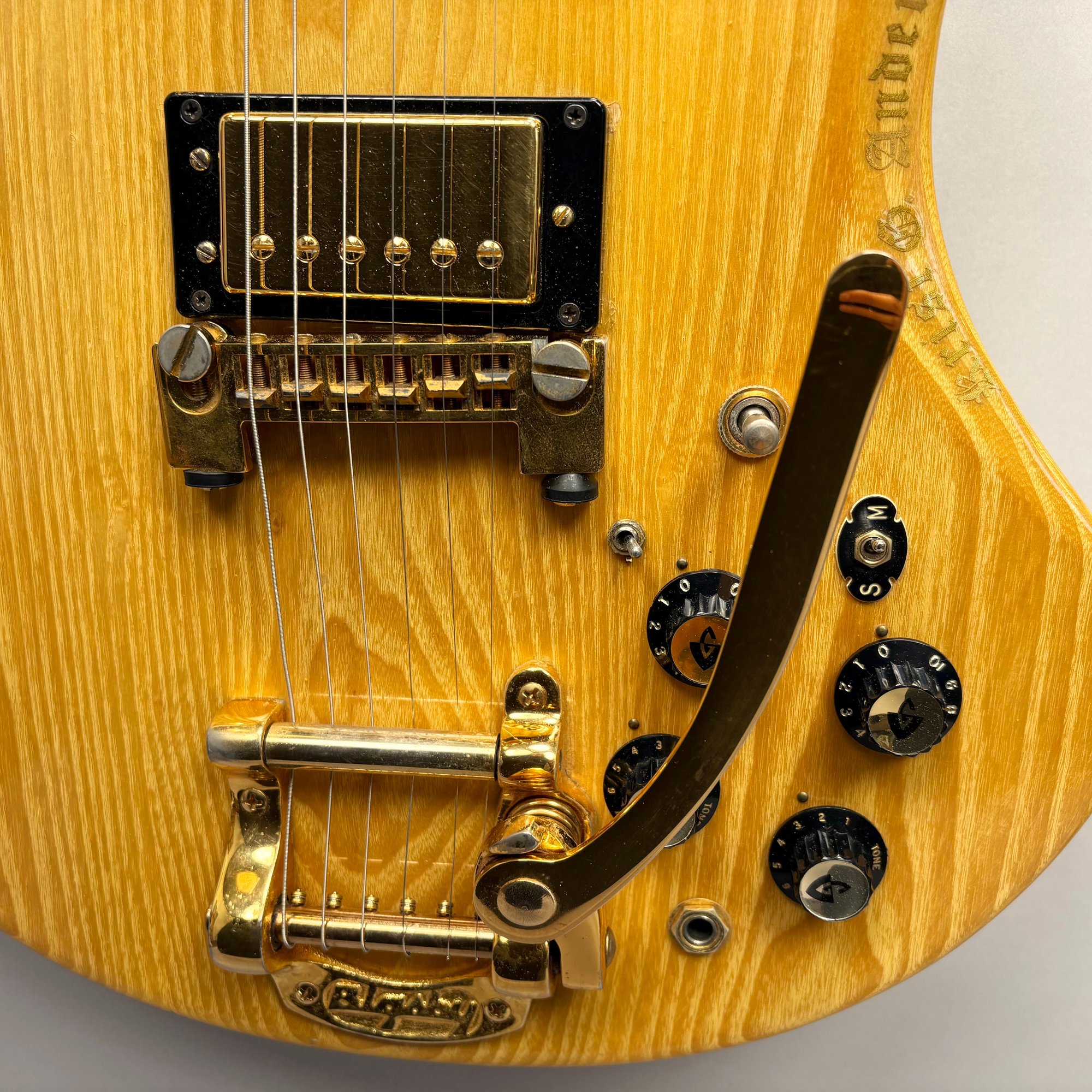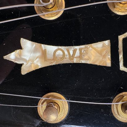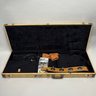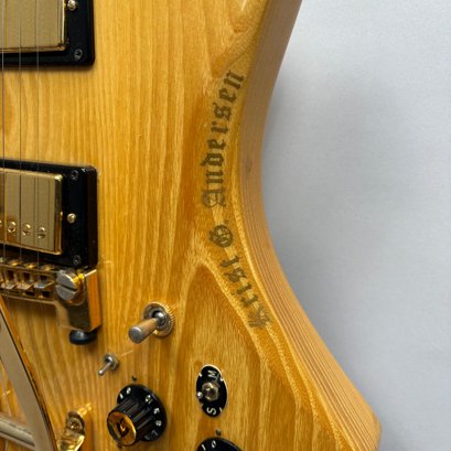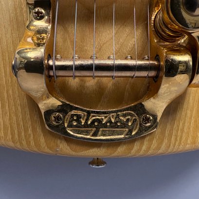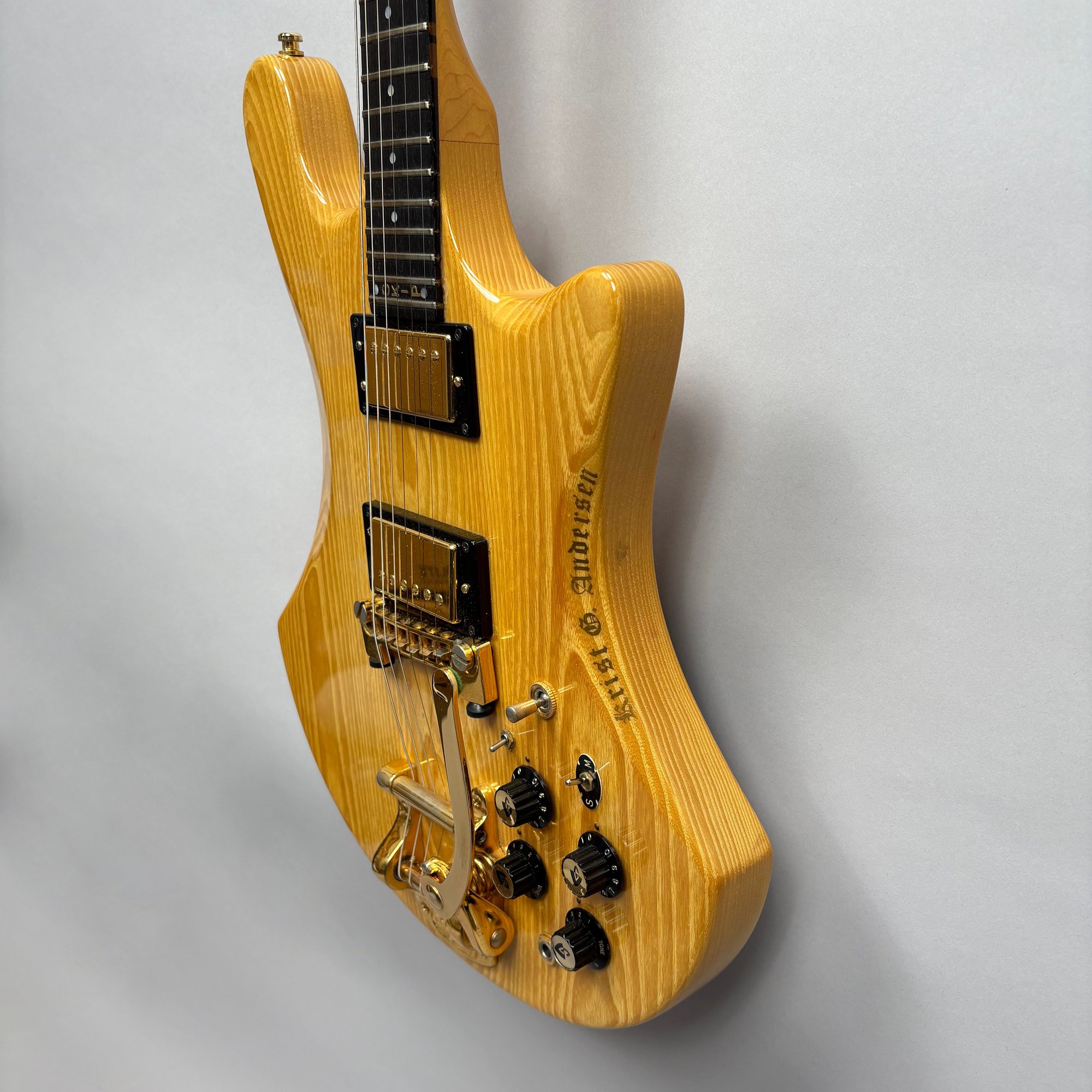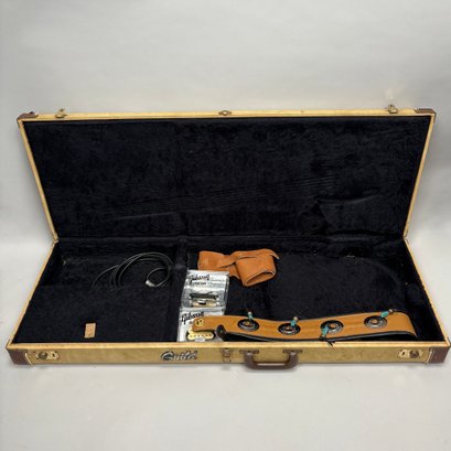 Guild Guitar Co. Model S-300A-D Ash Solid-Body Guitar, Probably Westerly, Rhode Island, Serial Number EB100219, Model Number S300A-D (D for DiMarzio pickups), 1981, and Case. Ash body and neck, headstock with celluloid "GUILD" Peak logo, Chesterfield "LOVE" inlay and black metal plate with serial number "S300A-D," and on the reverse stamped "EB100219/ MADE IN U.S.A.," rosewood fretboard with "SKIP" in gold letters across the bottom, brass Bigsby tailpiece and gold-plated hardware, applied decal "Krist G. Andersen" in gold gothic lettering along one edge; also including a Gibson Gear "57 Classic Plus" Vintage Style Gold Humbucker, a Gibson Gear "BurstBucker Pro" 1959 Gold Neck Replica Humbucker, WD gold string retainer, Boss CE-2 Chorus Pedal (1980s), bag of parts and hardware, instrument cable, tools, Ernie Ball custom gauge stainless steel super slinky guitar strings, ghs Nickel Rockers electric guitar strings and two additional plain steel-ball end 009 strings, plastic "Fender/ PICKS" box and mottled brown and one white "THIN" picks, and the original tan and brown hardshell case lined in black plush and applied with the logo "GUILD" in silvered letters. Together with (probably) a Levy's Canada "Country/ Western Series," PM32SF black veg-tan leather guitar strap mounted with six conchos with turquoise pendants, and a brown leather guitar strap, both unmarked.
