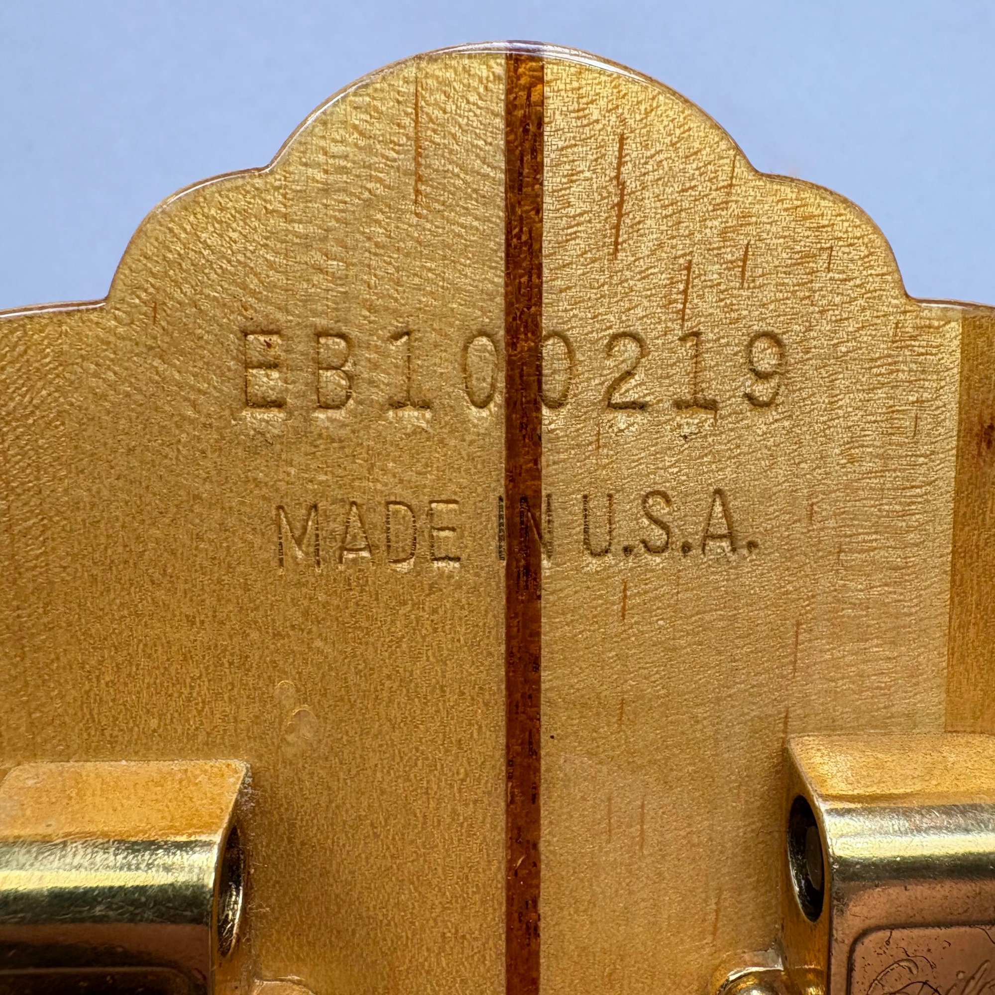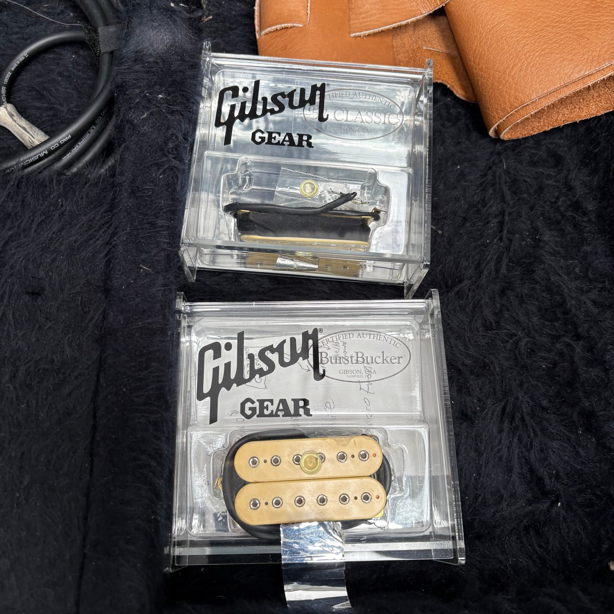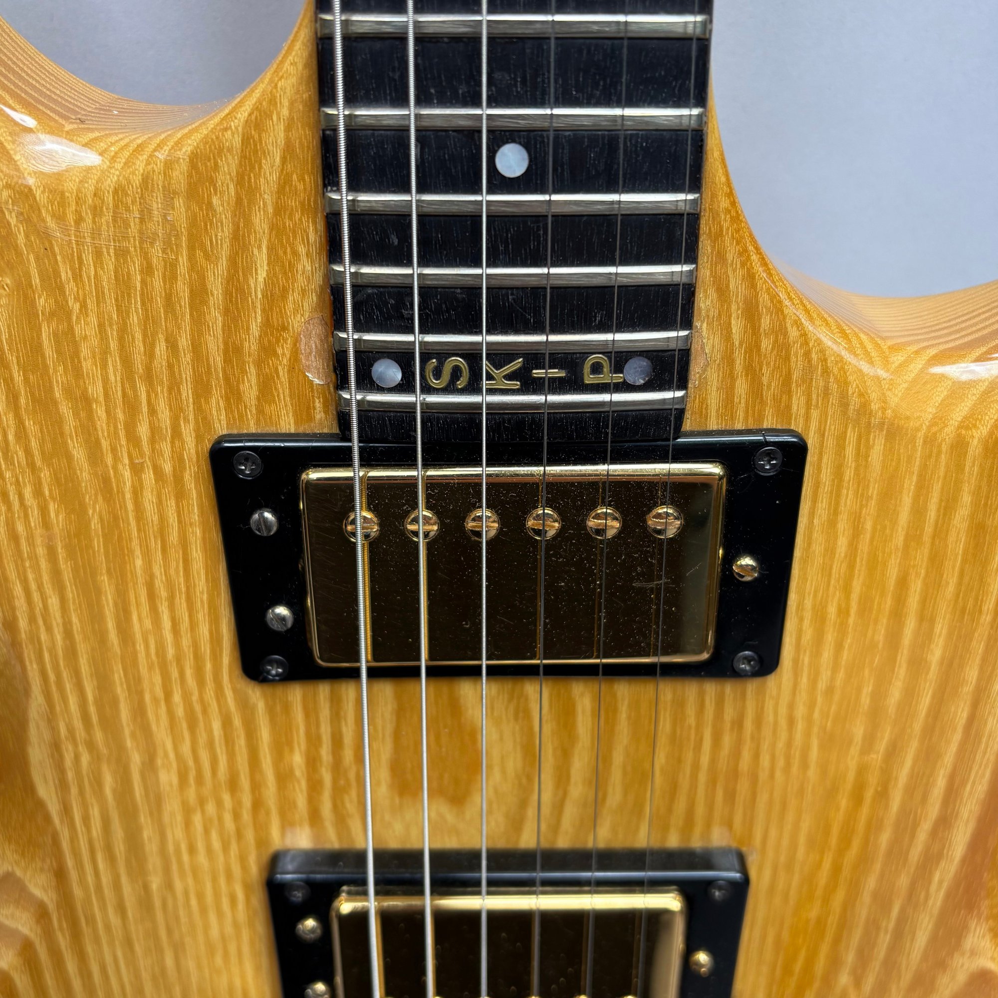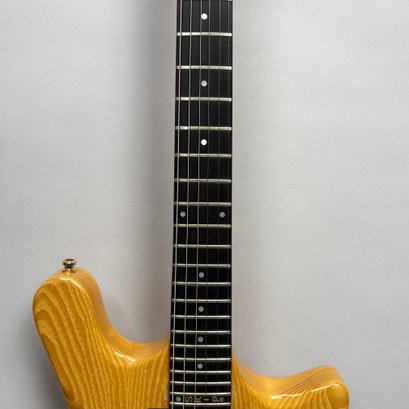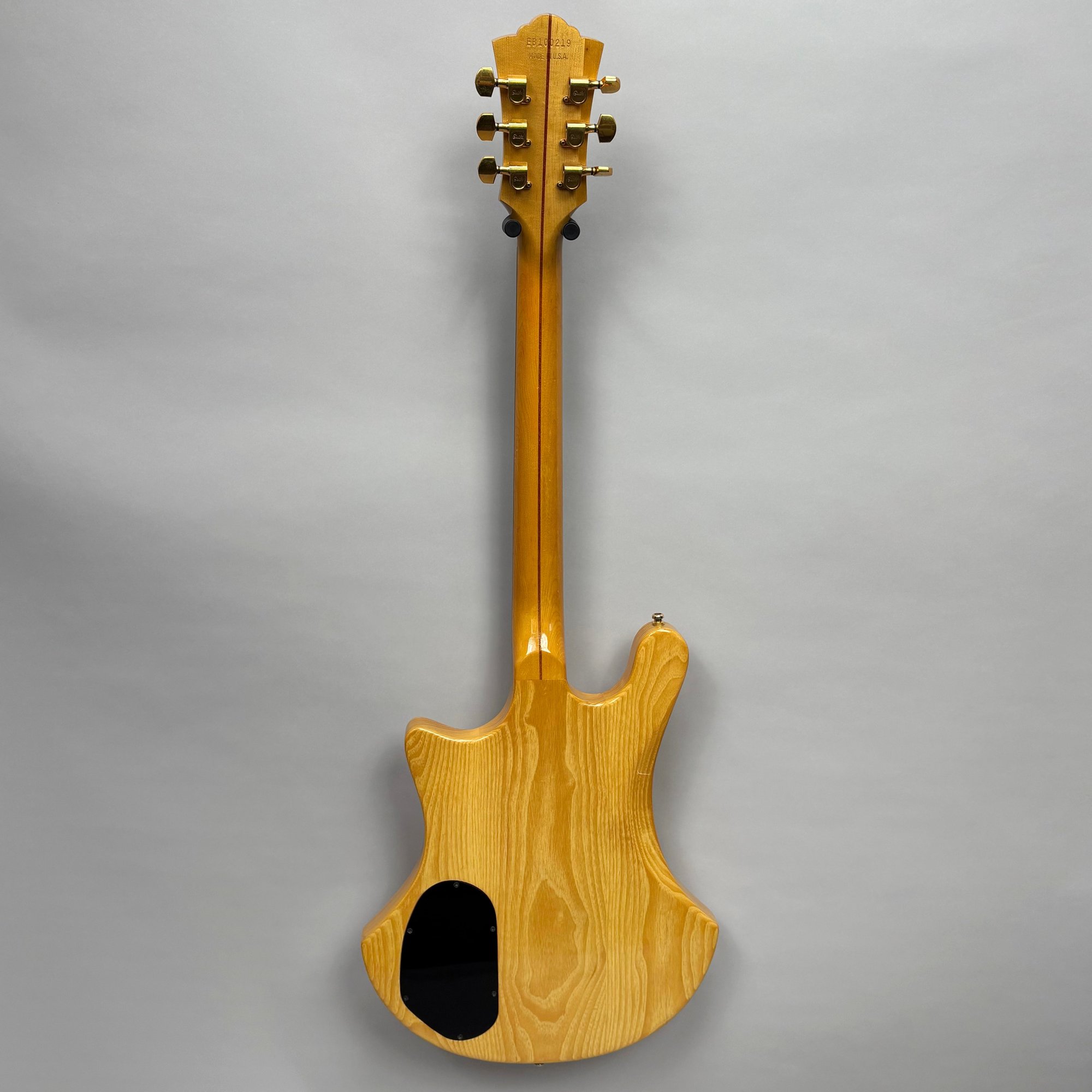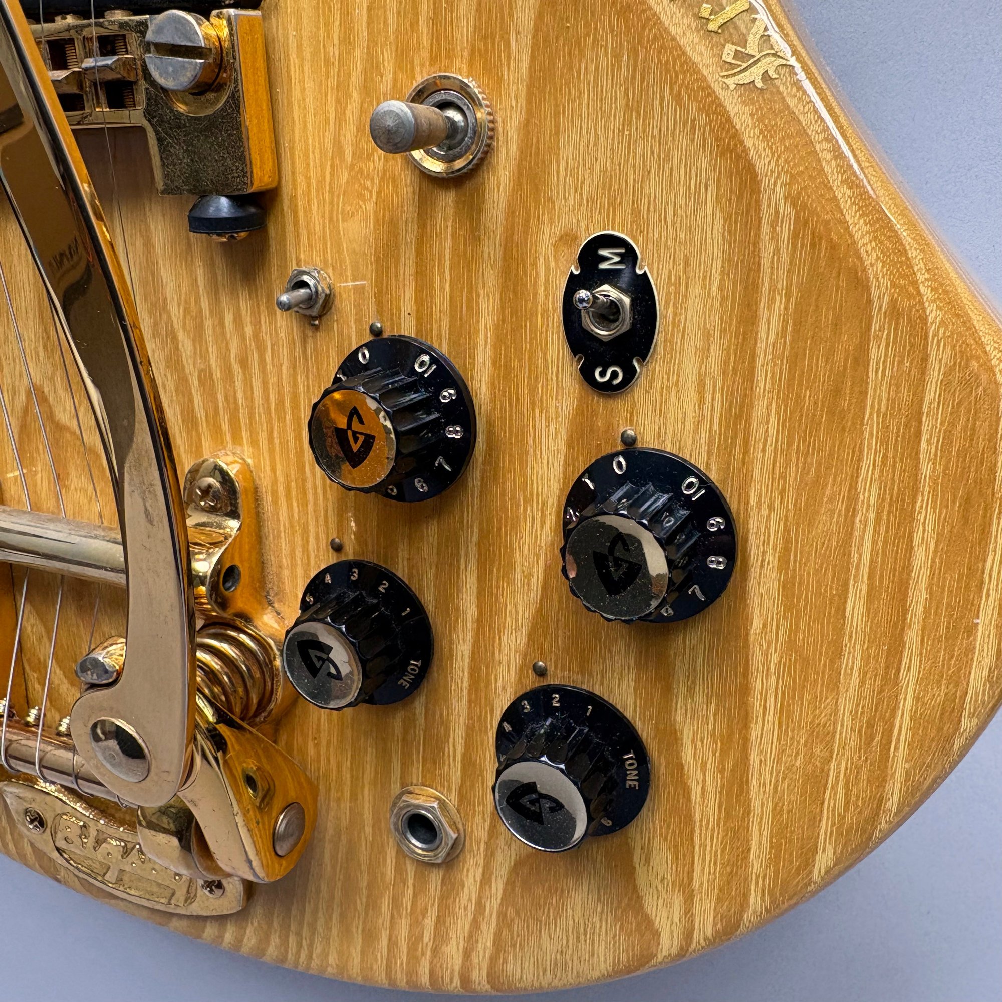 Guild Guitar Co. Model S-300A-D Ash Solid-Body Guitar, Probably Westerly, Rhode Island, Serial Number EB100219, Model Number S300A-D (D for DiMarzio pickups), 1981, and Case. Ash body and neck, headstock with celluloid "GUILD" Peak logo, Chesterfield "LOVE" inlay and black metal plate with serial number "S300A-D," and on the reverse stamped "EB100219/ MADE IN U.S.A.," rosewood fretboard with "SKIP" in gold letters across the bottom, brass Bigsby tailpiece and gold-plated hardware, applied decal "Krist G. Andersen" in gold gothic lettering along one edge; also including a Gibson Gear "57 Classic Plus" Vintage Style Gold Humbucker, a Gibson Gear "BurstBucker Pro" 1959 Gold Neck Replica Humbucker, WD gold string retainer, Boss CE-2 Chorus Pedal (1980s), bag of parts and hardware, instrument cable, tools, Ernie Ball custom gauge stainless steel super slinky guitar strings, ghs Nickel Rockers electric guitar strings and two additional plain steel-ball end 009 strings, plastic "Fender/ PICKS" box and mottled brown and one white "THIN" picks, and the original tan and brown hardshell case lined in black plush and applied with the logo "GUILD" in silvered letters. Together with (probably) a Levy's Canada "Country/ Western Series," PM32SF black veg-tan leather guitar strap mounted with six conchos with turquoise pendants, and a brown leather guitar strap, both unmarked.
