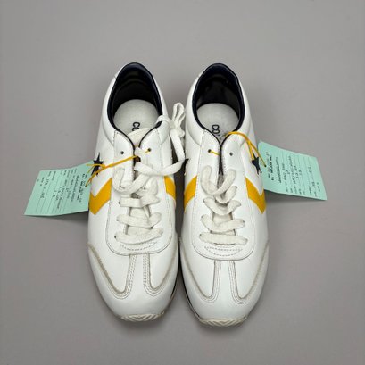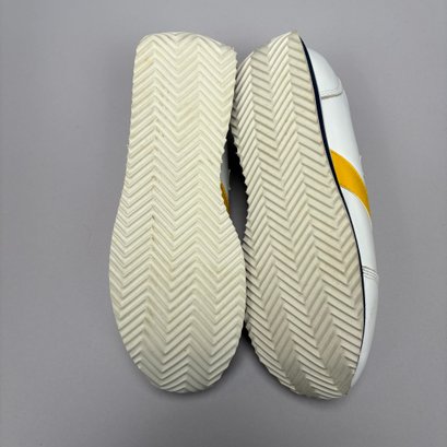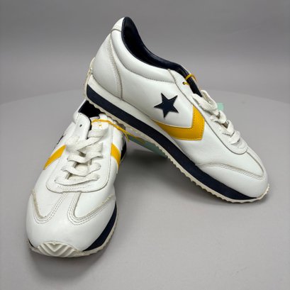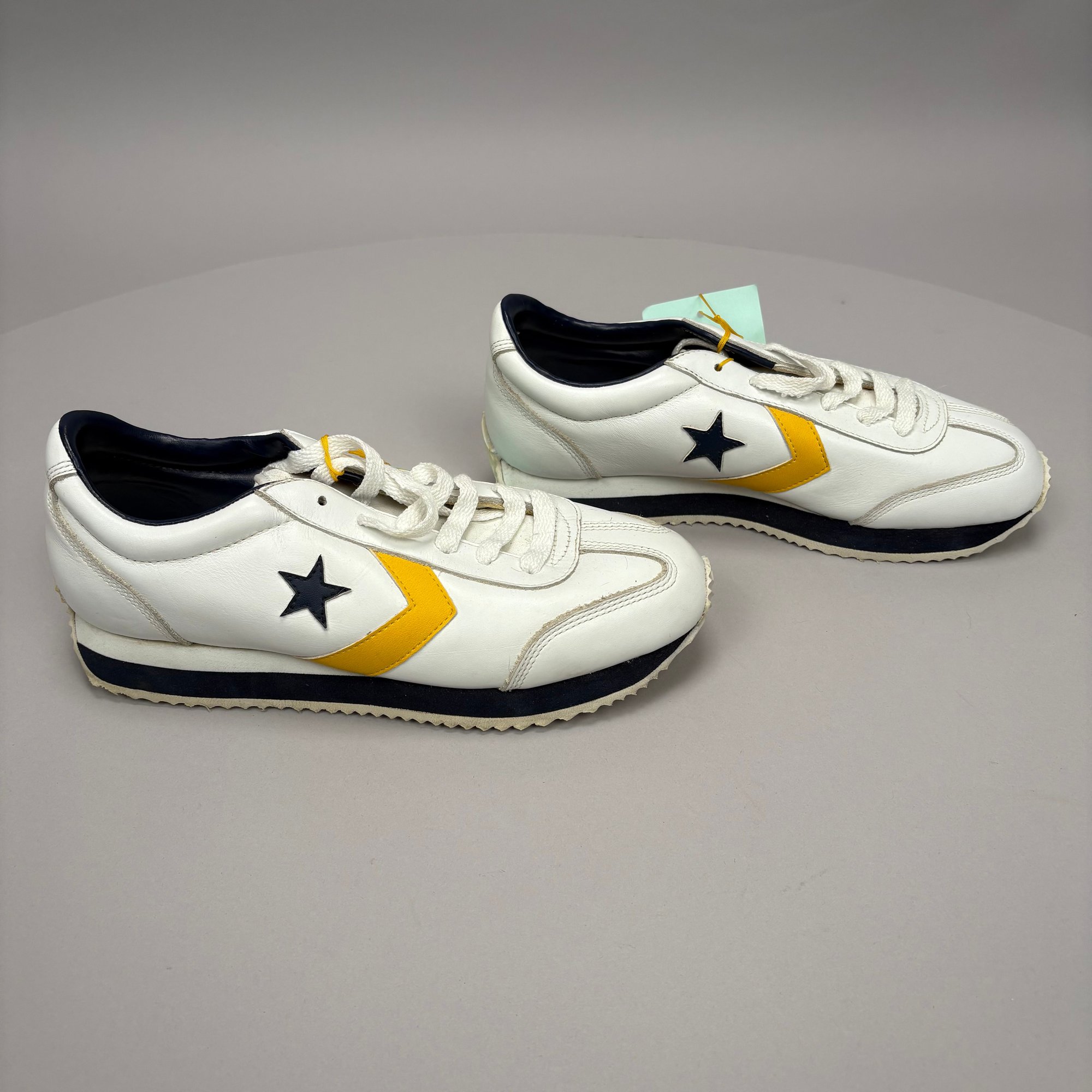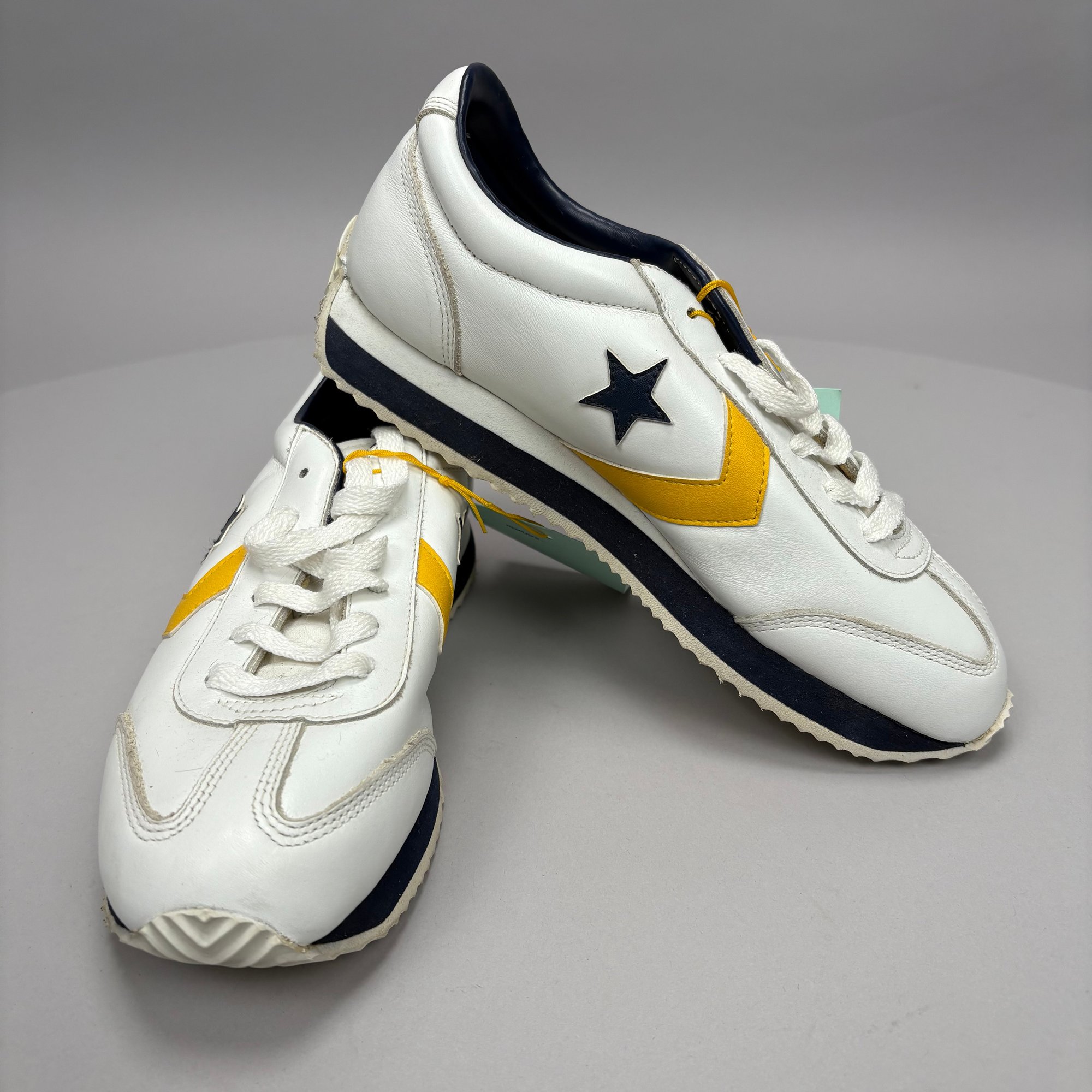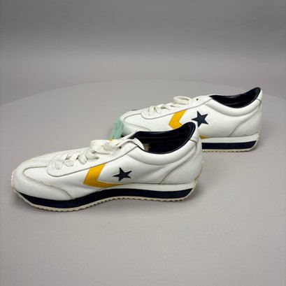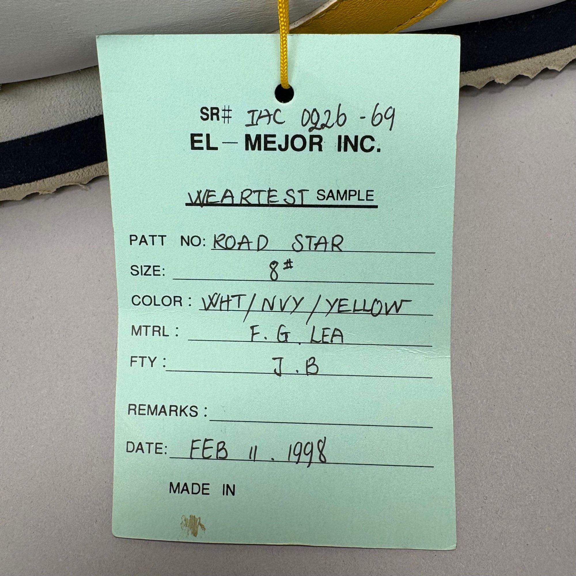 Vintage Old School Pair of Converse Road Star Sneakers. White, yellow and navy blue colorway, men's size 8; affixed with an "EL-MEJOR INC." tag printed "WEARTEST SAMPLE" and dated "FEB. 11 1998."