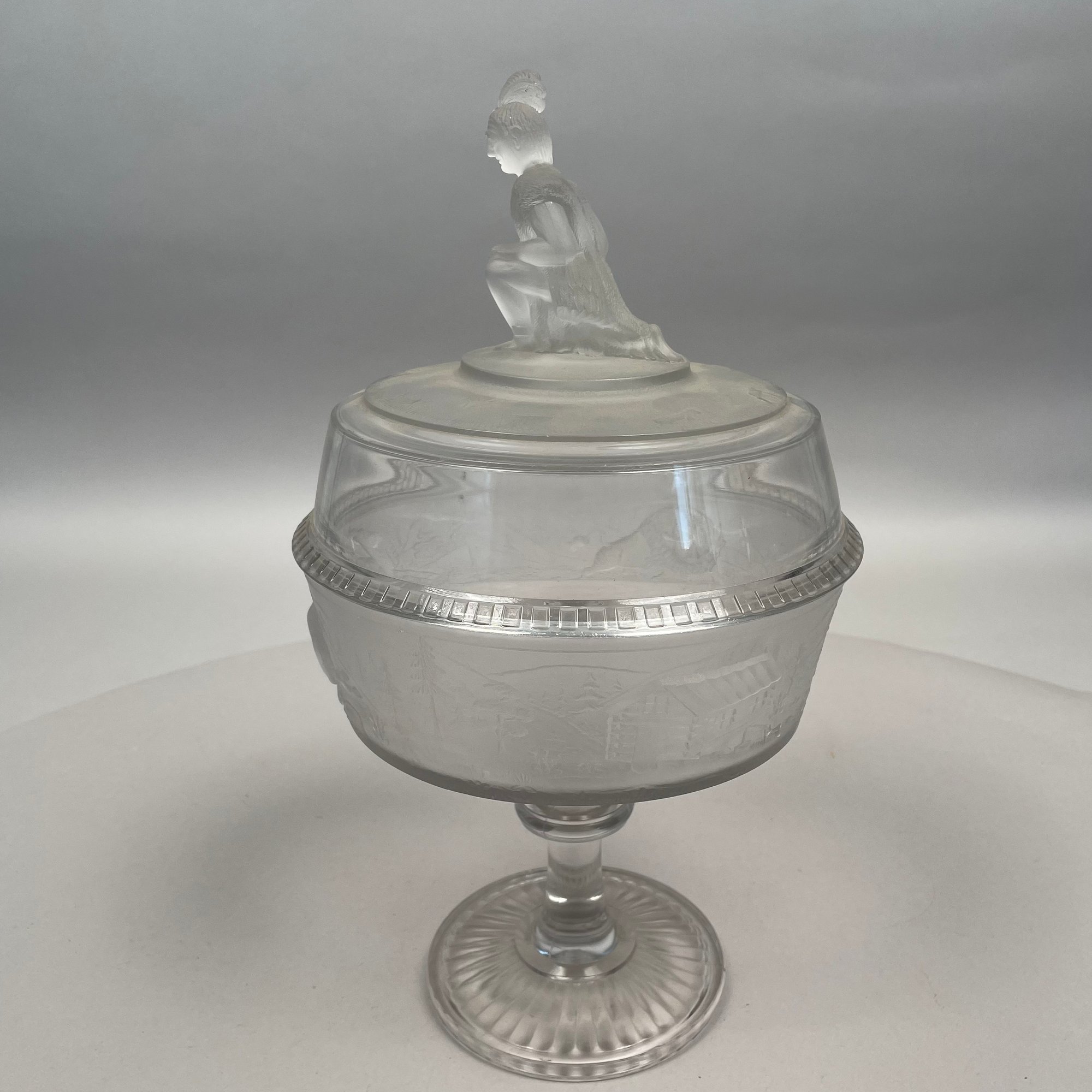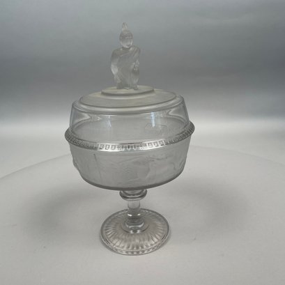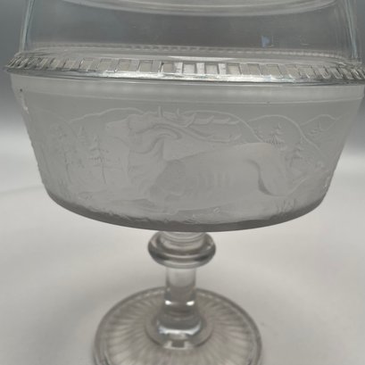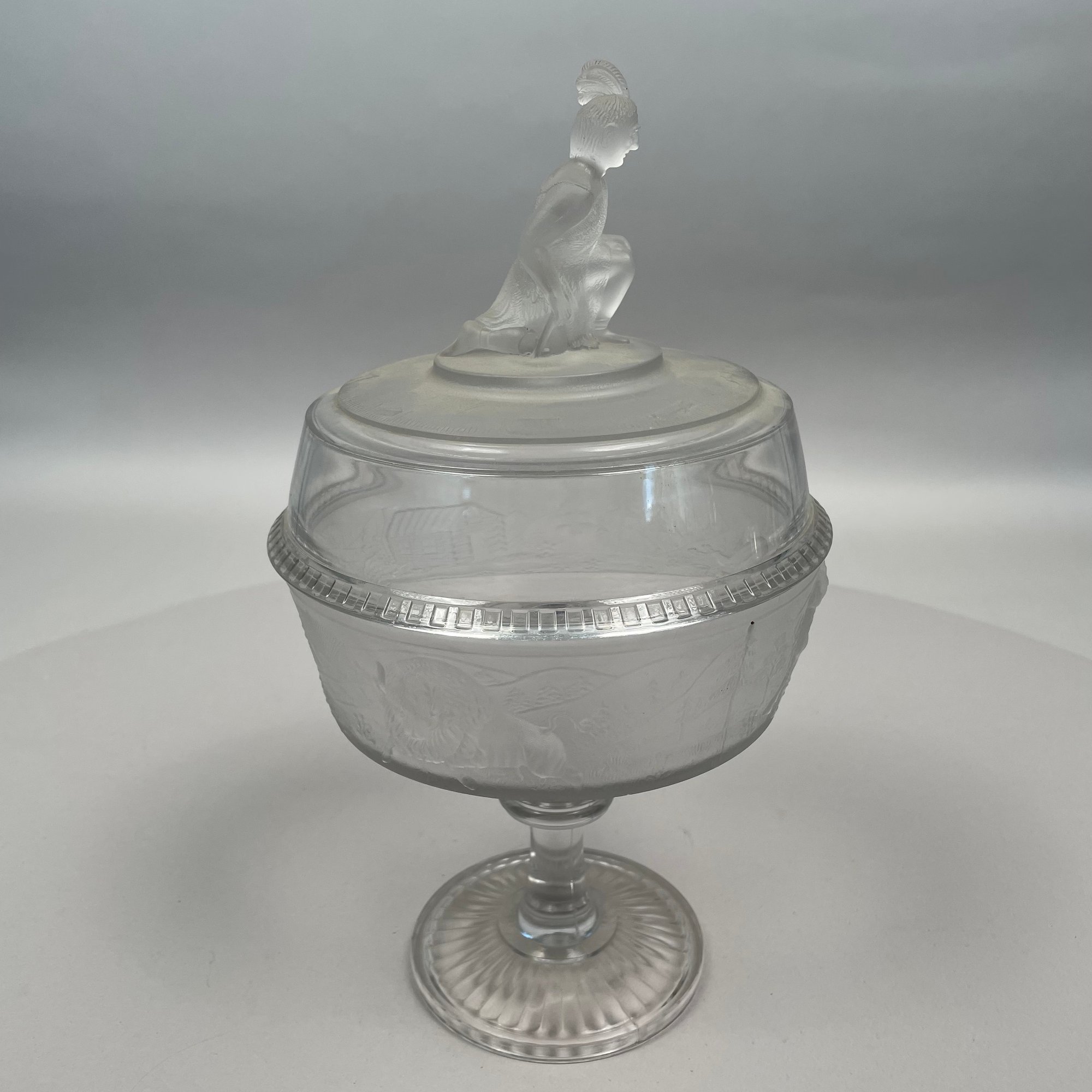 'Westward Ho!' Molded Colorless and Frosted Glass Compote, James Gillinder & Sons, Philadelphia, Pennsylvania, 1878-90.