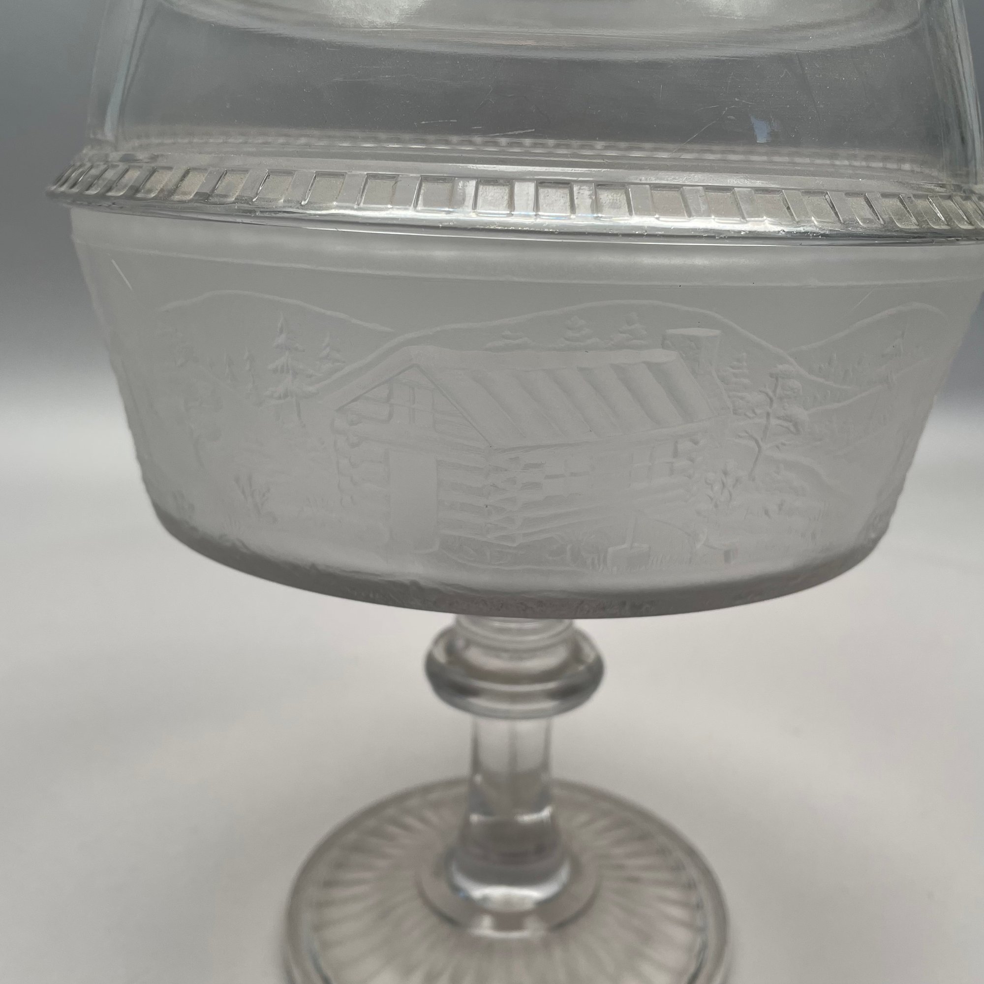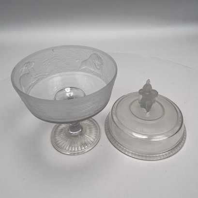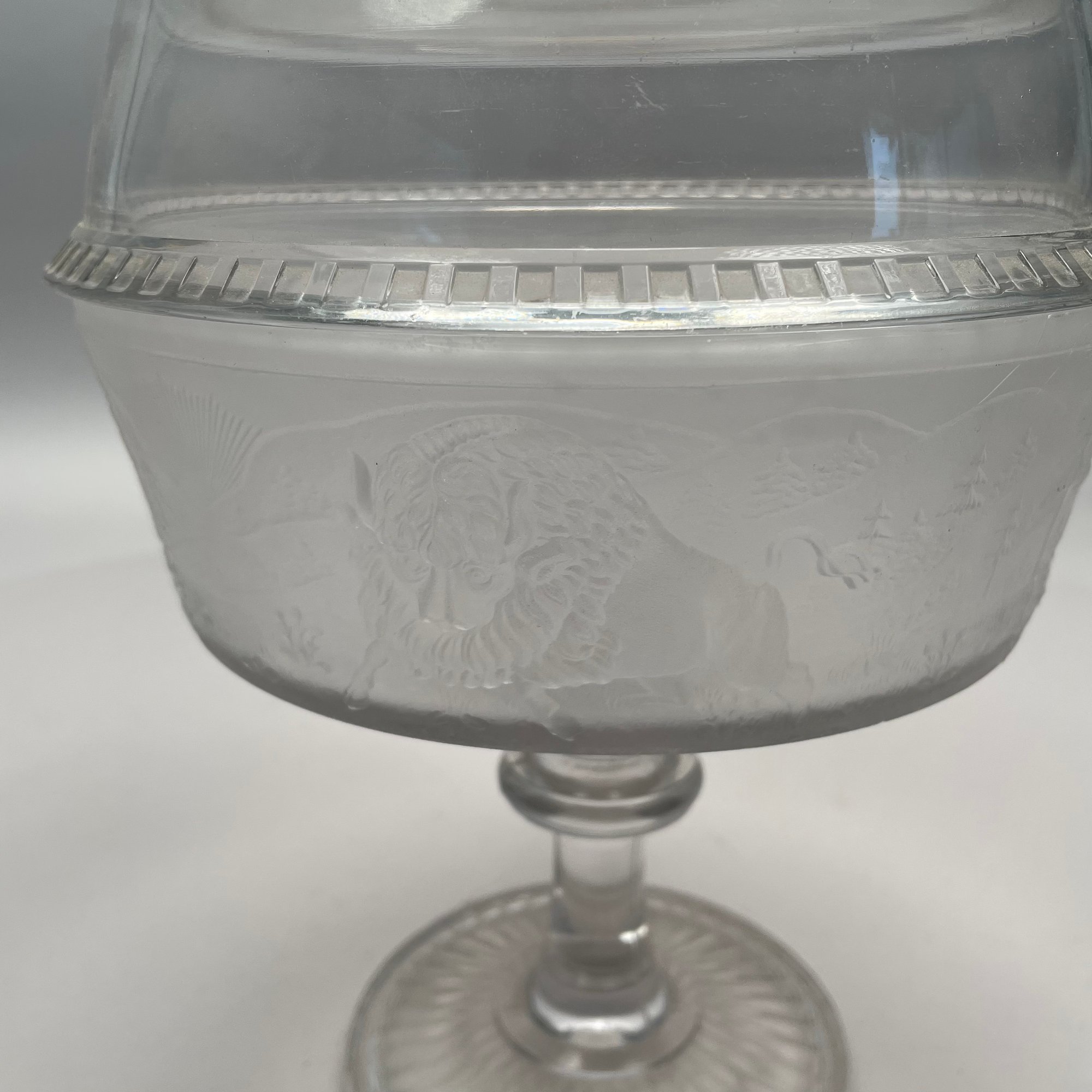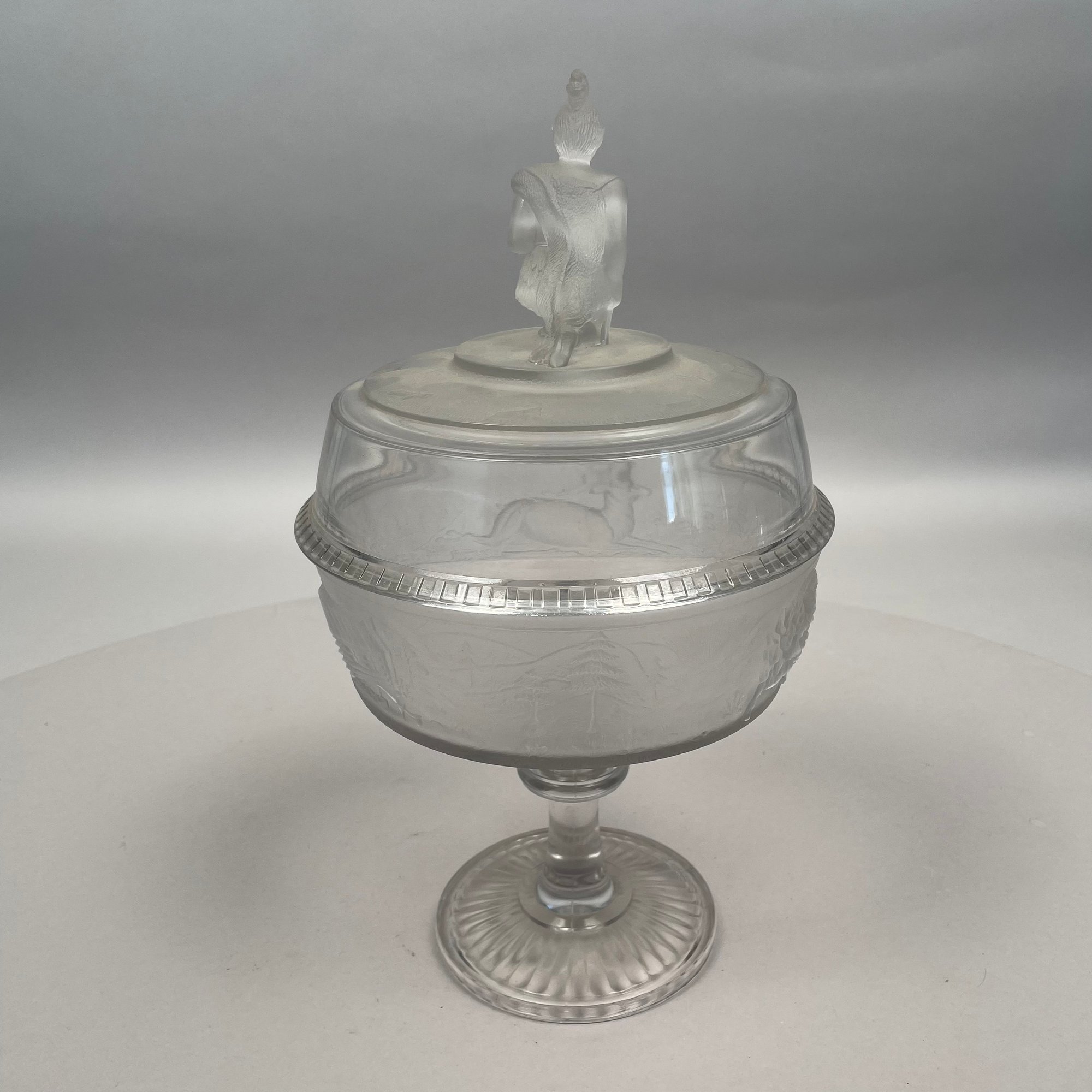 'Westward Ho!' Molded Colorless and Frosted Glass Compote, James Gillinder & Sons, Philadelphia, Pennsylvania, 1878-90.