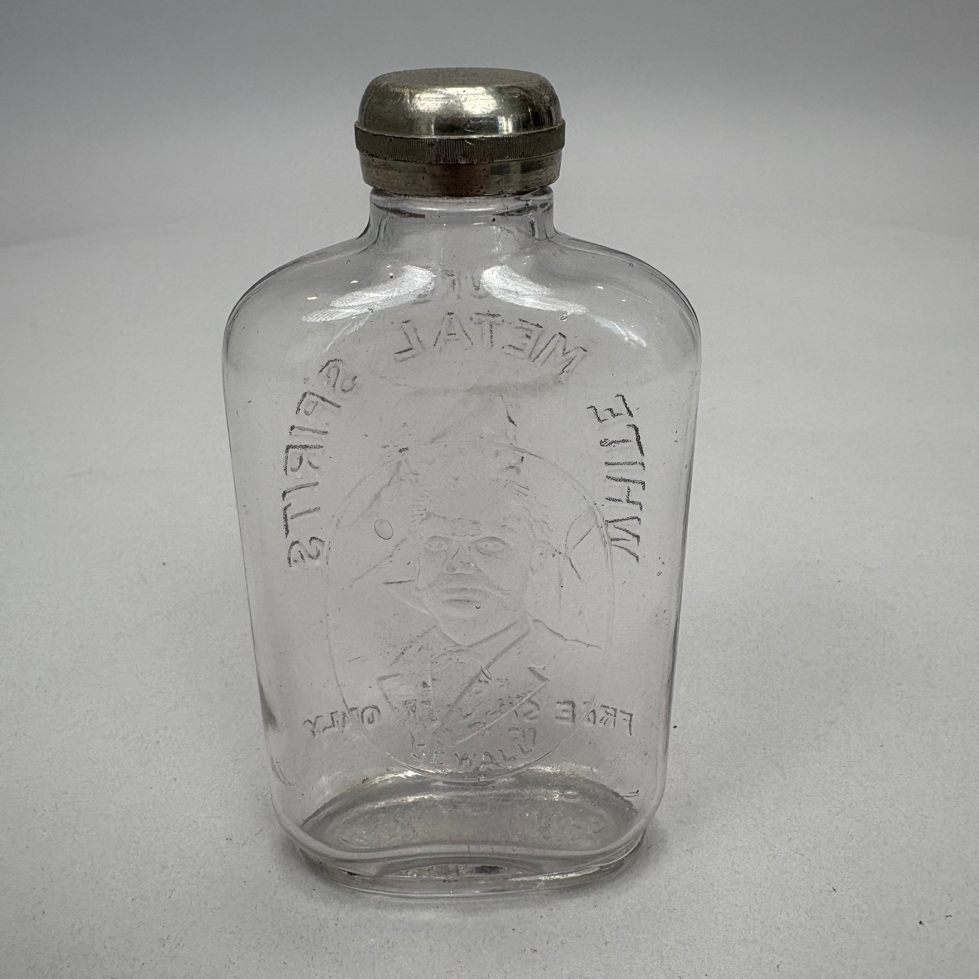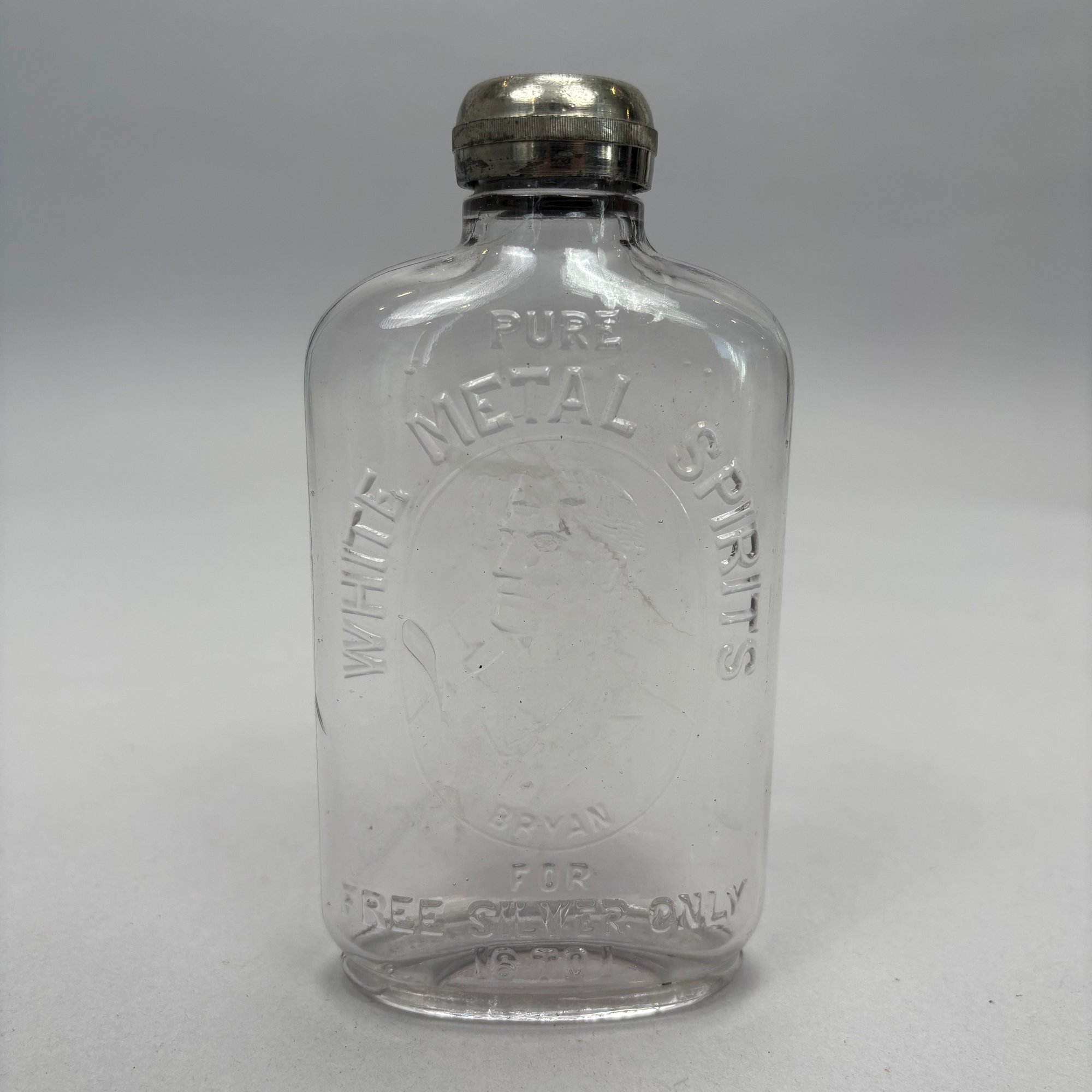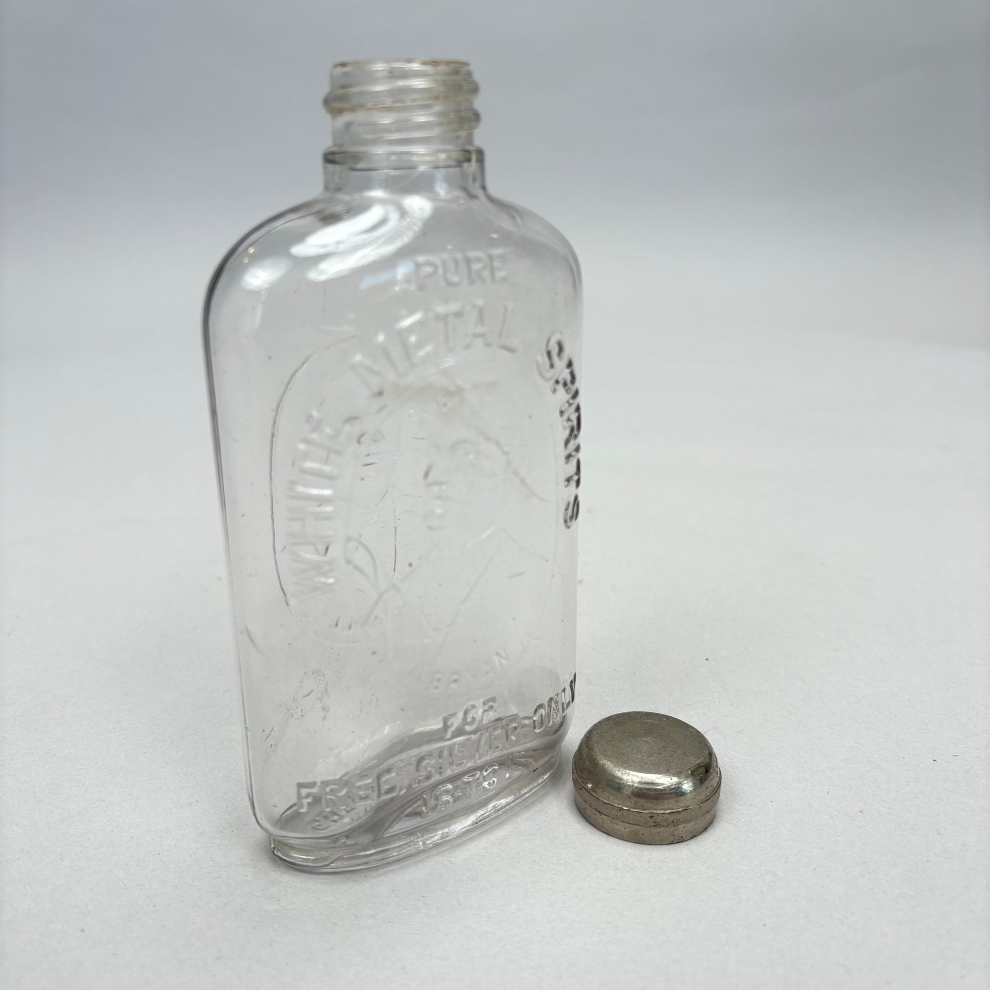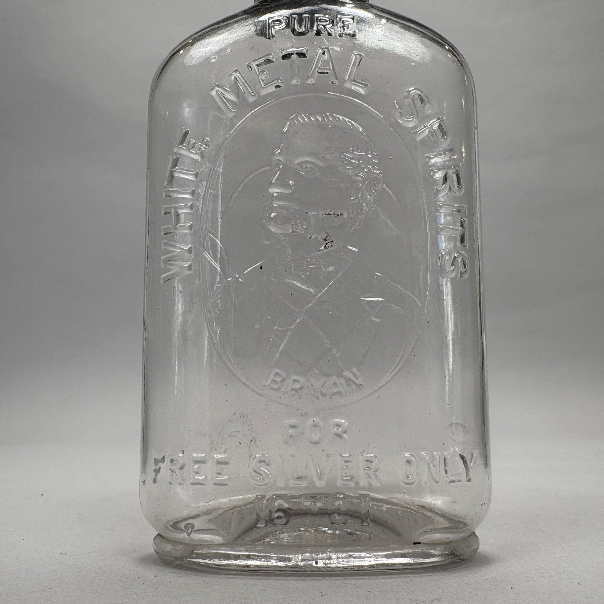 William J. Bryan and Arthur Sewall Presidential Molded Colorless Glass Pint Whiskey Flask, 1896. Molded on the front with a portrait of "BRYAN" and inscribed "PURE WHITE METAL SPIRITS/ FOR FREE SILVER ONLY 16 TO 1," and on the other side with a portrait of "SEWALL," the bottom molded "TRADE MARK REG'D/ PAT. AP FOR."