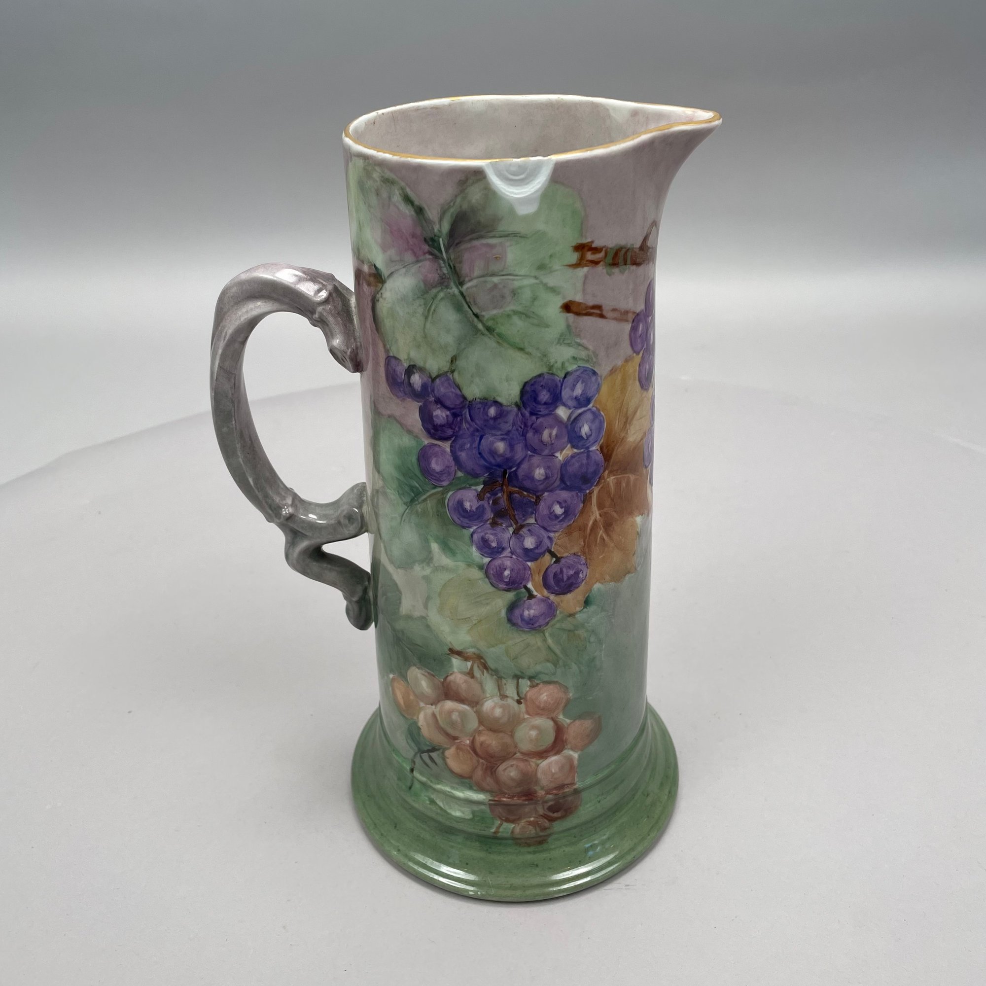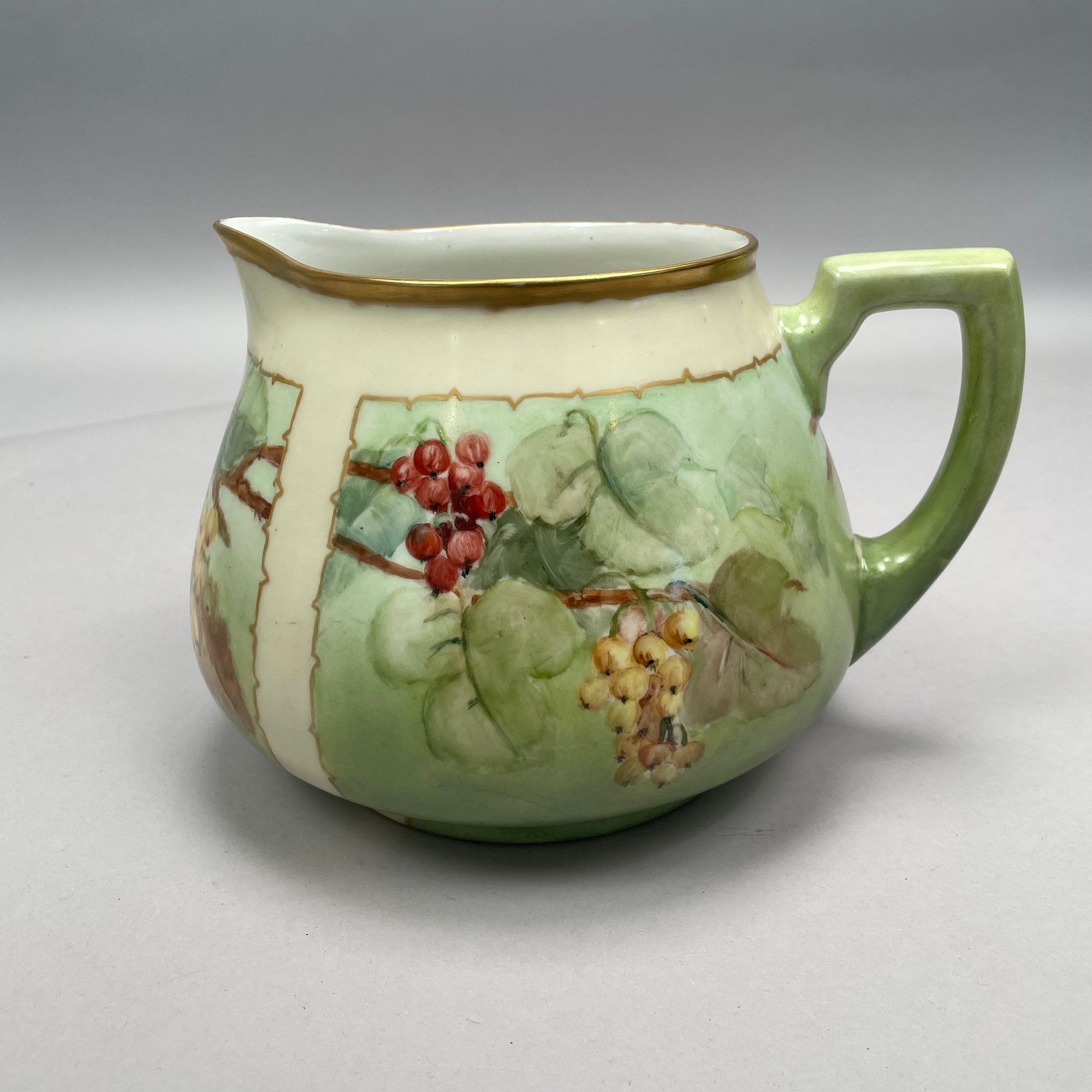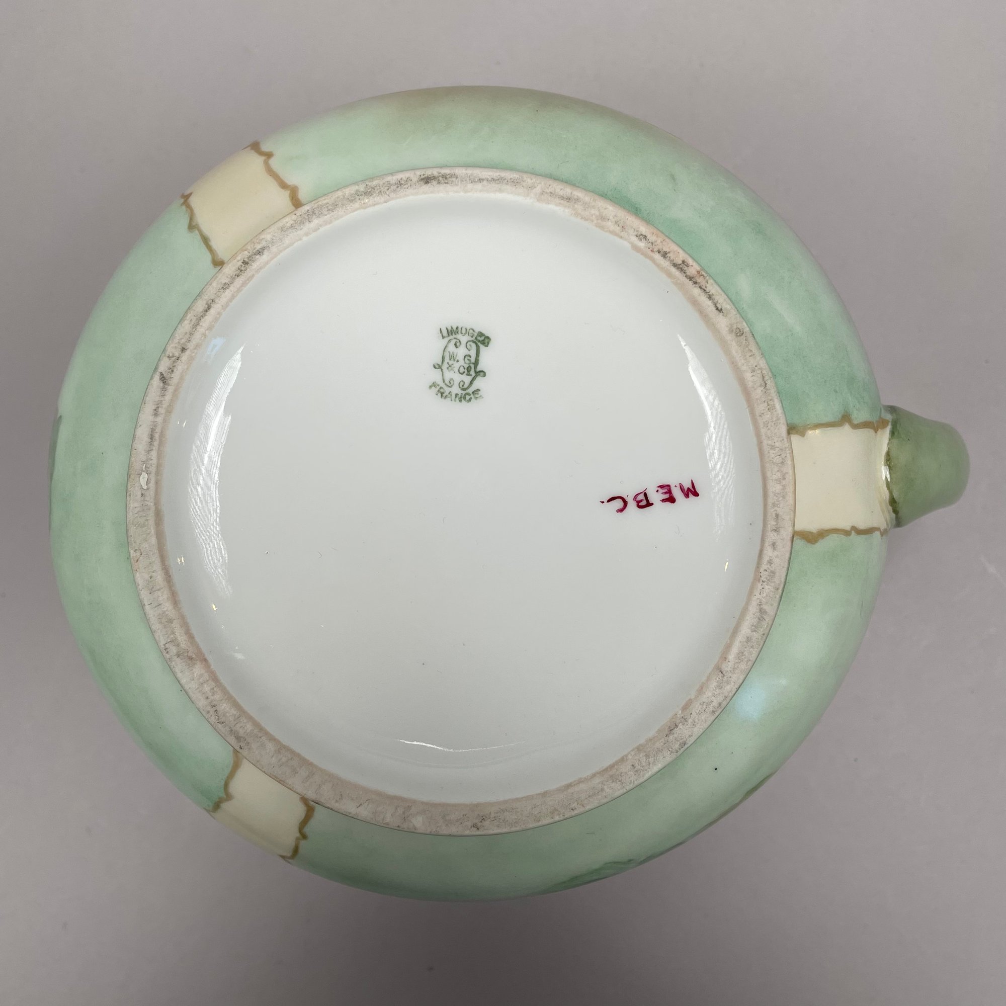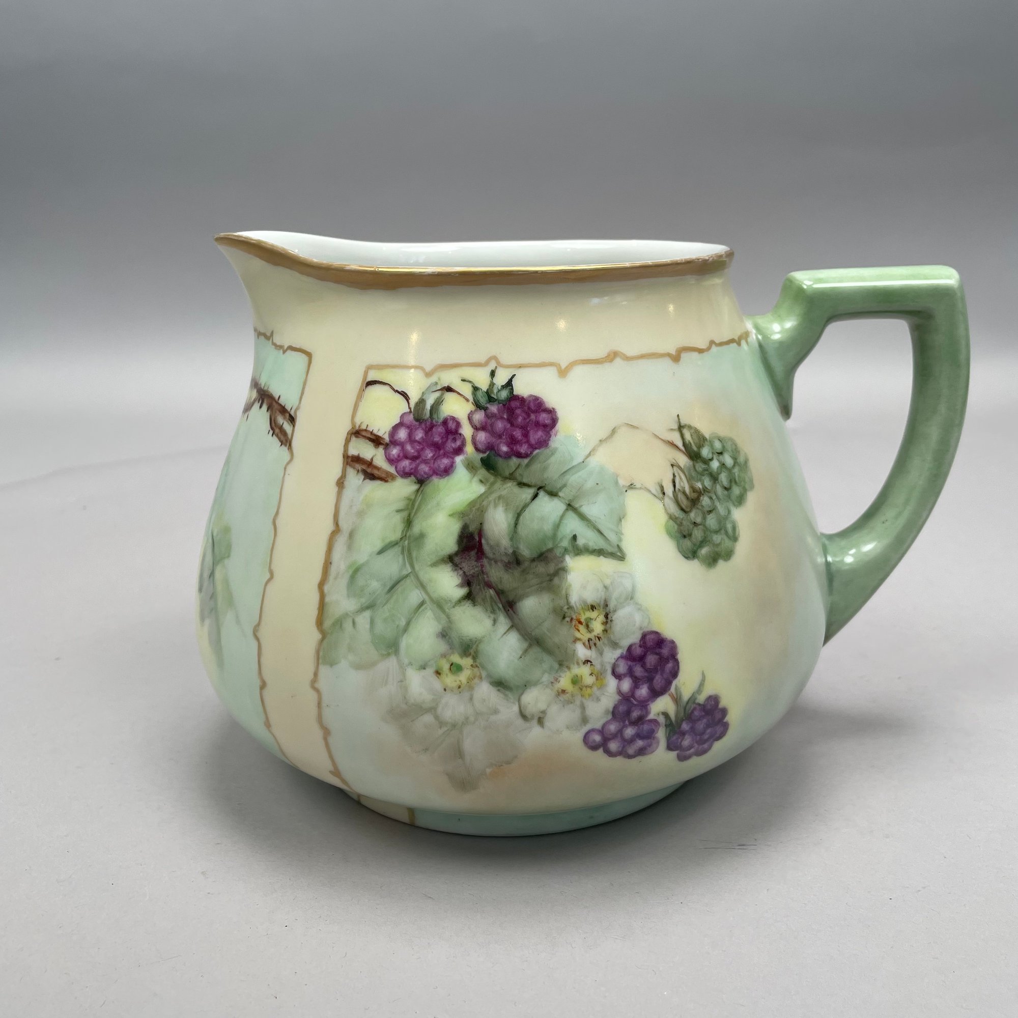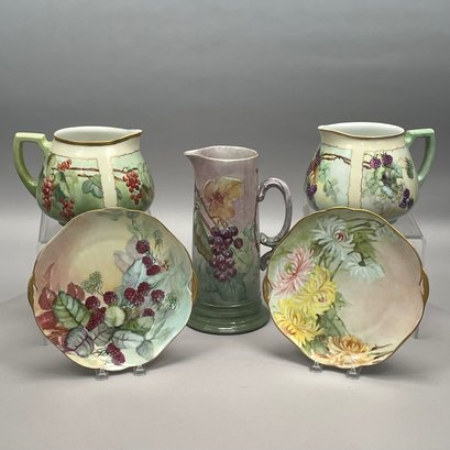 Women China Decorators, Five Porcelain Wares, Painted by Mollie Elizabeth Bartlett Carpenter, 1908- circa 1910. Comprising a pair of German plates, each signed on the reverse with the initials "M.E.B." and one dated "'08," each with printed (Hermann) Ohme Silesia factory mark; a pair of William Guerin Limoges pitchers, one signed beneath with the initials and date "M.E.B./ '09," the other with the initials "M.E.B.C.," each piece with printed "W.G. & Co." factory mark; and a Jean Pouyat Limoges tankard, signed beneath "M.E.Bartlett," printed "JPL" factory mark.