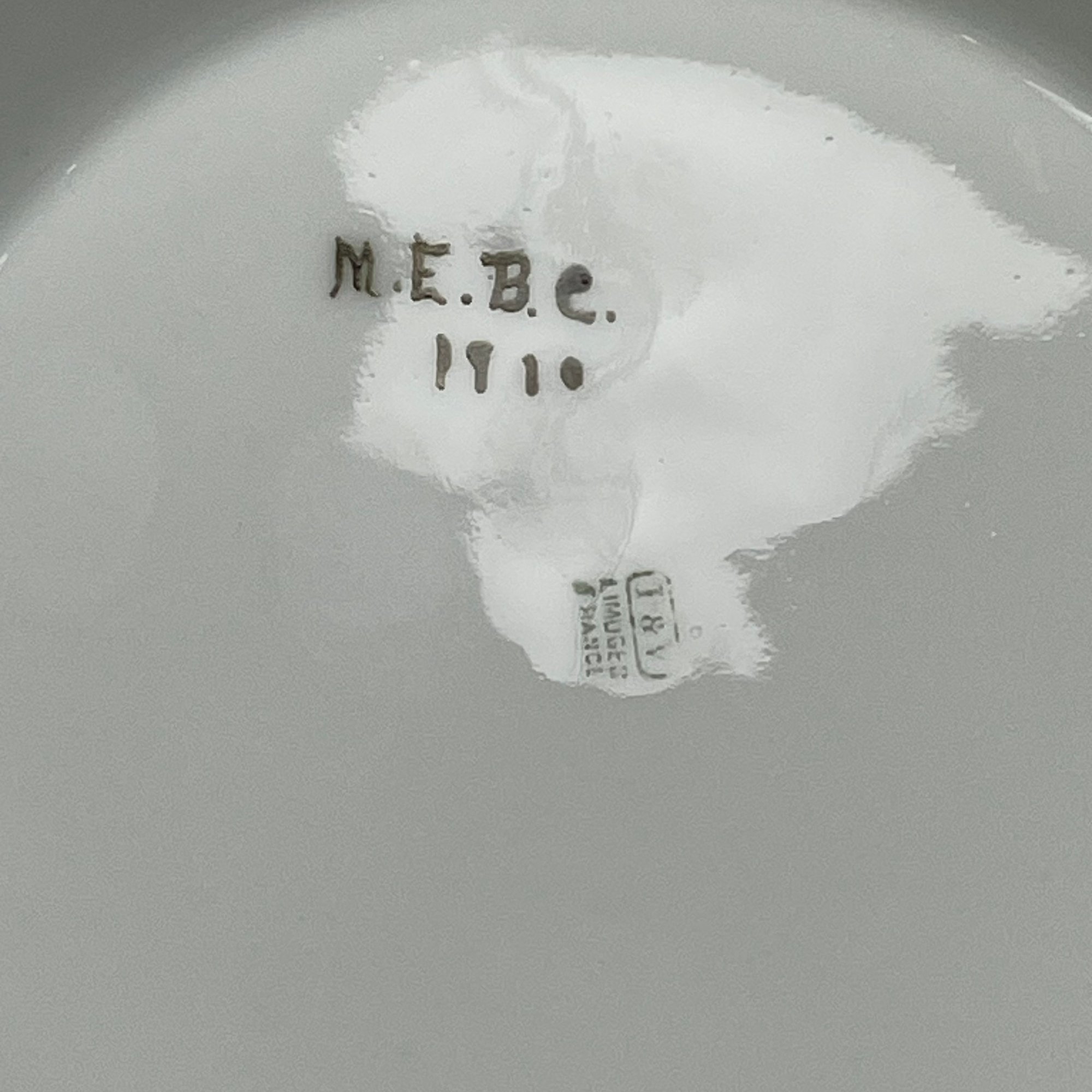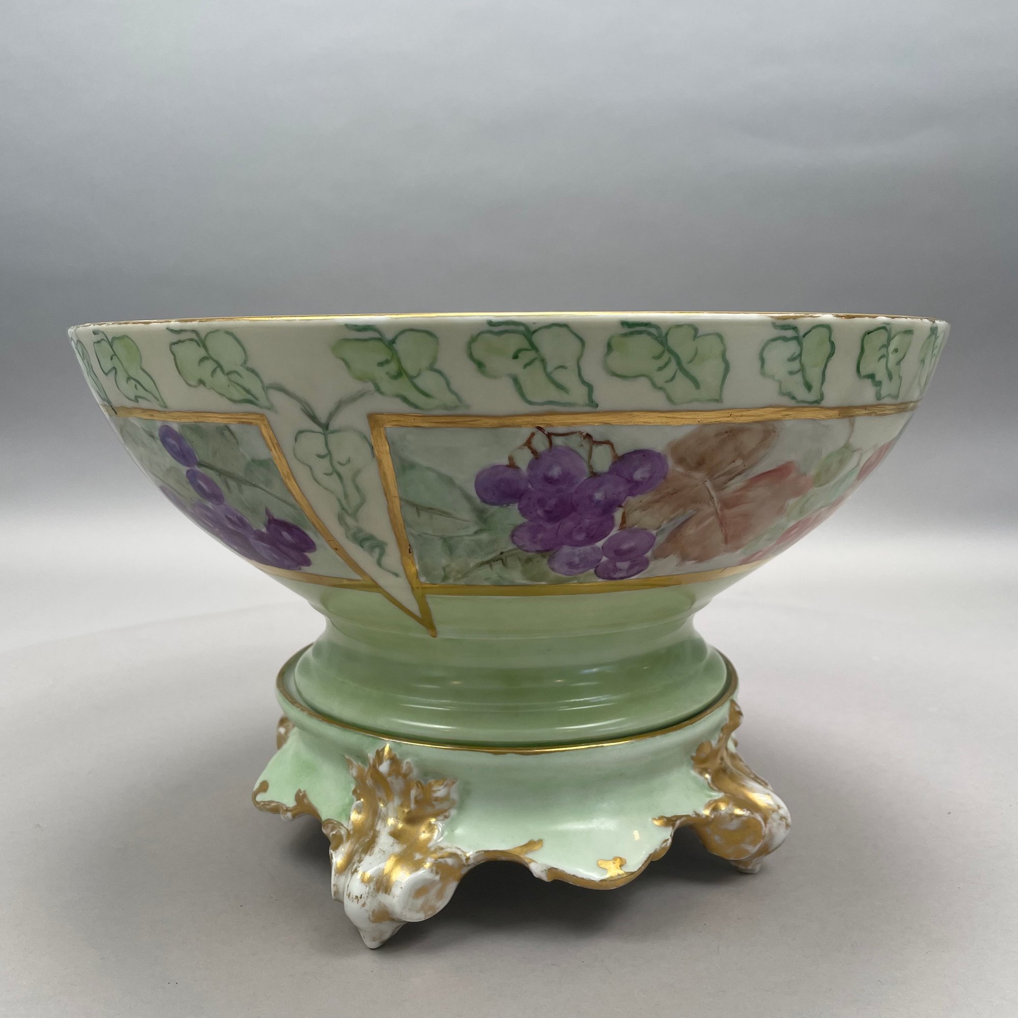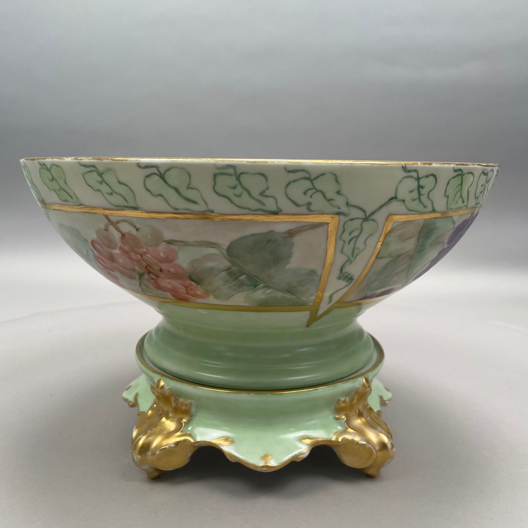 Women China Decorators, Tressemanes & Vogt Limoges Porcelain Punch Bowl and Stand, Painted by Mollie Elizabeth Bartlett Carpenter, Dated 1910. Signed beneath the bowl with the initials "M.E.B.C./ 1910," each piece with printed "T & V" factory mark.