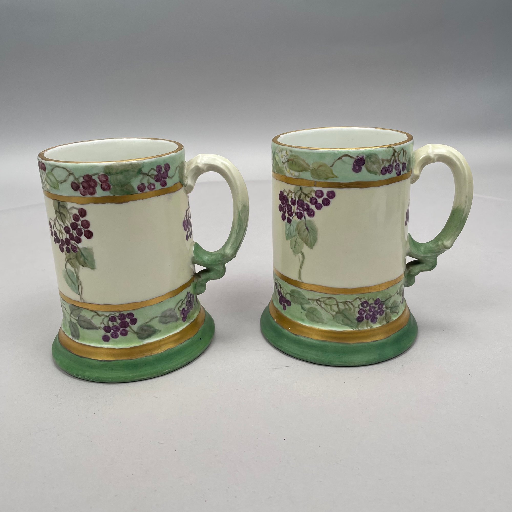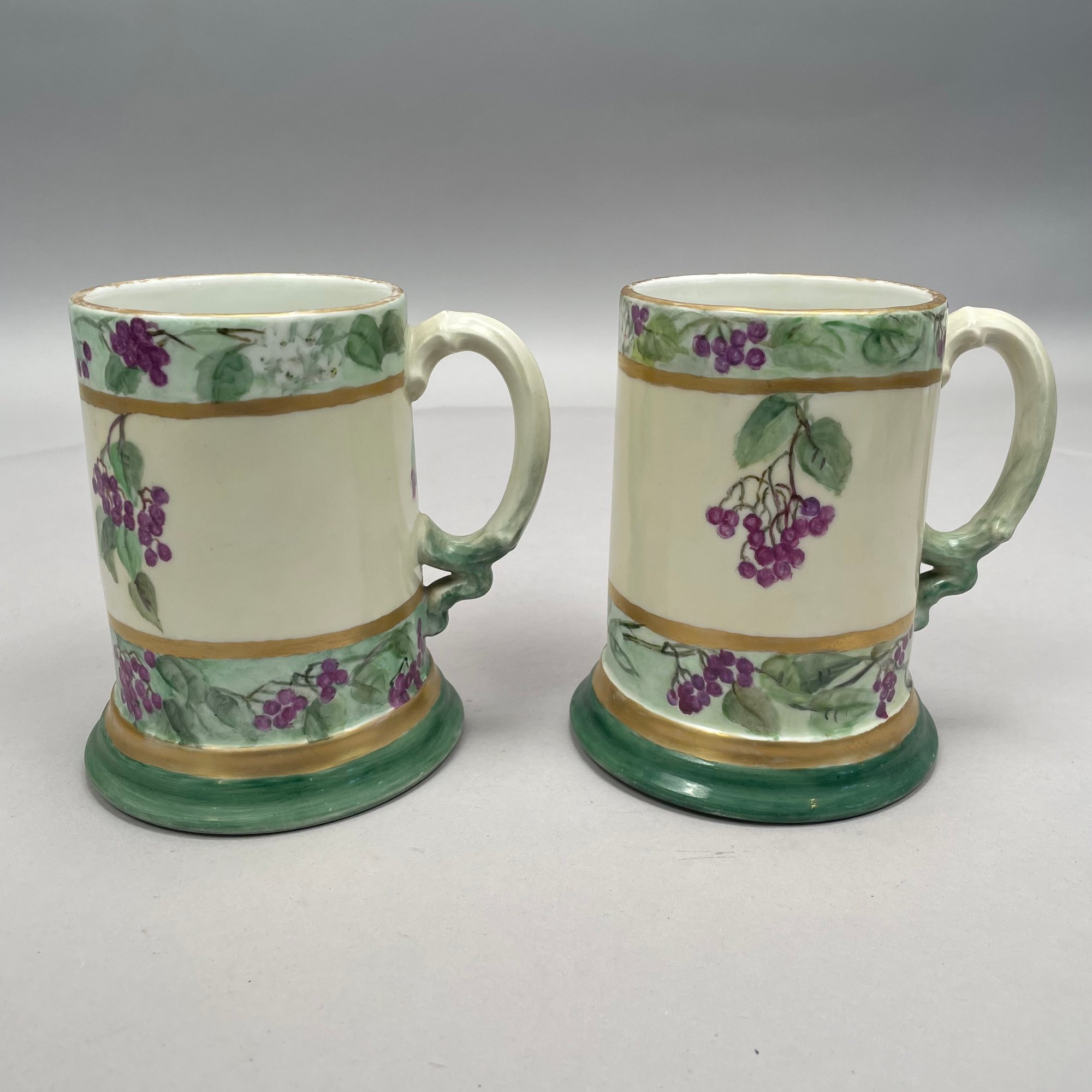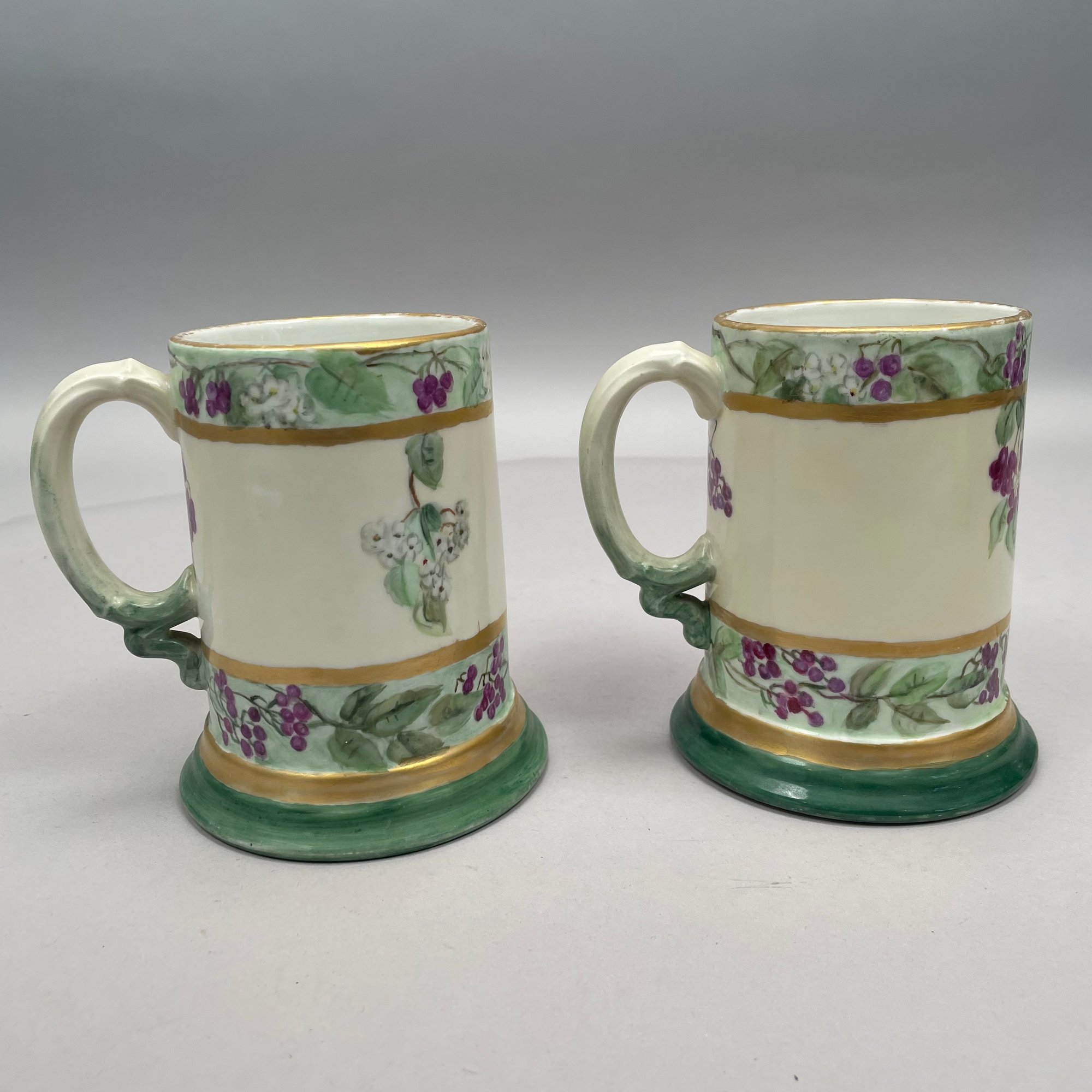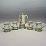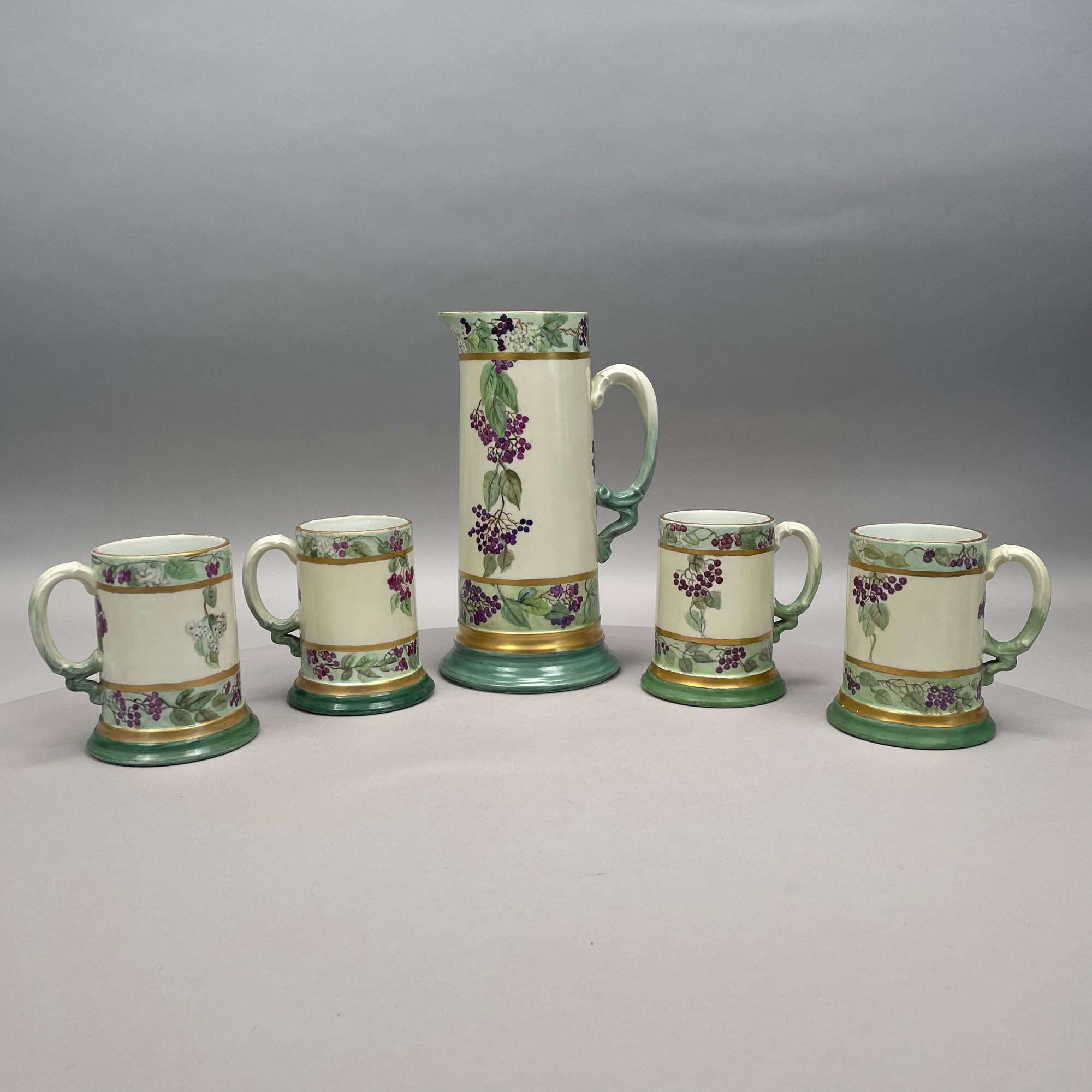 Women China Decorators, Limoges Porcelain Five-Piece Tankard Set, Jean Pouyat Limoges, Circa 1910. Comprising a tankard and five steins or mugs, signed beneath the tankard with the initials ""M.E.B.C.," each with printed "JPL" factory mark.