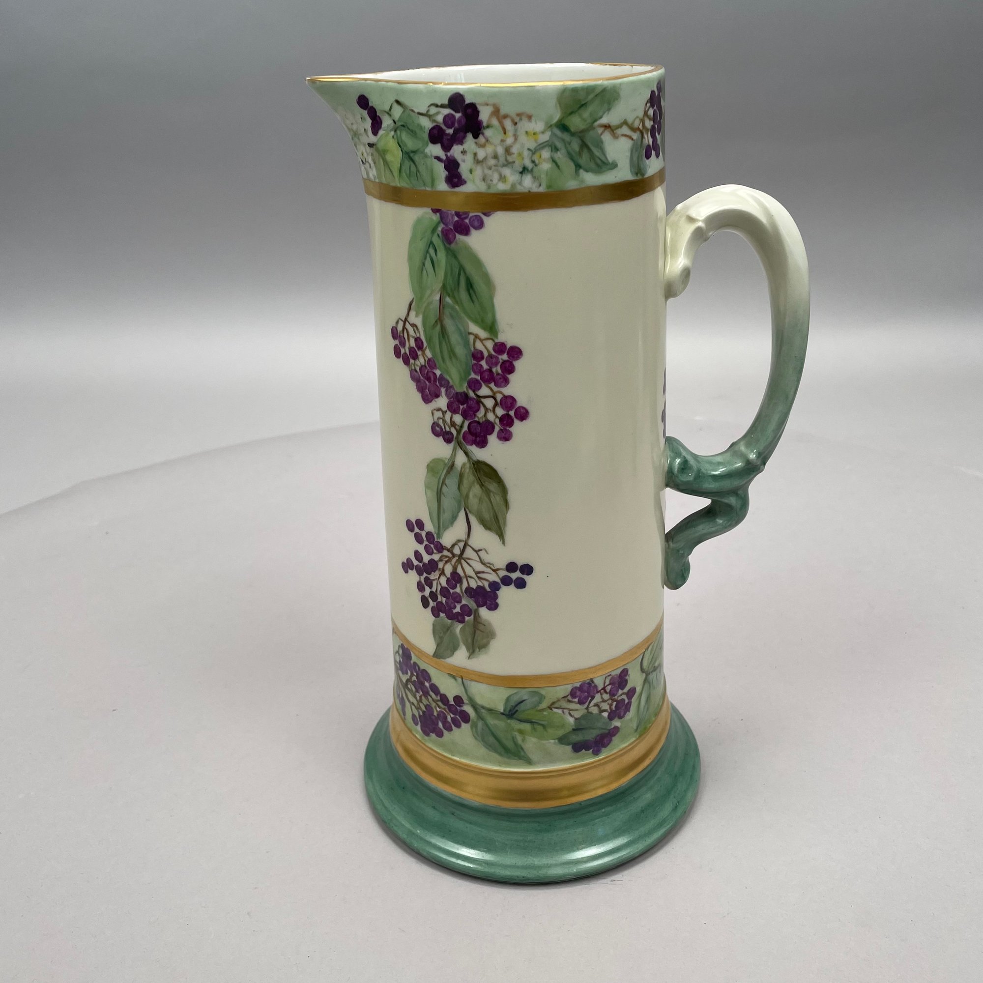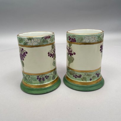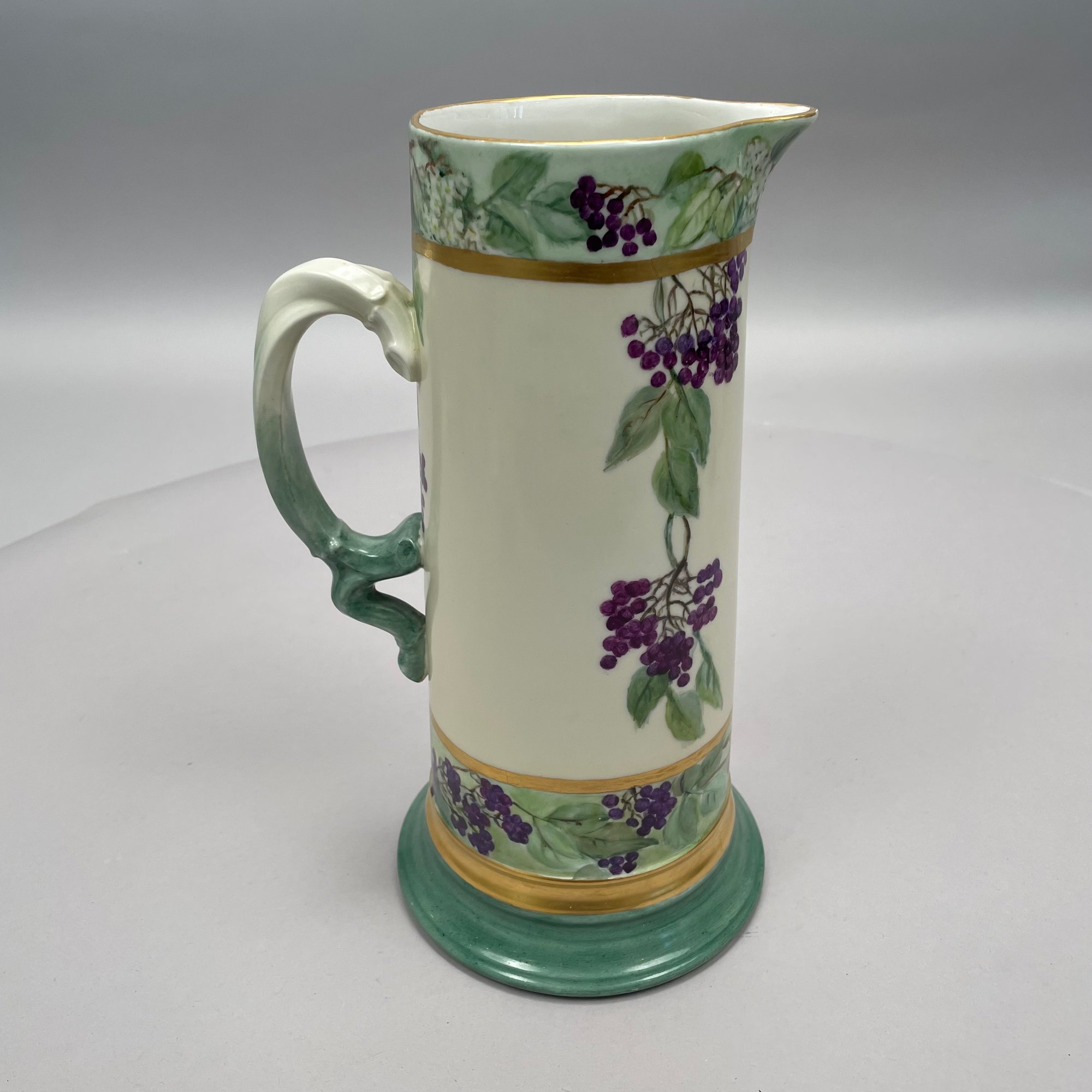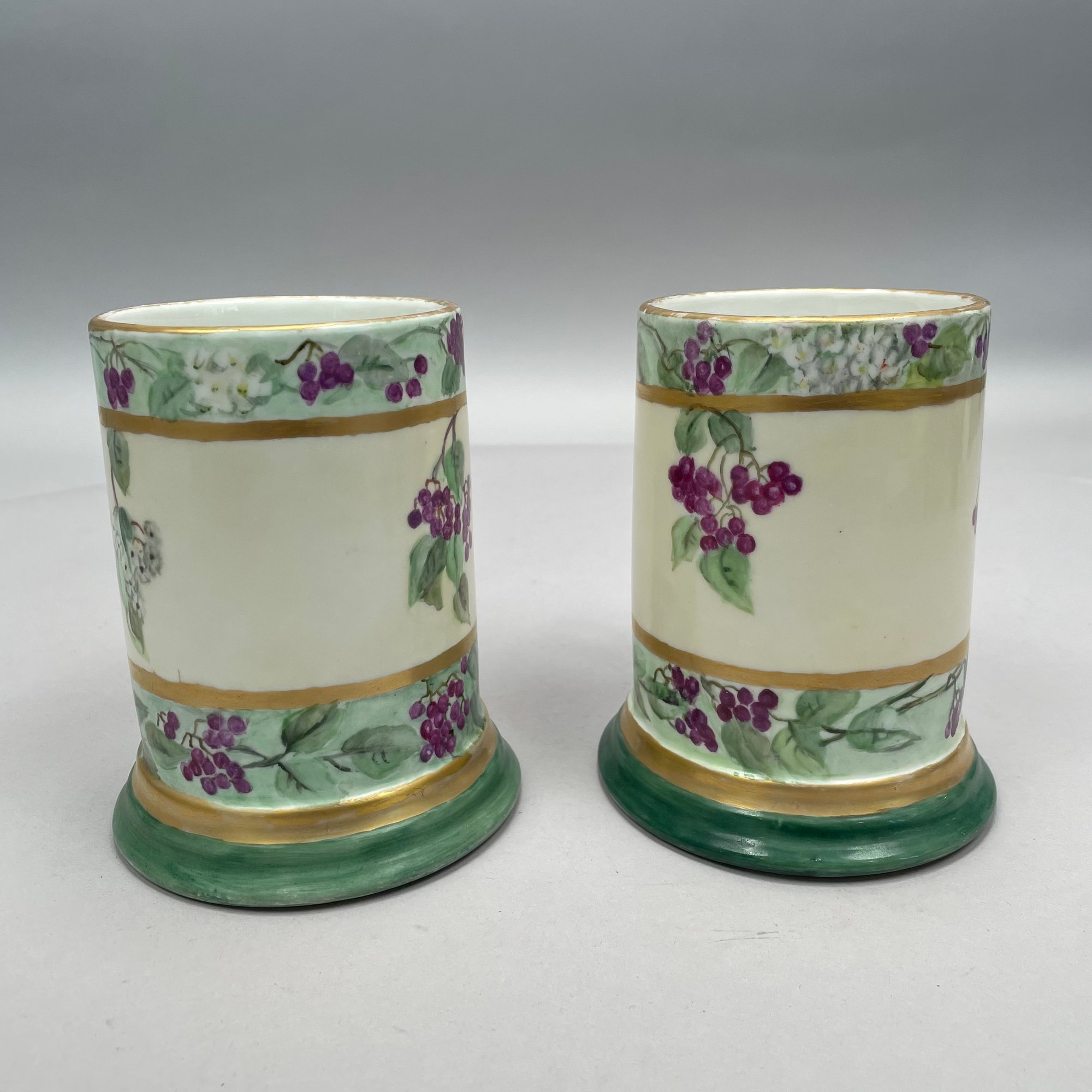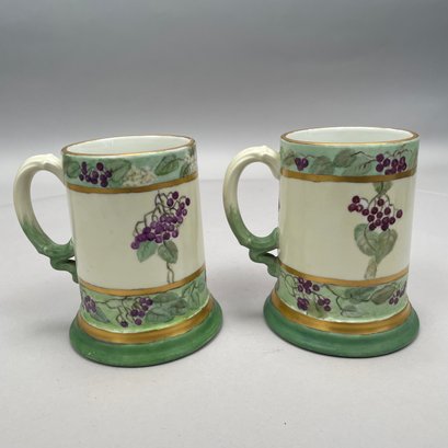 Women China Decorators, Limoges Porcelain Five-Piece Tankard Set, Jean Pouyat Limoges, Circa 1910. Comprising a tankard and five steins or mugs, signed beneath the tankard with the initials ""M.E.B.C.," each with printed "JPL" factory mark.