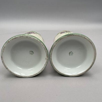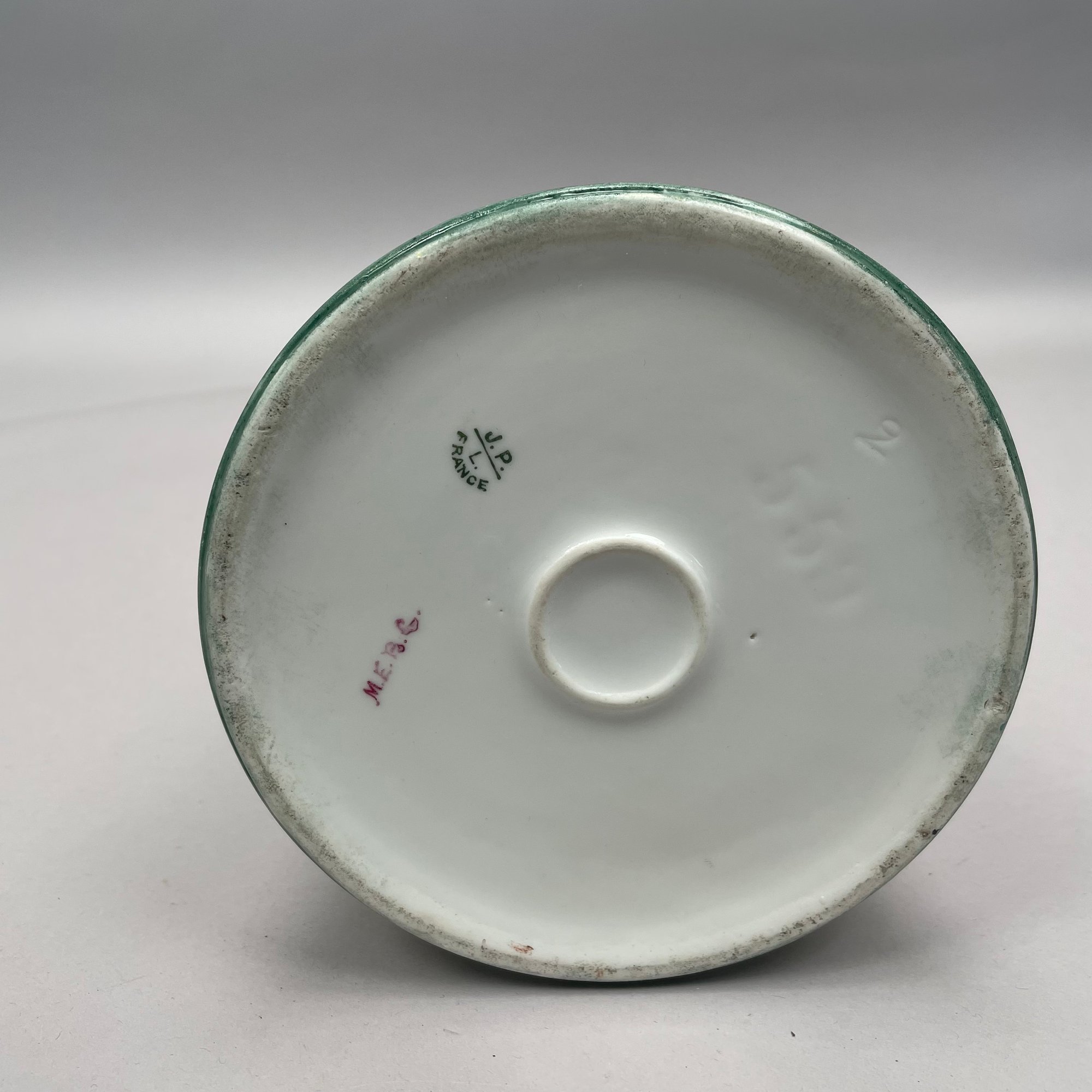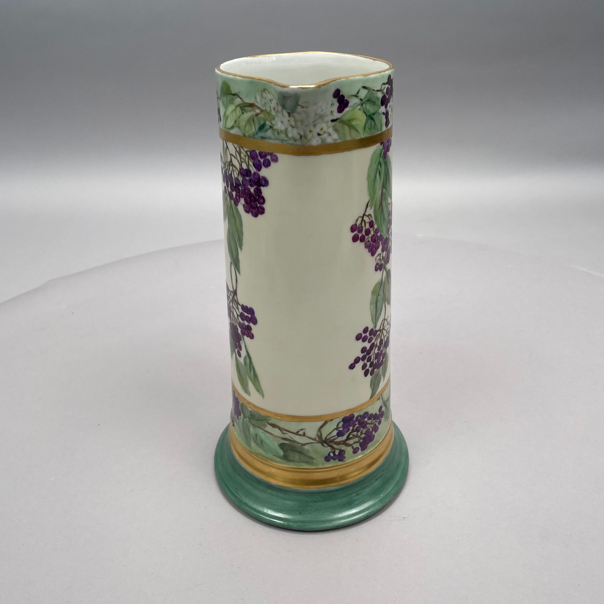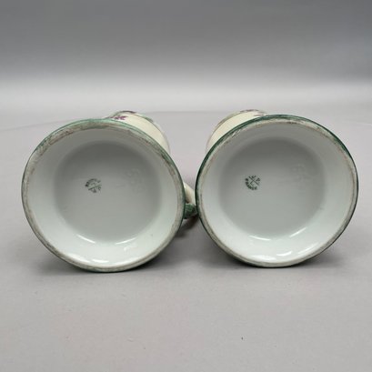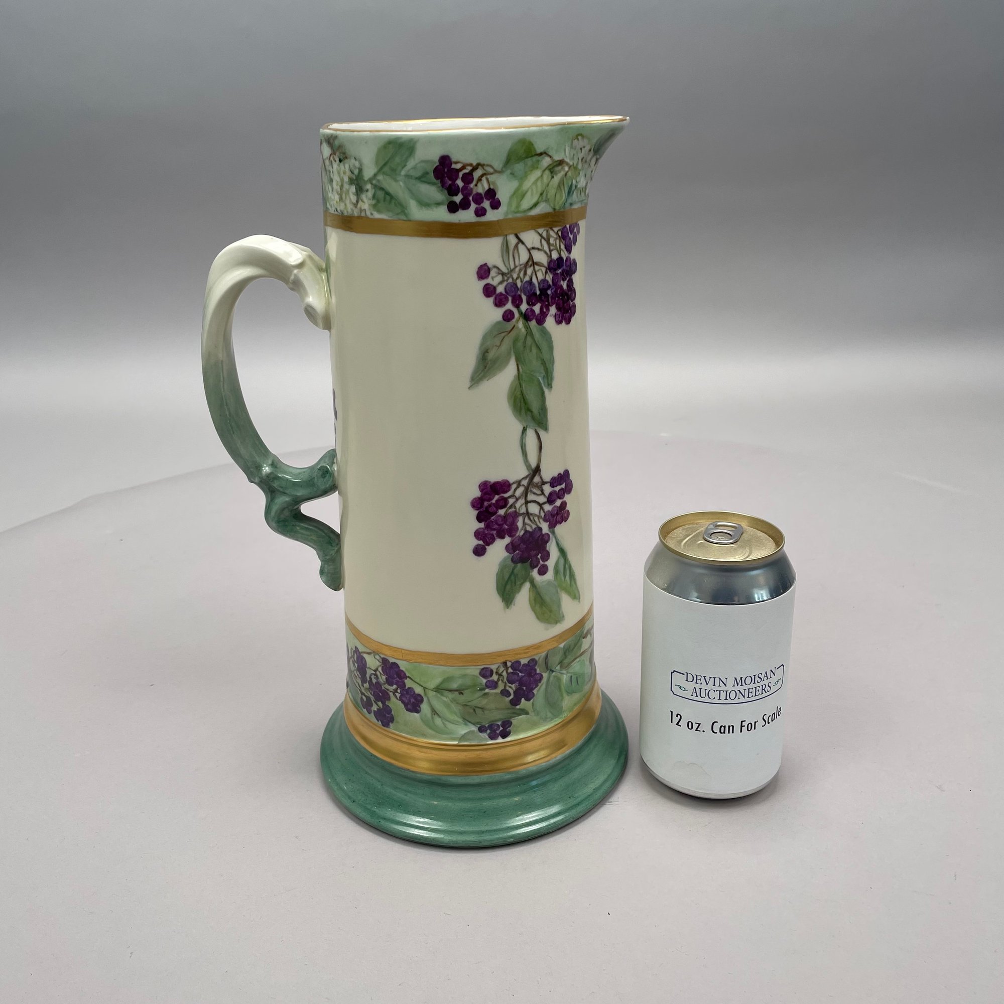 Women China Decorators, Limoges Porcelain Five-Piece Tankard Set, Jean Pouyat Limoges, Circa 1910. Comprising a tankard and five steins or mugs, signed beneath the tankard with the initials ""M.E.B.C.," each with printed "JPL" factory mark.