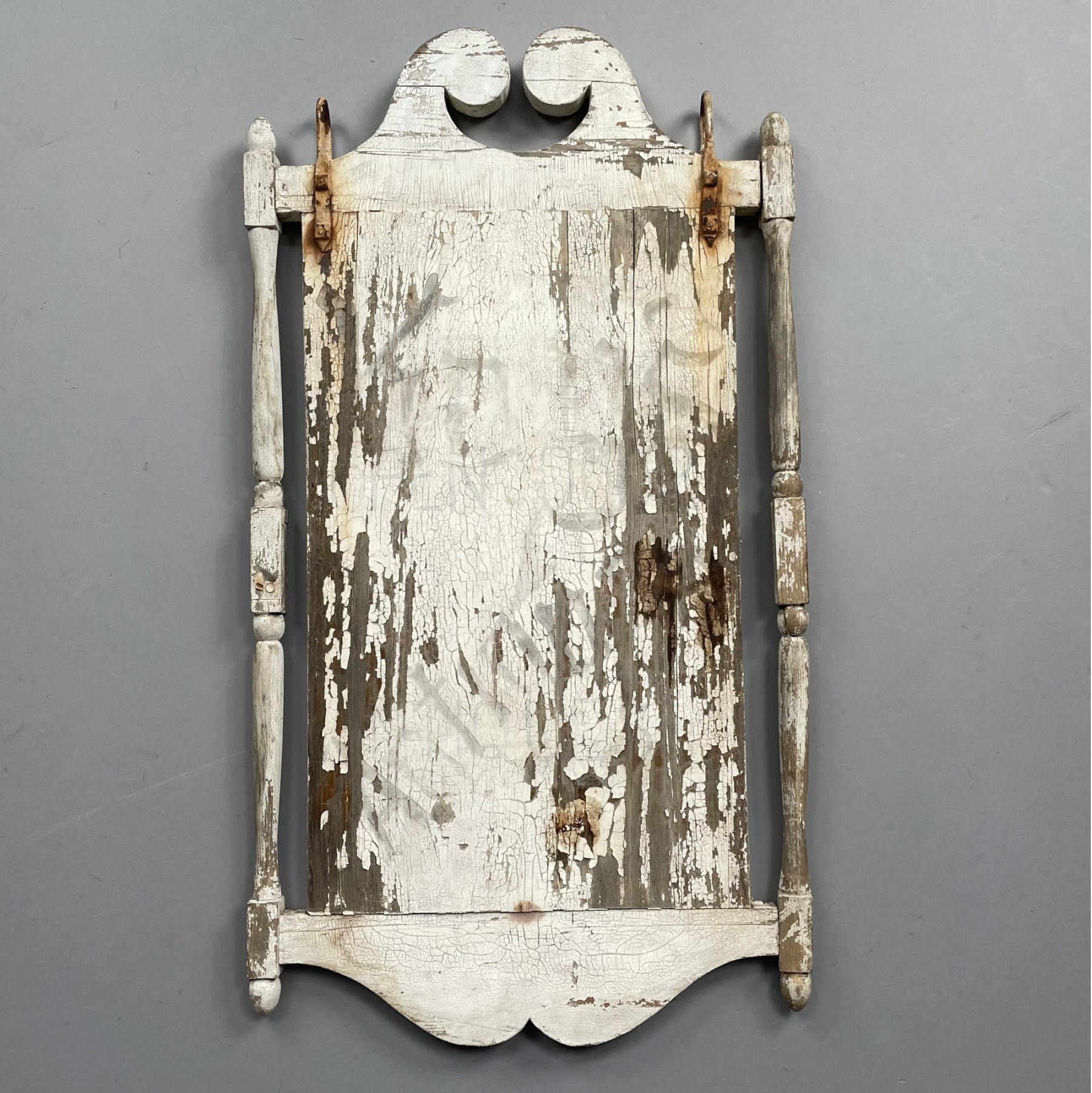 The scrolled broken arch pediment above a panel within block-and-vase turned freestanding columns, over a serpentine apron, fitted with iron hangers.