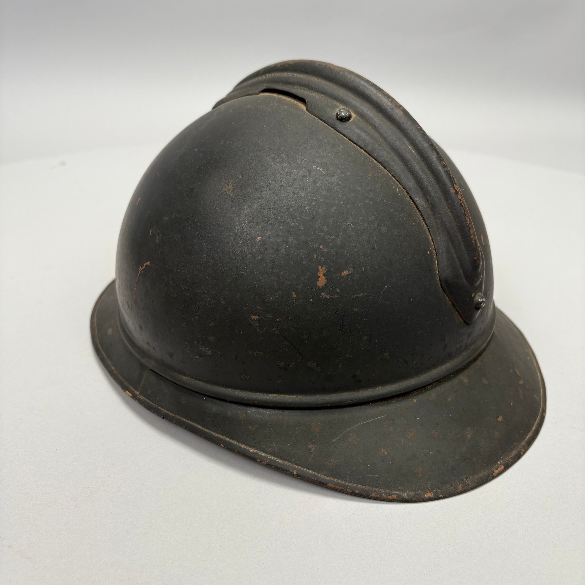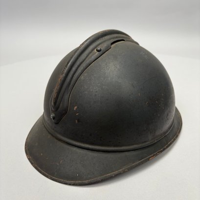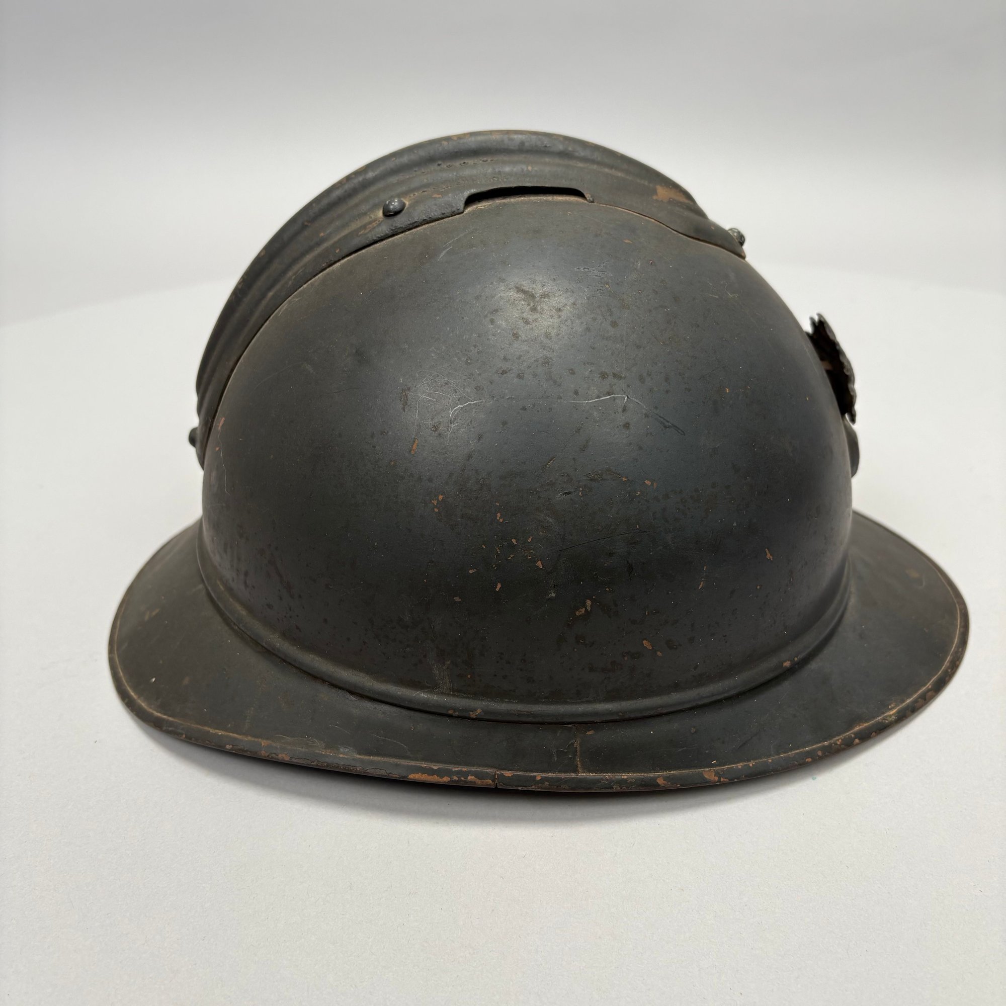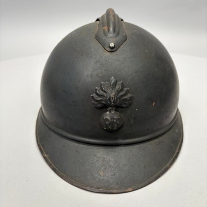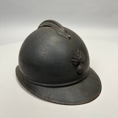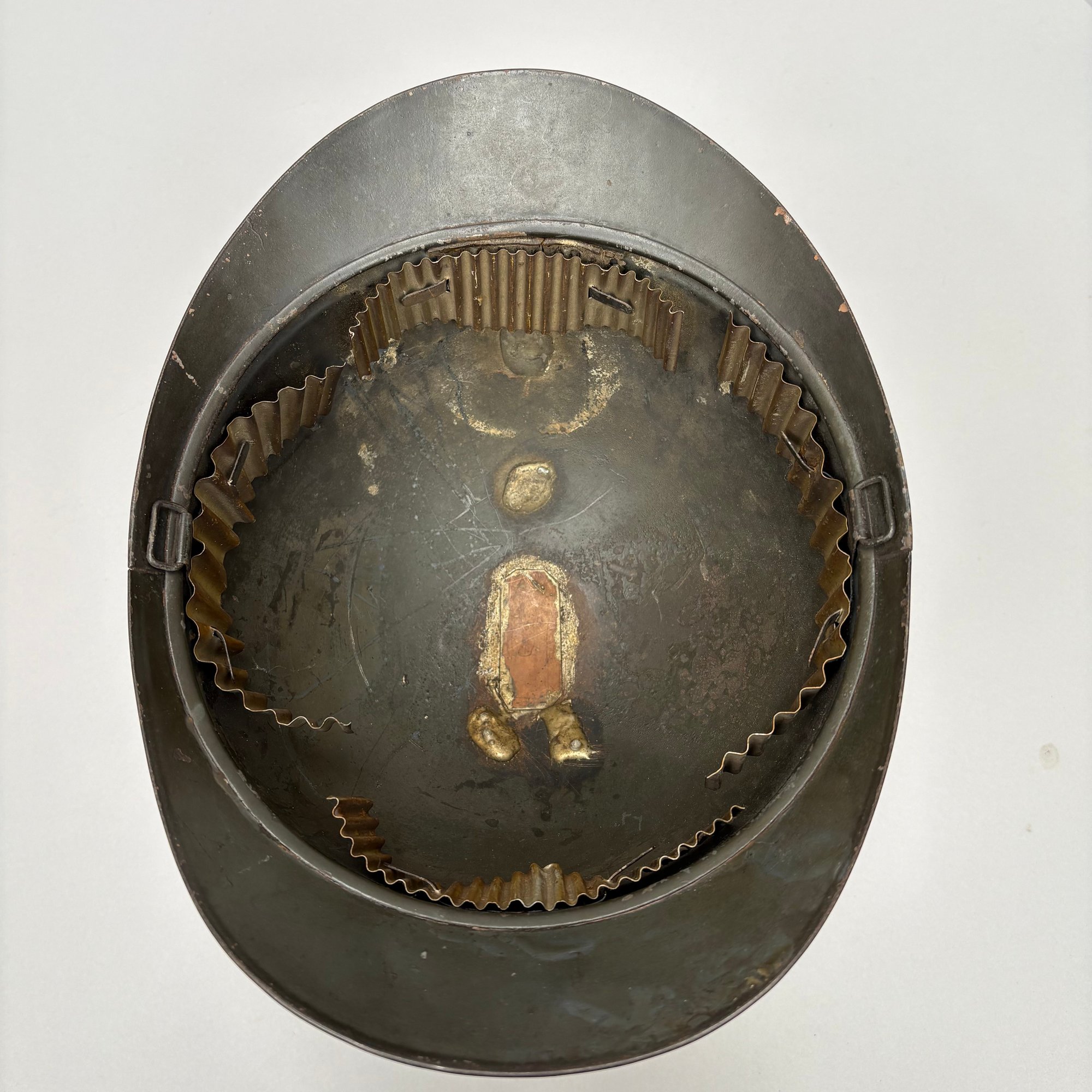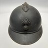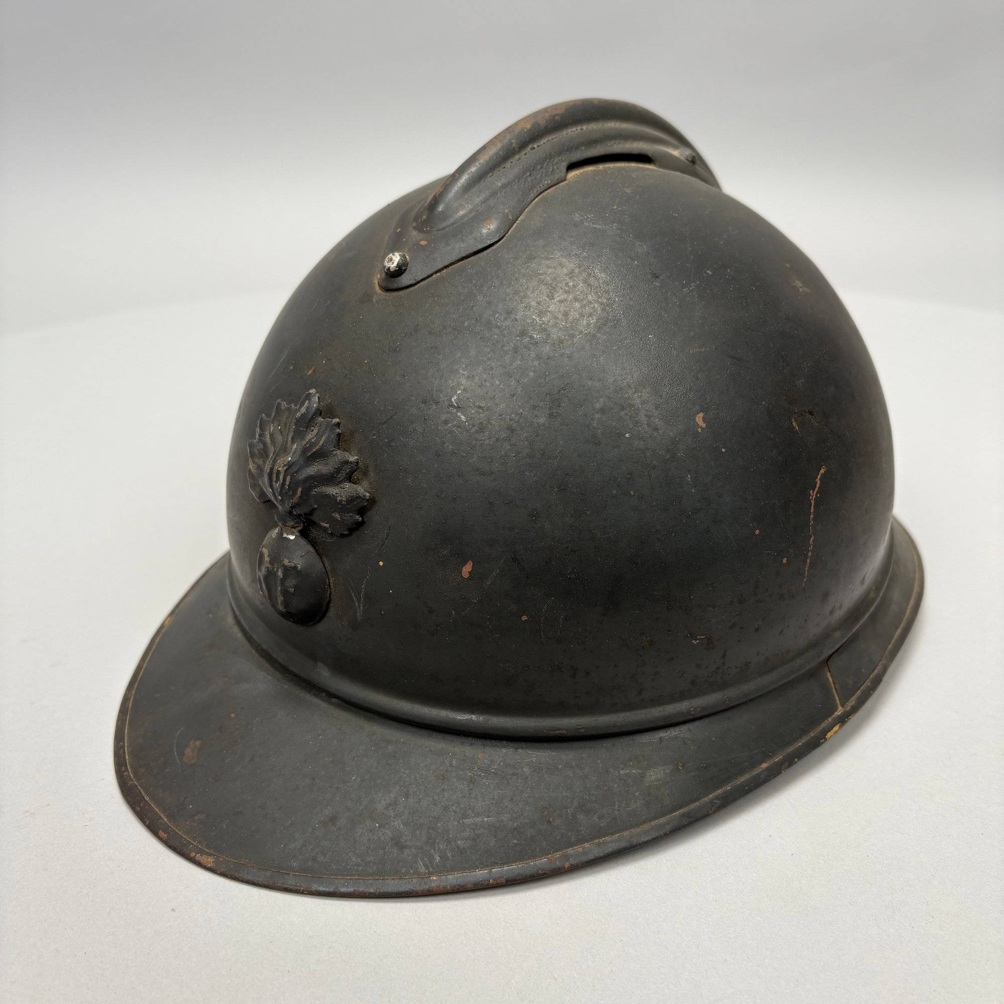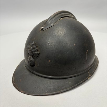 WWI French M15 Steel 2nd Model Adrian Infantry Helmet, Japy. In dark green paint, of soldered construction and lacking rivets, peaked round crest with ventilation slits, the badge a flaming grenade embossed "RF" (Republique Francaise), retaining the four strips of corrugated aluminum for mounting the leather and wool lining, held by hooks soldered to the shell.