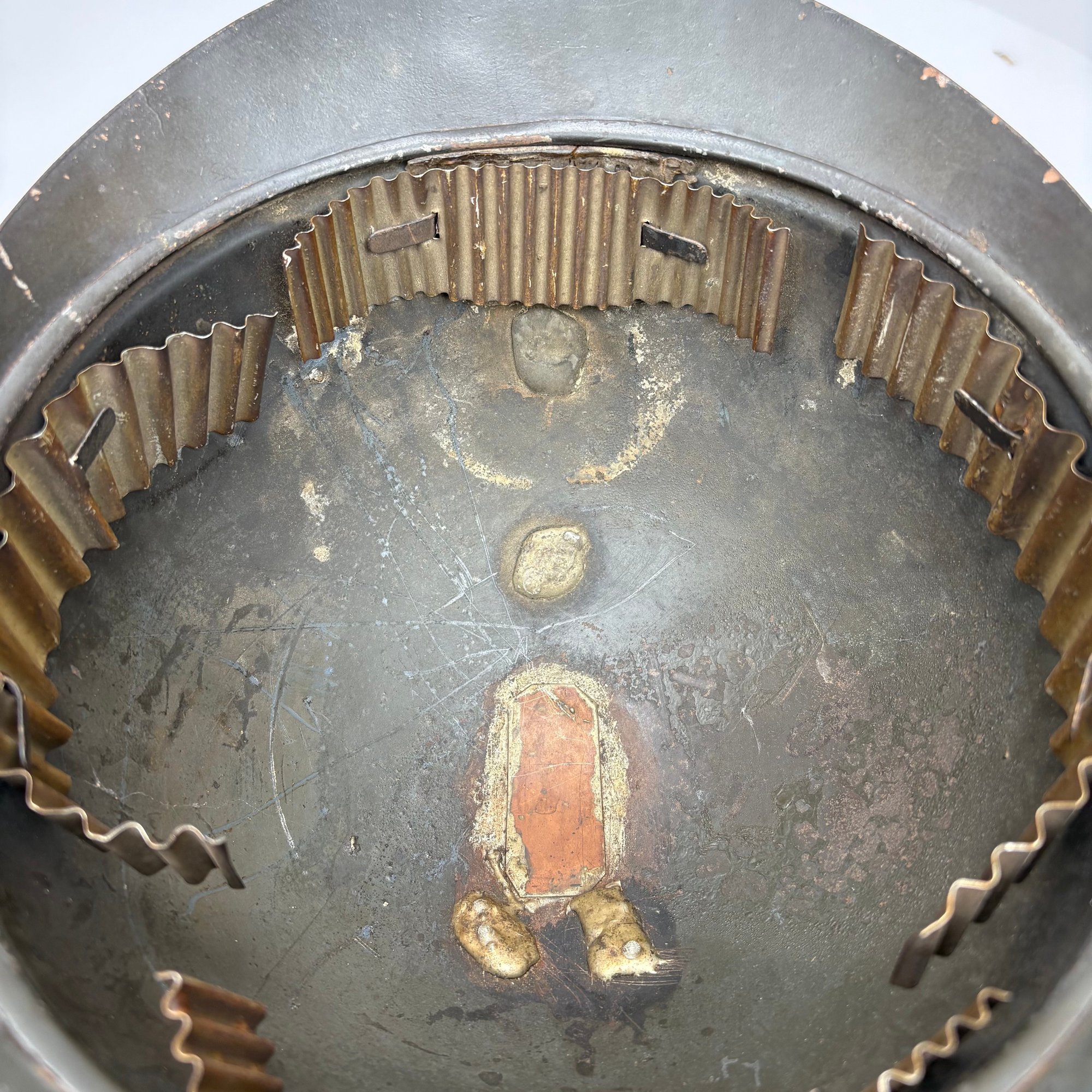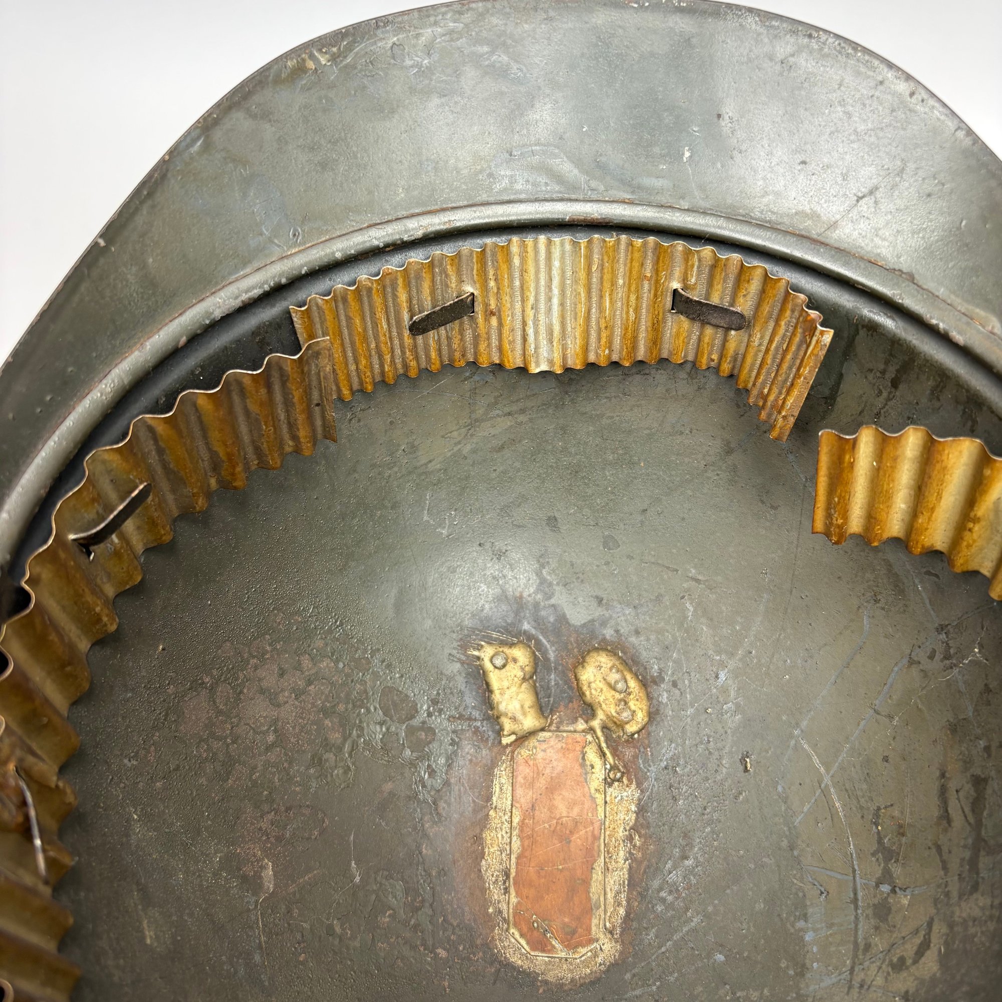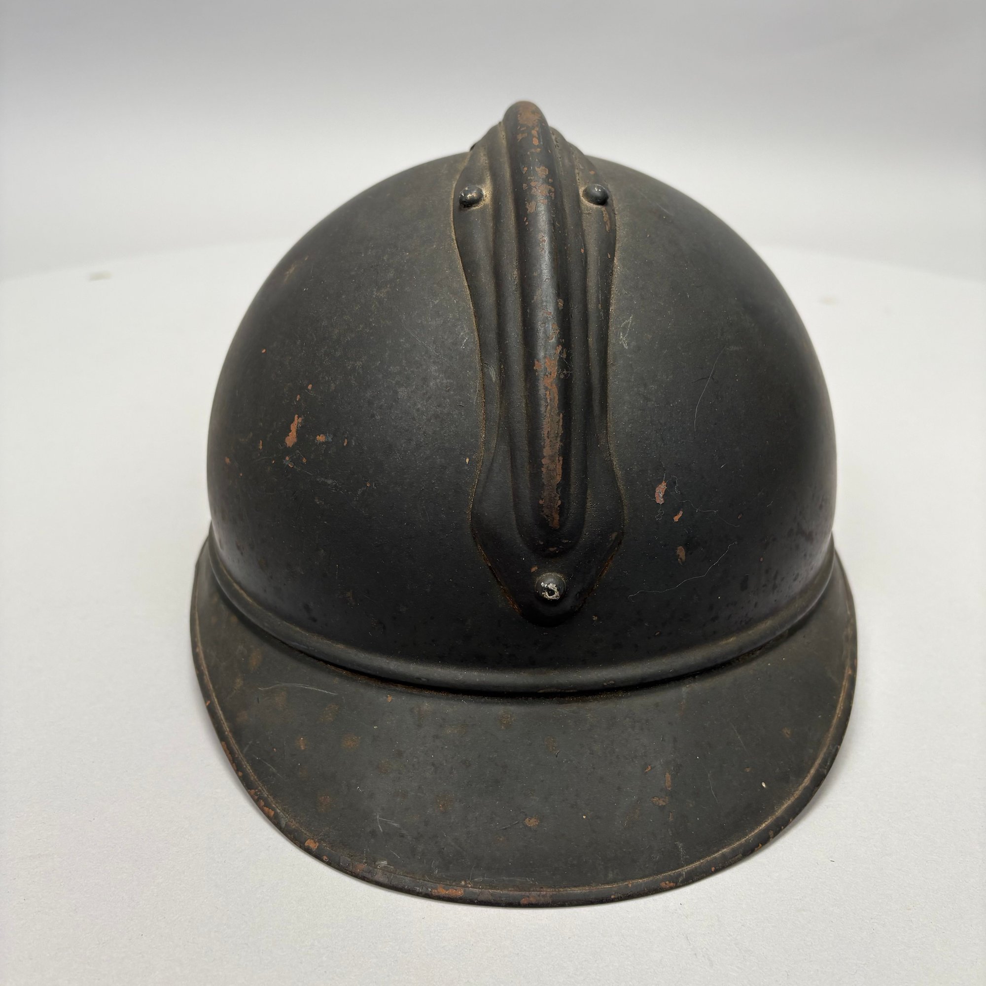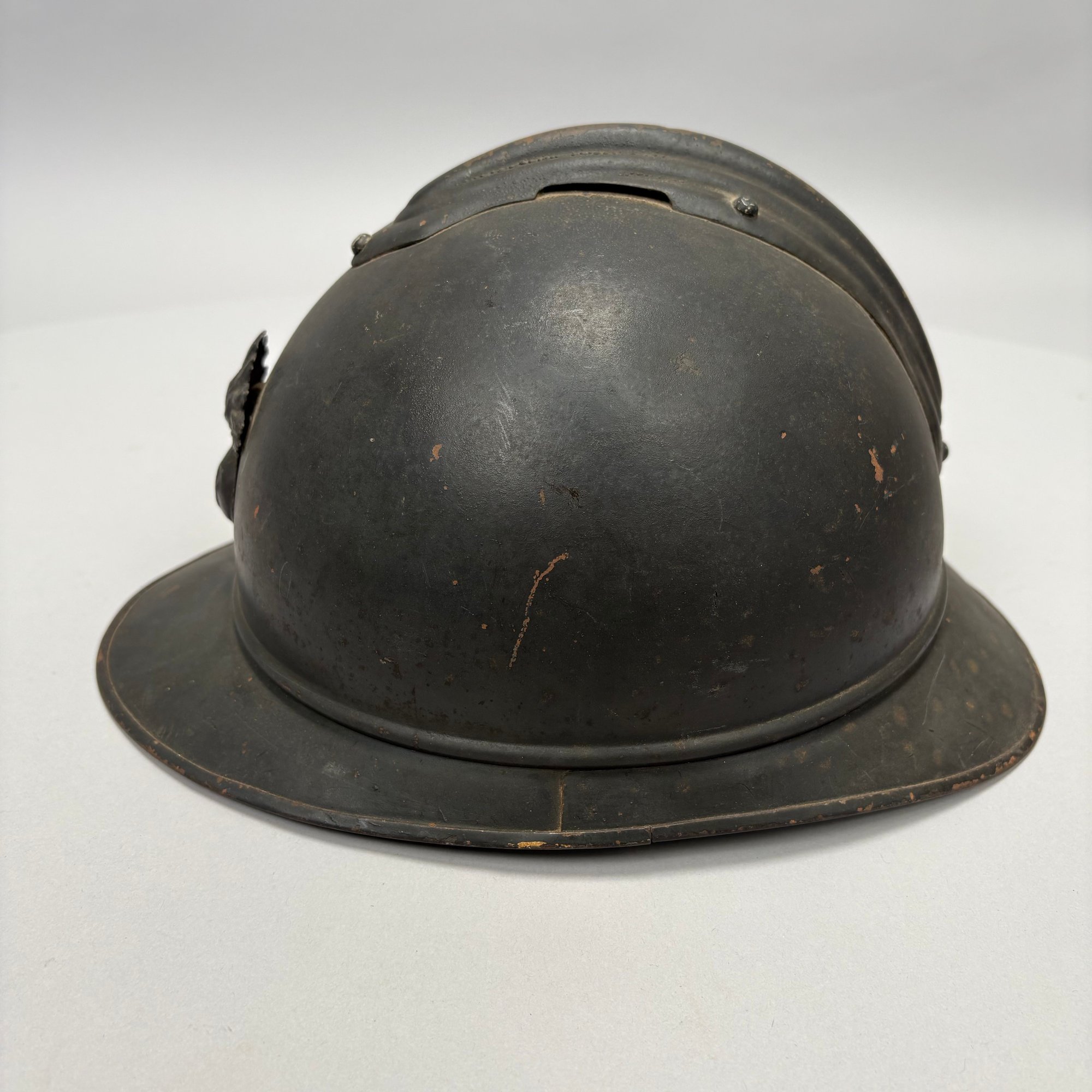 WWI French M15 Steel 2nd Model Adrian Infantry Helmet, Japy. In dark green paint, of soldered construction and lacking rivets, peaked round crest with ventilation slits, the badge a flaming grenade embossed "RF" (Republique Francaise), retaining the four strips of corrugated aluminum for mounting the leather and wool lining, held by hooks soldered to the shell.