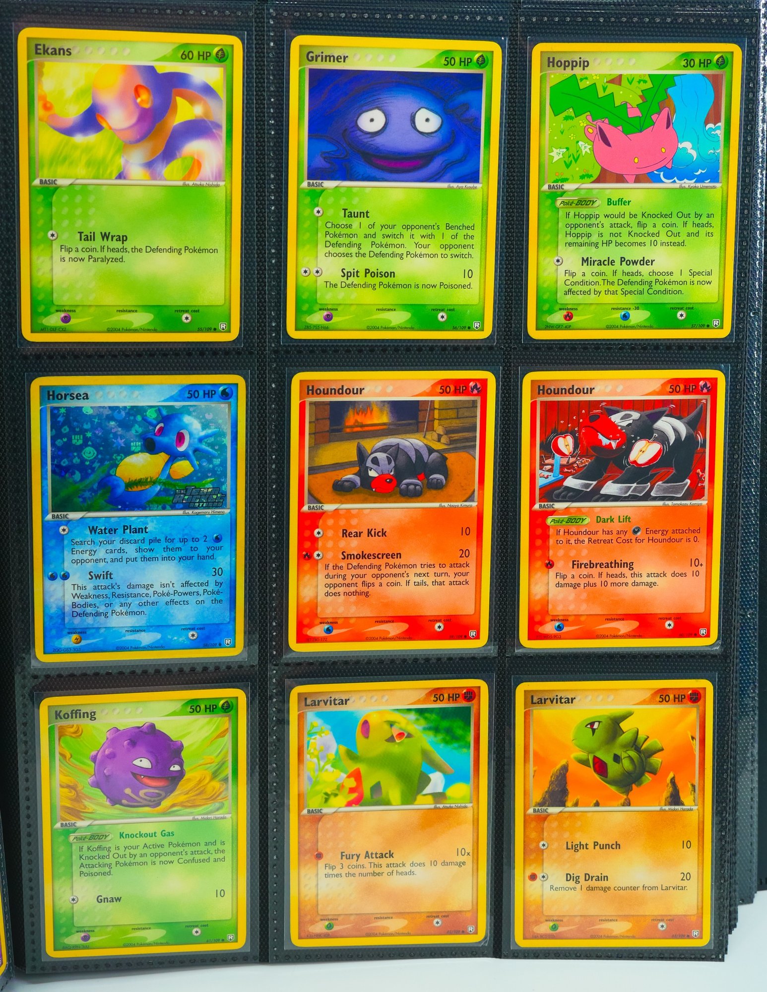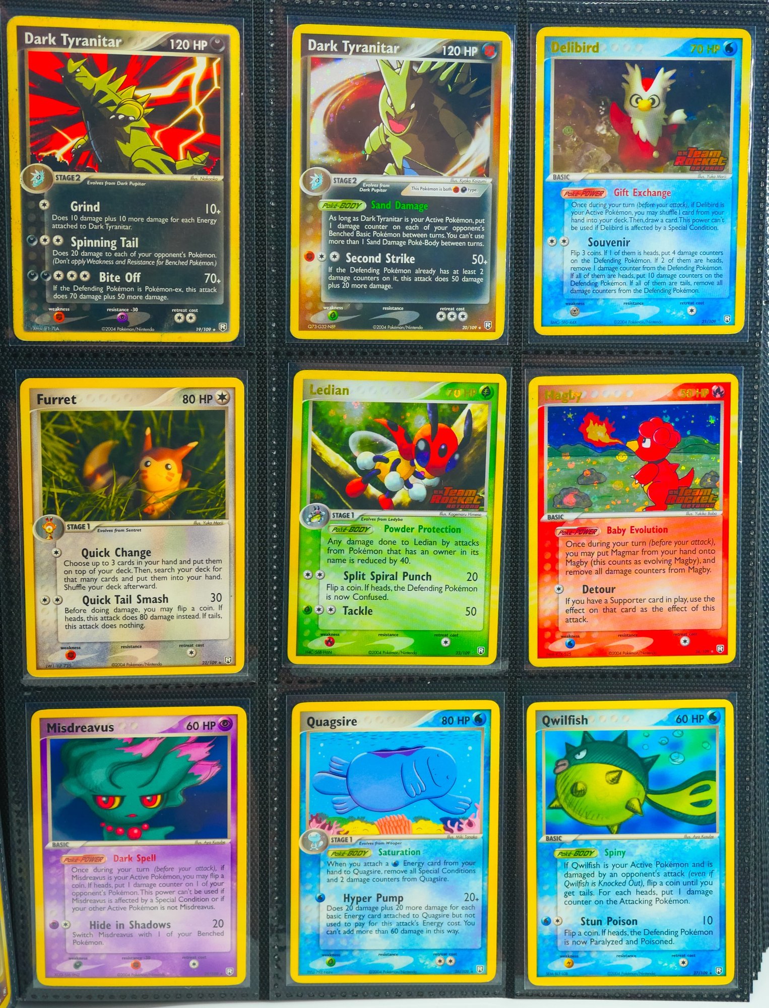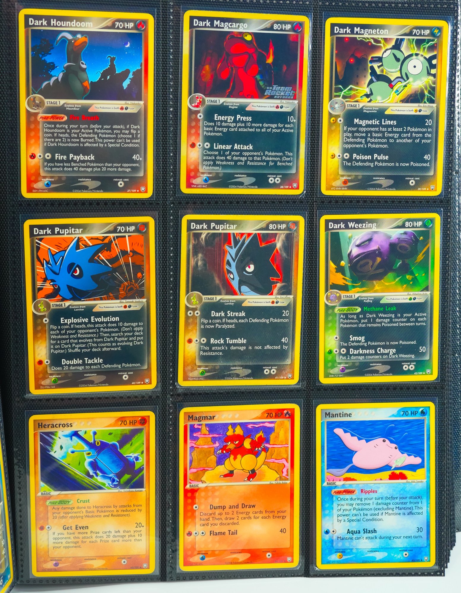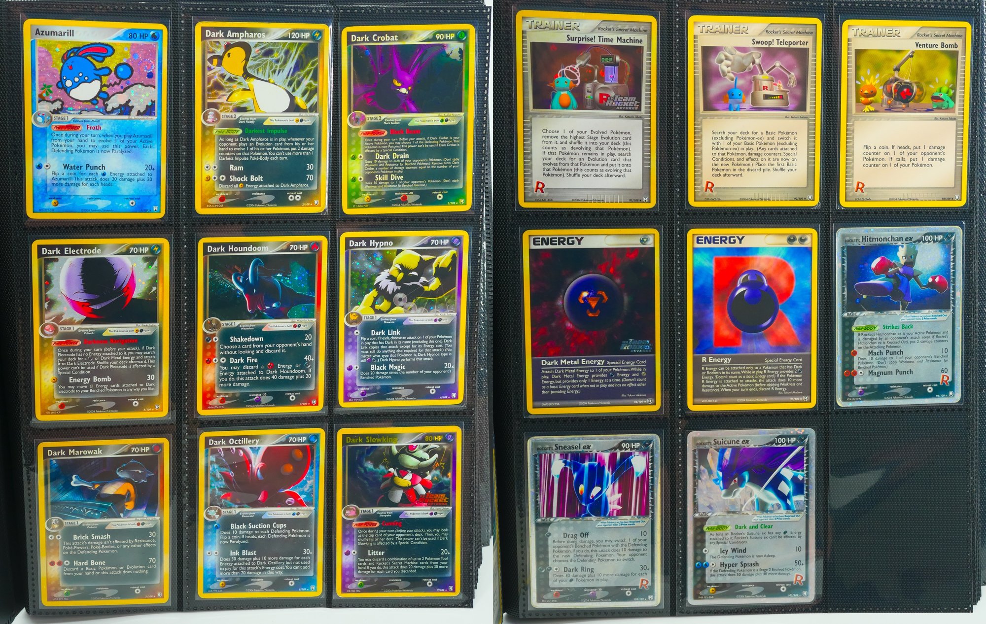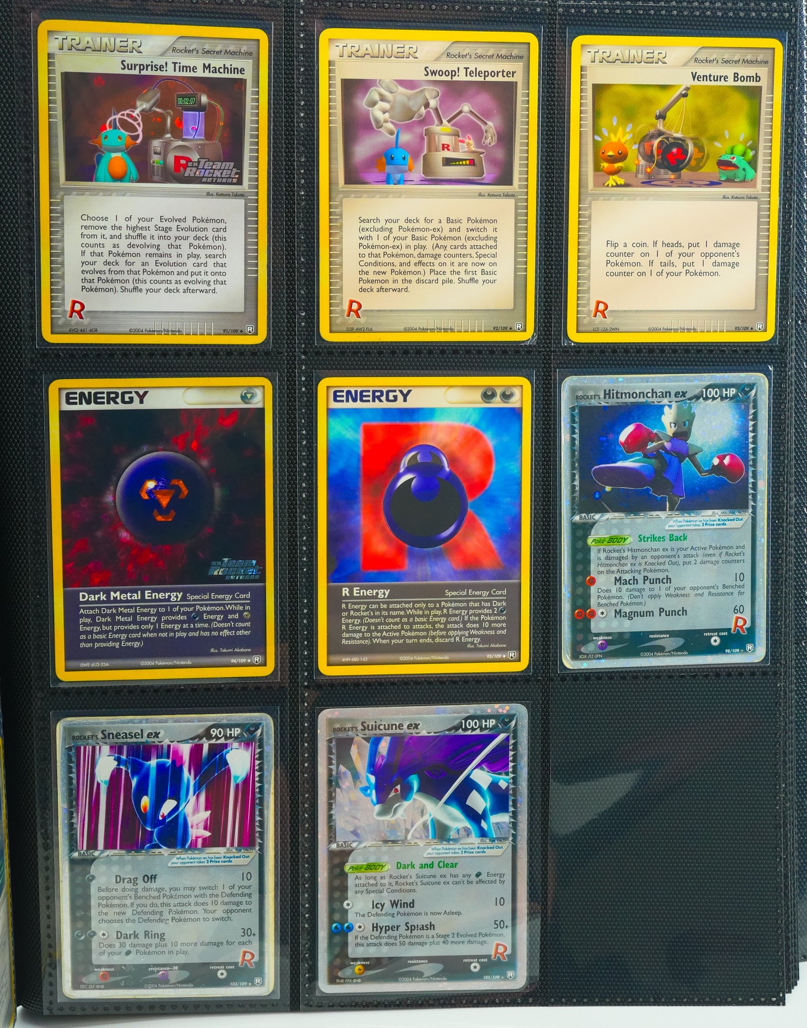 Presented as a foundational holding from the 2004 EX Team Rocket Returns expansion, this binder offers the base set in its entirety, 95 of 95 cards, accompanied by three of the set's scarcest Rocket's ex issues: Rocket's Hitmonchan ex (#98), Rocket's Sneasel ex (#103), and Rocket's Suicune ex (#105). The offering is further distinguished by substantial reverse holo and stamped parallel representation throughout the run, a meaningful consideration for any collector or investor pursuing depth beyond the base configuration.