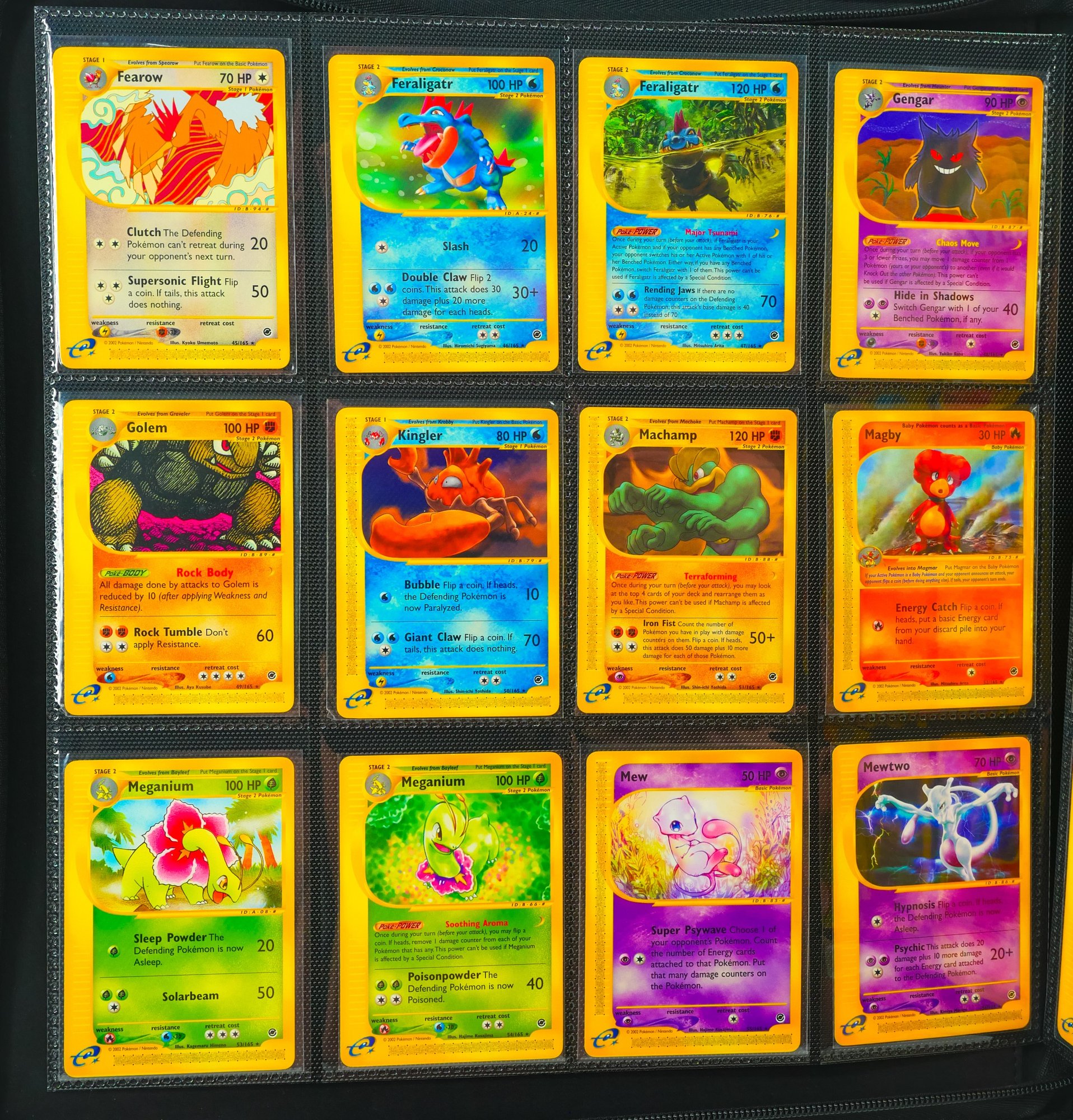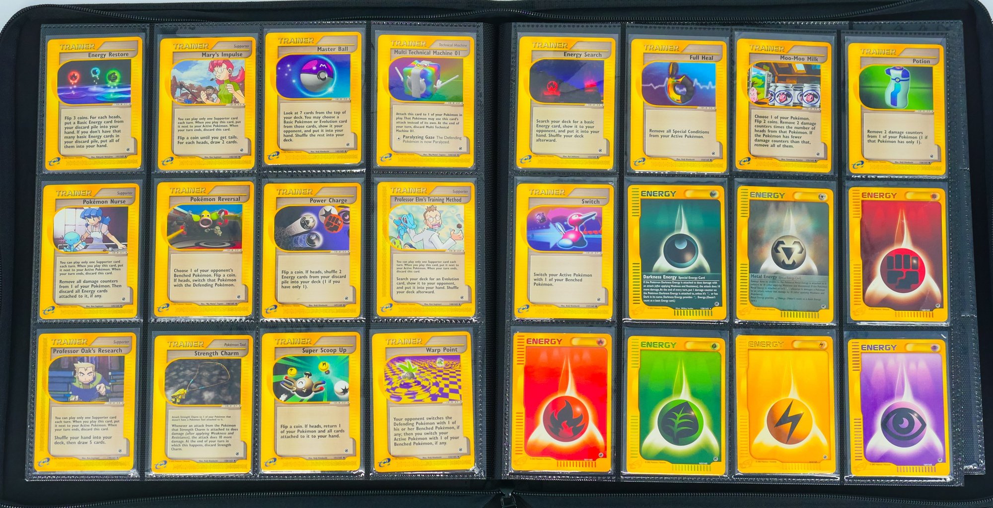 Beyond the featured parallels, every card in the numbered 165/165 set is present and accounted for in its standard non-holographic printing, from the complete Johto and Kanto Pokémon roster spanning the full evolution families, through the entire trainer suite including Professor Oak's Research, Pokémon Nurse, Mary's Impulse, Professor Elm's Training Method, Master Ball, Dual Ball, and Multi Technical Machine 01, down to the full basic energy lineup and the special Darkness and Metal energies that cap the numbered run at 165/165. Nothing is missing. Nothing has been substituted. The set presents exactly as it was intended to be collected in 2002.