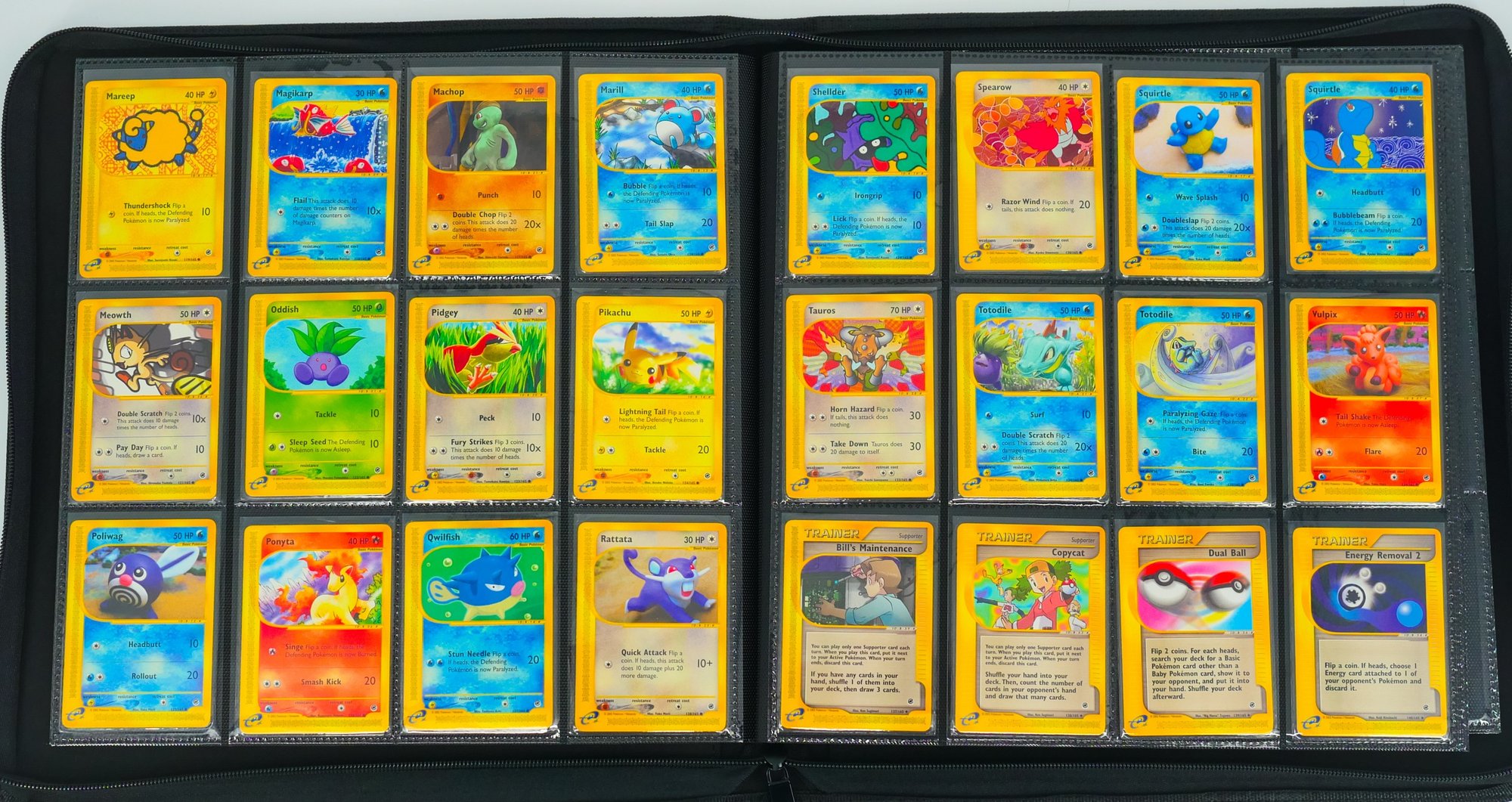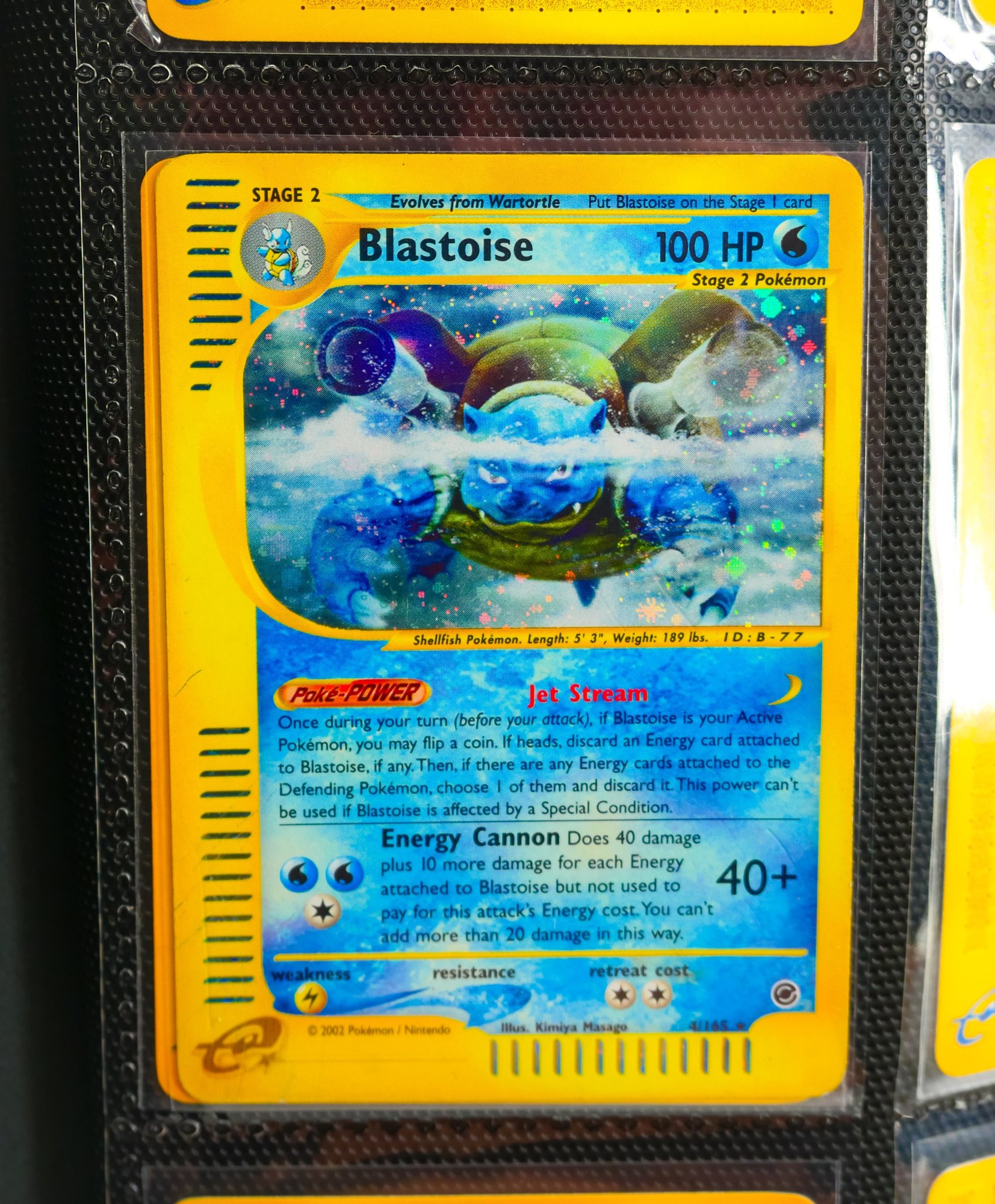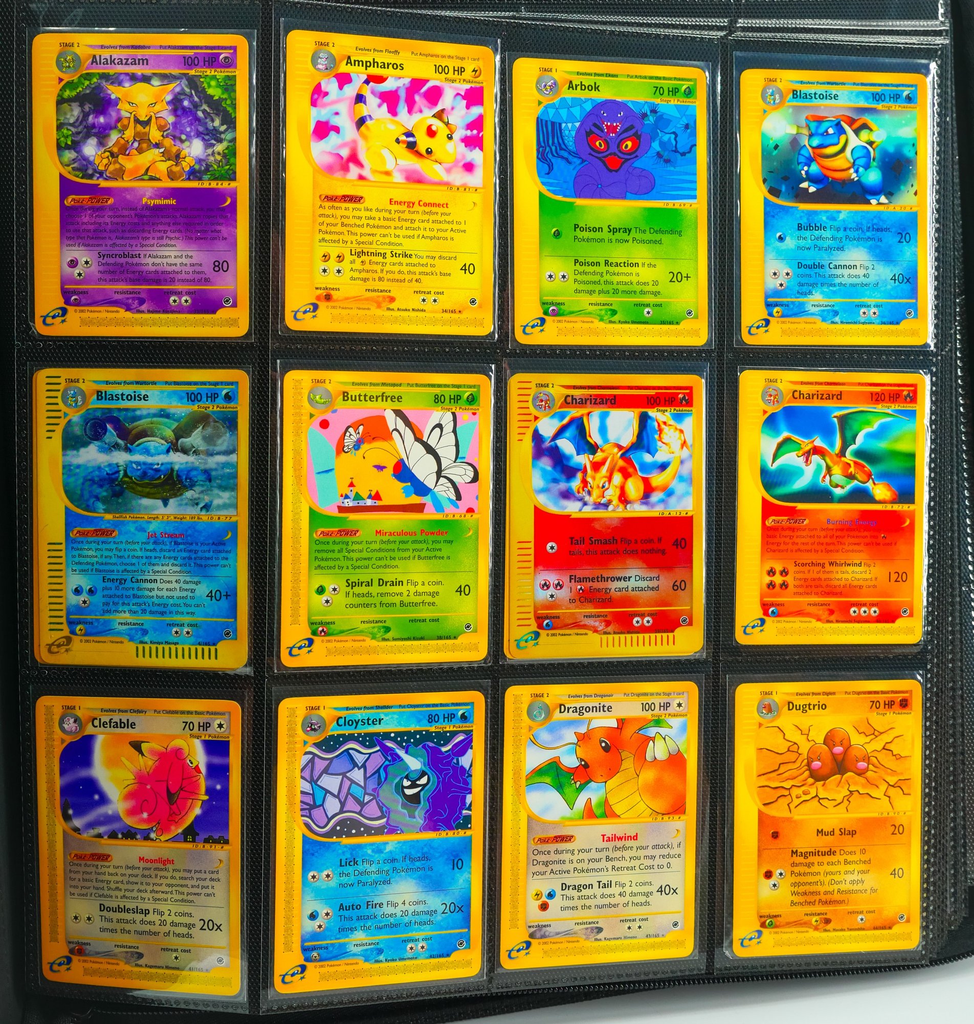 Complete Expedition Base Set runs represent one of the most structurally significant configurations in the entire WOTC-era Pokémon hobby. As the inaugural release of the e-Reader era and WOTC's penultimate Pokémon production before licensing transitioned to Nintendo, the set carries unique historical weight, introducing the landscape holo window and e-Reader dot-code technology that would define the brief but distinctive e-Series. At 165 cards, Expedition is also the largest WOTC-era Pokémon set ever produced, making the assembly of a complete run an exponentially more demanding undertaking than any preceding release. Intact 165/165 sets have grown progressively scarcer as the grading market has pulled headliners out of completed sets one at a time, and reassembling a full set today, particularly one anchored by a holo Blastoise and reverse-holo Charizard with both non-holo copies also intact, requires either years of patient sourcing or a single decisive acquisition at the set level.