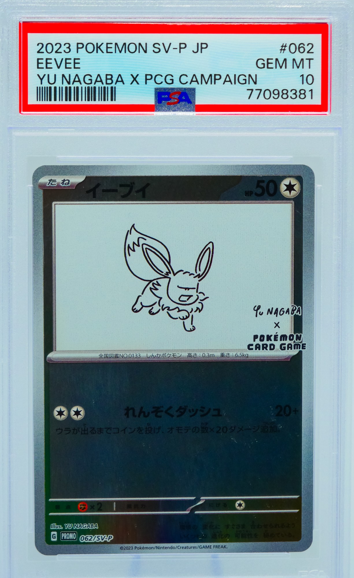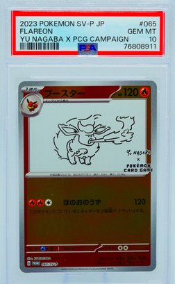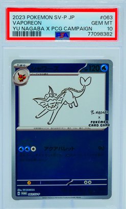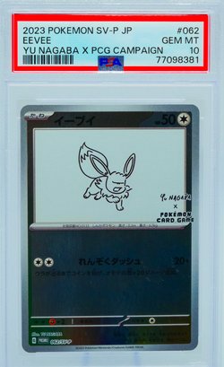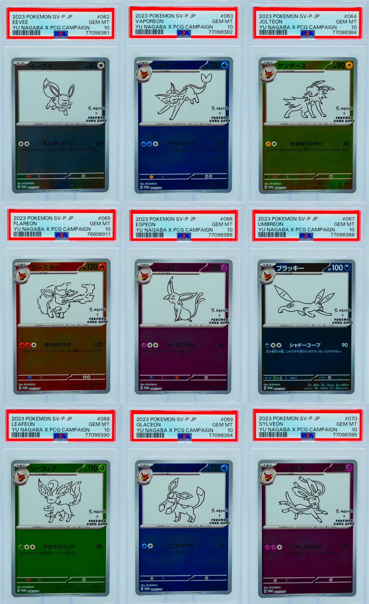 The Nagaba Eeveelution series has become one of the most recognized and desired promo sets in the modern Pokemon TCG, appealing equally to art collectors who appreciate Nagaba's broader body of work, Eeveelution completionists who need every variant of their favorite evolutionary family, and Japanese promo specialists who understand the long-term trajectory of limited-distribution campaign cards. As a complete PSA 10 set, this lot represents the definitive way to own this collaboration. Sold as a complete lot.