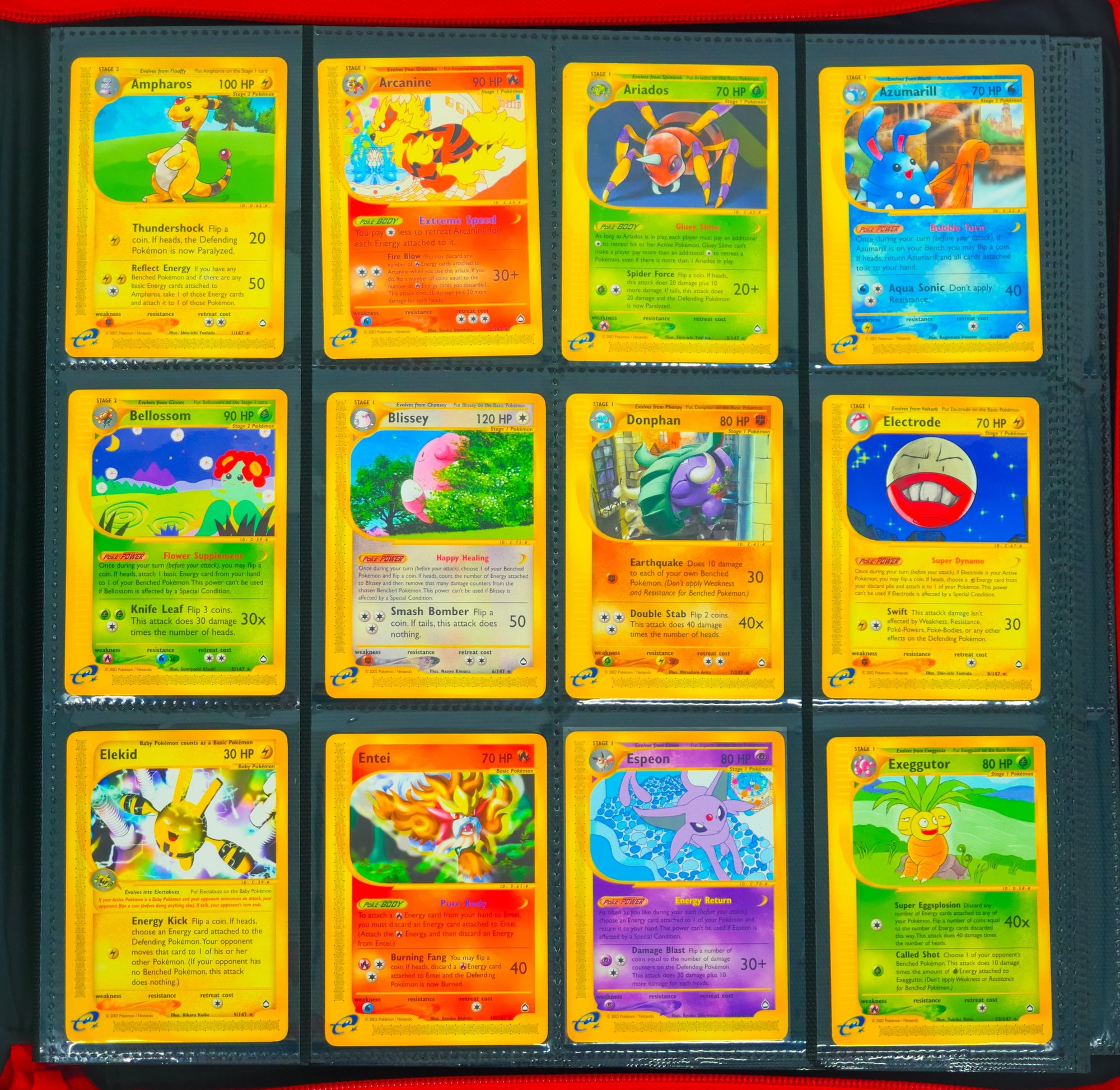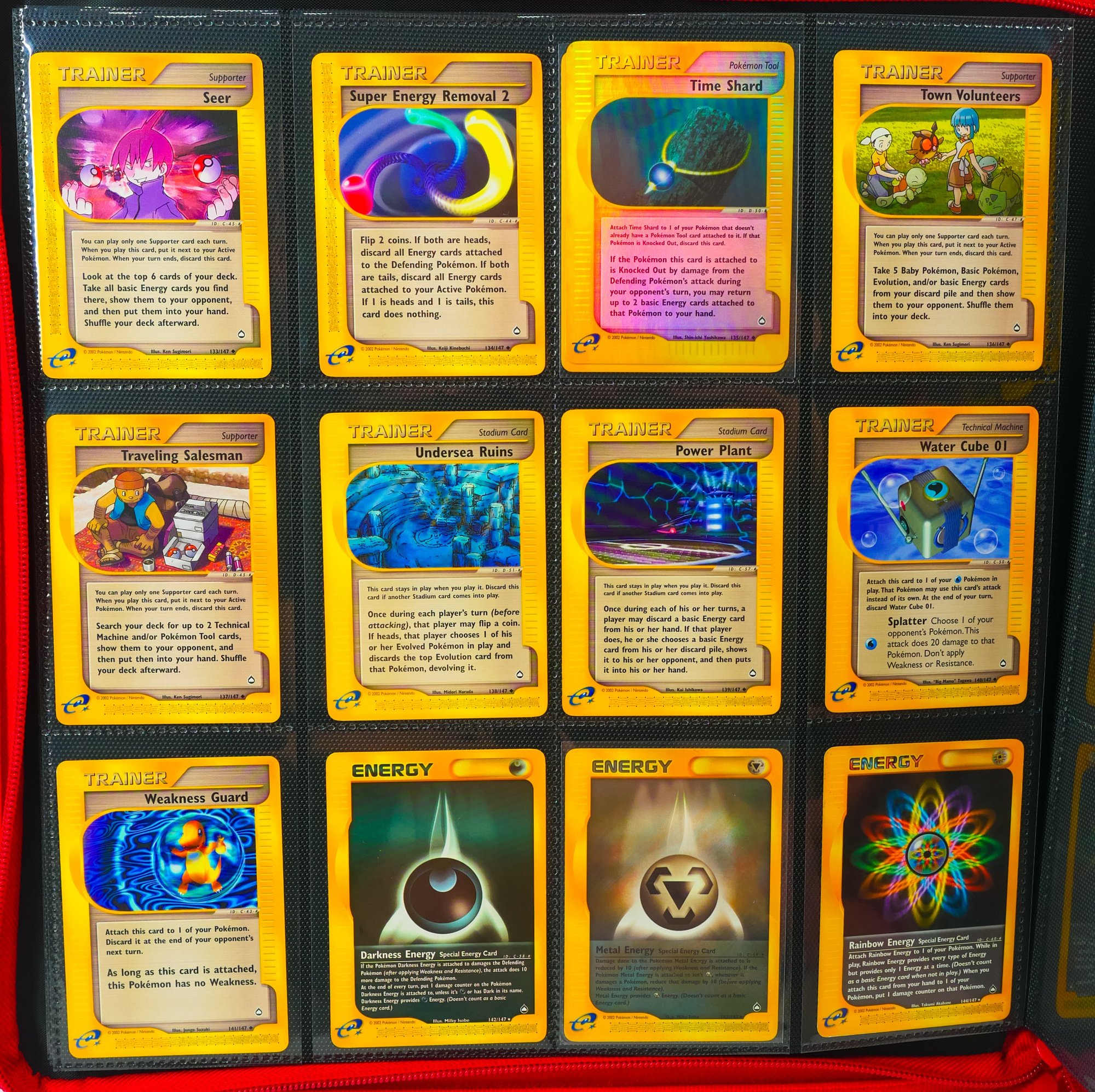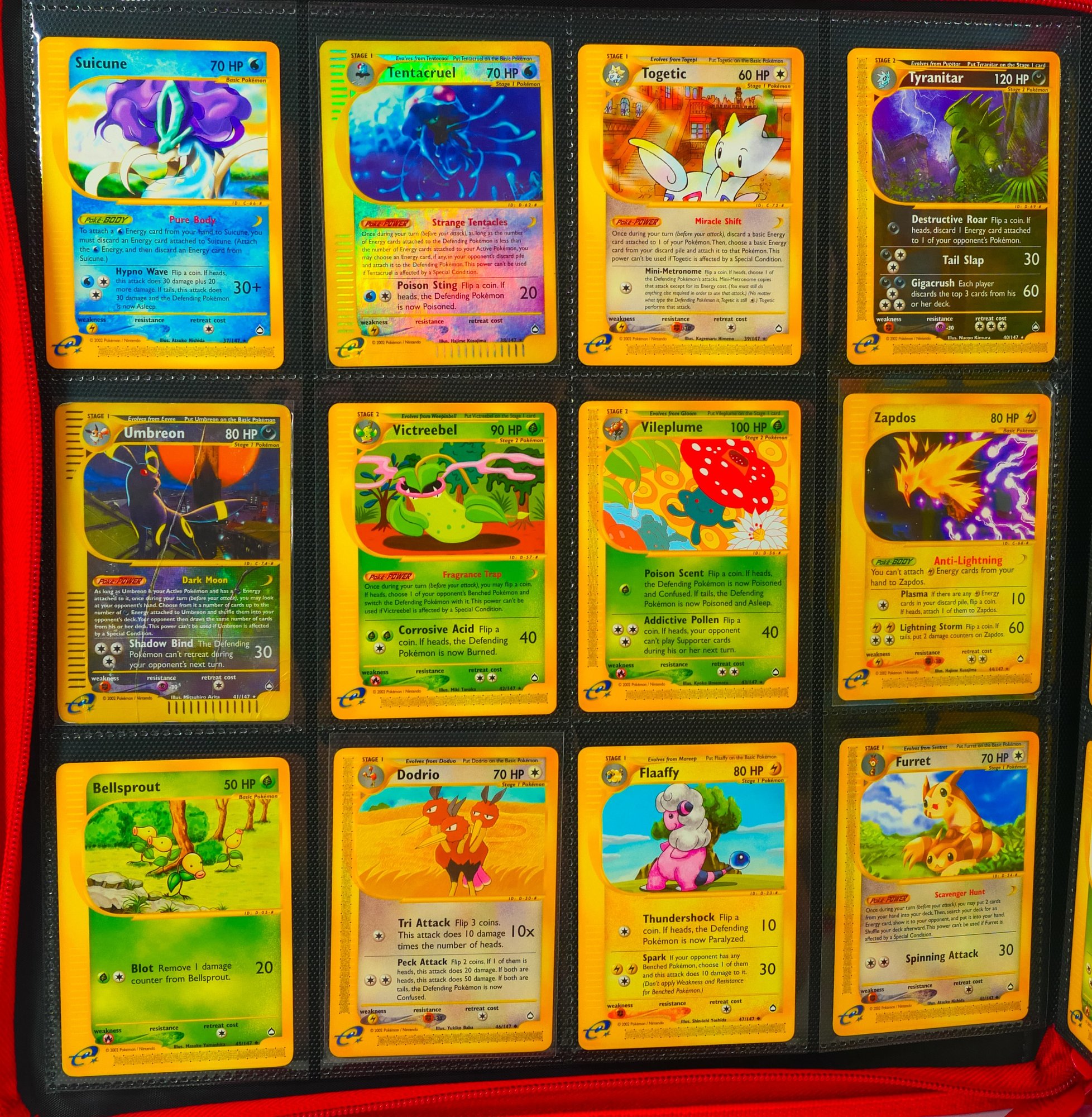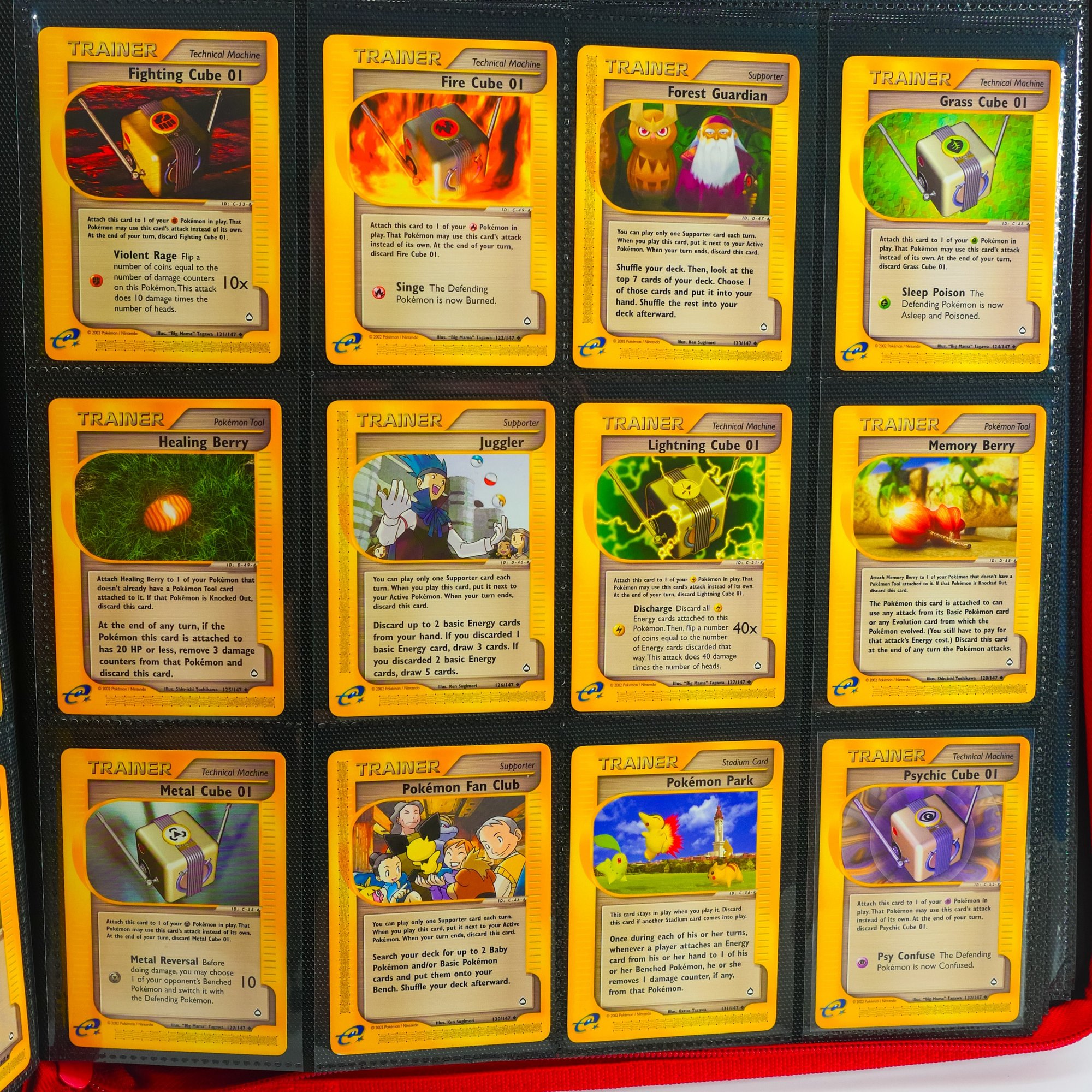 Complete Aquapolis sets represent one of the most structurally significant configurations in the entire Pokémon hobby. As the second release of the e-Reader era and a direct predecessor to the WOTC-closing Skyridge, Aquapolis carries unique historical weight, and the crackle holographic treatment shared with its Expedition and Skyridge counterparts has never been replicated in any subsequent Pokémon release. The reverse-holographic Umbreon in particular, pioneered by this set and instantly recognizable by its haunting twilight artwork and full-card shimmer, commands significant premiums on the secondary market and has become progressively scarcer as collectors dismantle completed sets to submit copies for grading.