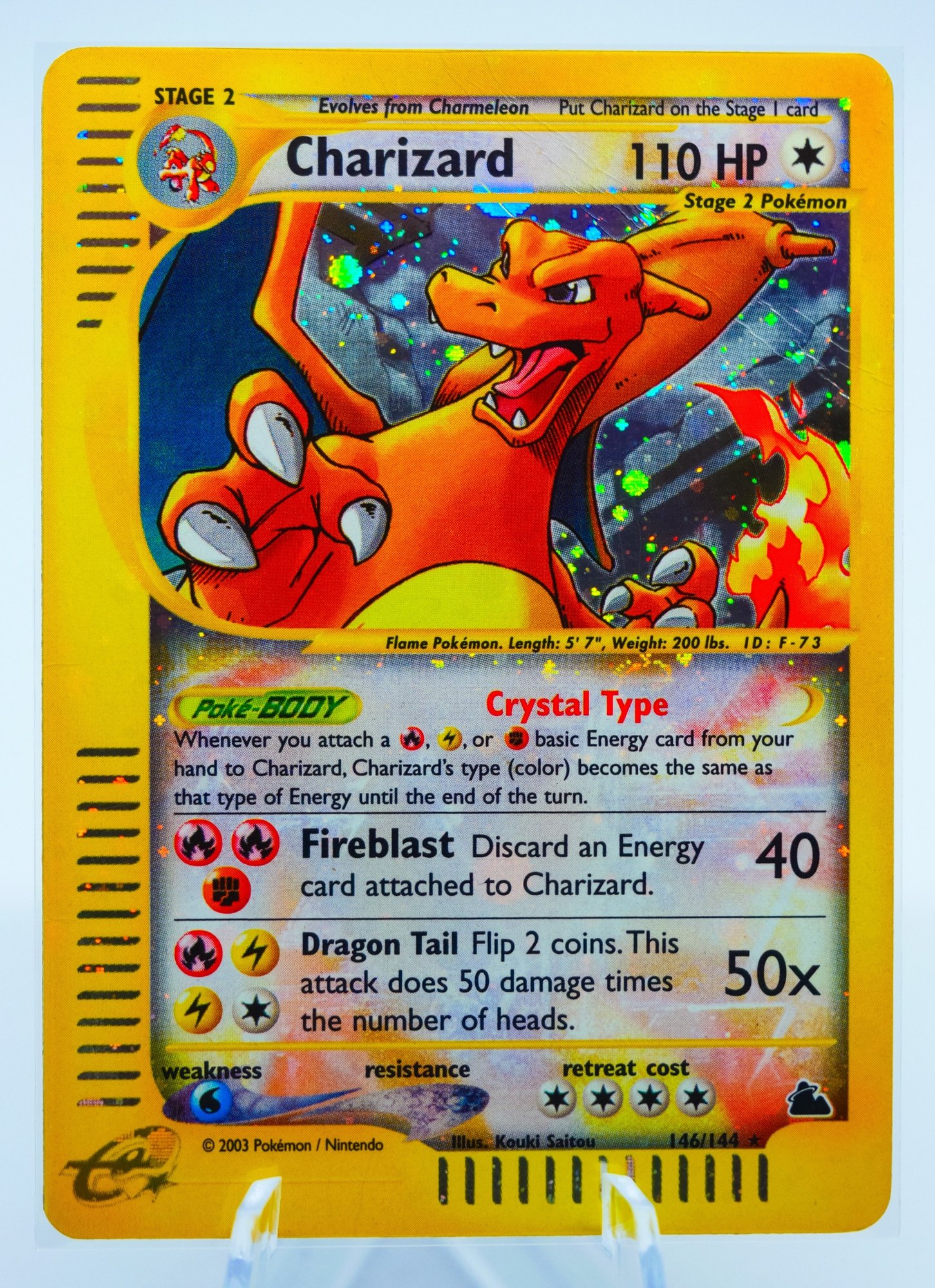 This is the crown jewel of the Skyridge set and one of the most coveted cards in the entire Pokemon TCG. Numbered beyond the set at 146/144, this secret rare features the Crystal Type Poke-BODY mechanic and Kouki Saitou's dynamic artwork of Charizard mid-flight against an explosive, fiery backdrop. The e-Series dot holo pattern catches light across the full illustration window, giving this card a visual presence that few others in the hobby can match.