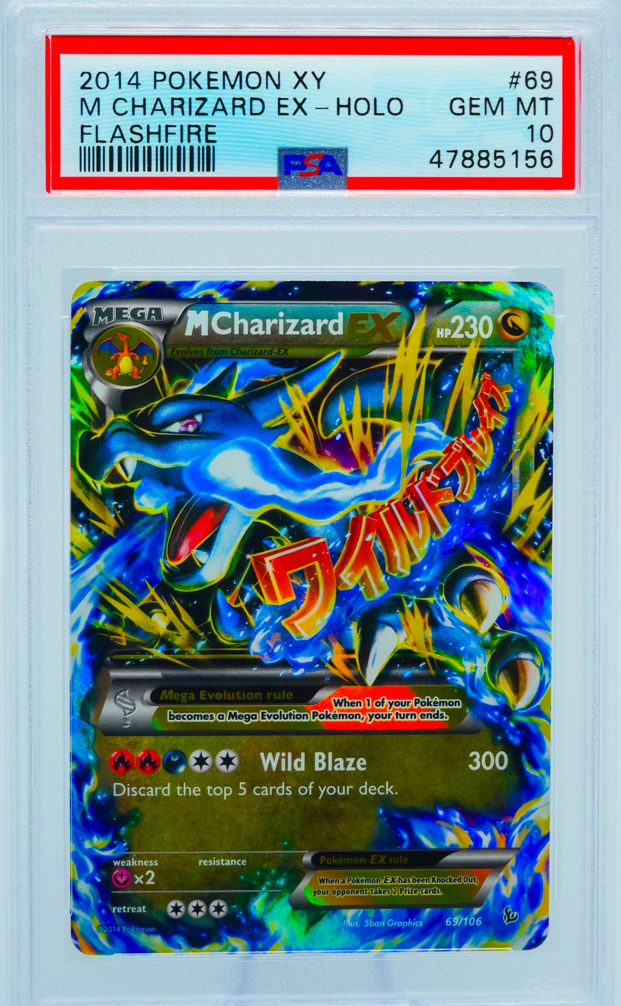 Mega Charizard X is one of the most beloved designs in the entire Pokemon franchise, and this card captures it at its most ferocious. The 5ban Graphics illustration depicts the Dragon/Fire-type Mega Evolution wreathed in swirling blue flames, jaws wide open, with bolts of electric yellow energy crackling across the composition. The bold red Japanese katakana for "Wild Blaze" slashes diagonally across the artwork, giving the card a visual intensity that few other EX-era prints can match. It is an absolute showpiece in person, with the holo foil amplifying the blue flame palette into something that practically glows in the slab.