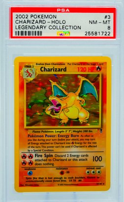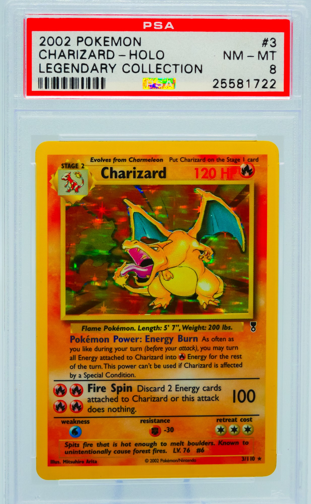 The legendary "fireworks" Charizard, featuring the Legendary Collection's iconic starburst reverse holo pattern layered over Mitsuhiro Arita's classic Base Set artwork. Widely considered one of the most beautiful holo treatments ever applied to a Pokemon card, this reverse holo variant commands a serious premium over its standard counterpart and remains a bucket-list card for vintage collectors.