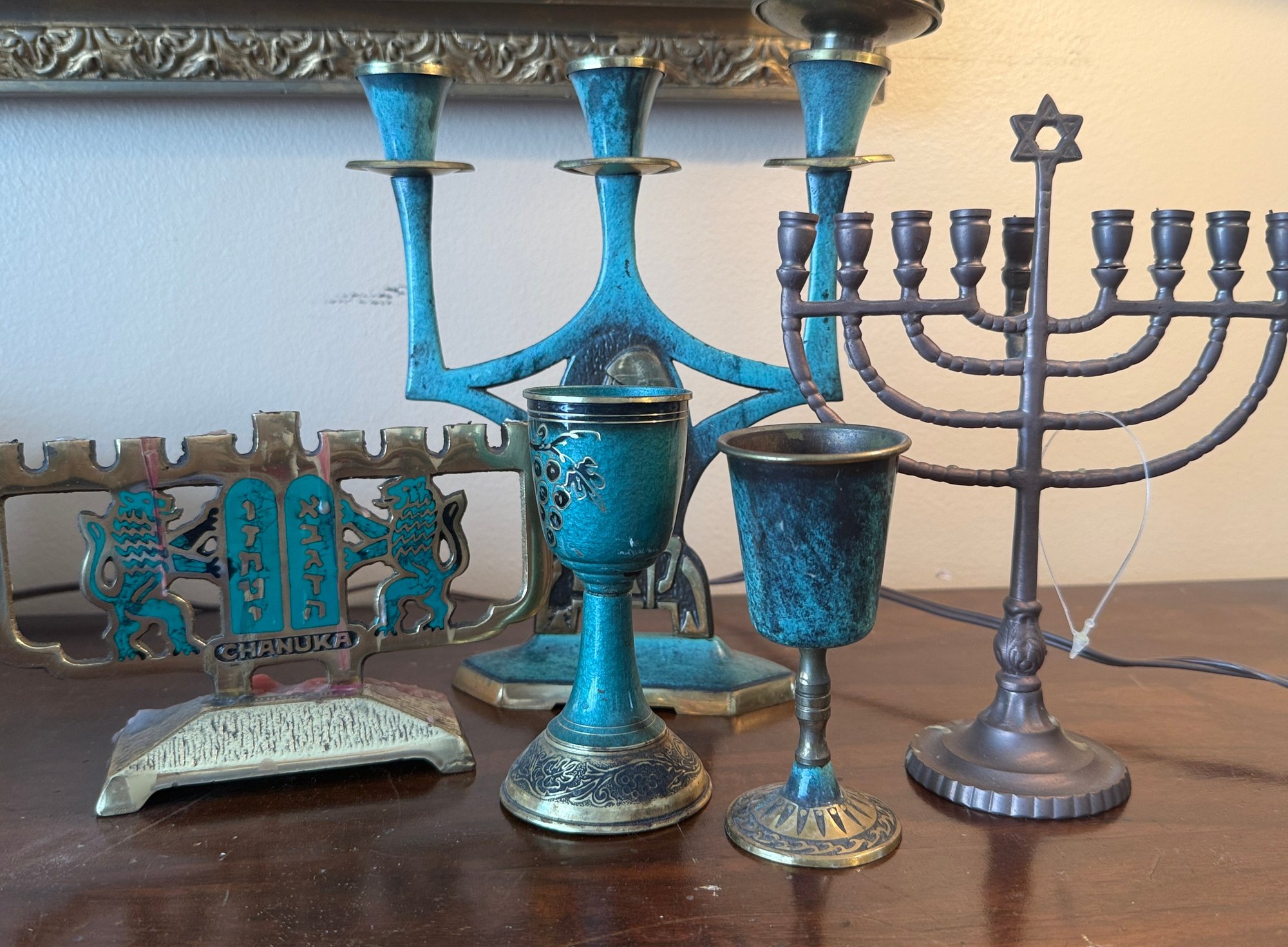 (P-13) COLLECTION OF FIVE ISRAELI ITEMS, TWO MENORAHS, TWO KIDDISH CUPS & CANDLESTICK - 12"