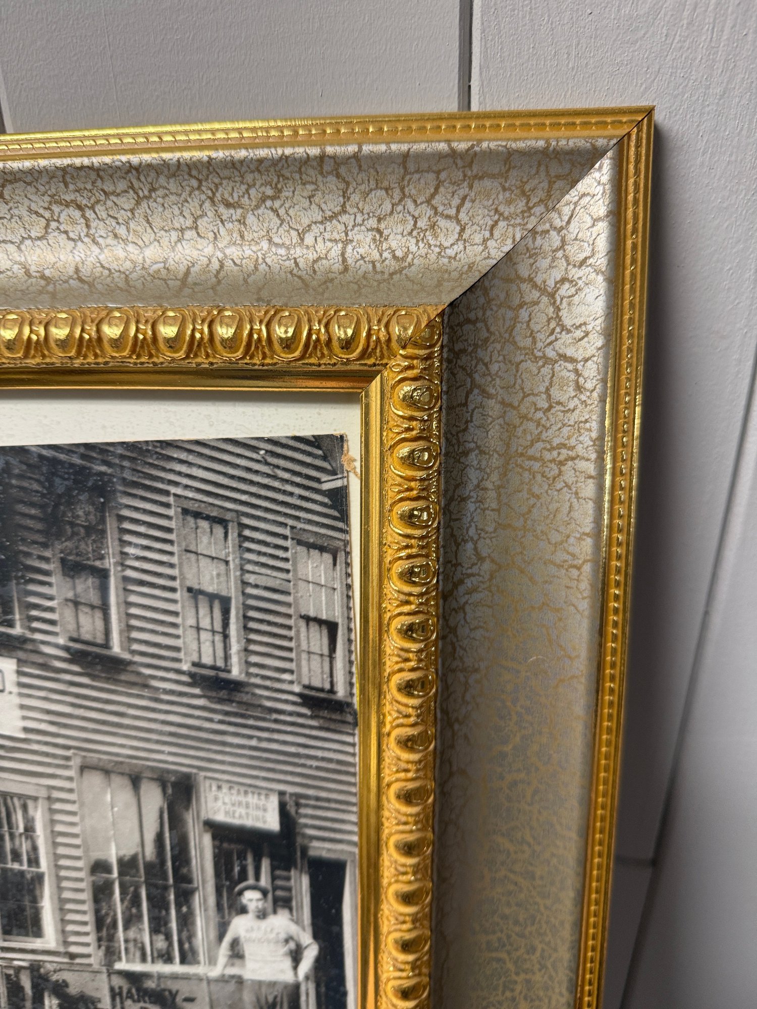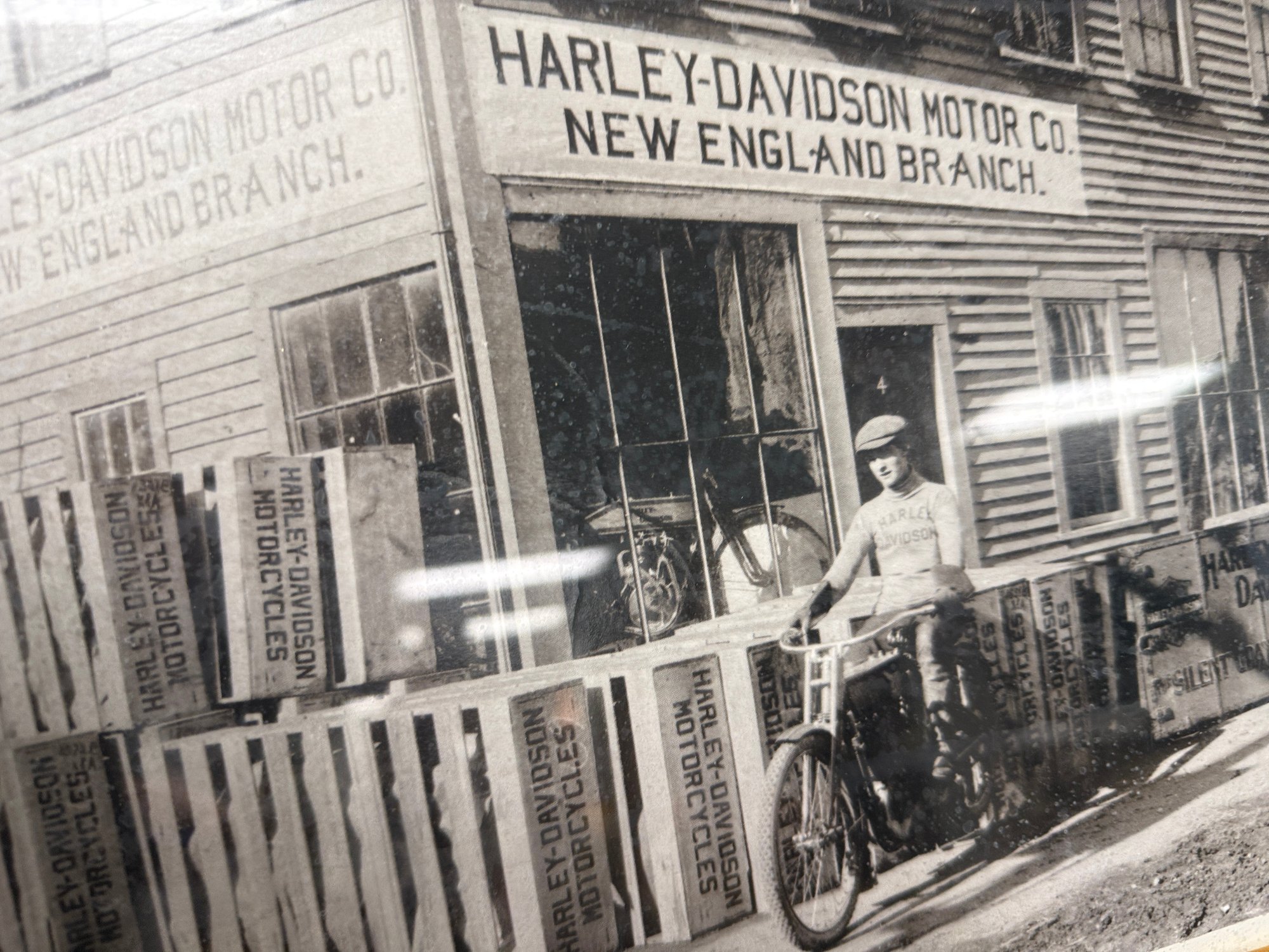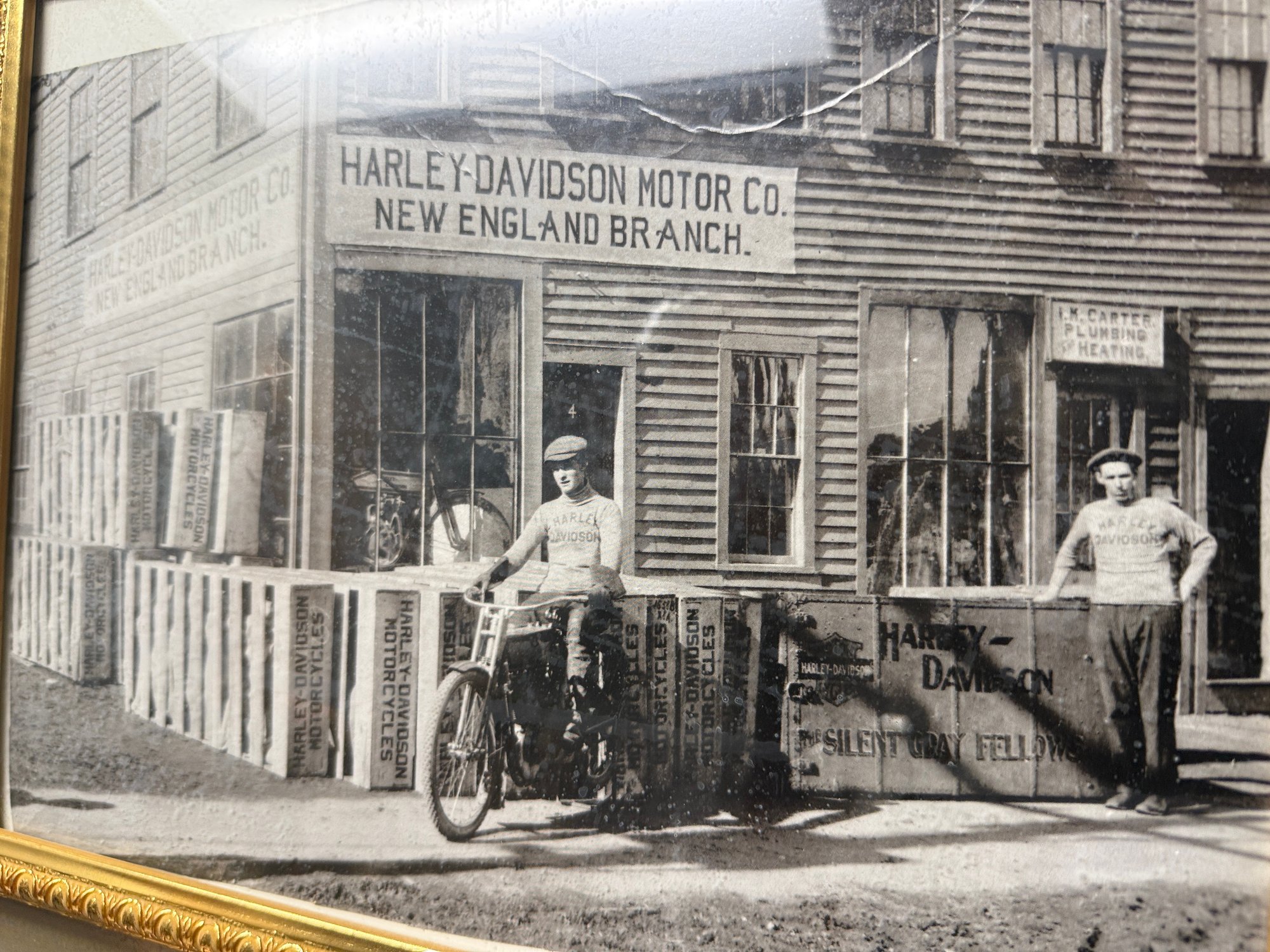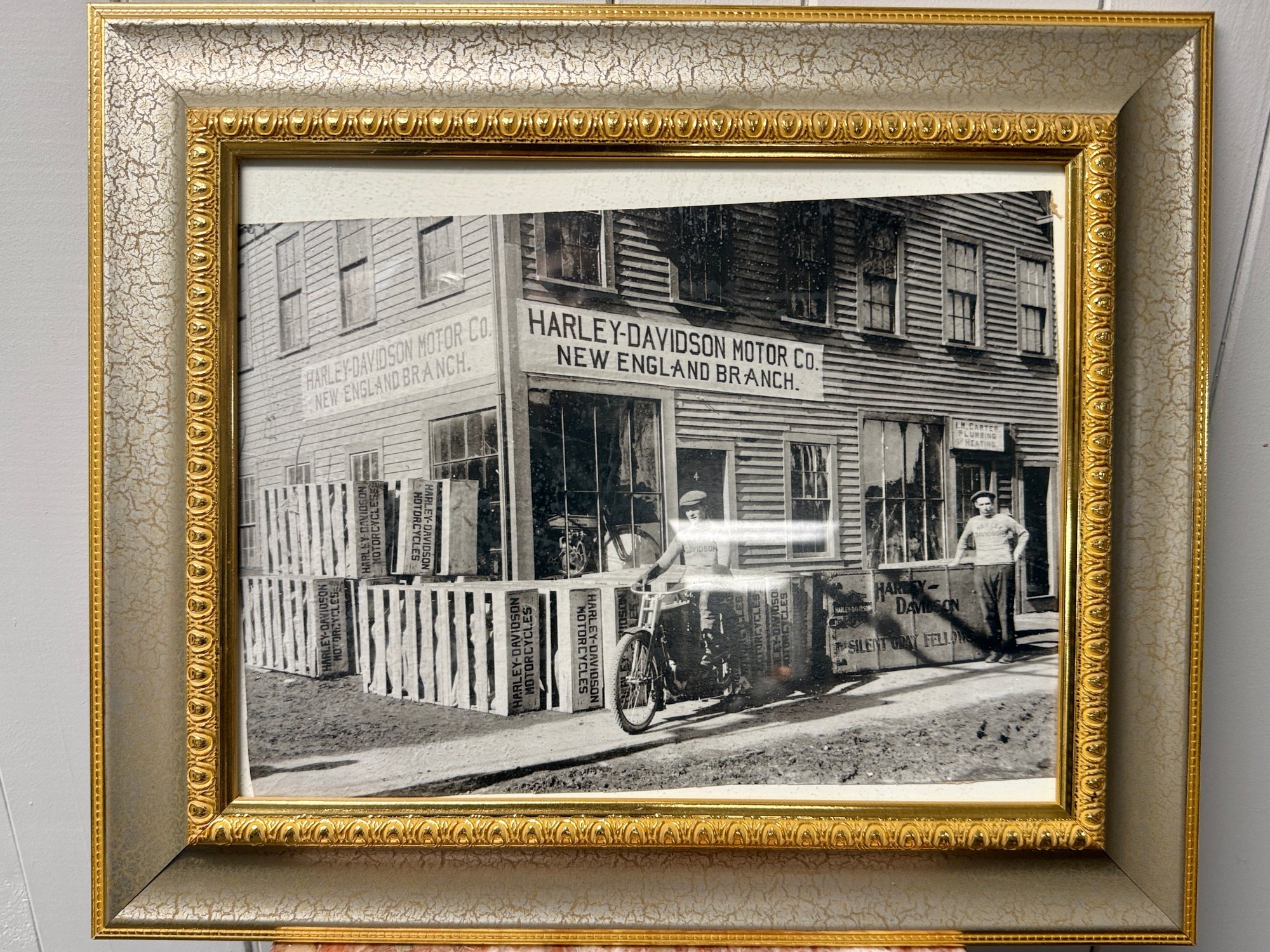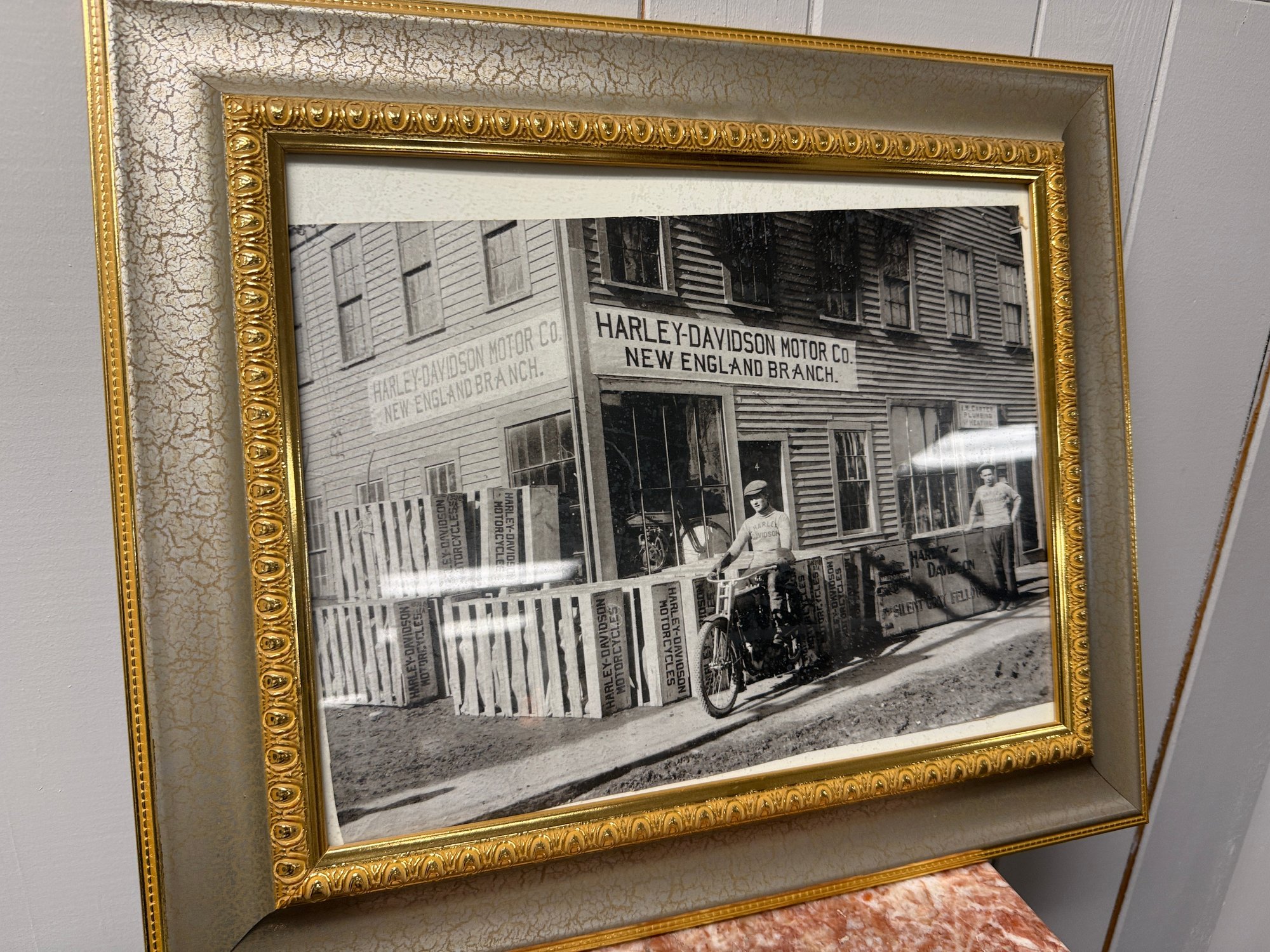 (P-26) VINTAGE PRINT OF ANTIQUE HARLEY DAVIDSON MOTORCYCLE PHOTO FRAMED IN GOLD- 19" BY 16"