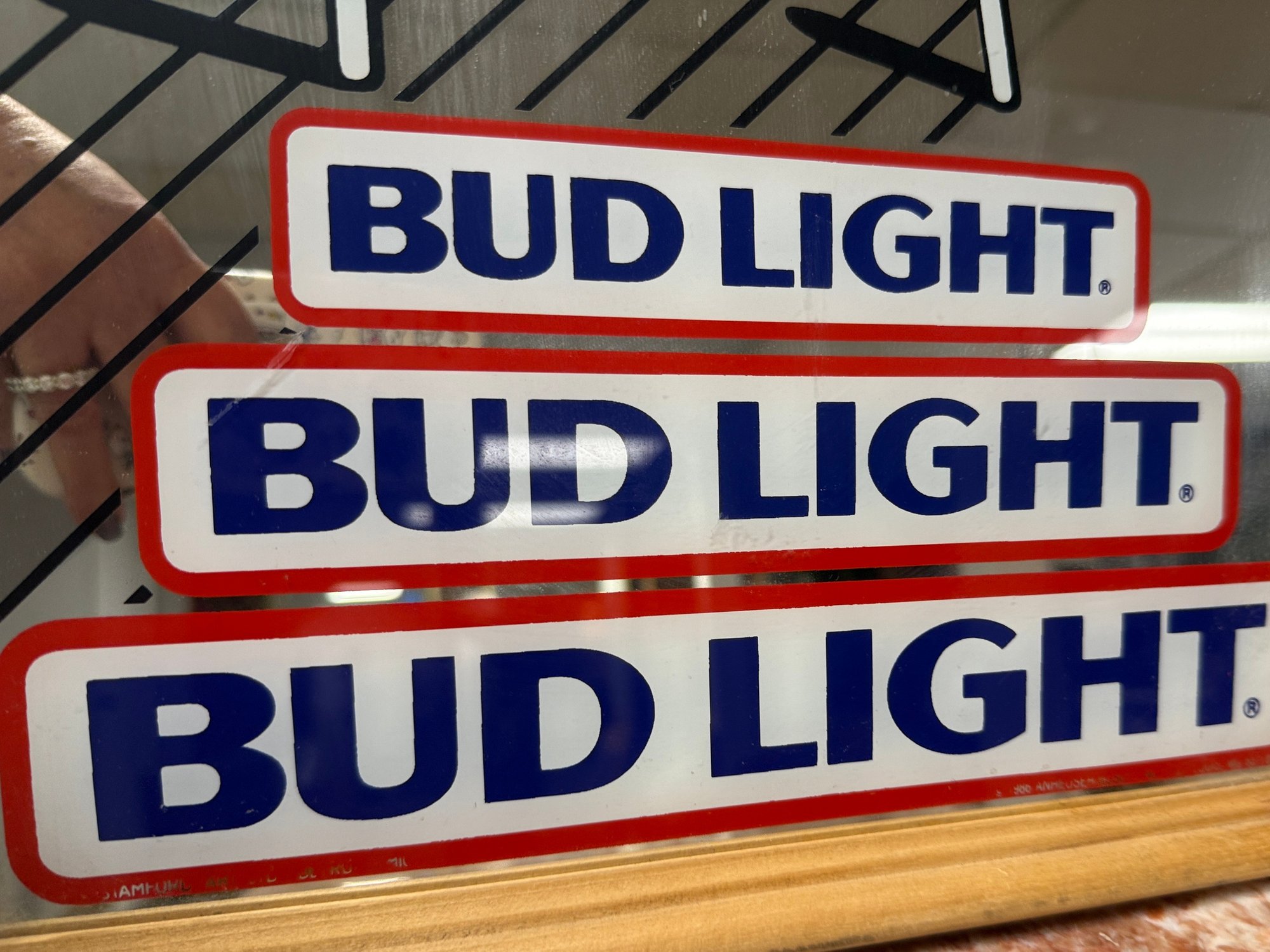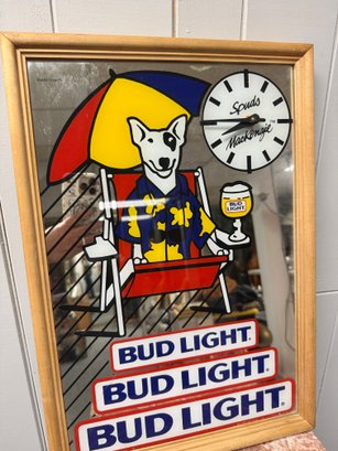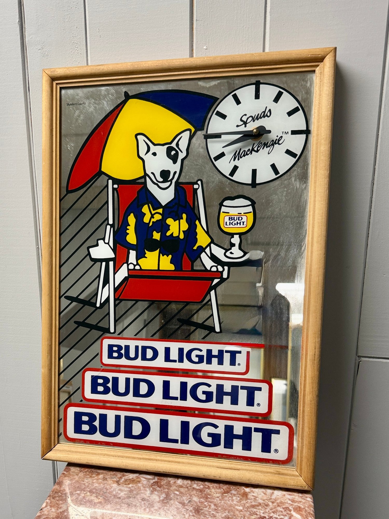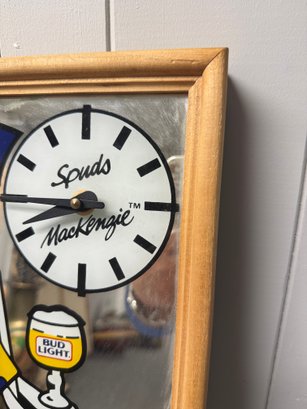 (P-28) VINTAGE BUD LIGHT SPUDS MACKENZIE MIRROR CLOCK, BATTERY OPERATED, NOT TESTED - 14" BY 20"