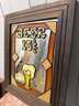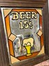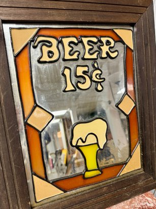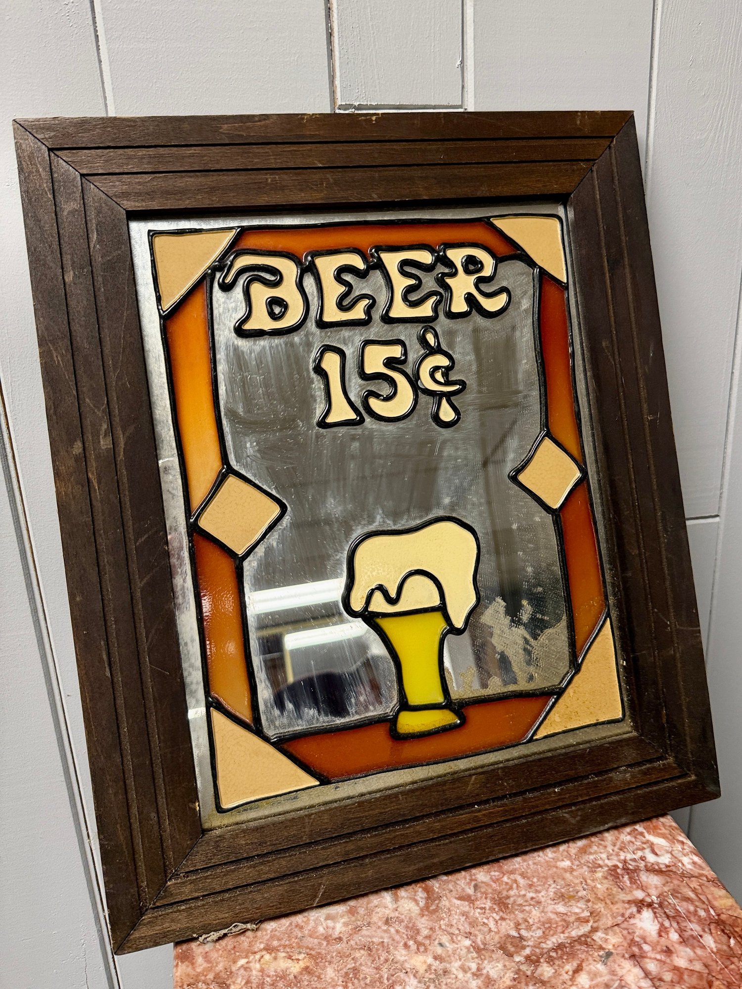 (P-33) VINTAGE "BEER" STAINED GLASS MIRRORED BAR SIGNED -15" BY 13"
