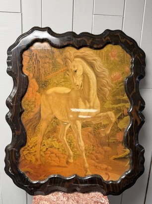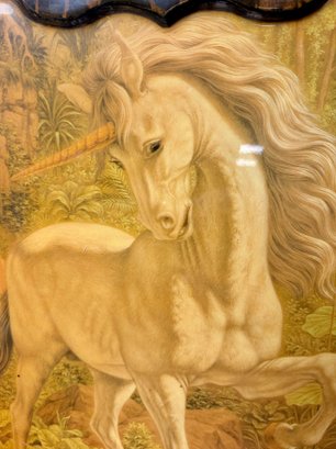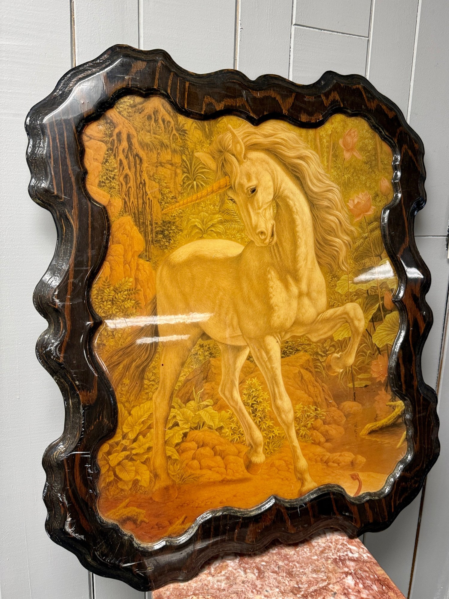 (P-35) VINTAGE UNICORN PRINT MOUNTED ON LACQUERED WOOD- 23" BY 28"