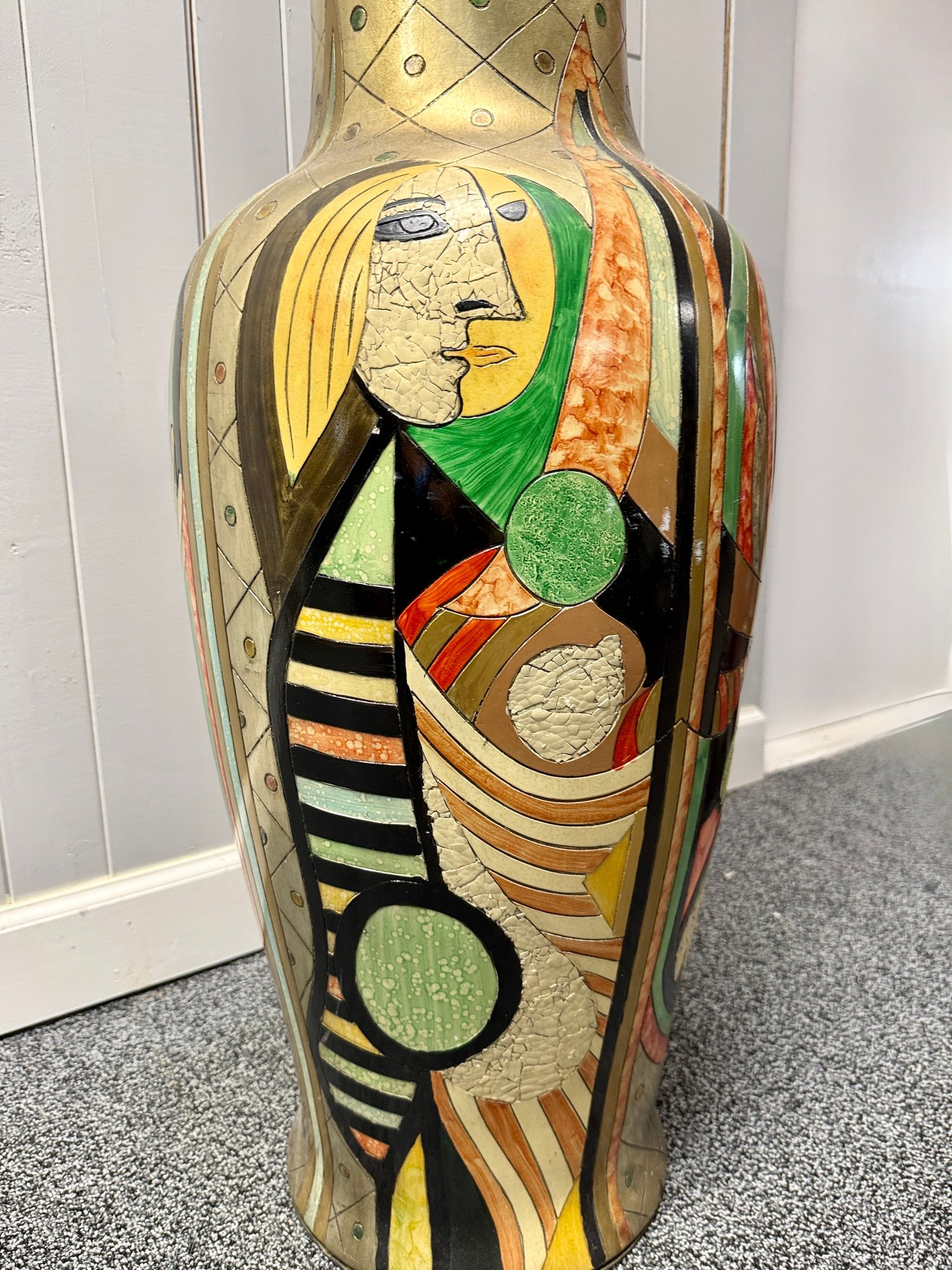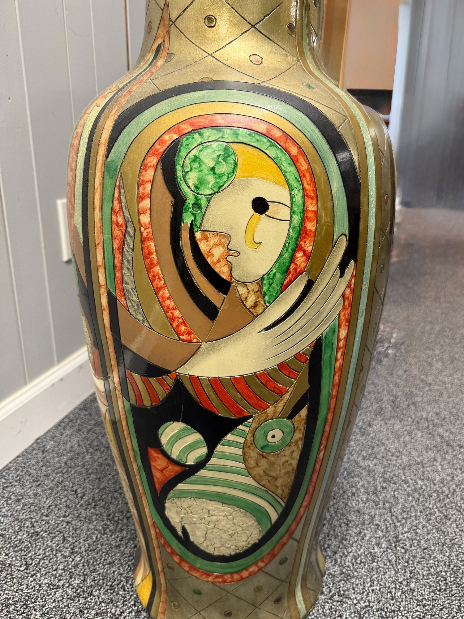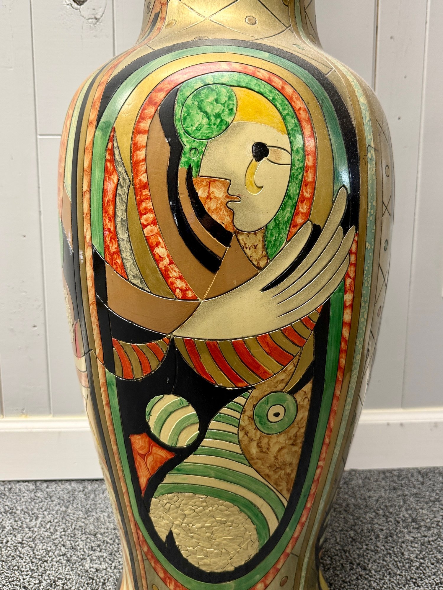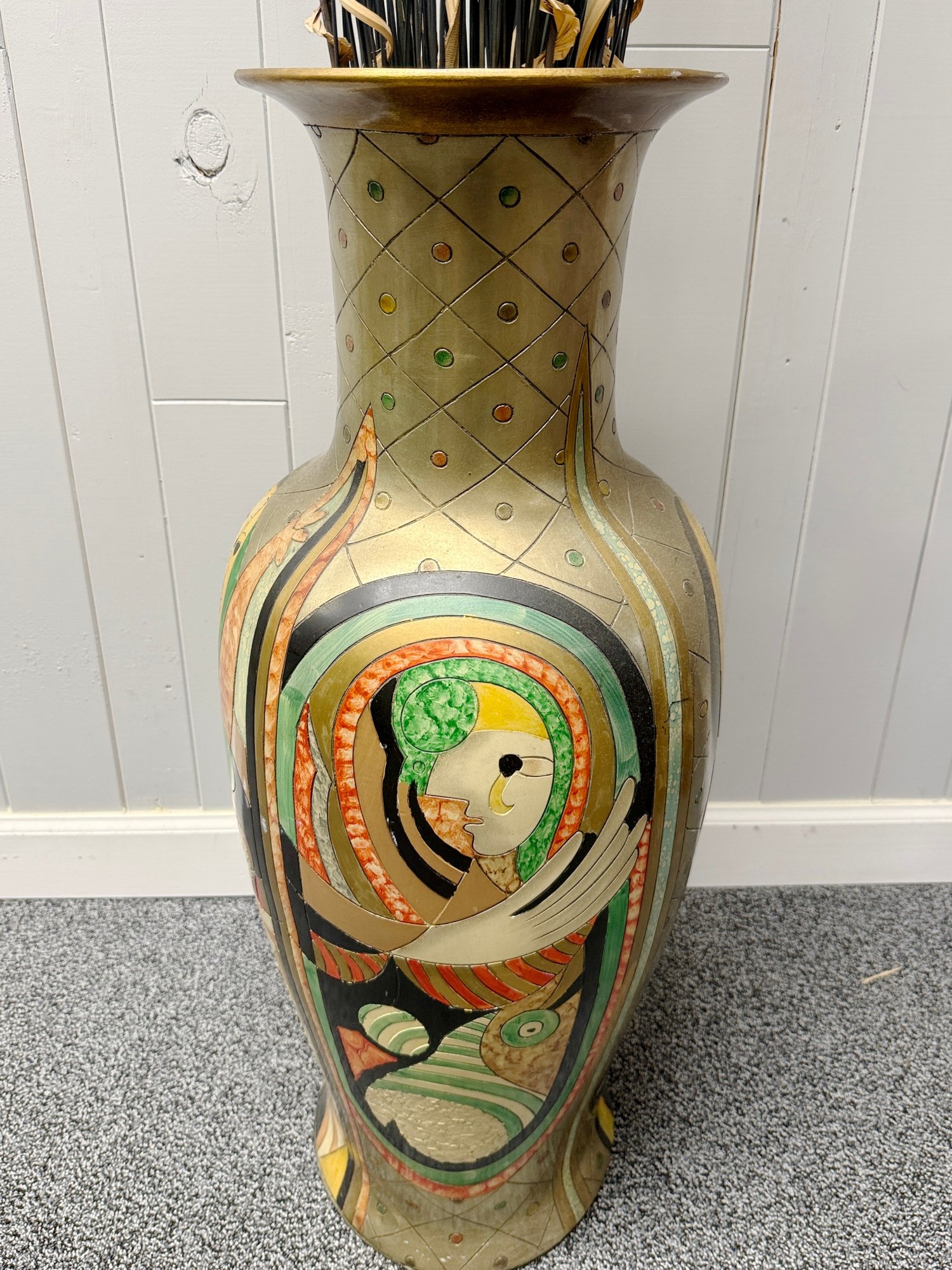 (P-38) MODERNIST OVERSIZED VINTAGE FLOOR VASE WITH BOLD FACES & DESIGNS -37"H BY 15"