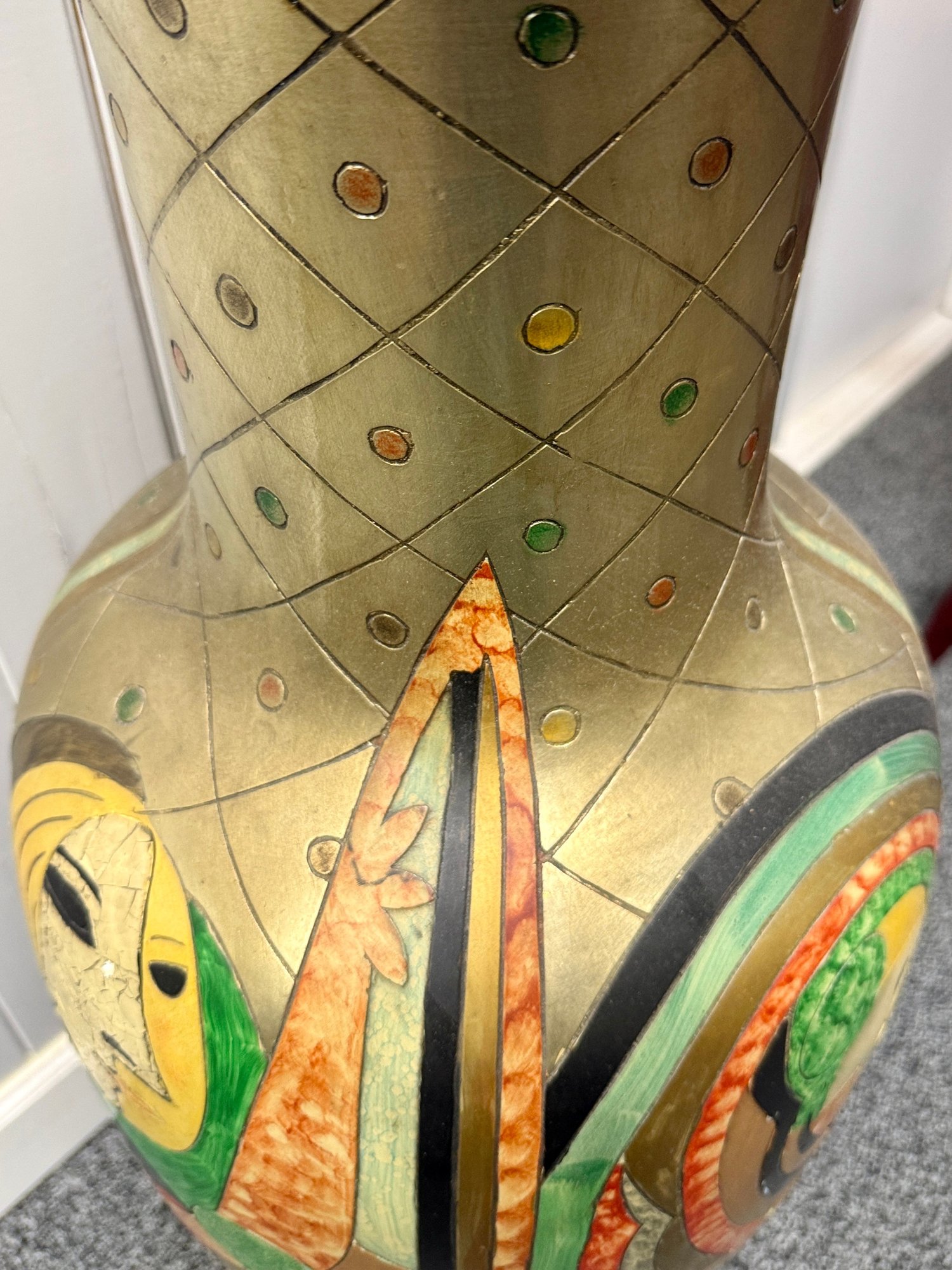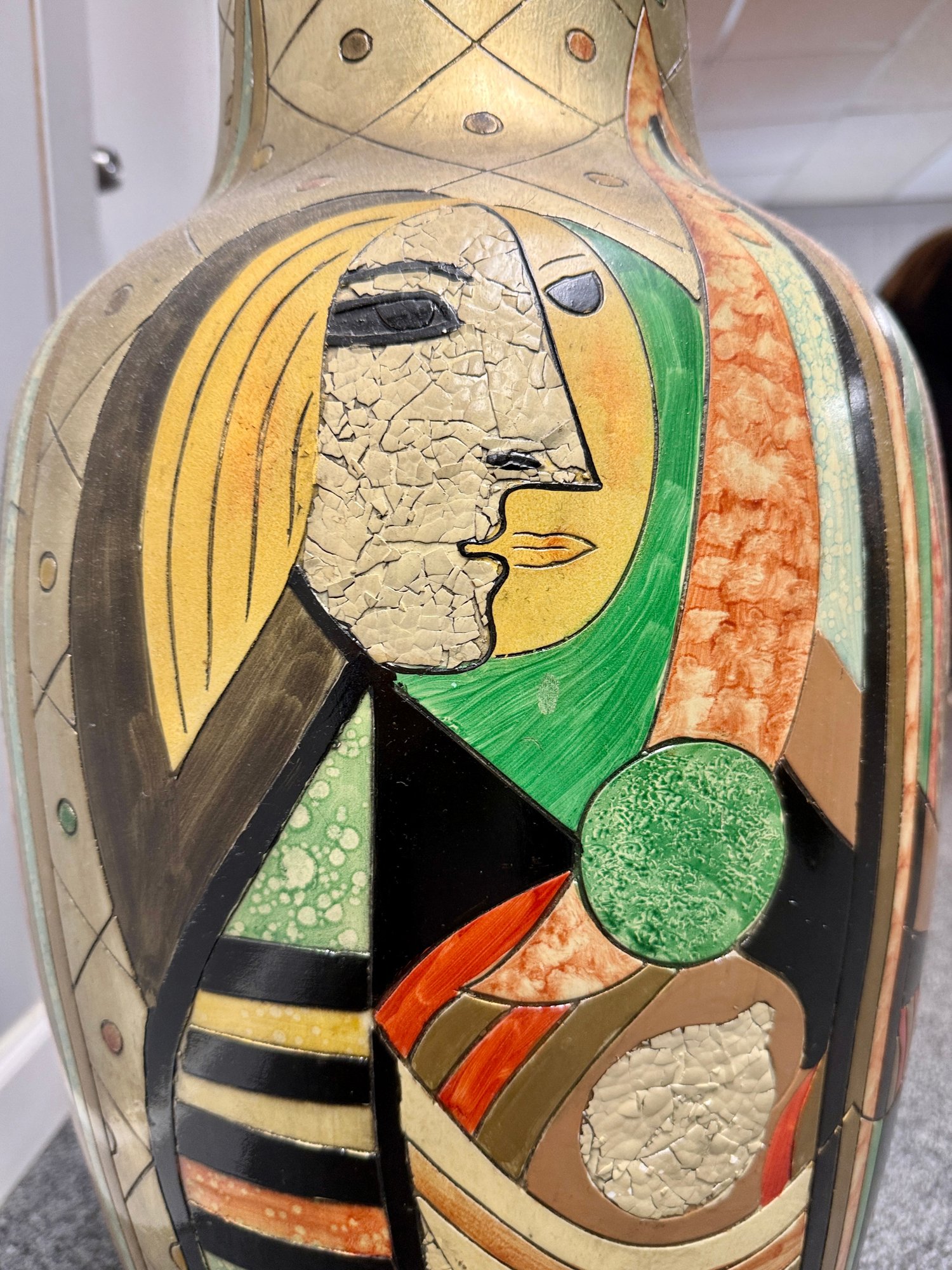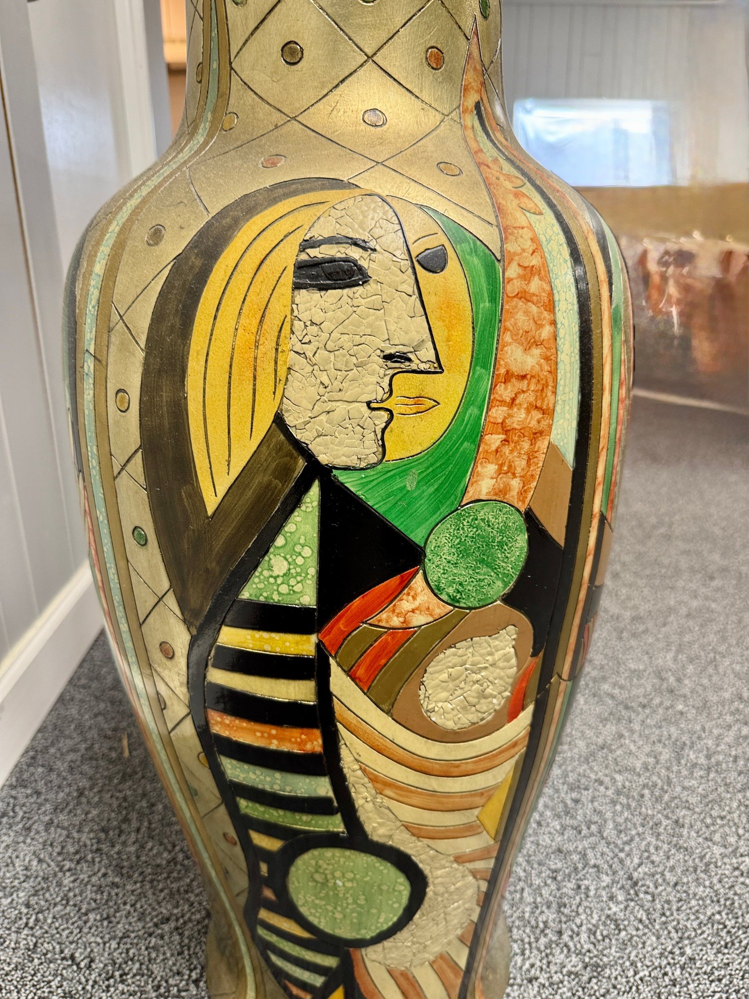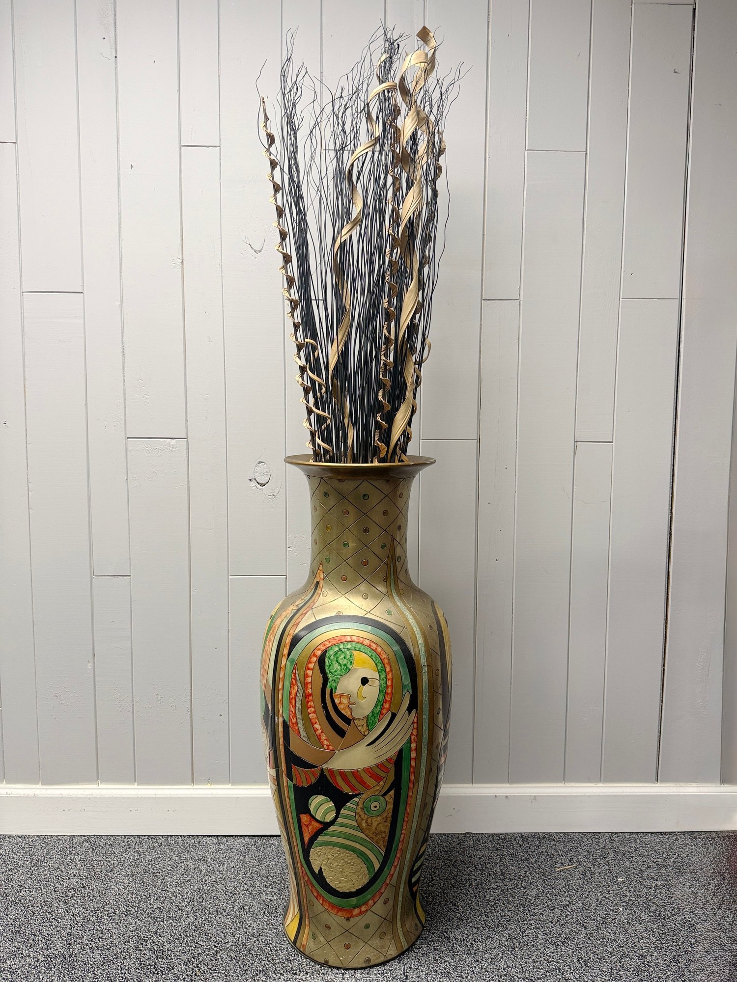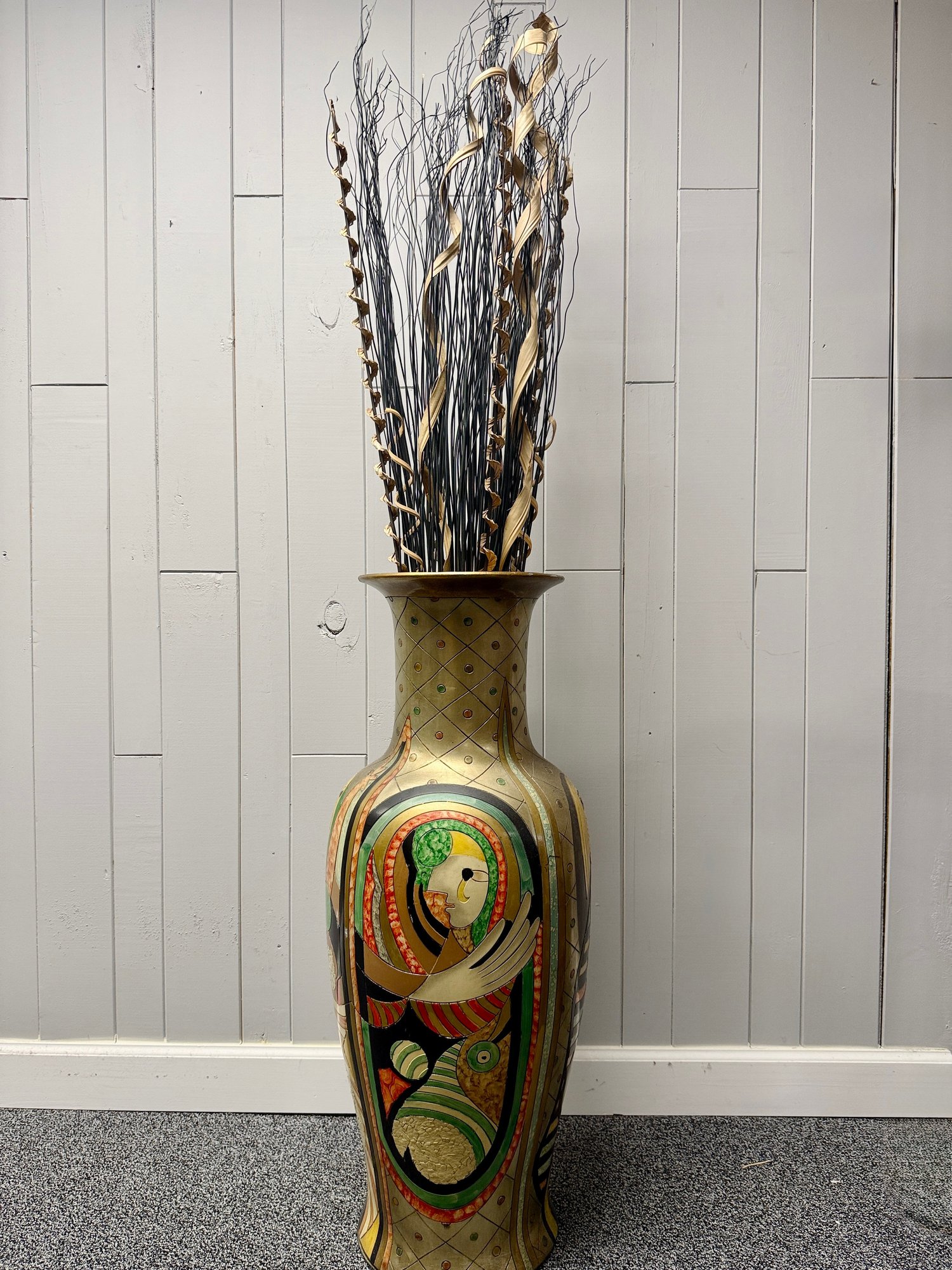 (P-38) MODERNIST OVERSIZED VINTAGE FLOOR VASE WITH BOLD FACES & DESIGNS -37"H BY 15"