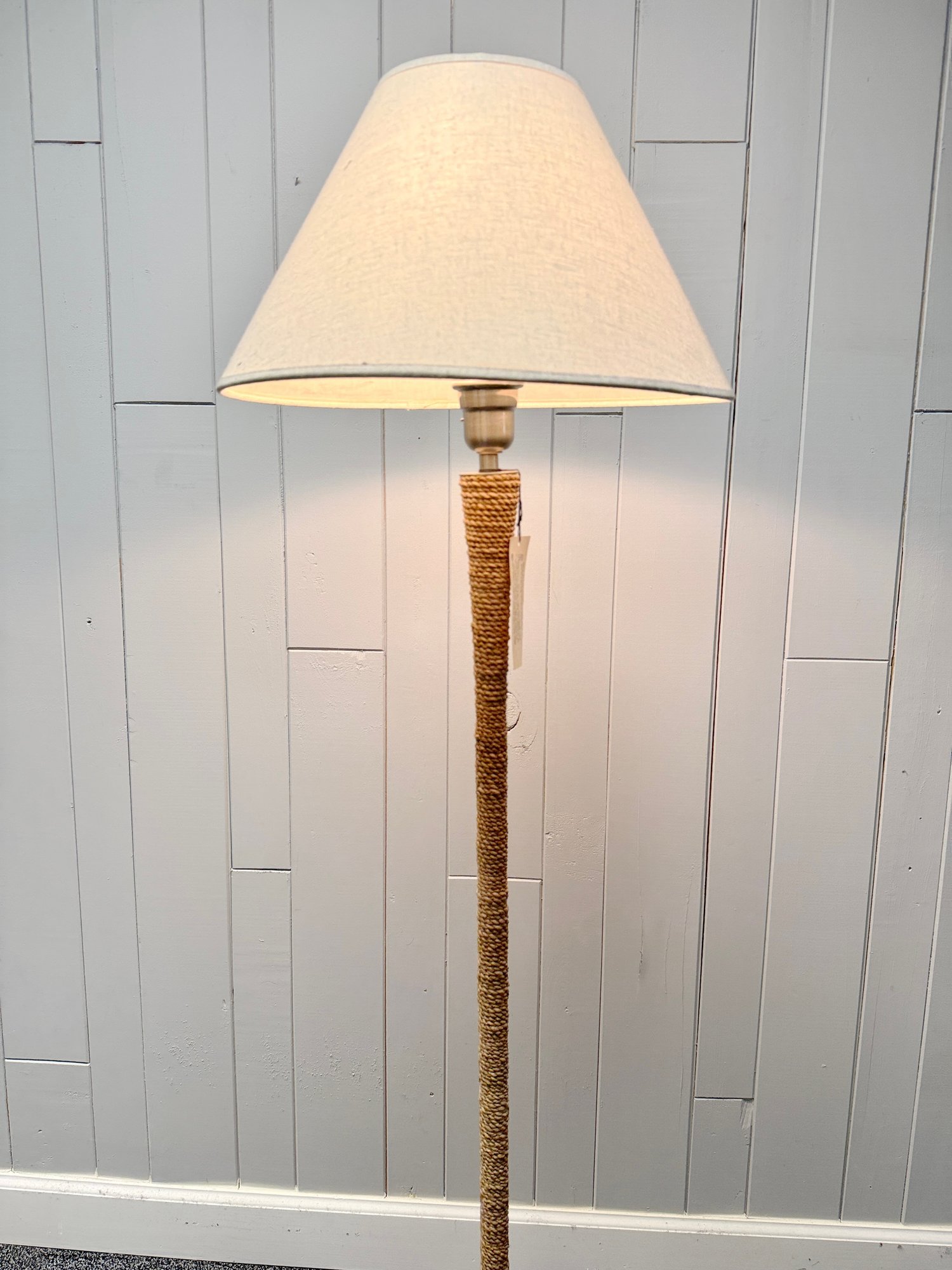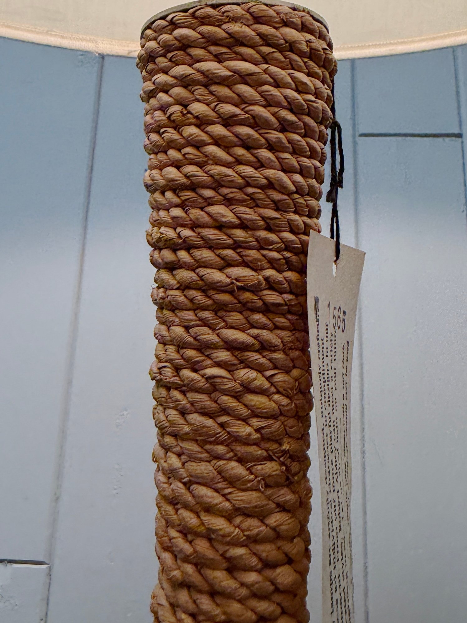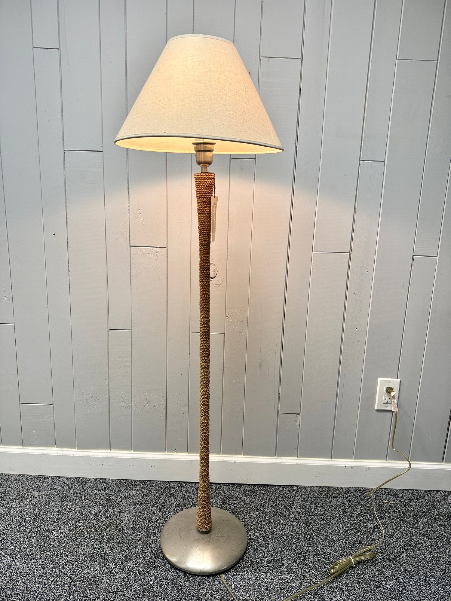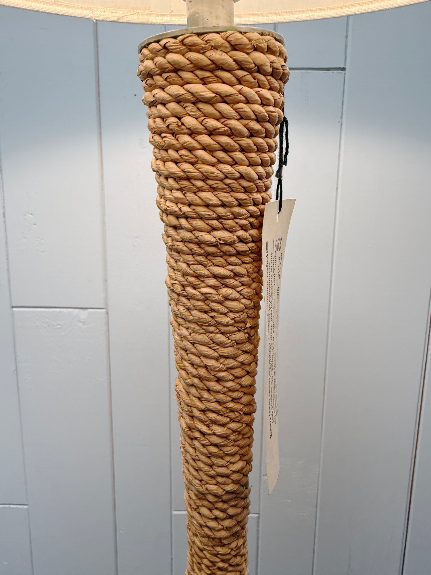 (P-59) ROBERT ABBEY RATTAN ROPE WRAPPED FLOOR LAMP WITH LINEN SHADE, WORKING - 57"