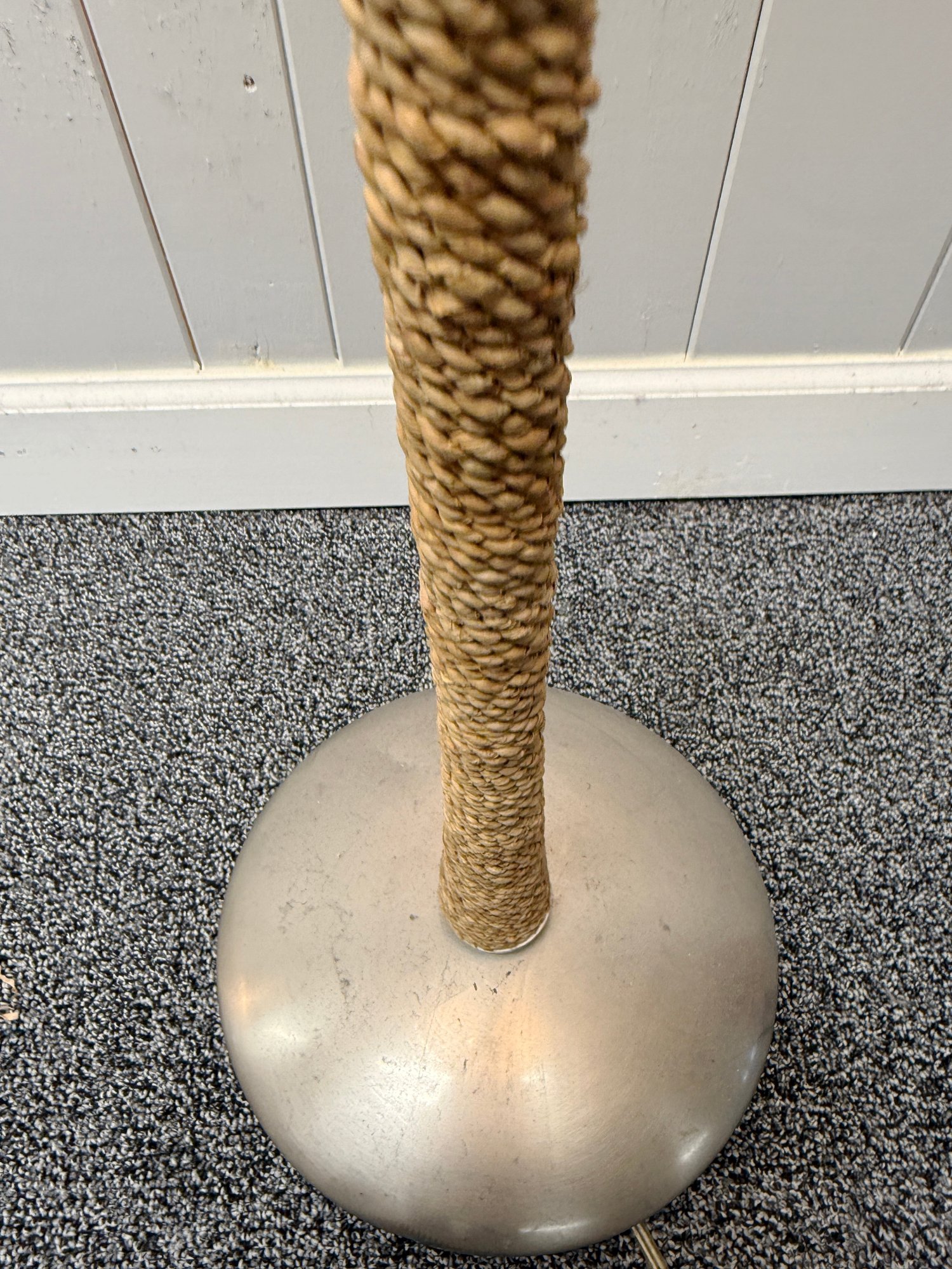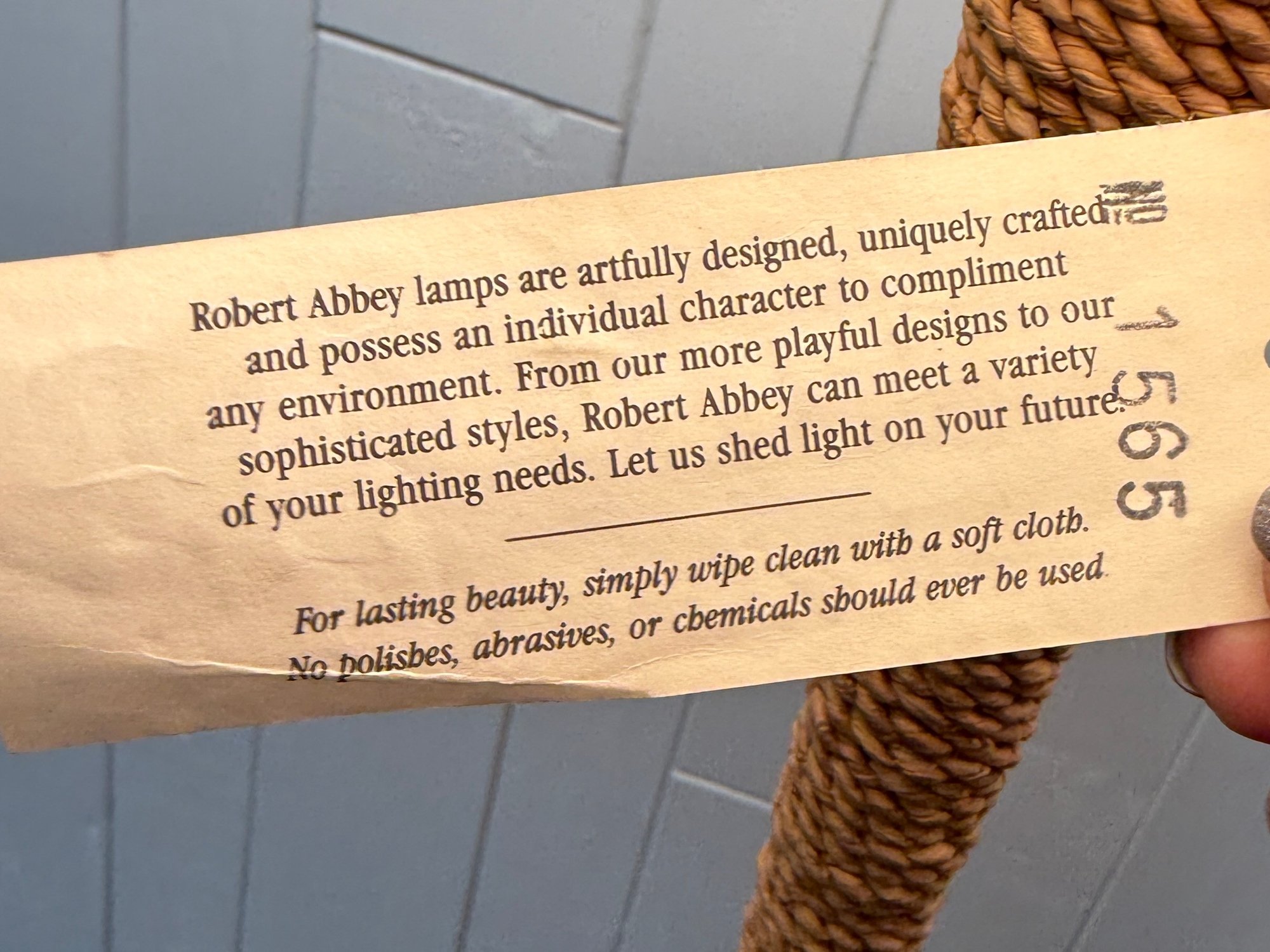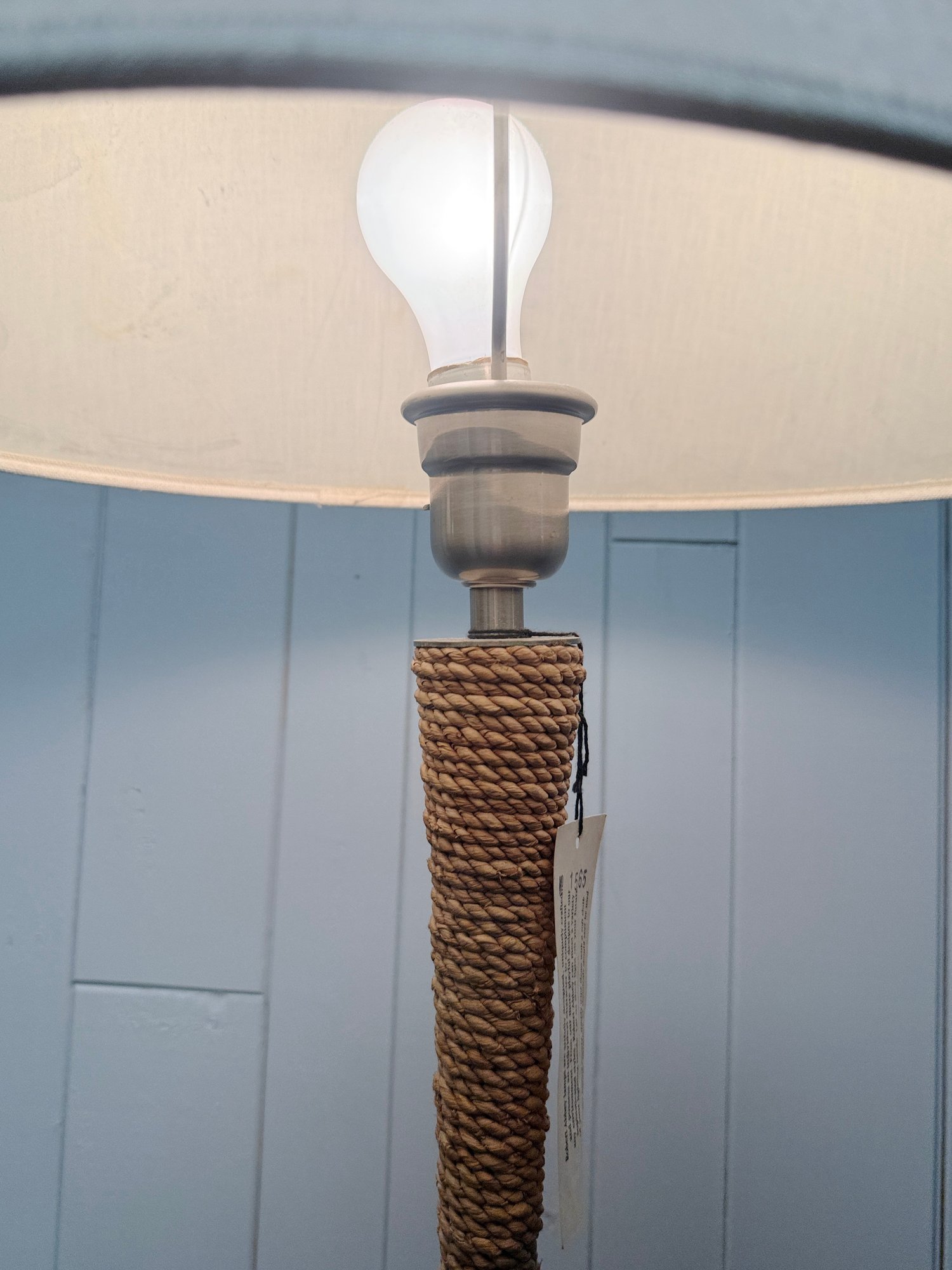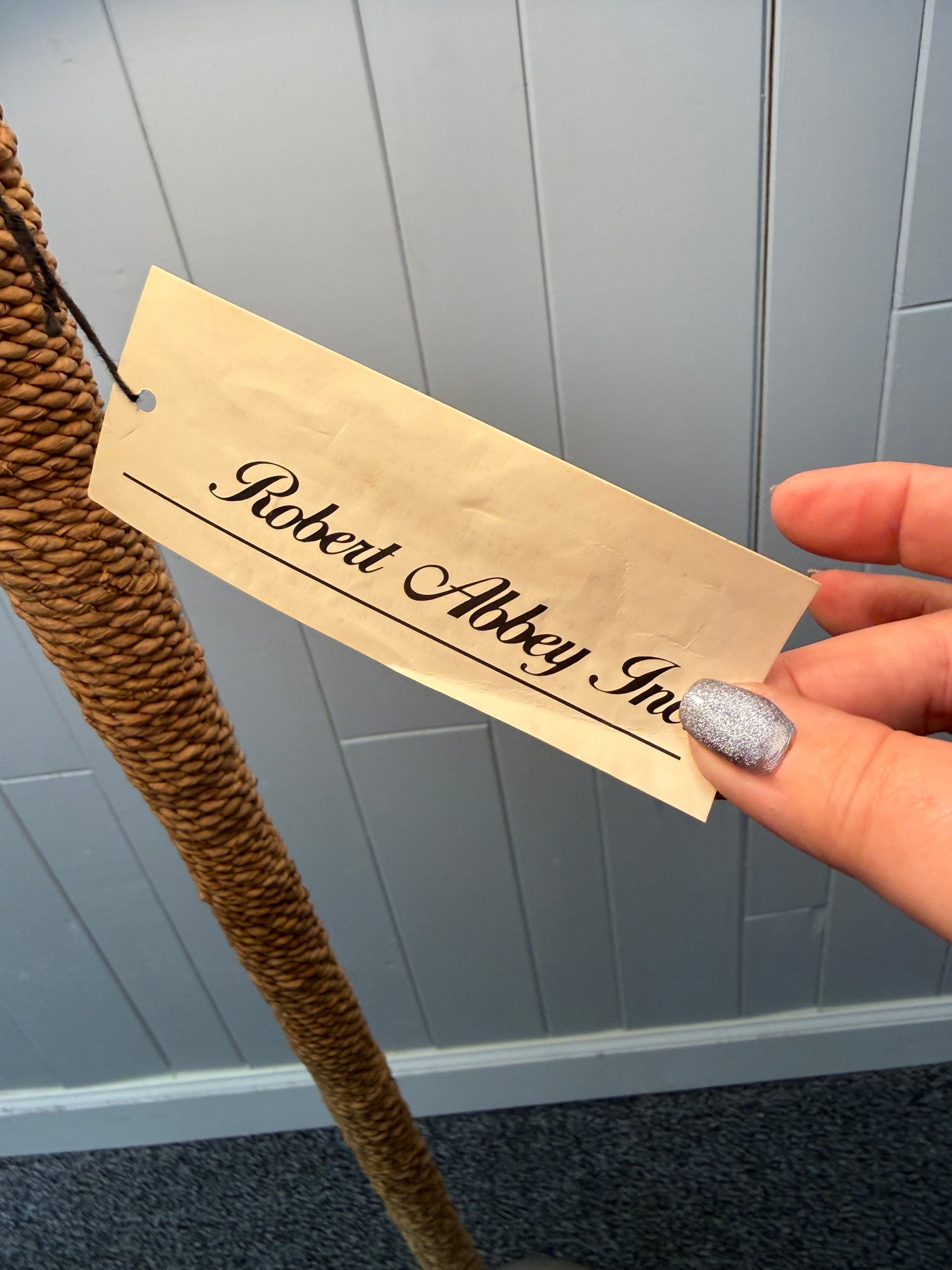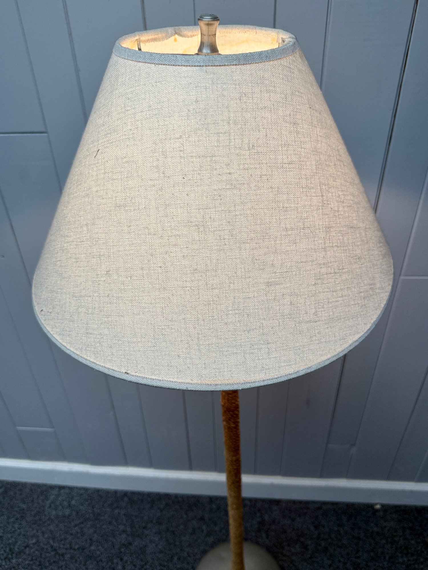 (P-59) ROBERT ABBEY RATTAN ROPE WRAPPED FLOOR LAMP WITH LINEN SHADE, WORKING - 57"