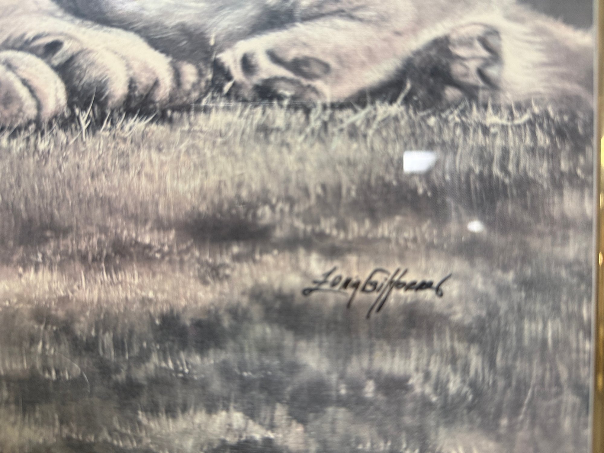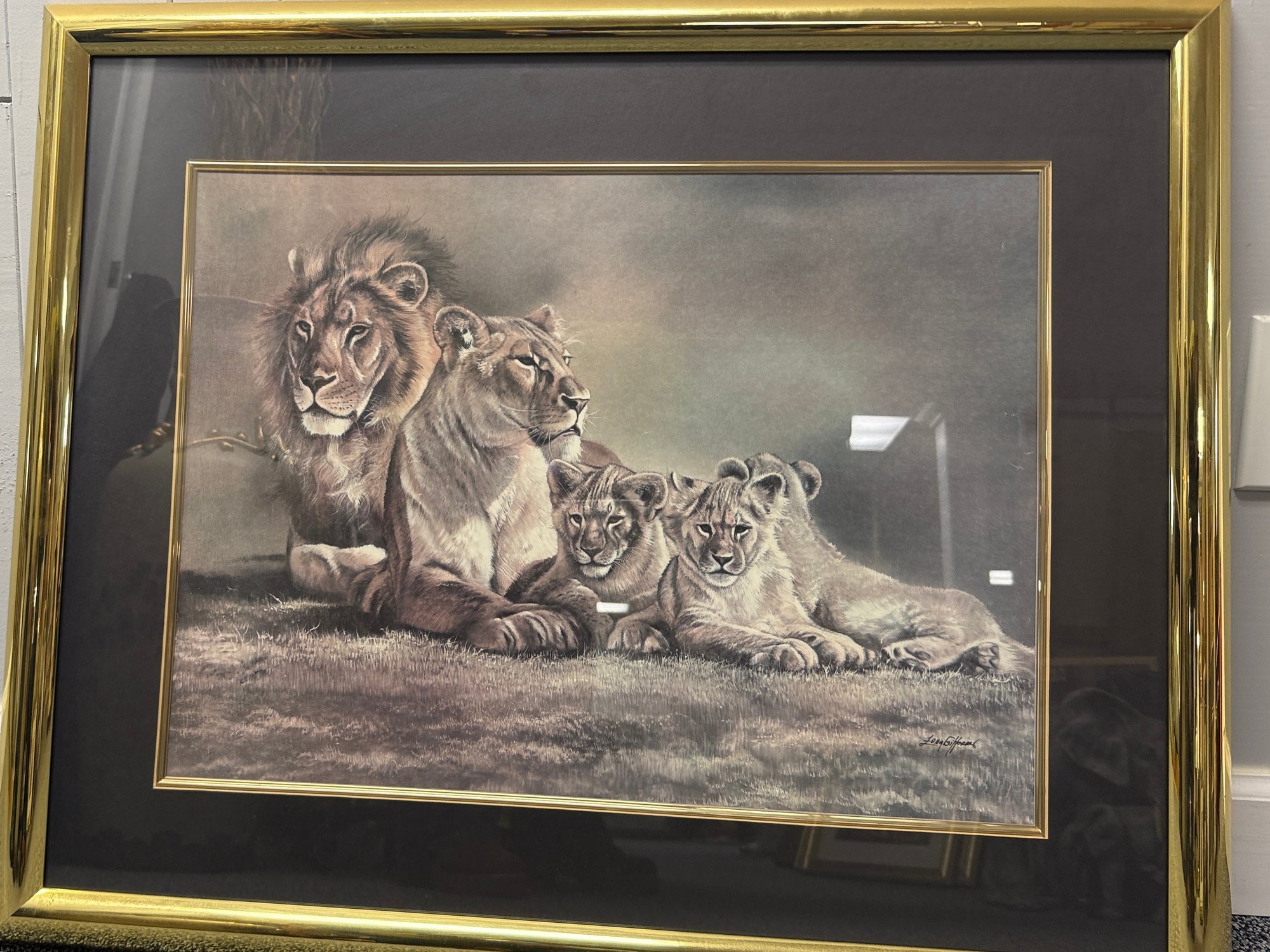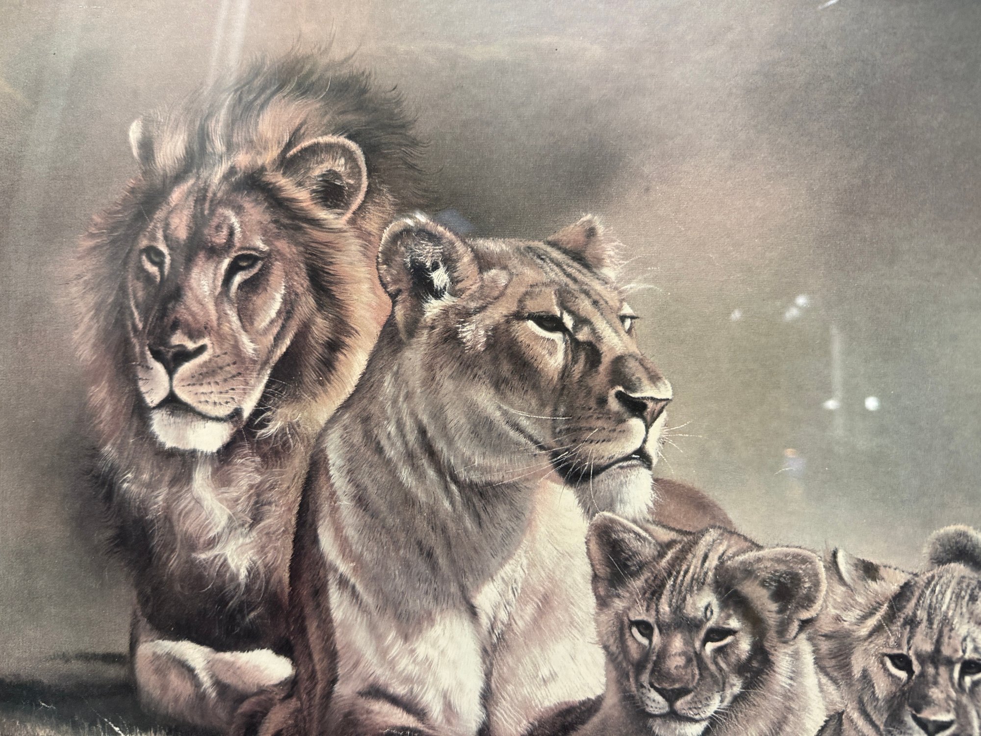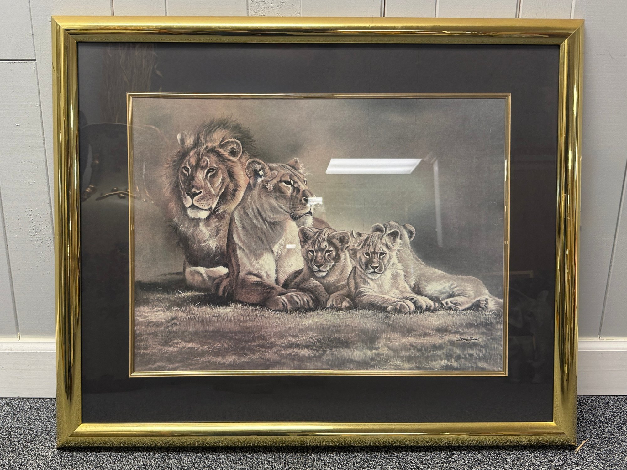 (P-6) LARGE FRAMED VINTAGE PRINT - LIONS & CUBS BY TONY GIFFORD - 33" BY 28"