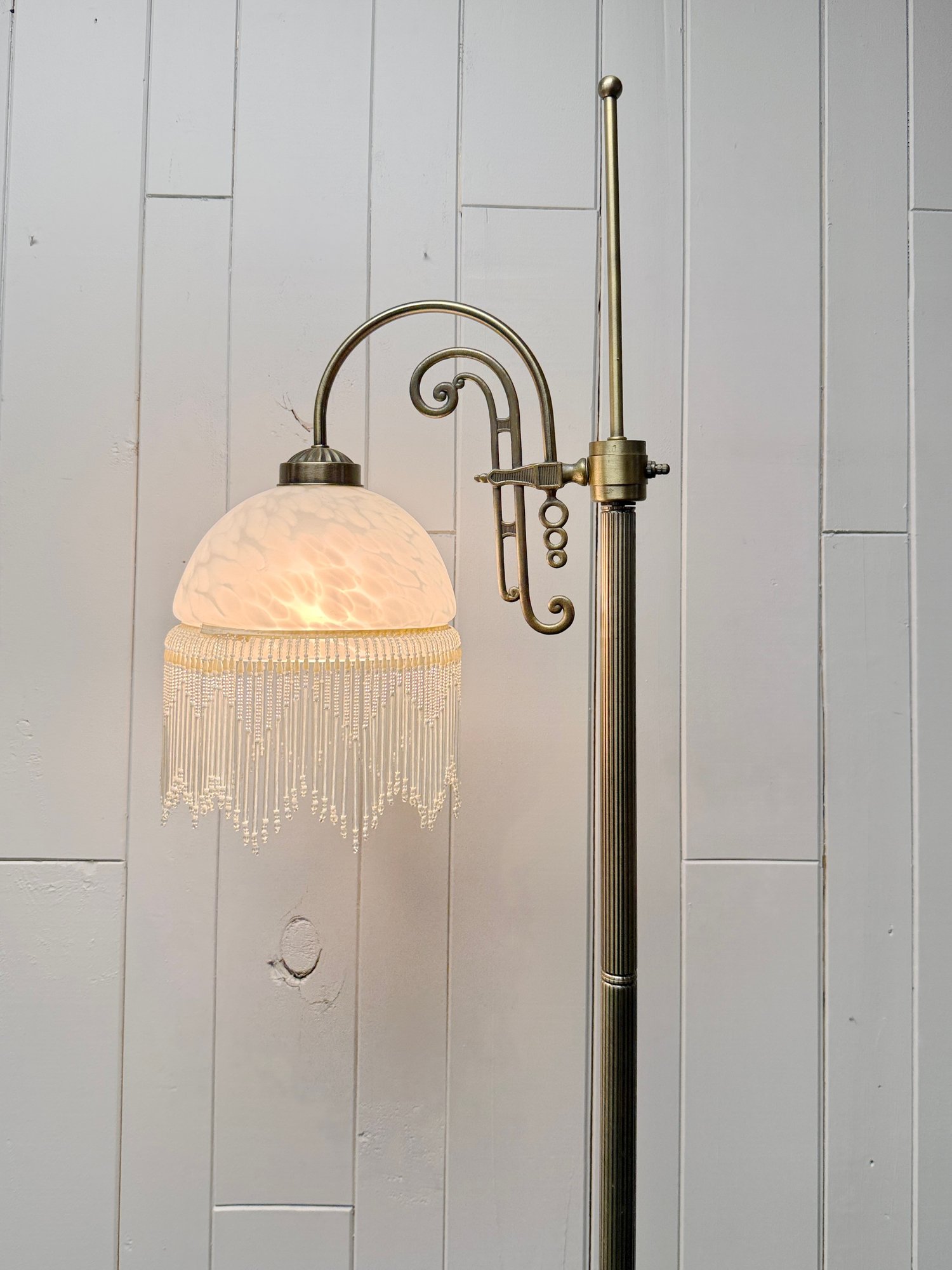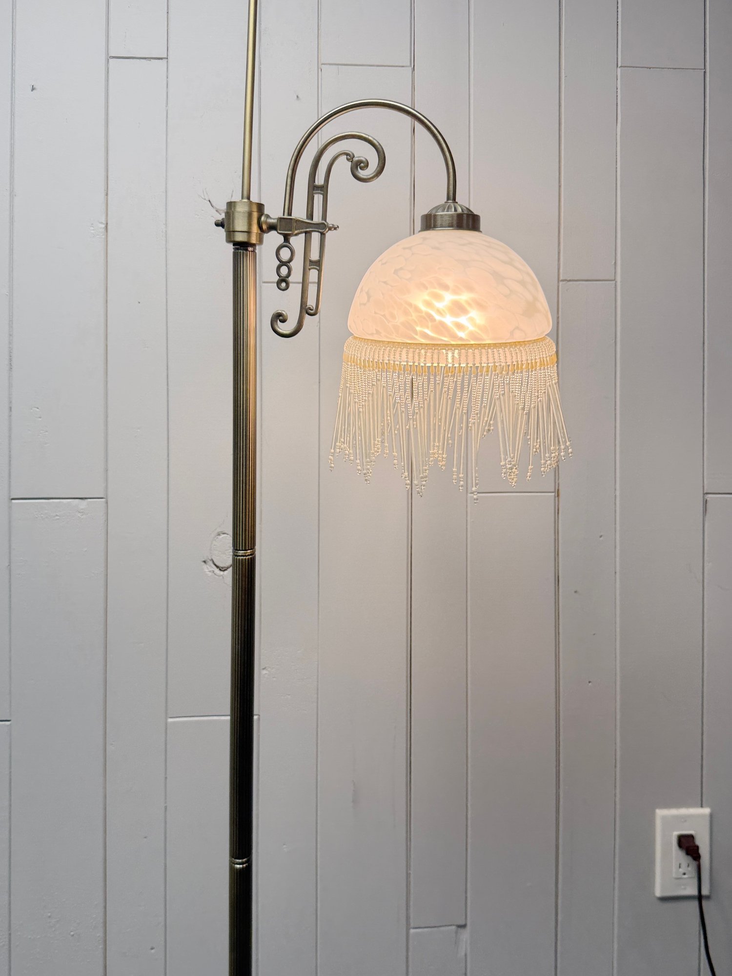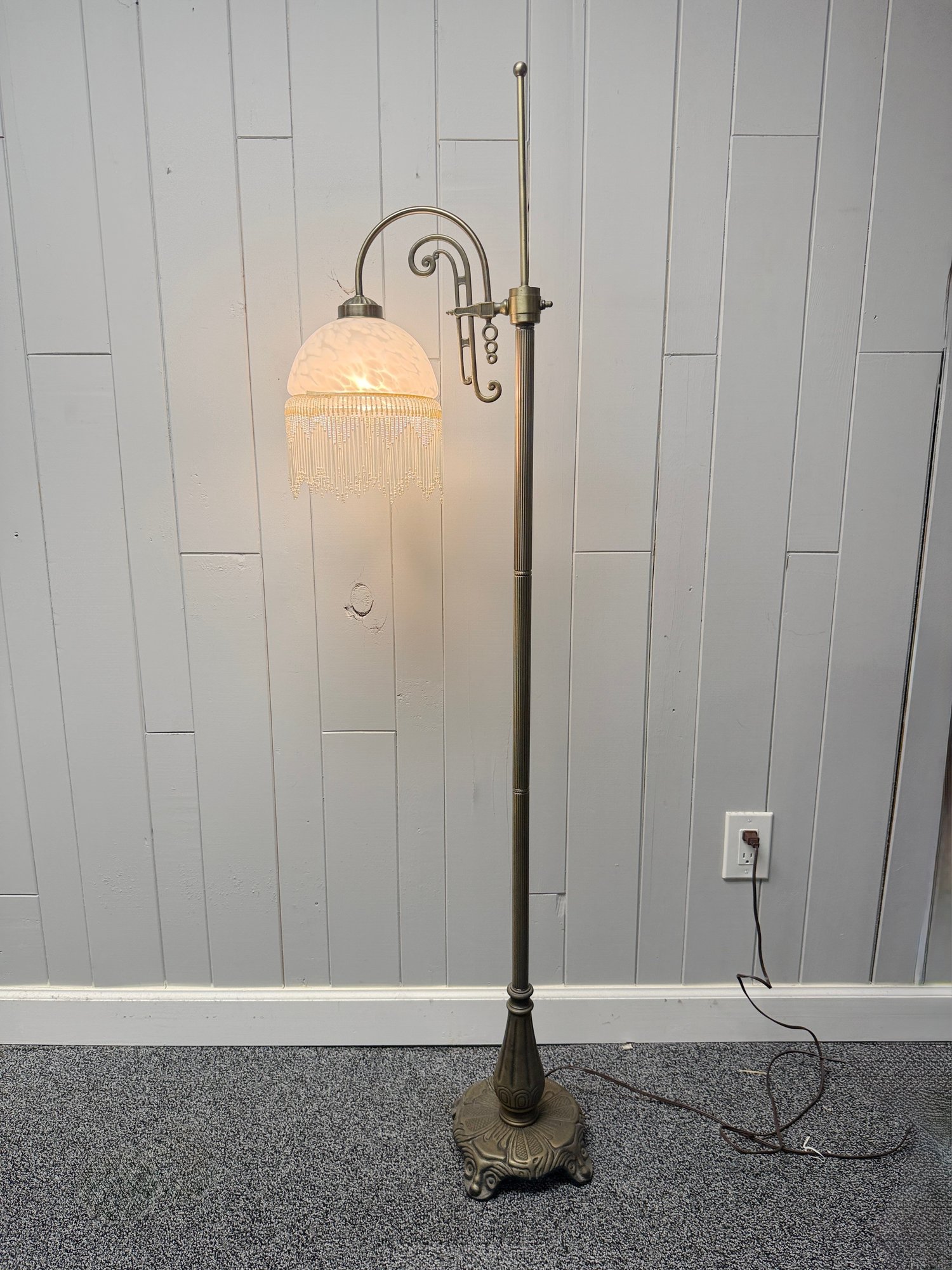 (P-61) VINTAGE VICTORIAN STYLE FLOOR LAMP WITH BEADED GLASS SHADE & BRASS BASE, WORKING - 61"
