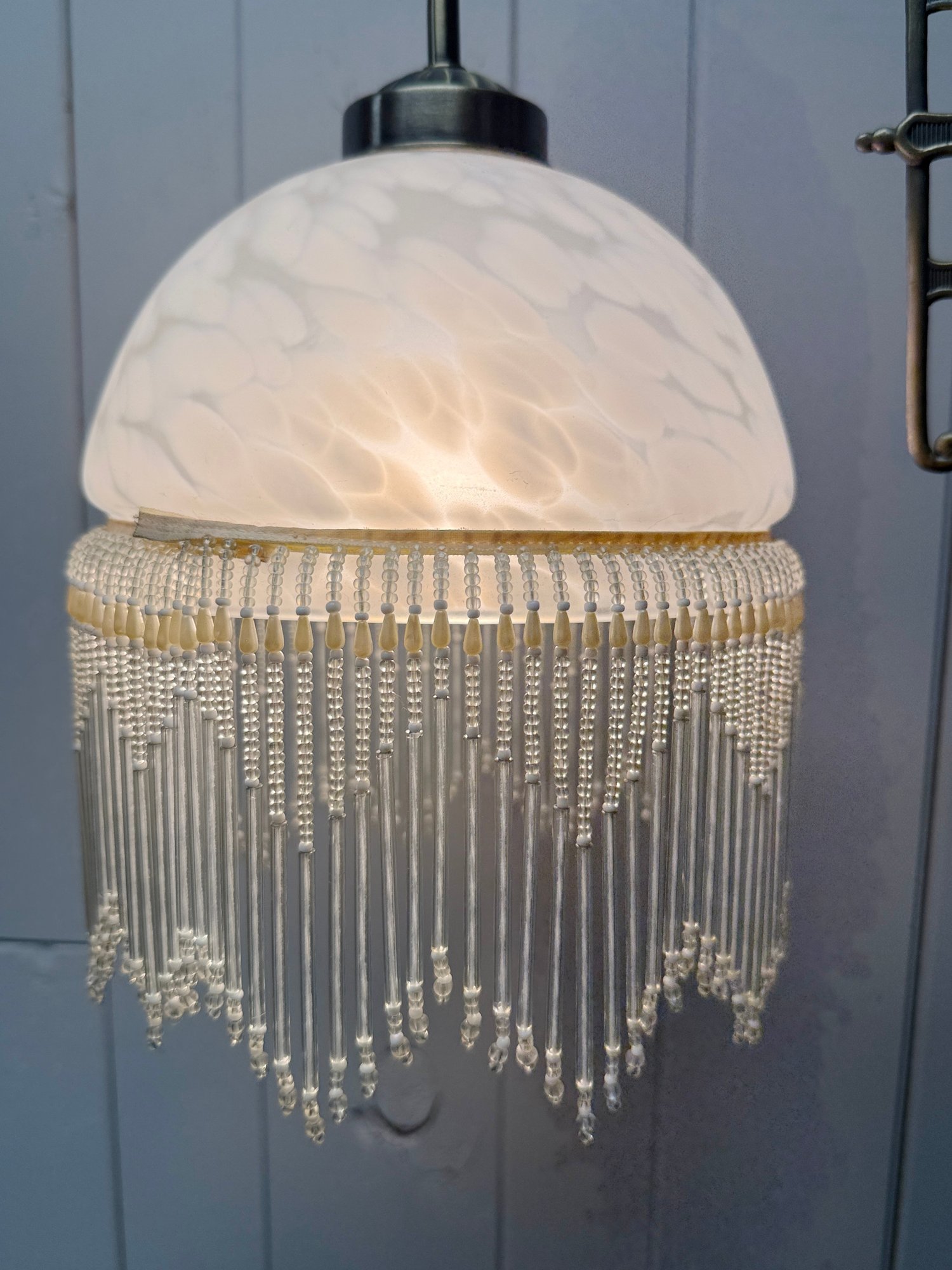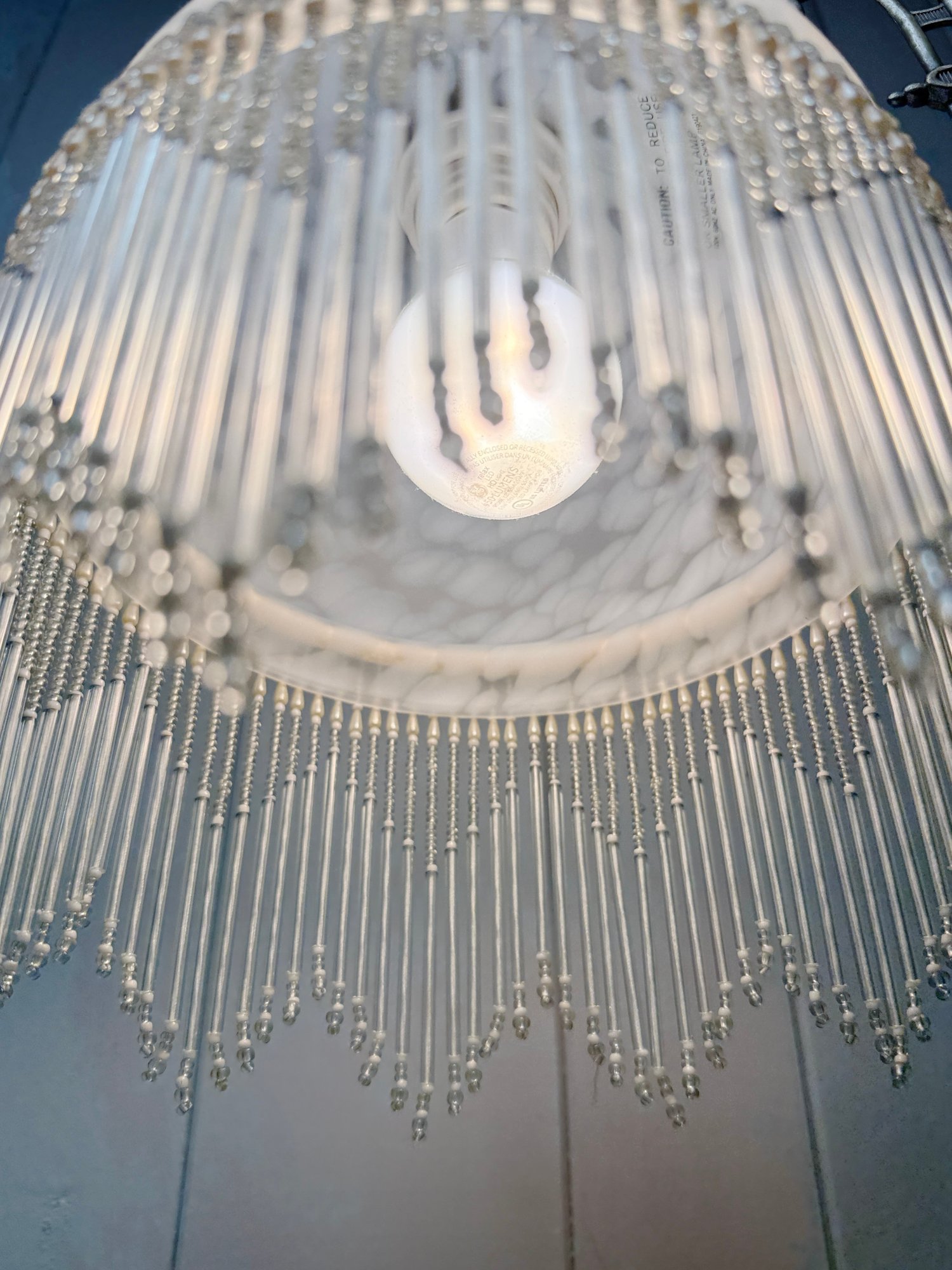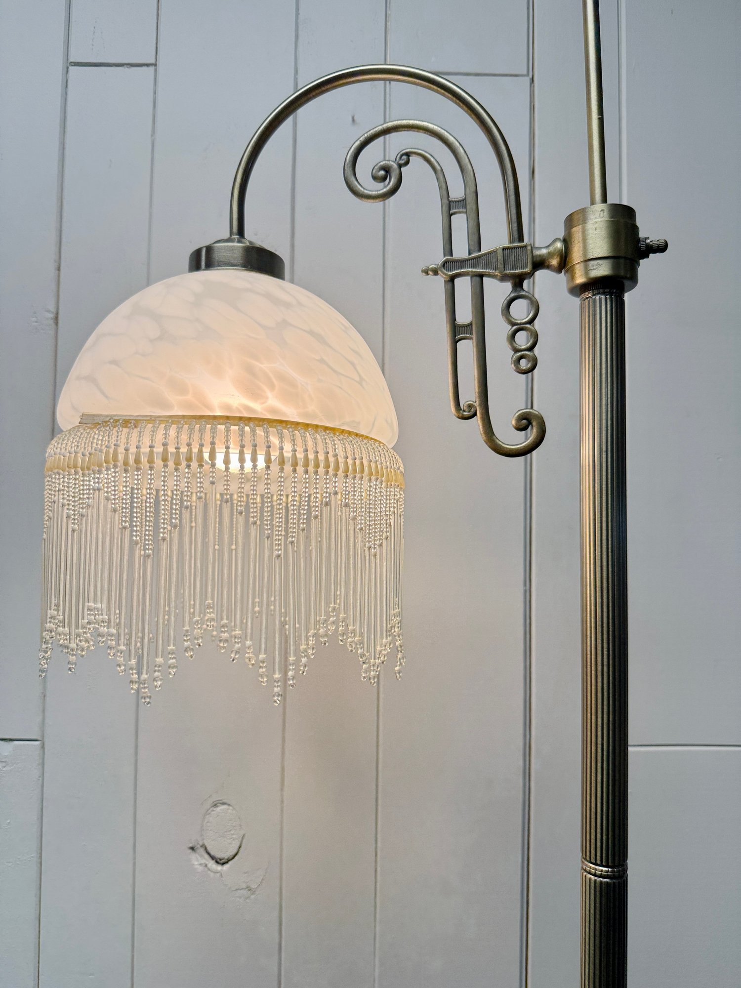 (P-61) VINTAGE VICTORIAN STYLE FLOOR LAMP WITH BEADED GLASS SHADE & BRASS BASE, WORKING - 61"