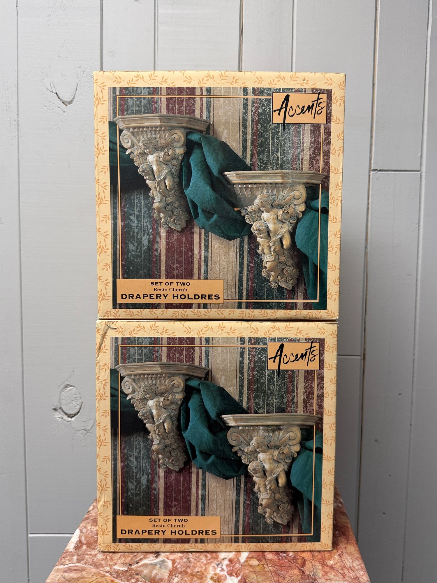 (P-72) TWO BOXES OF "ACCENTS" VINTAGE CHERUB DRAPERY HOLDERS - F TOTAL, 2 IN EACH BOX - NEW IN BOX