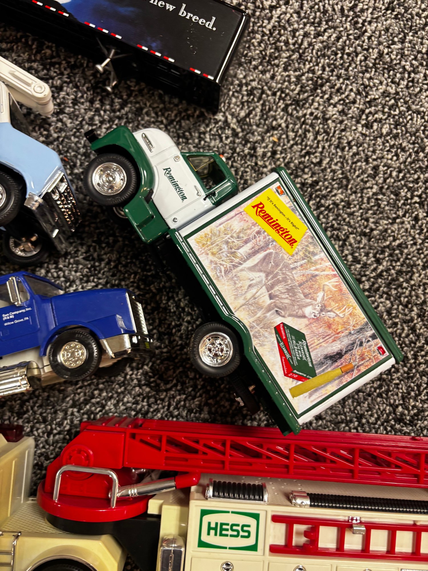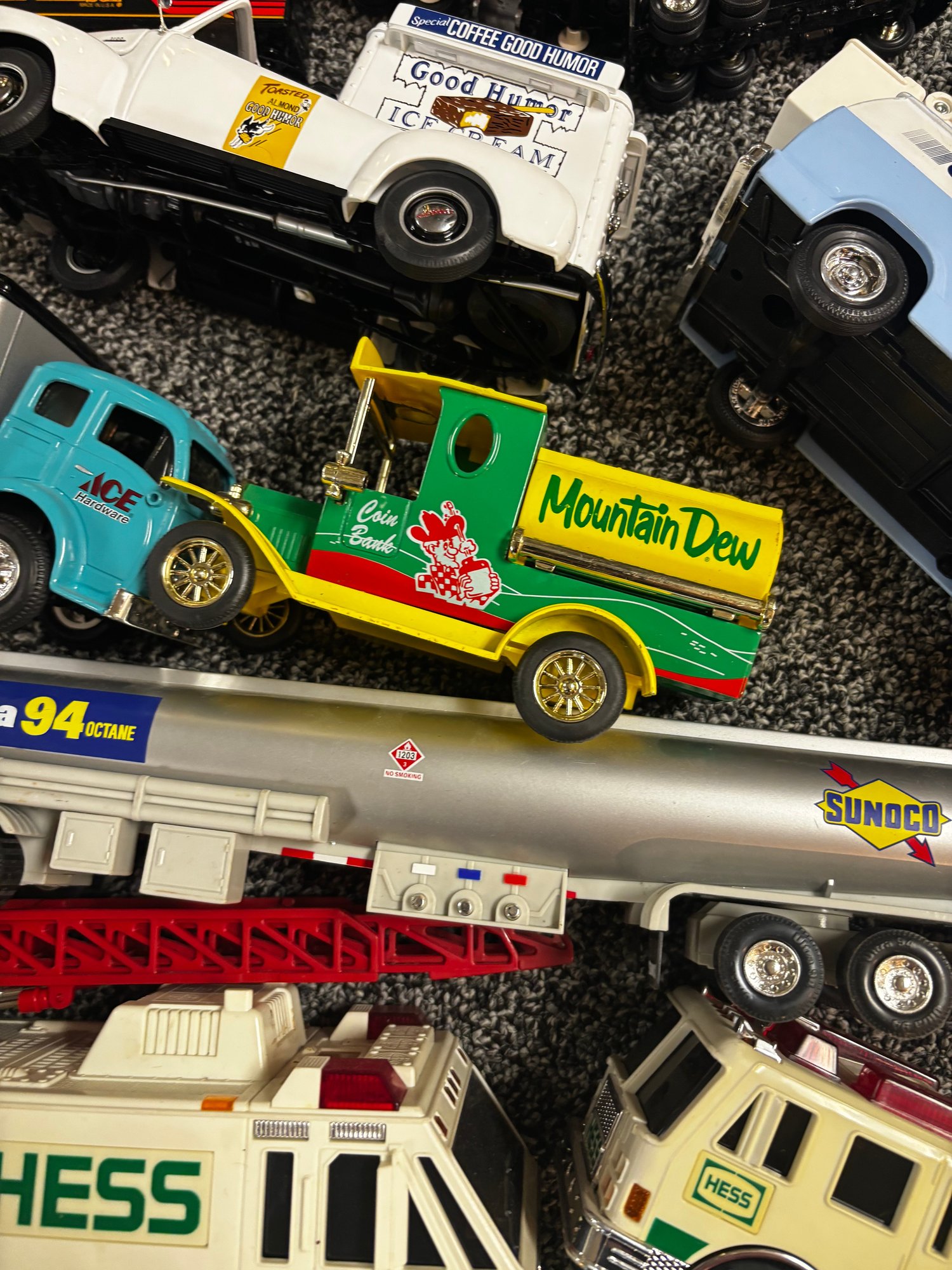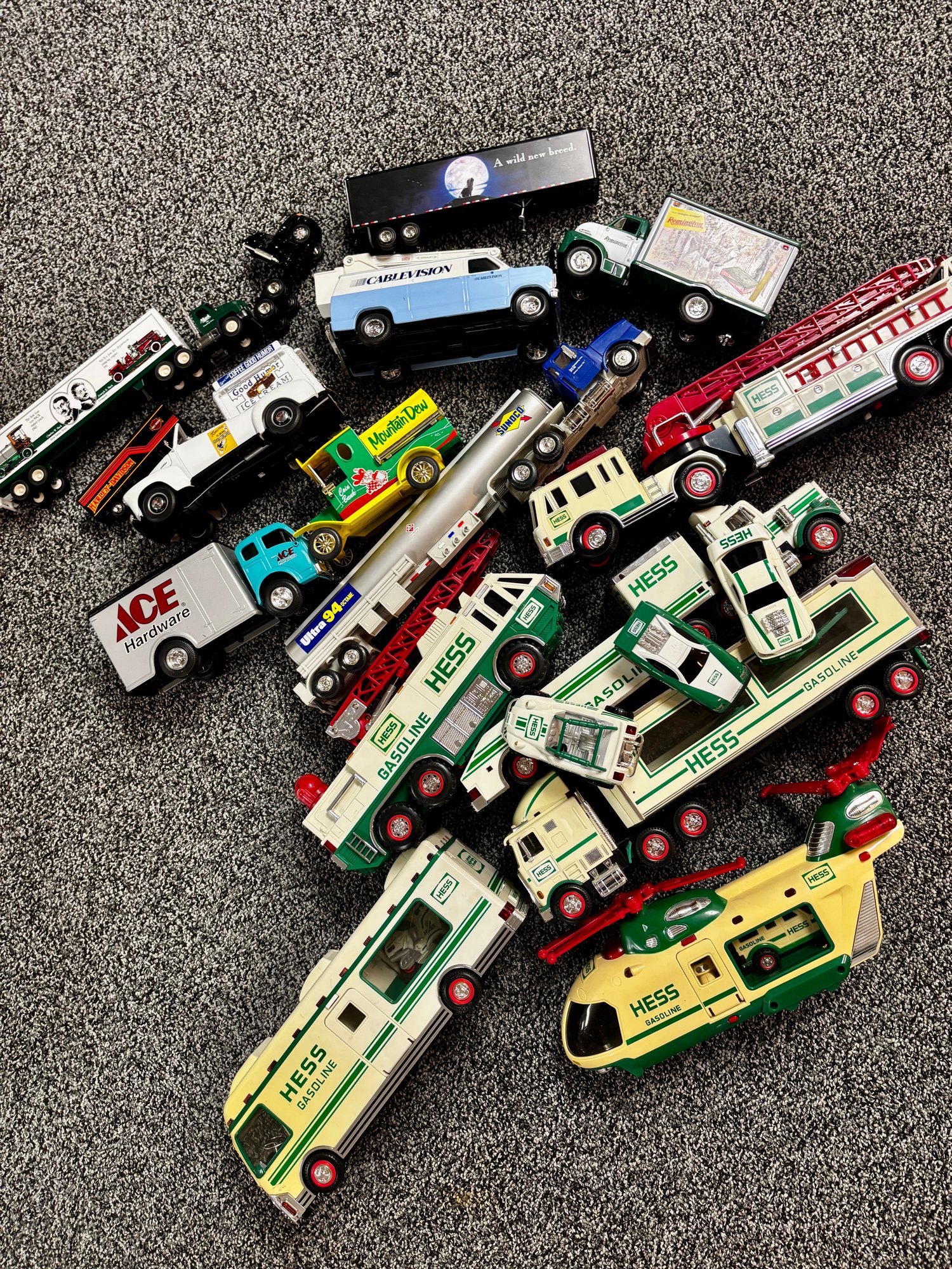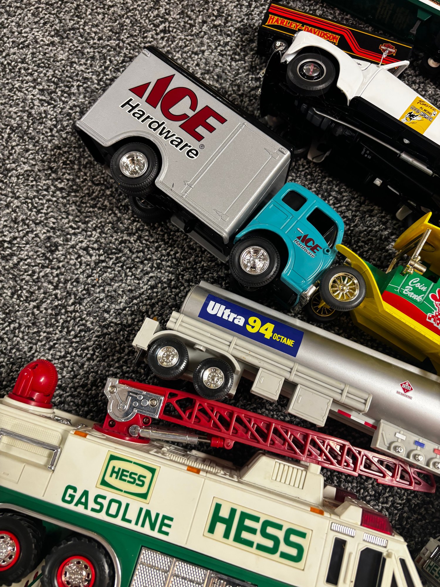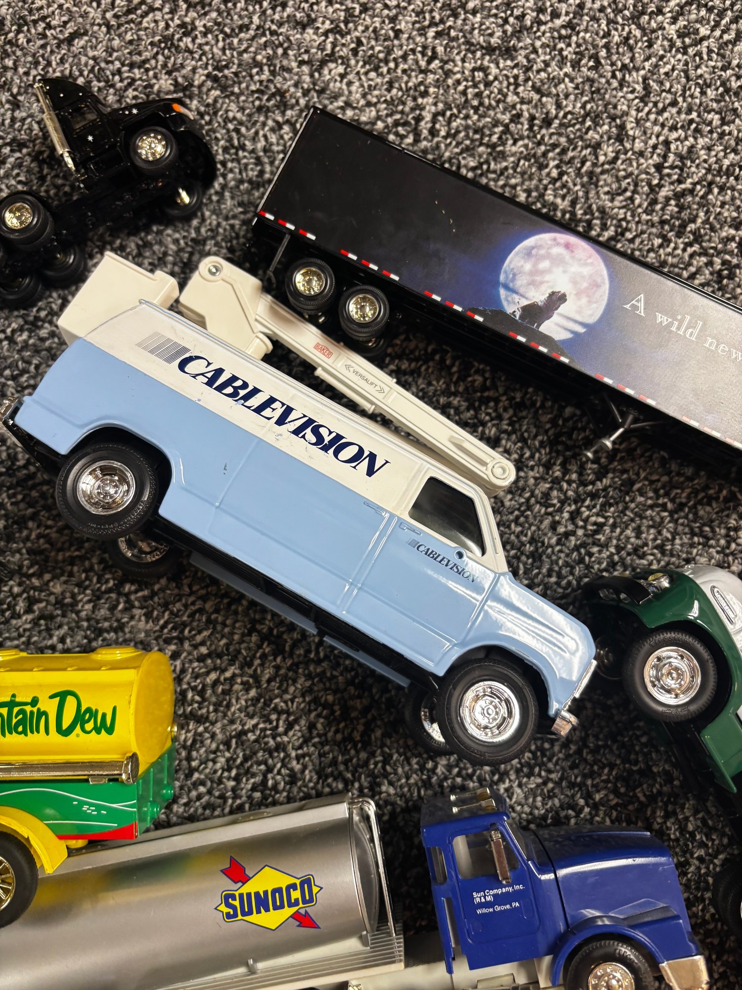 (P-83) BIG COLLECTION OF CAST IRON ADVERTISING TRUCKS CARS -HESS, CABLEVISION, ACE - ALL AS-IS