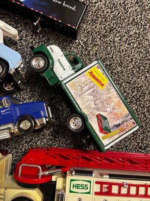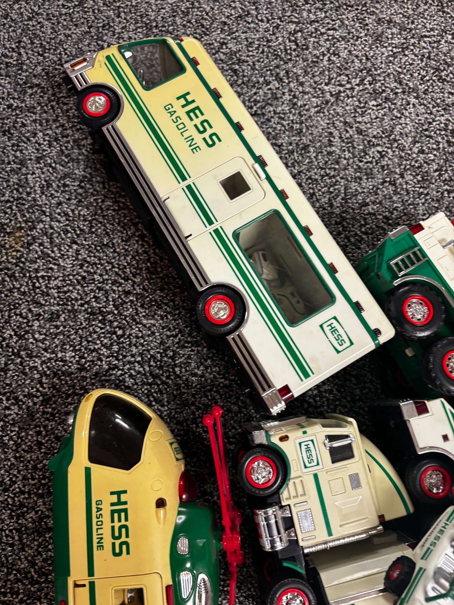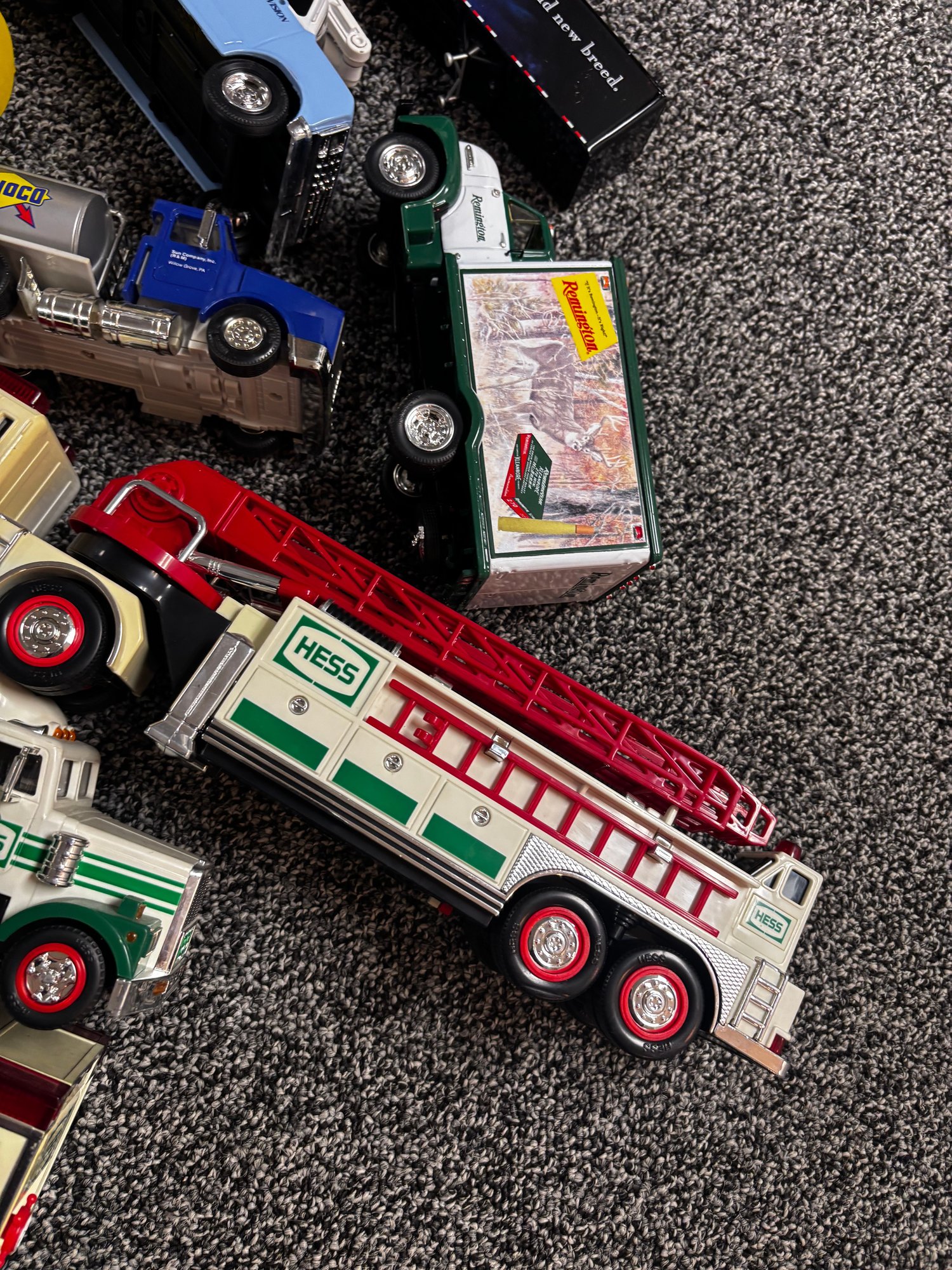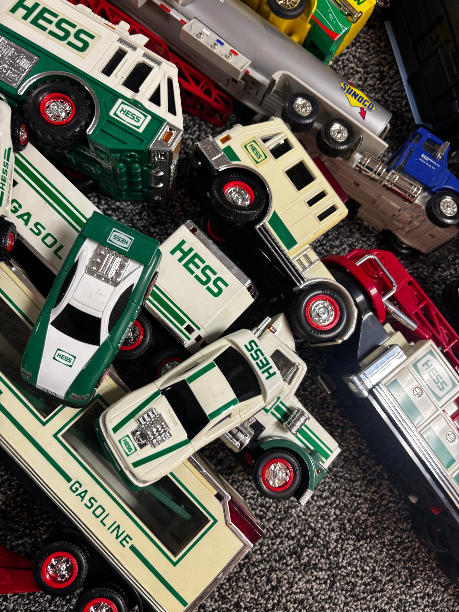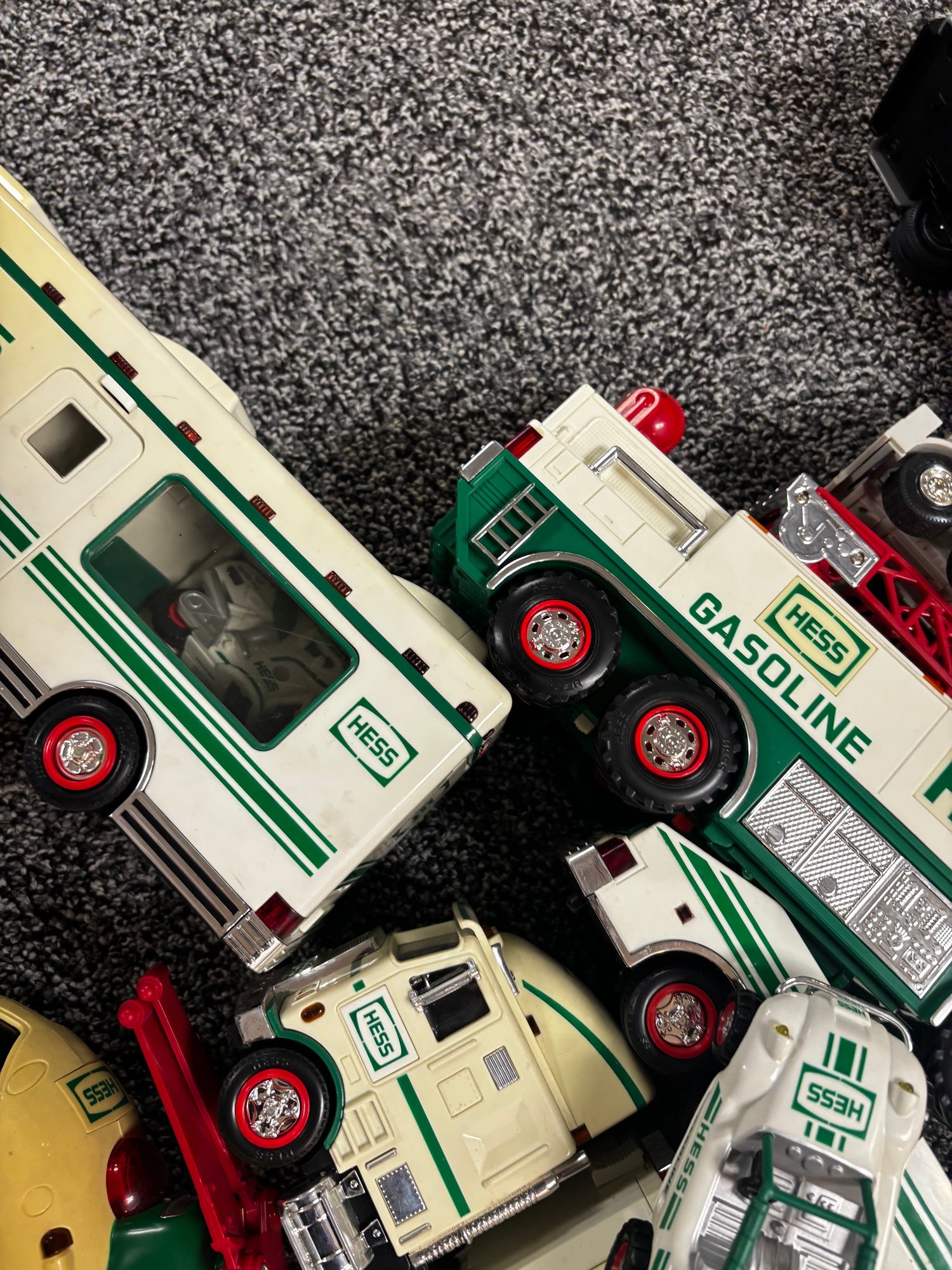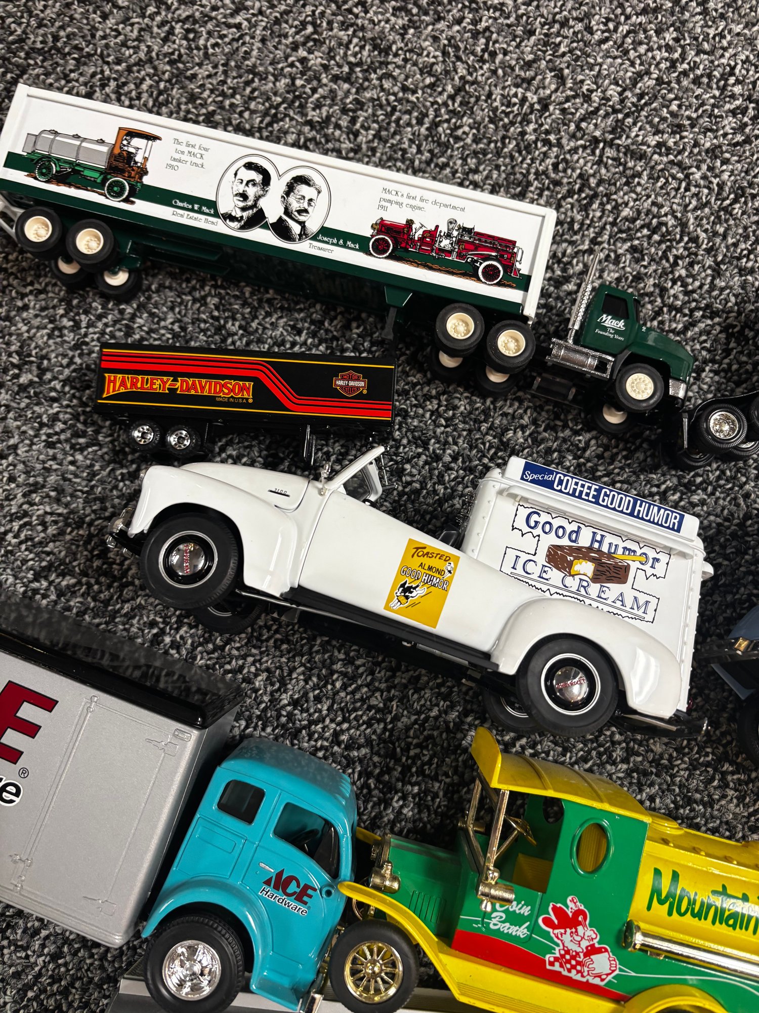 (P-83) BIG COLLECTION OF CAST IRON ADVERTISING TRUCKS CARS -HESS, CABLEVISION, ACE - ALL AS-IS