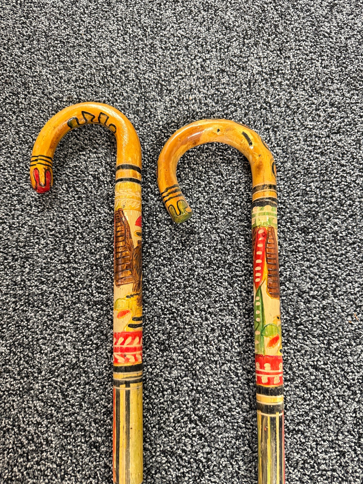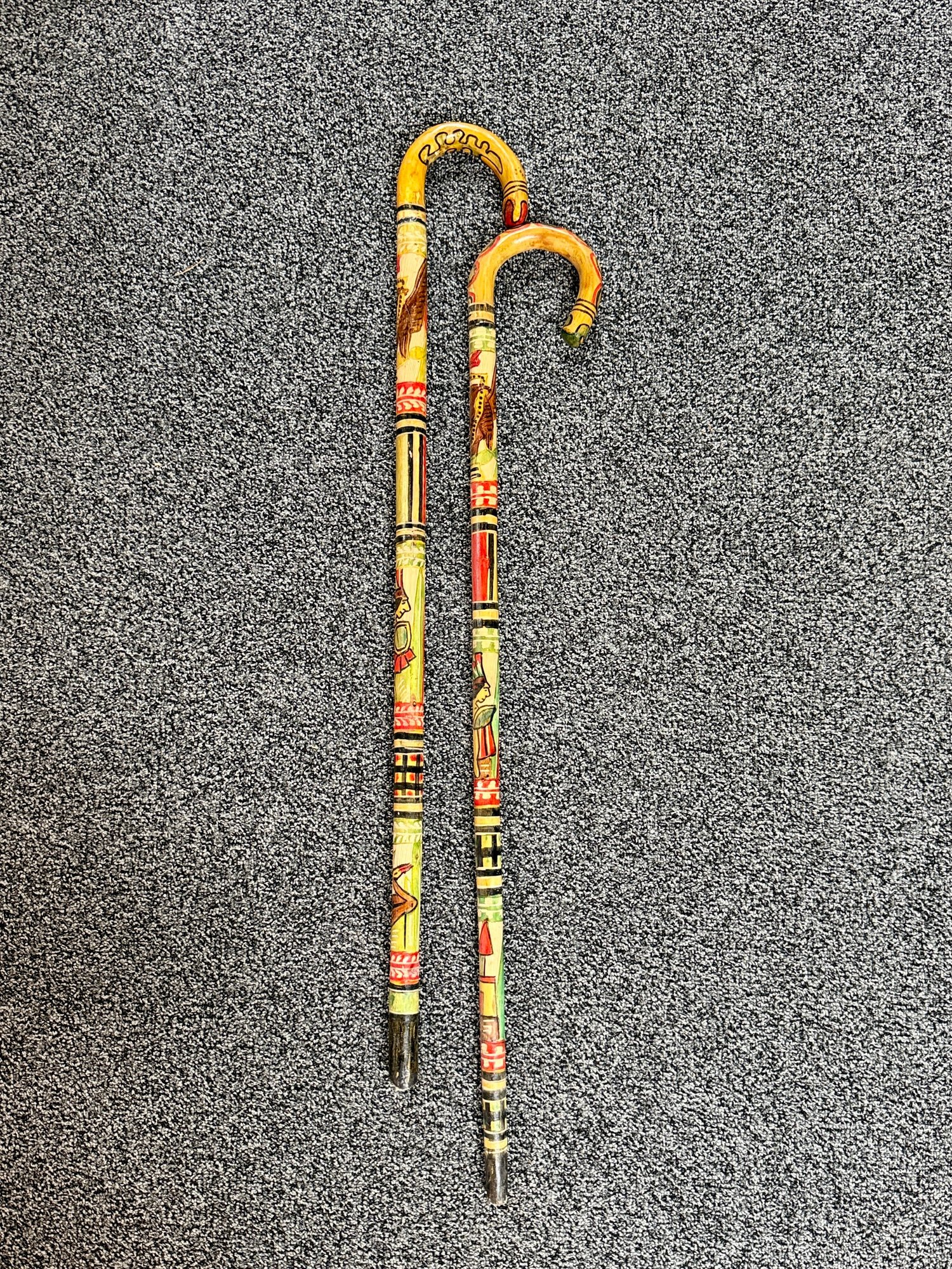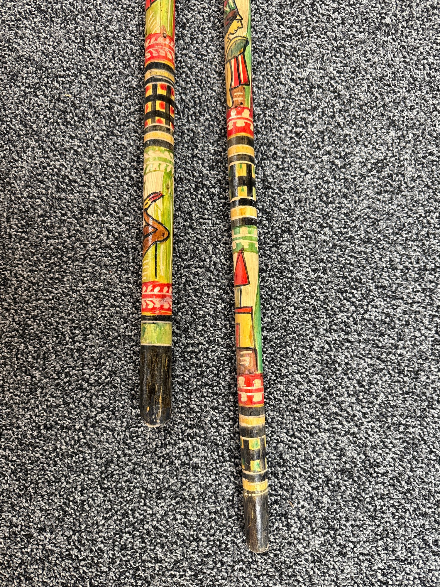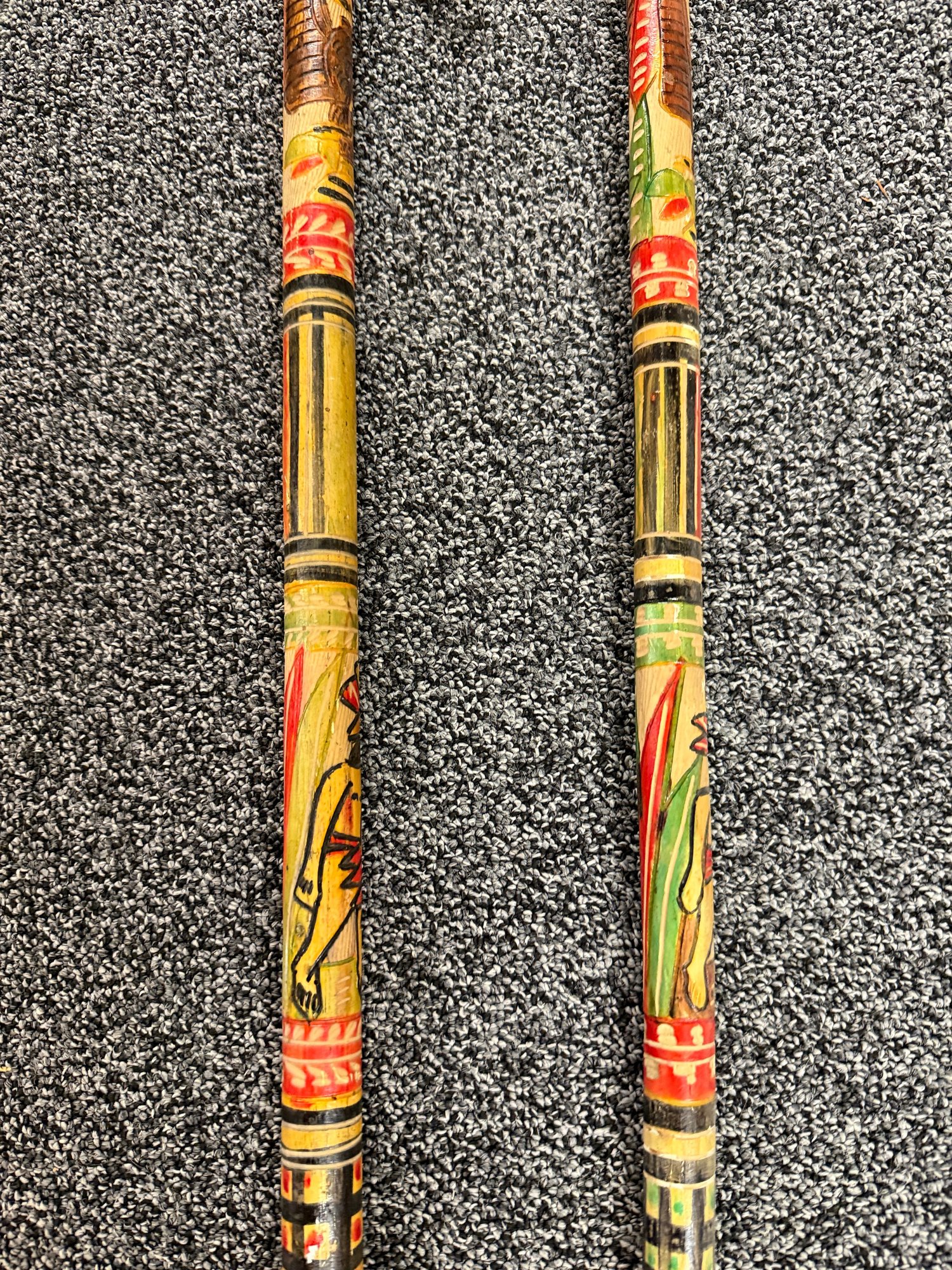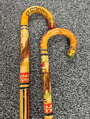 (P-90) PAIR OF VINTAGE WOOD WALKING STICKS WITH CARVED & PAINTED DESIGNS - 36"