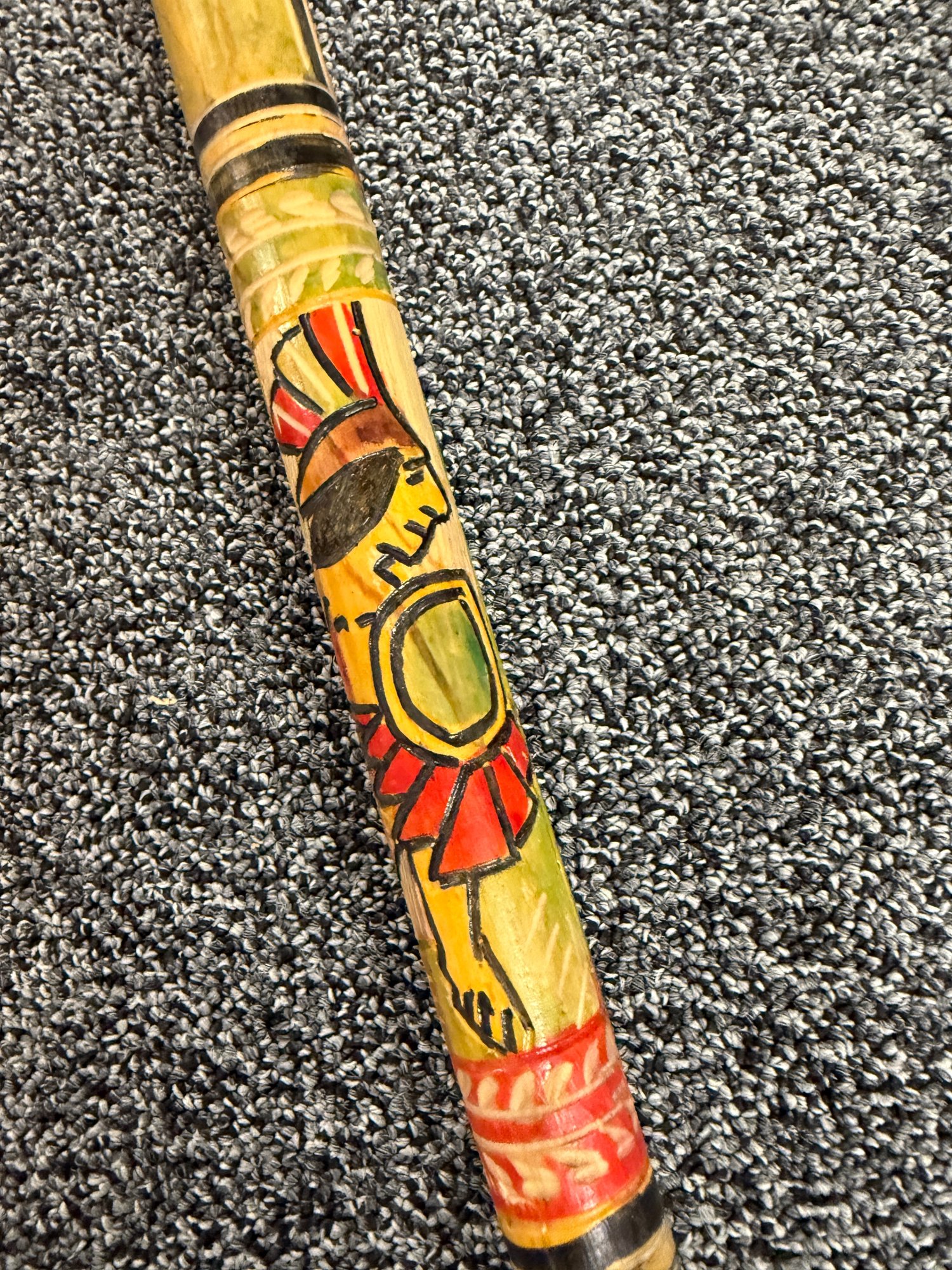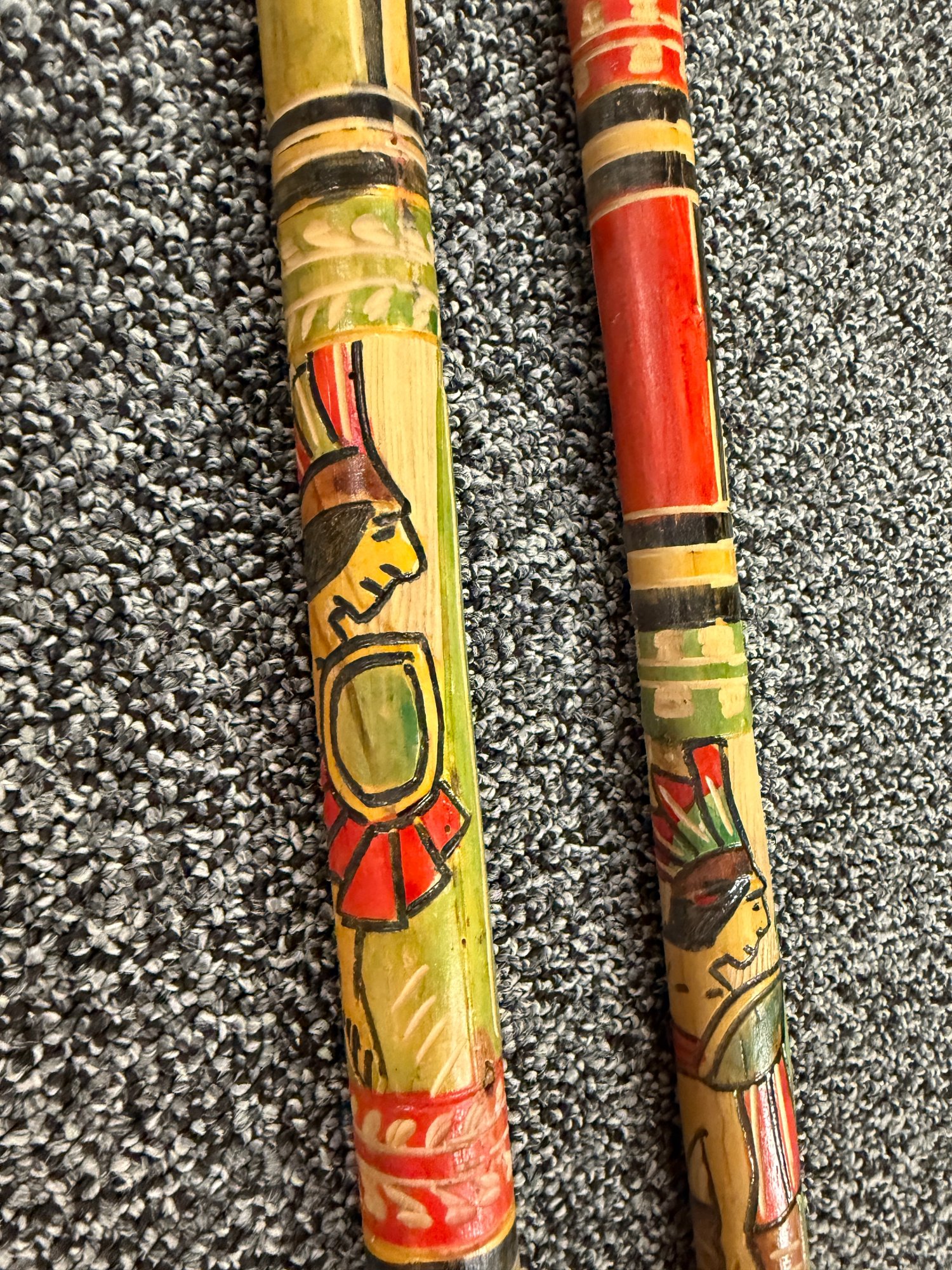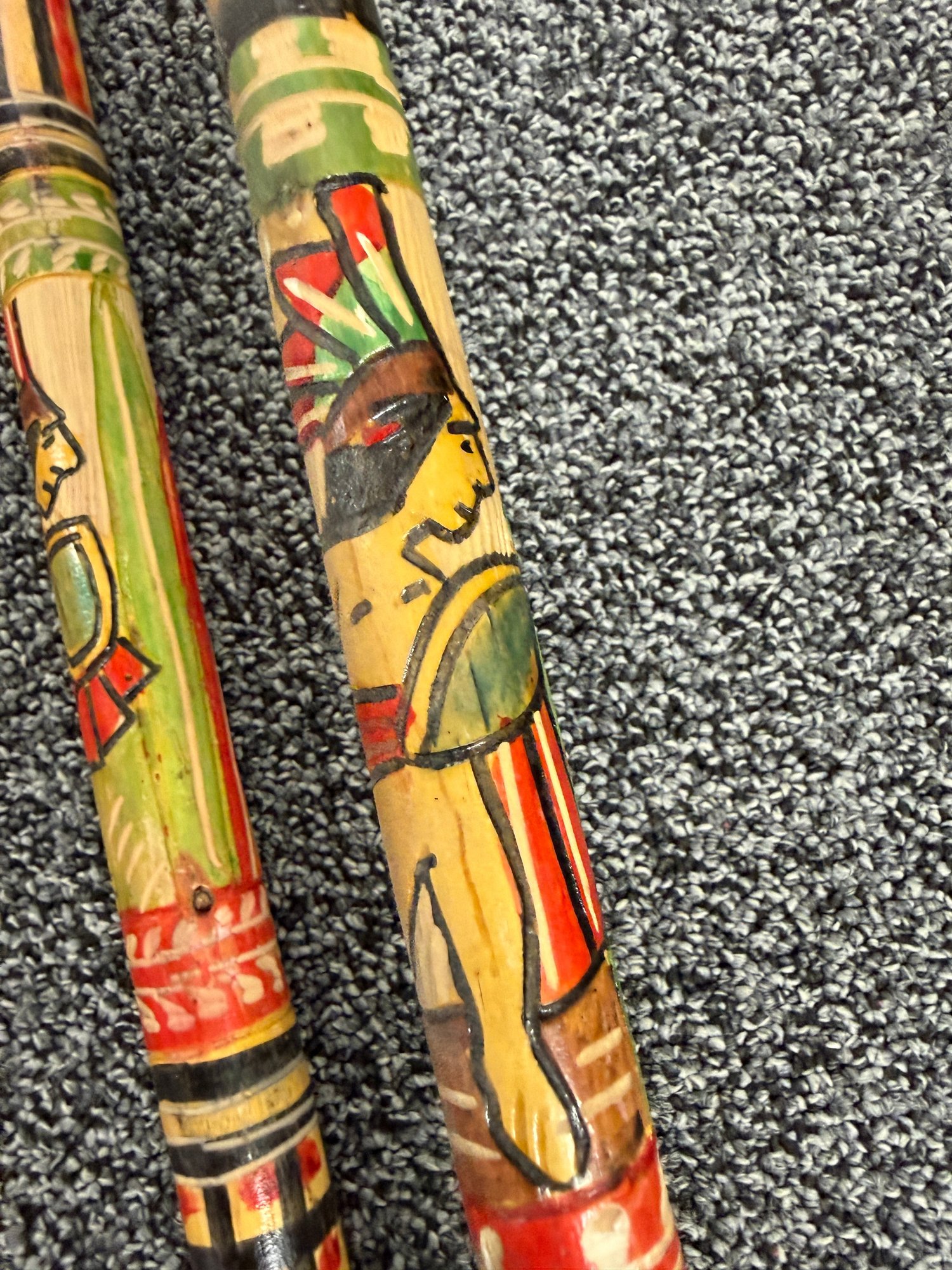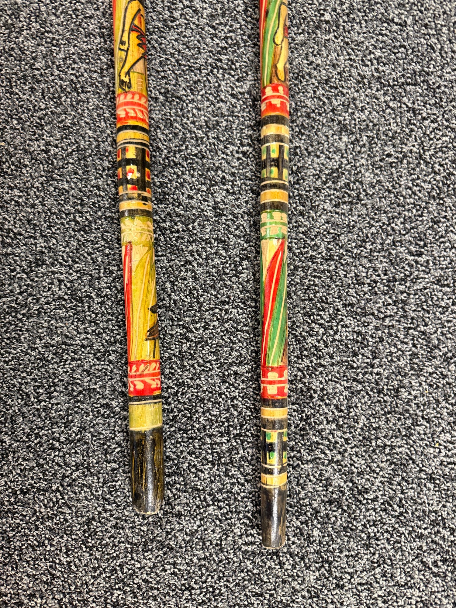 (P-90) PAIR OF VINTAGE WOOD WALKING STICKS WITH CARVED & PAINTED DESIGNS - 36"