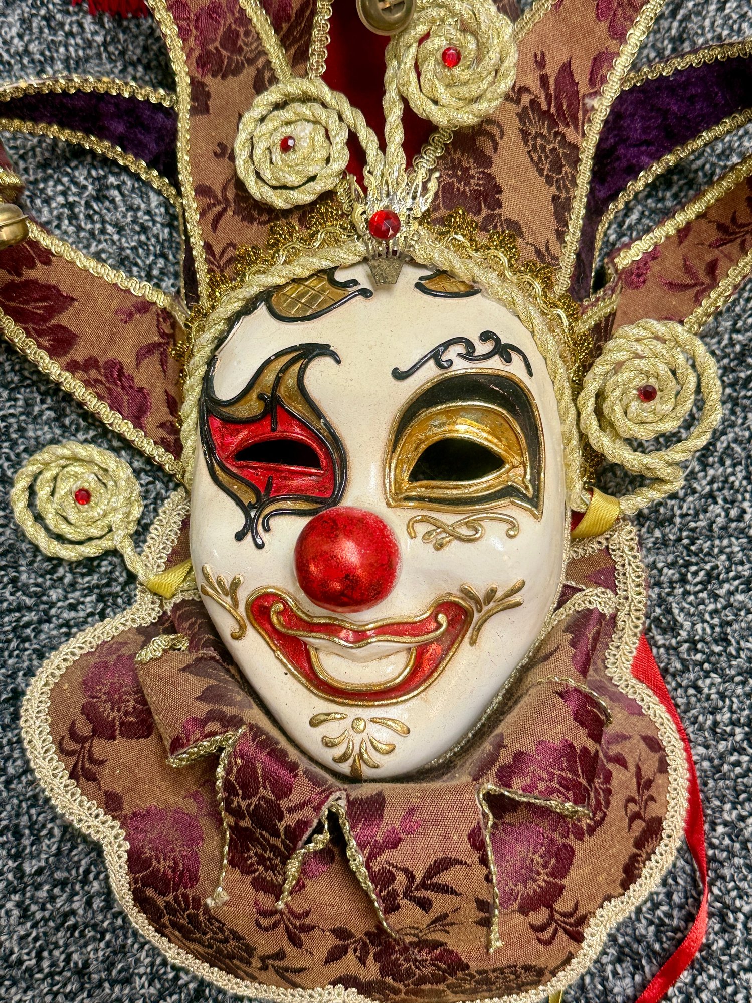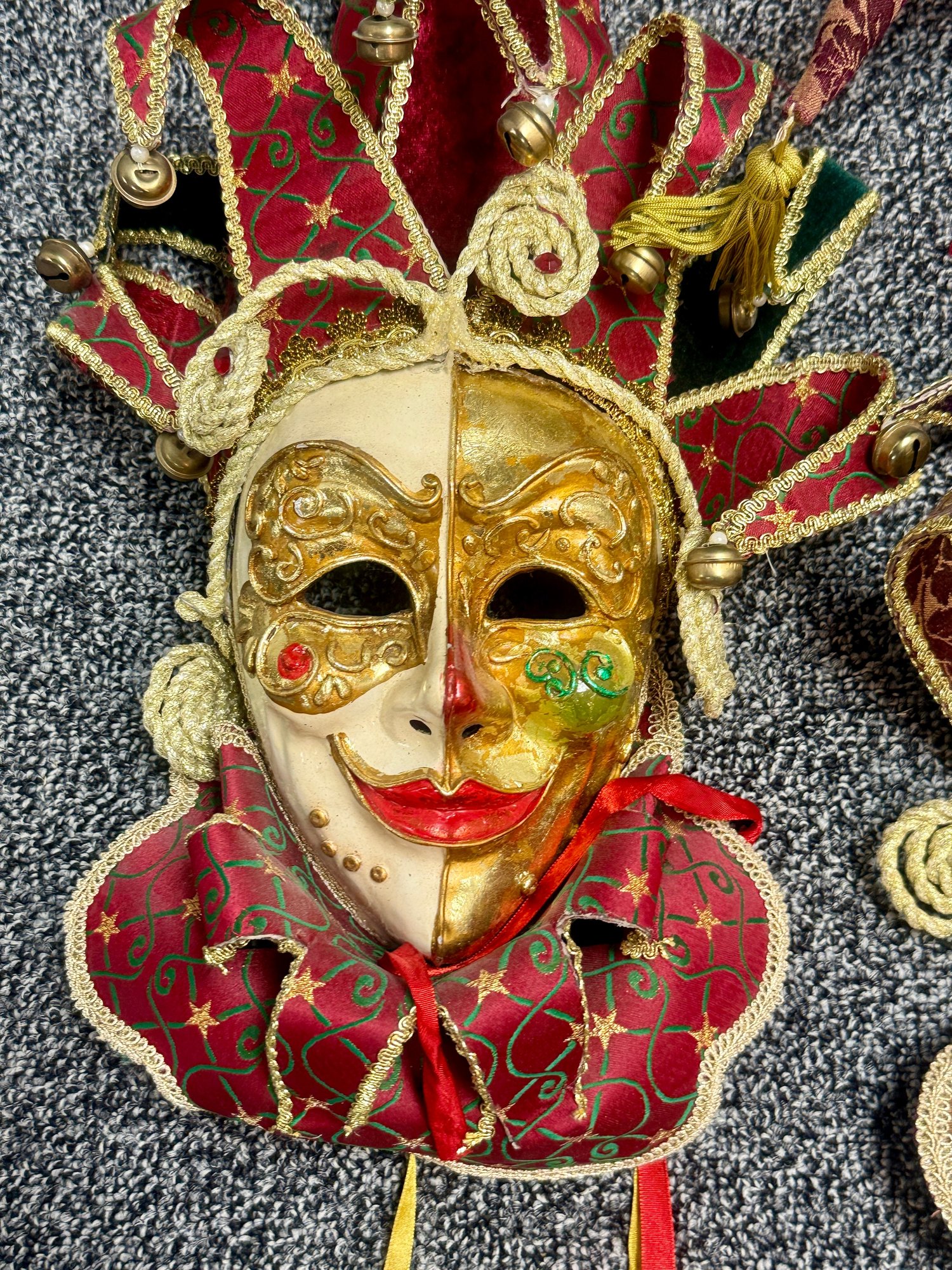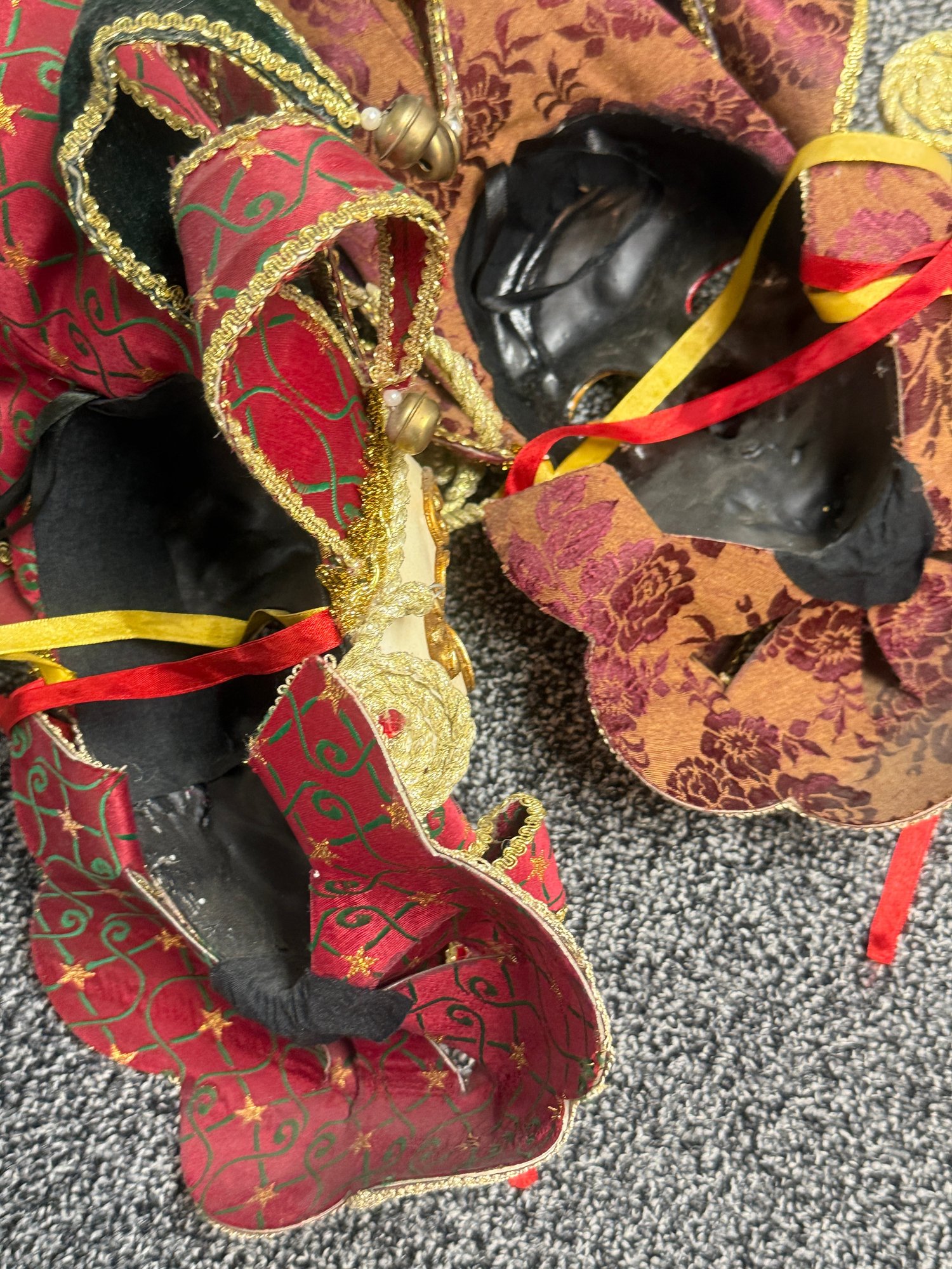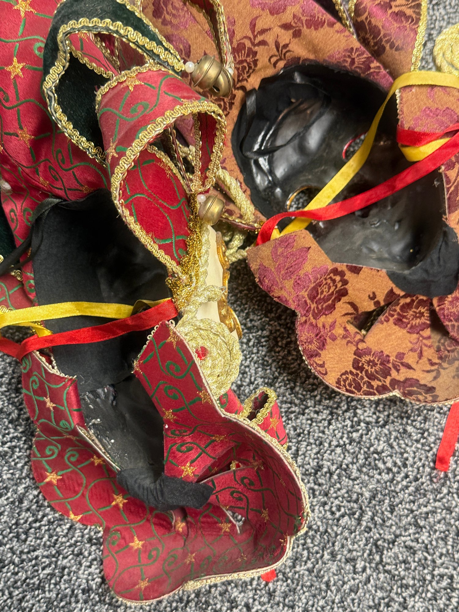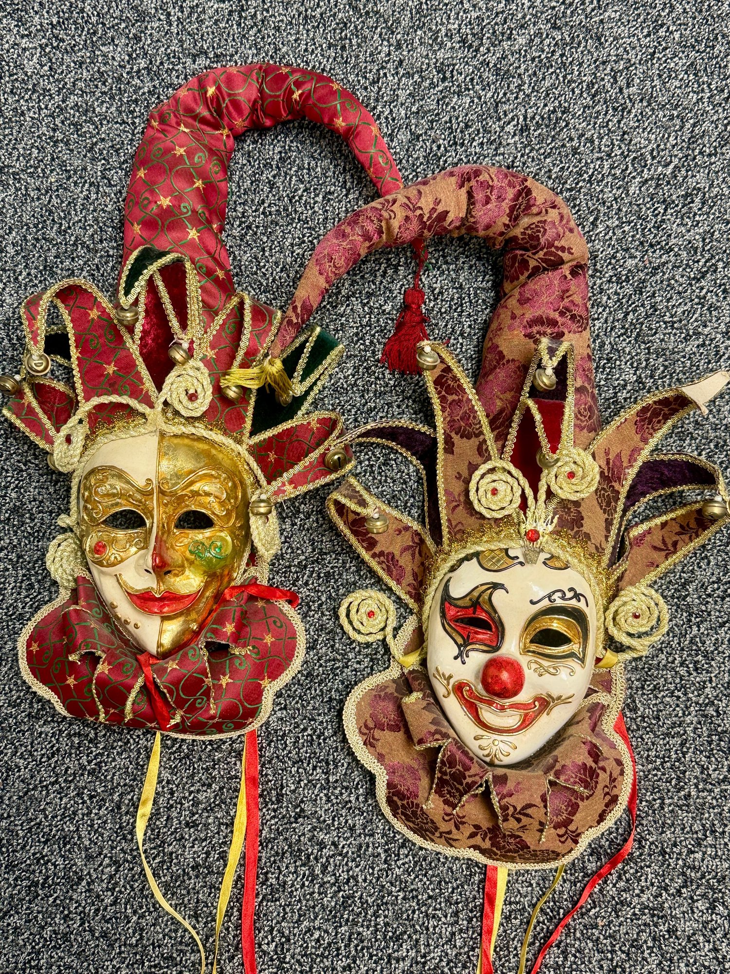 (P-91) PAIR OF VINTAGE FABRIC VENETIAN CARNIVAL MASKS WALL HANGINGS -21"