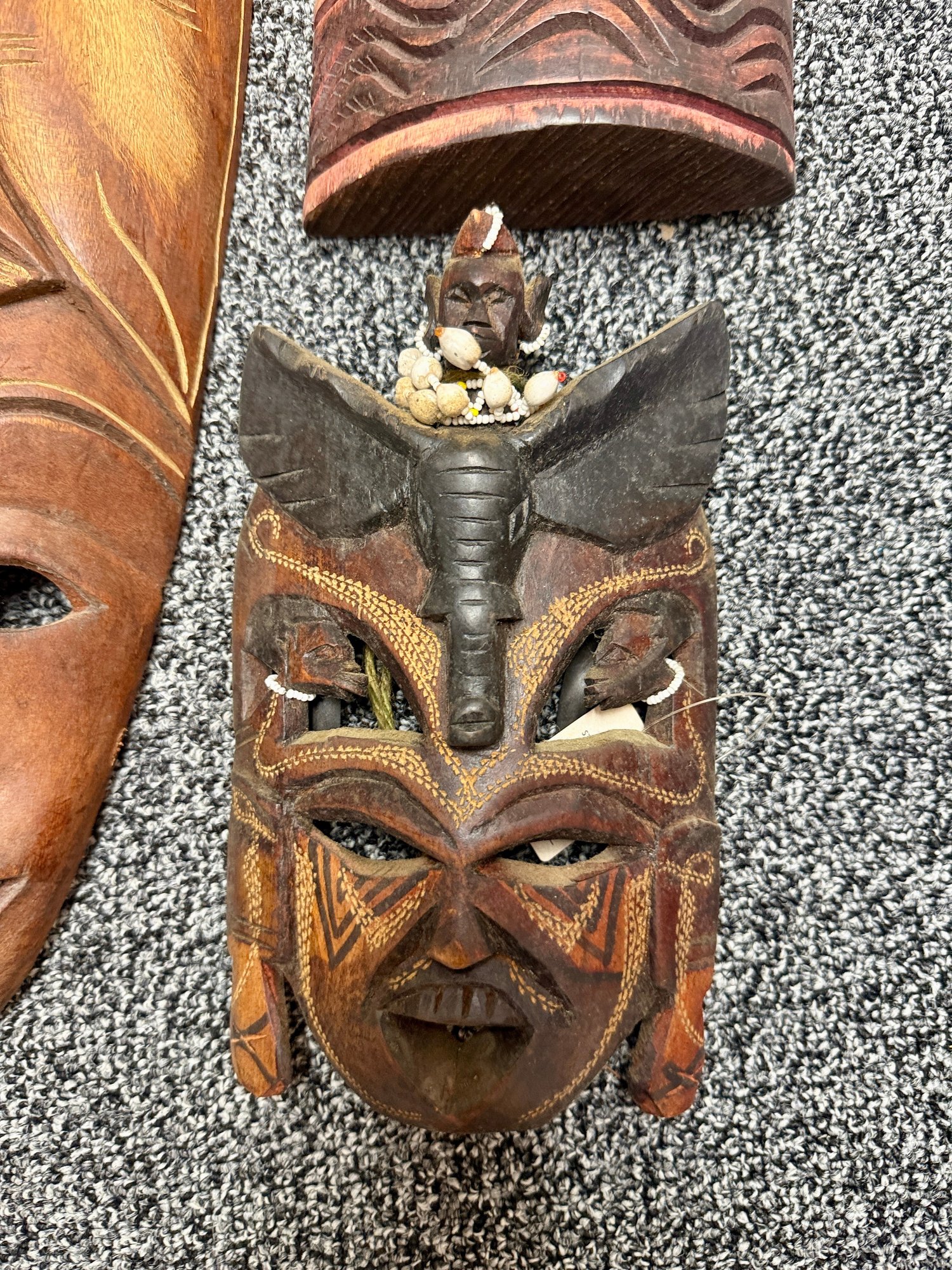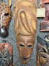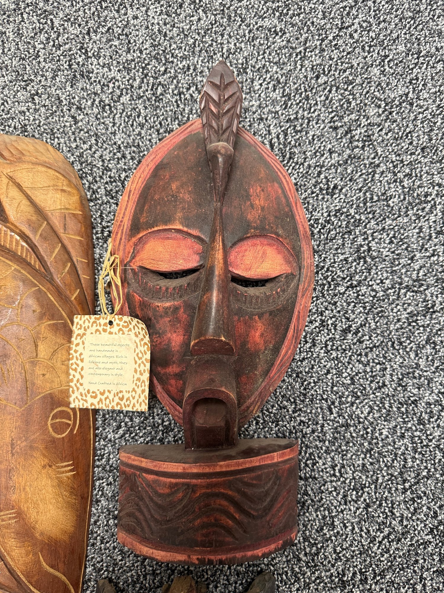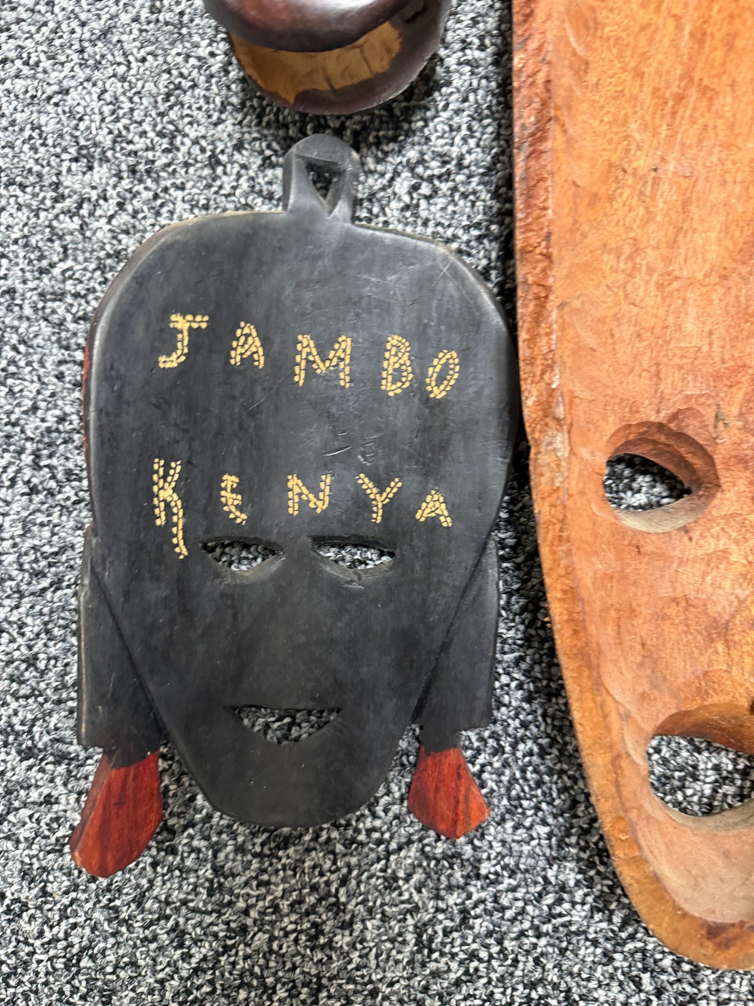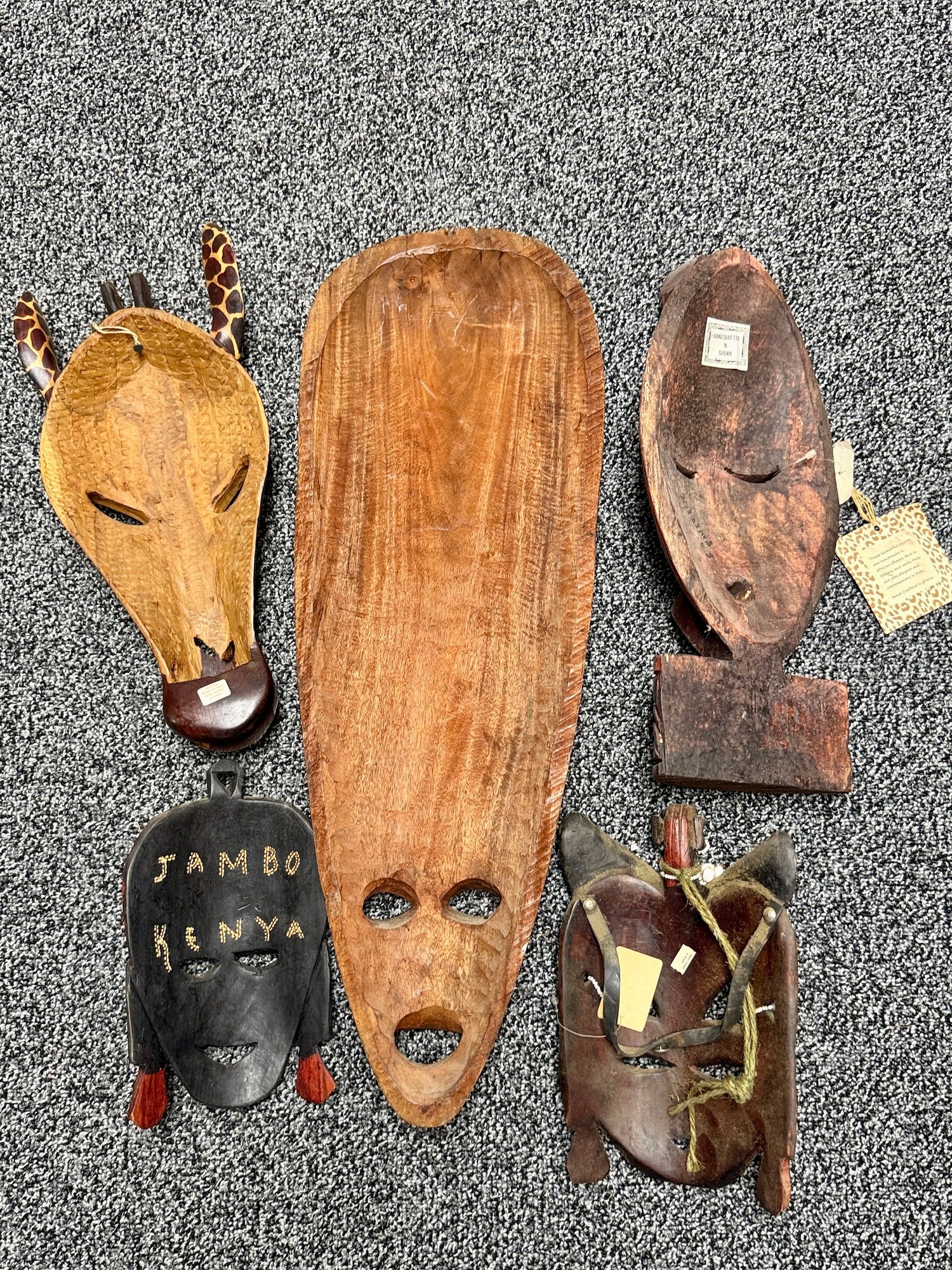 (P-99) COLLECTION OF FIVE VINTAGE CARVED AFRICAN MASKS INCLUDING JAMBO KENYA MASK- WALL DECOR - 12-24"