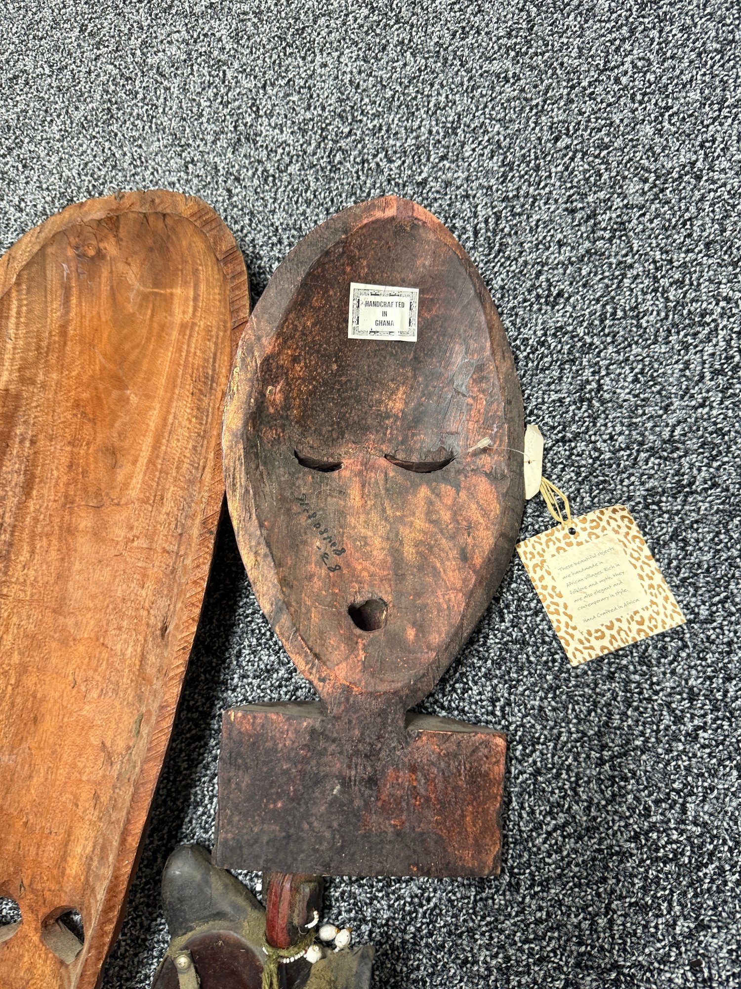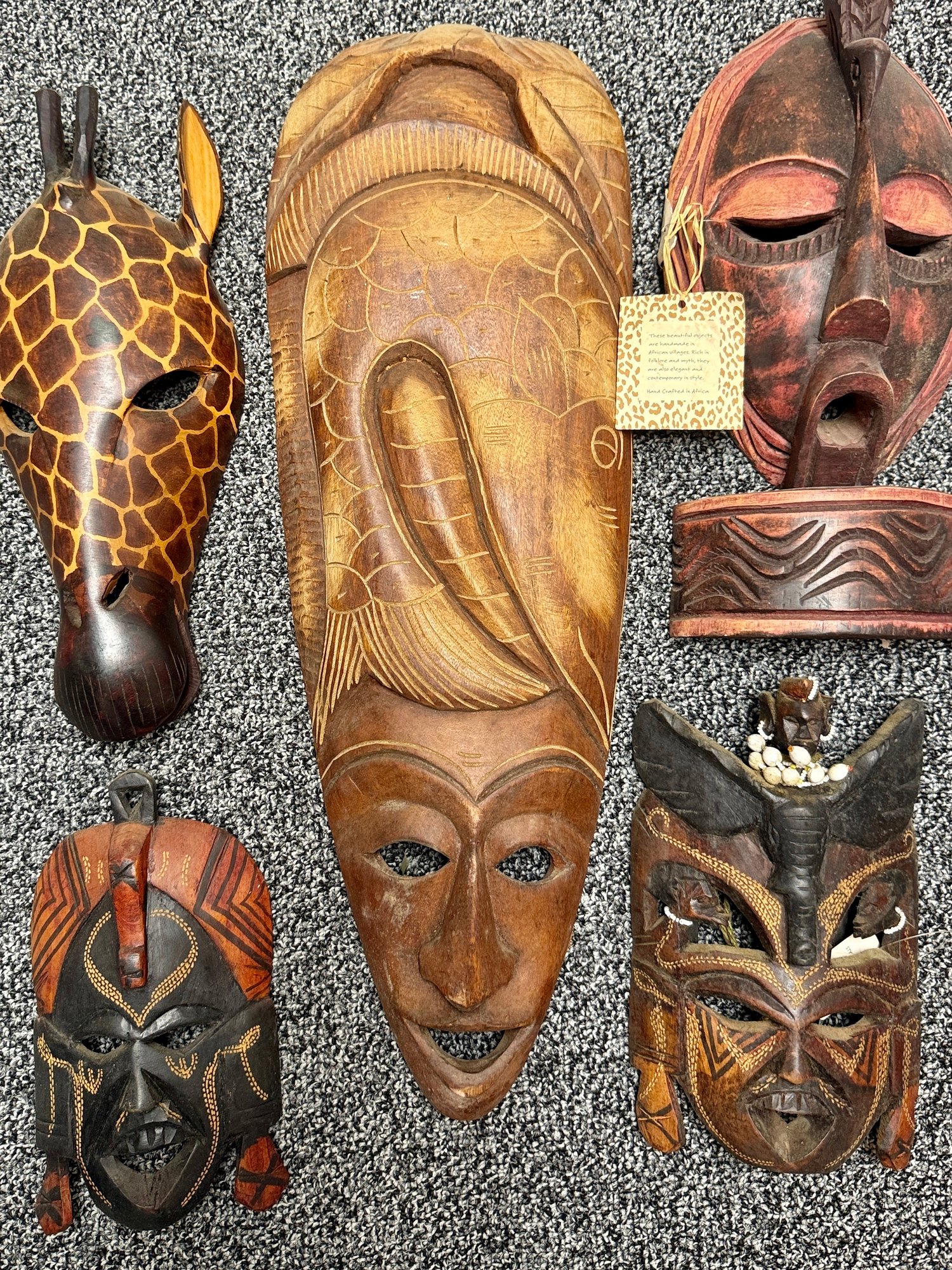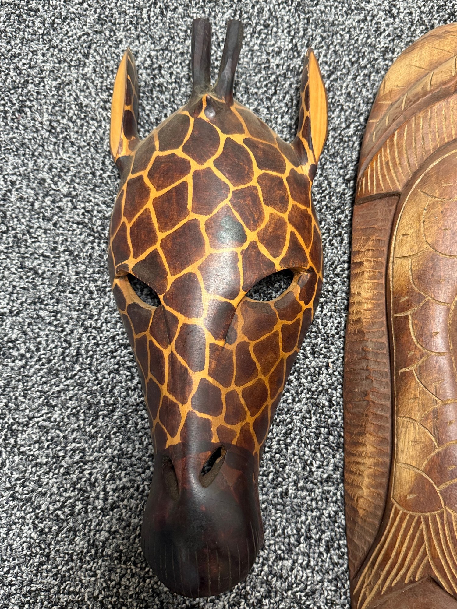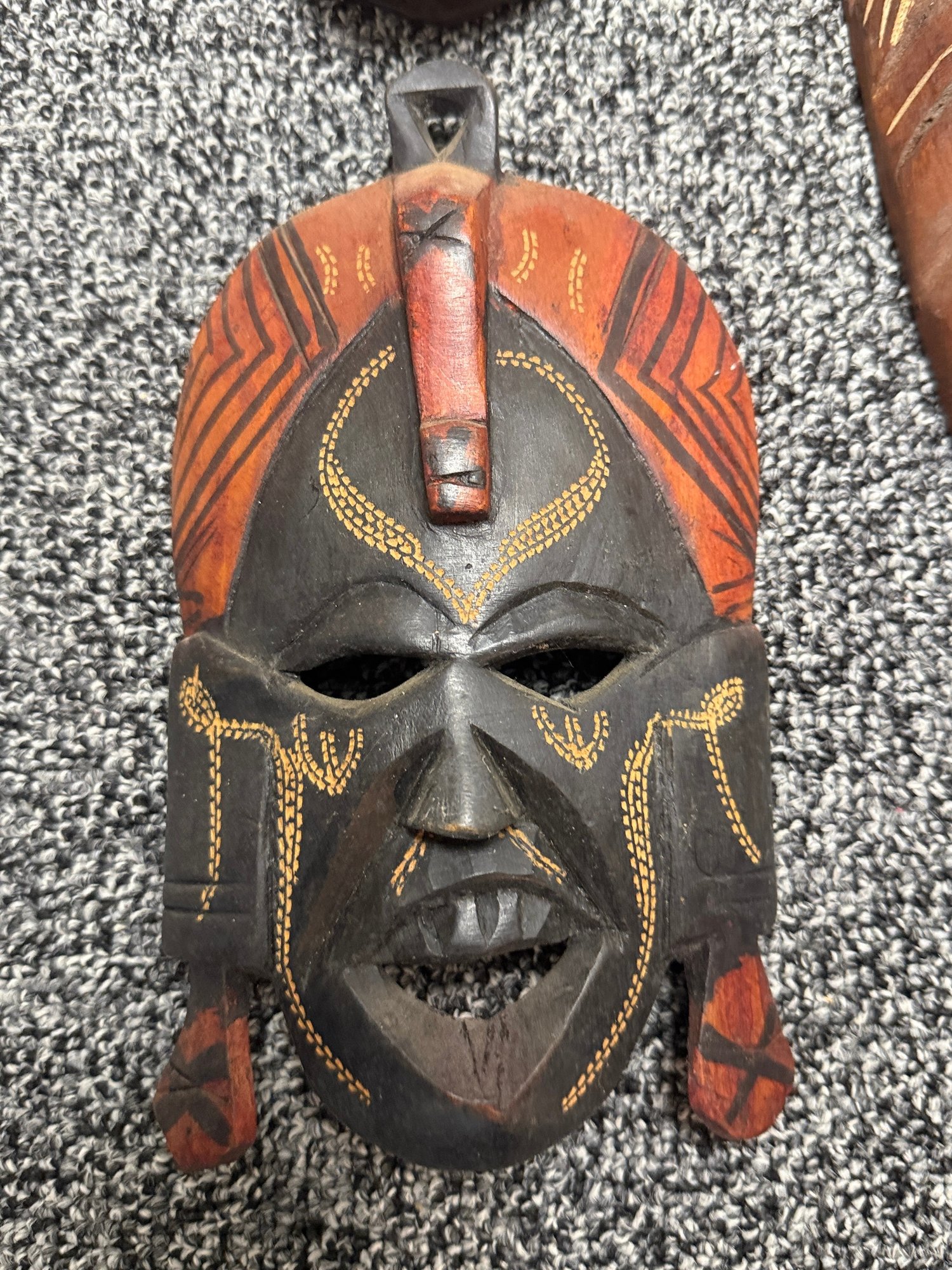 (P-99) COLLECTION OF FIVE VINTAGE CARVED AFRICAN MASKS INCLUDING JAMBO KENYA MASK- WALL DECOR - 12-24"