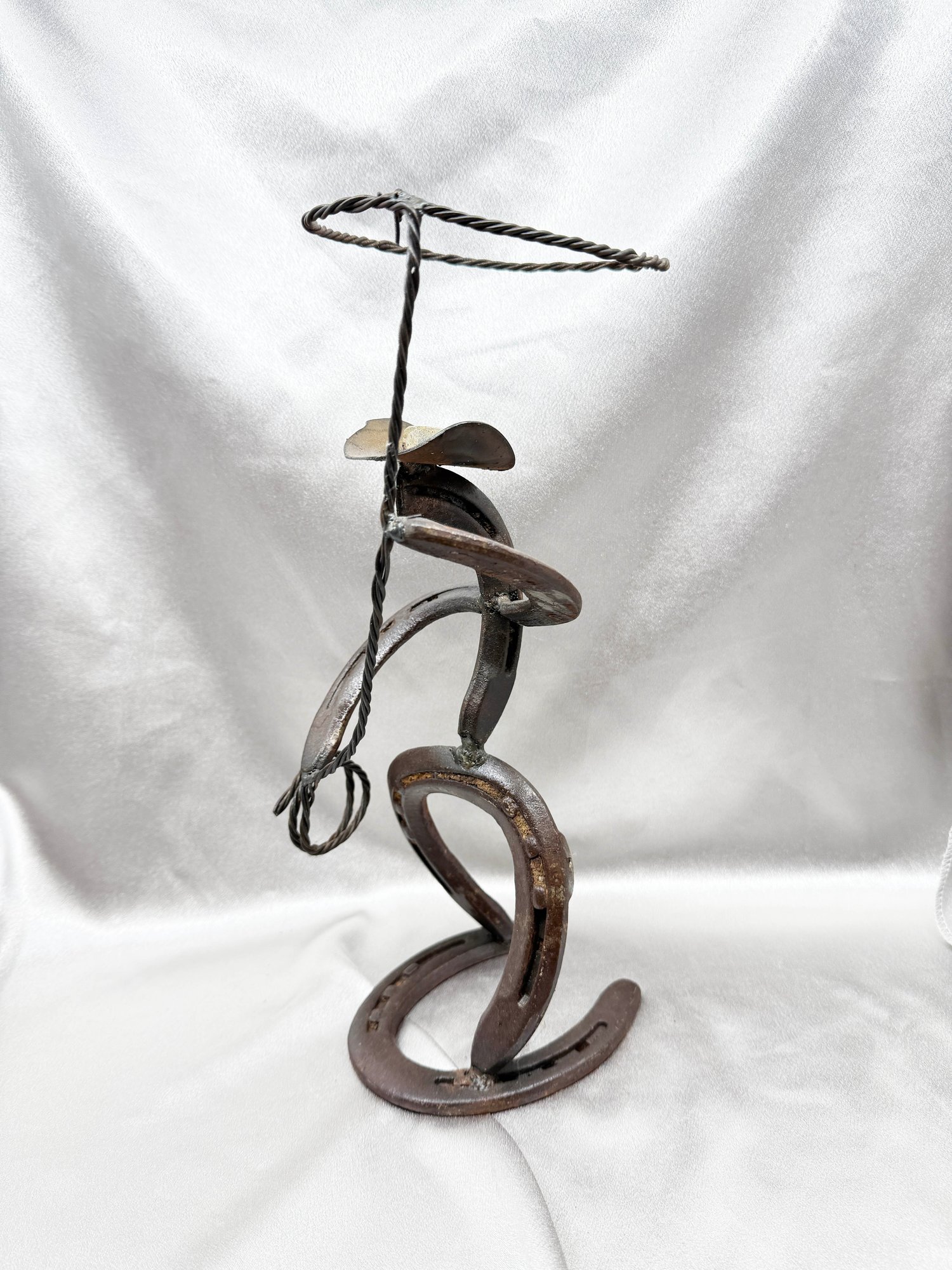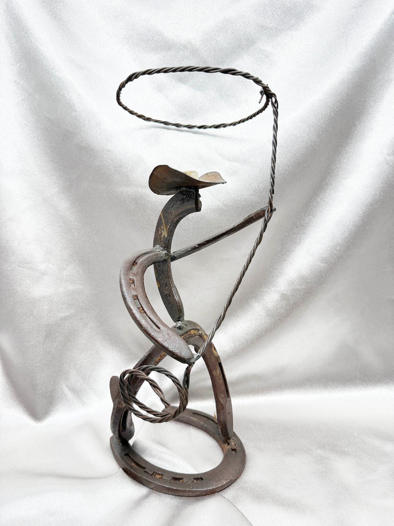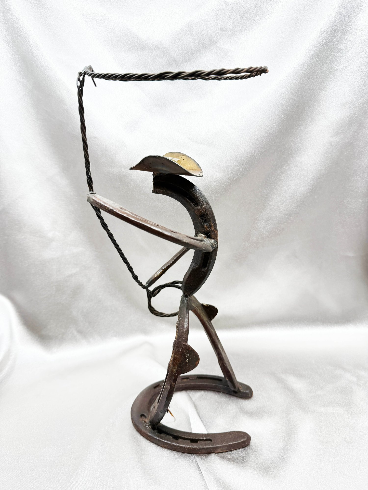 (A-2) VINTAGE HANDMADE HORSE SHOE FOLK ART-COWBAY W/HAT & LASSO SCULPTURE