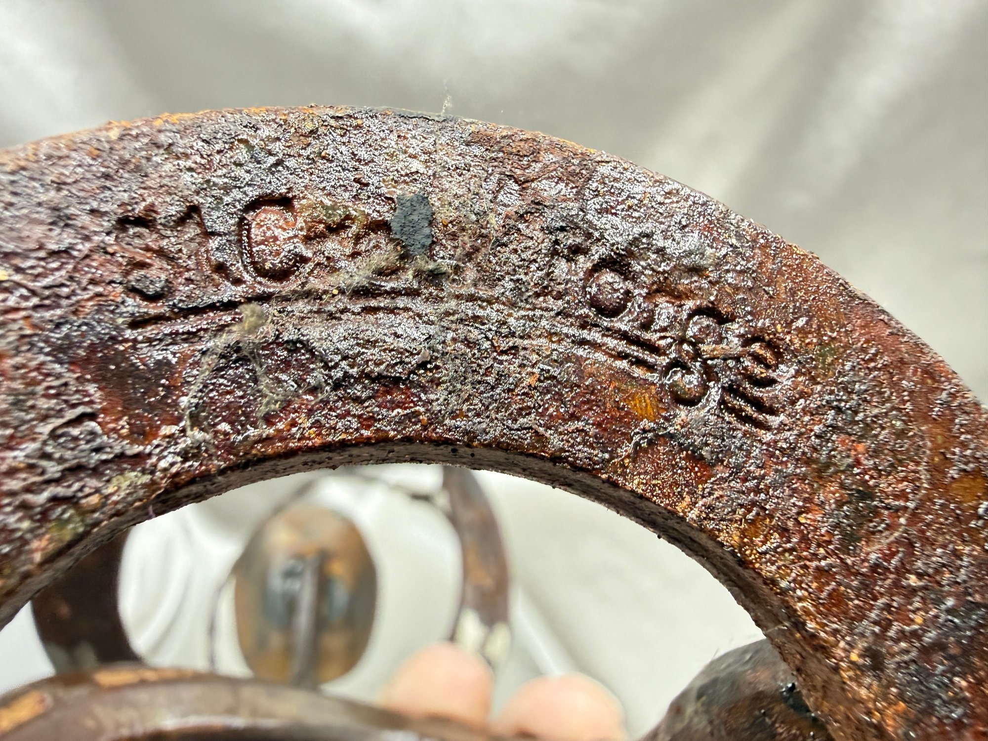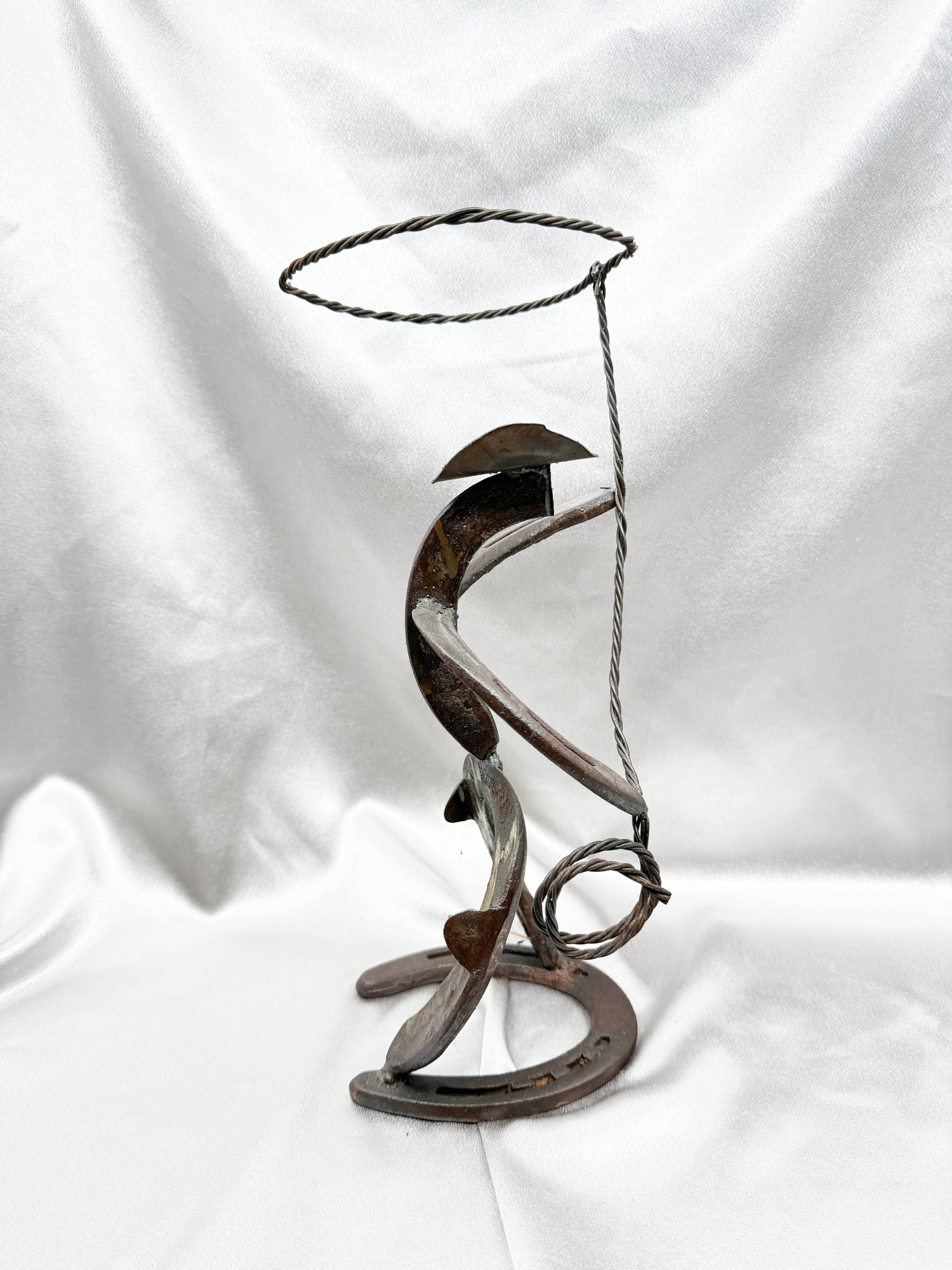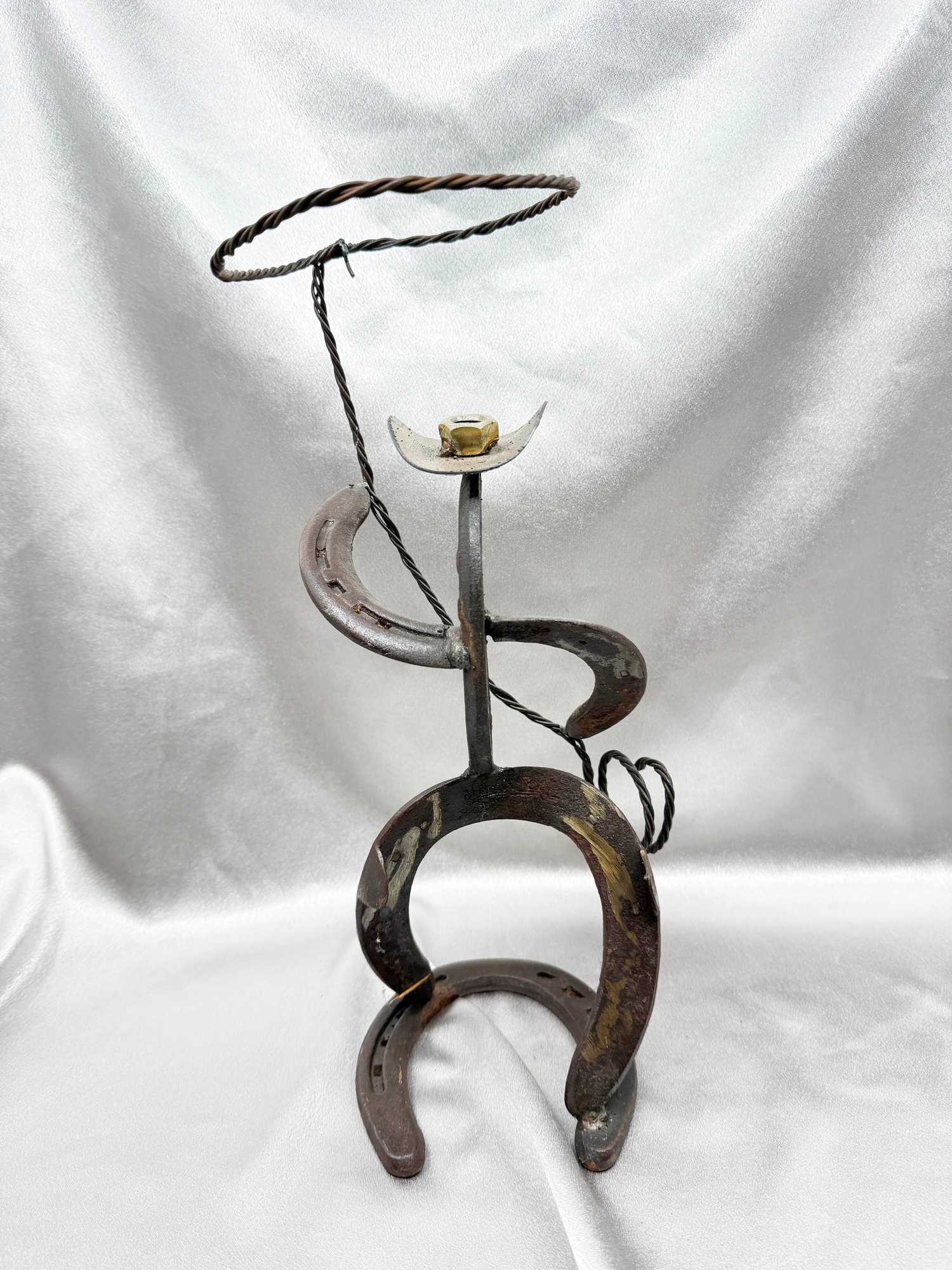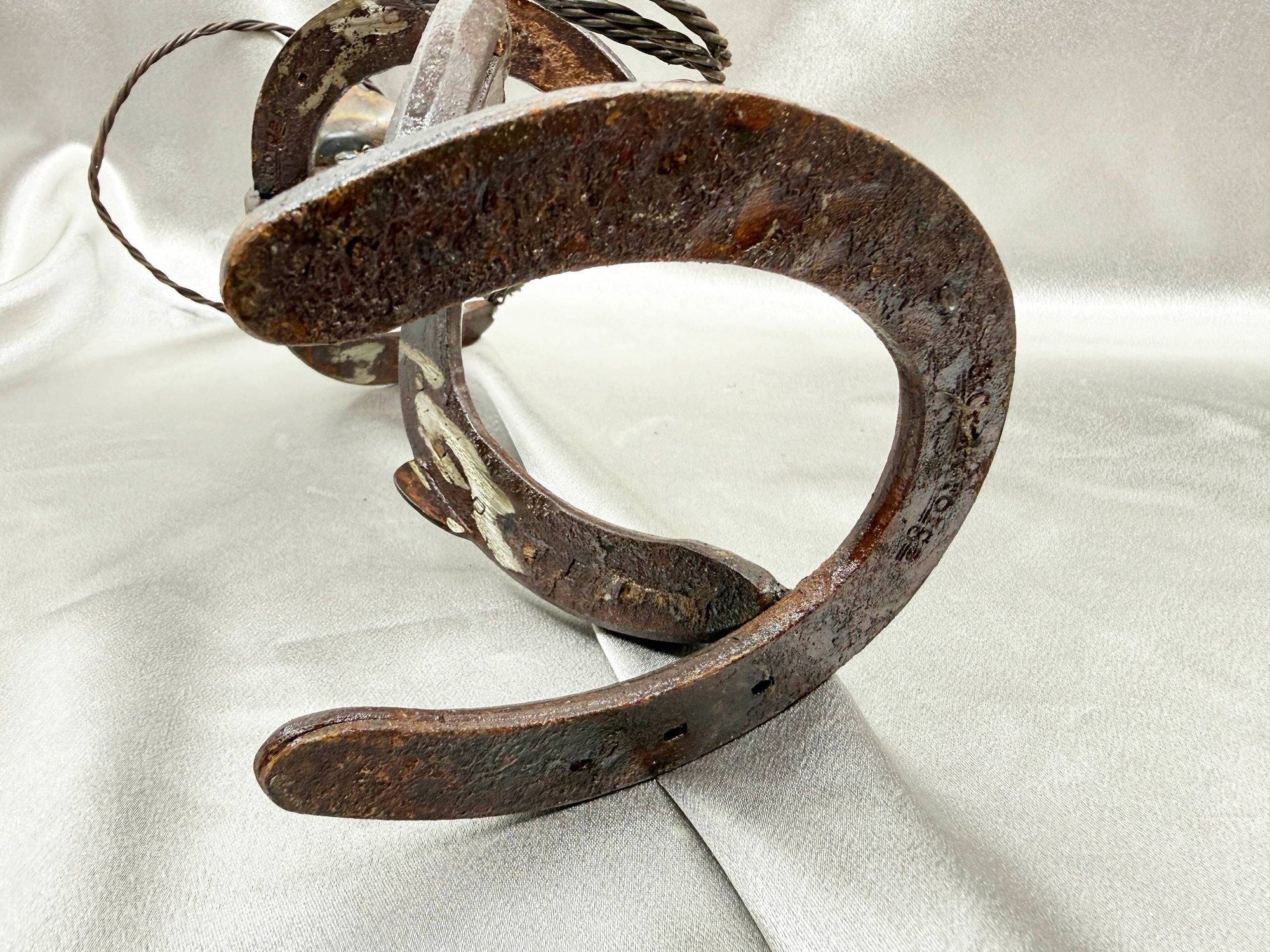 (A-2) VINTAGE HANDMADE HORSE SHOE FOLK ART-COWBAY W/HAT & LASSO SCULPTURE